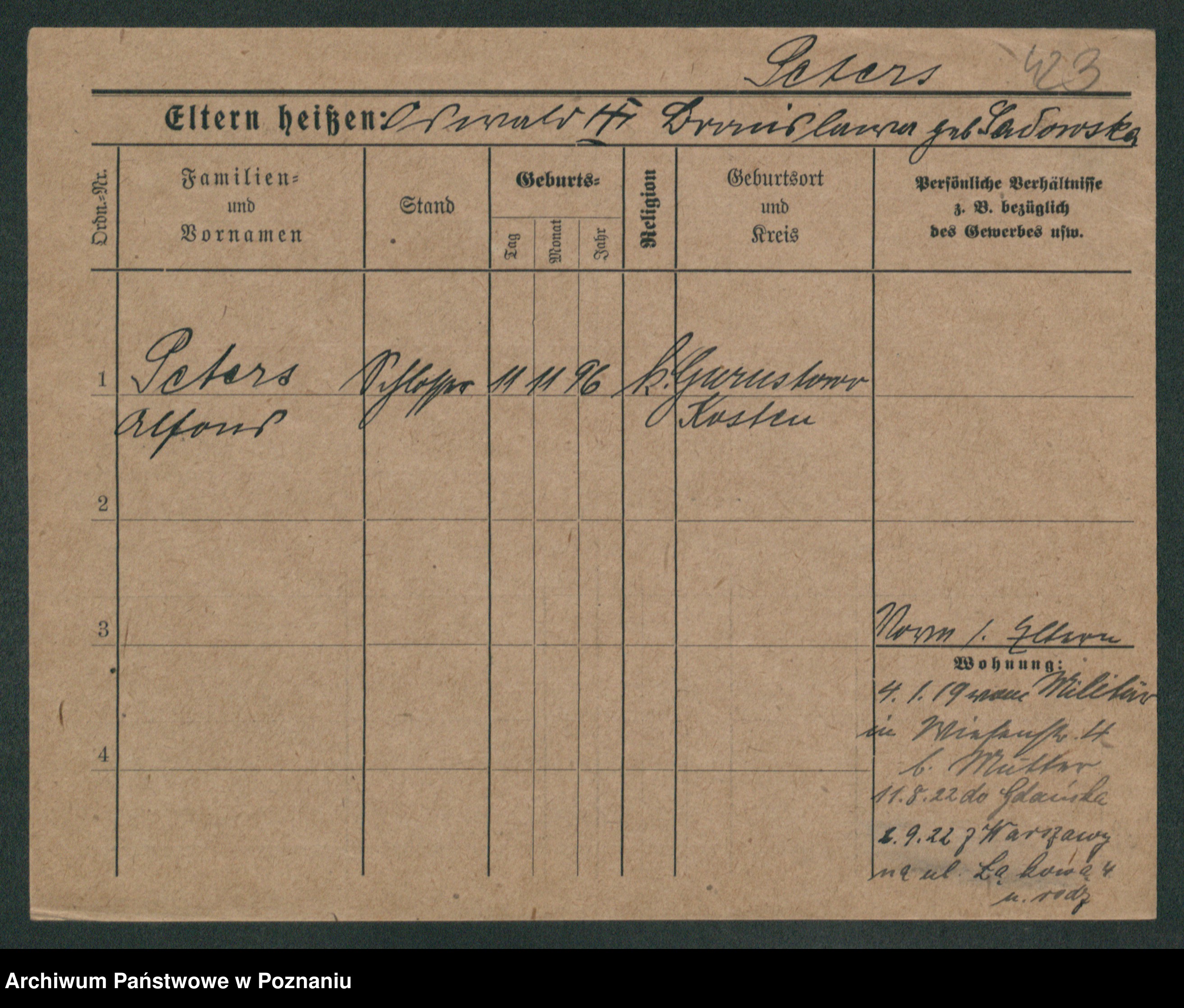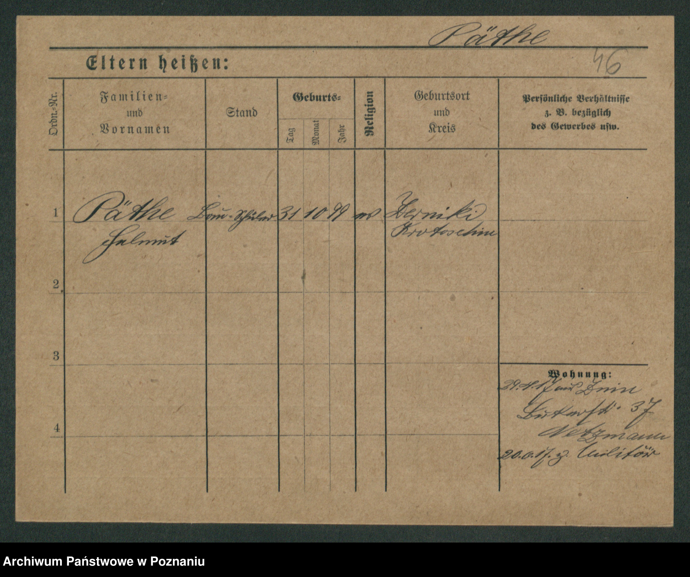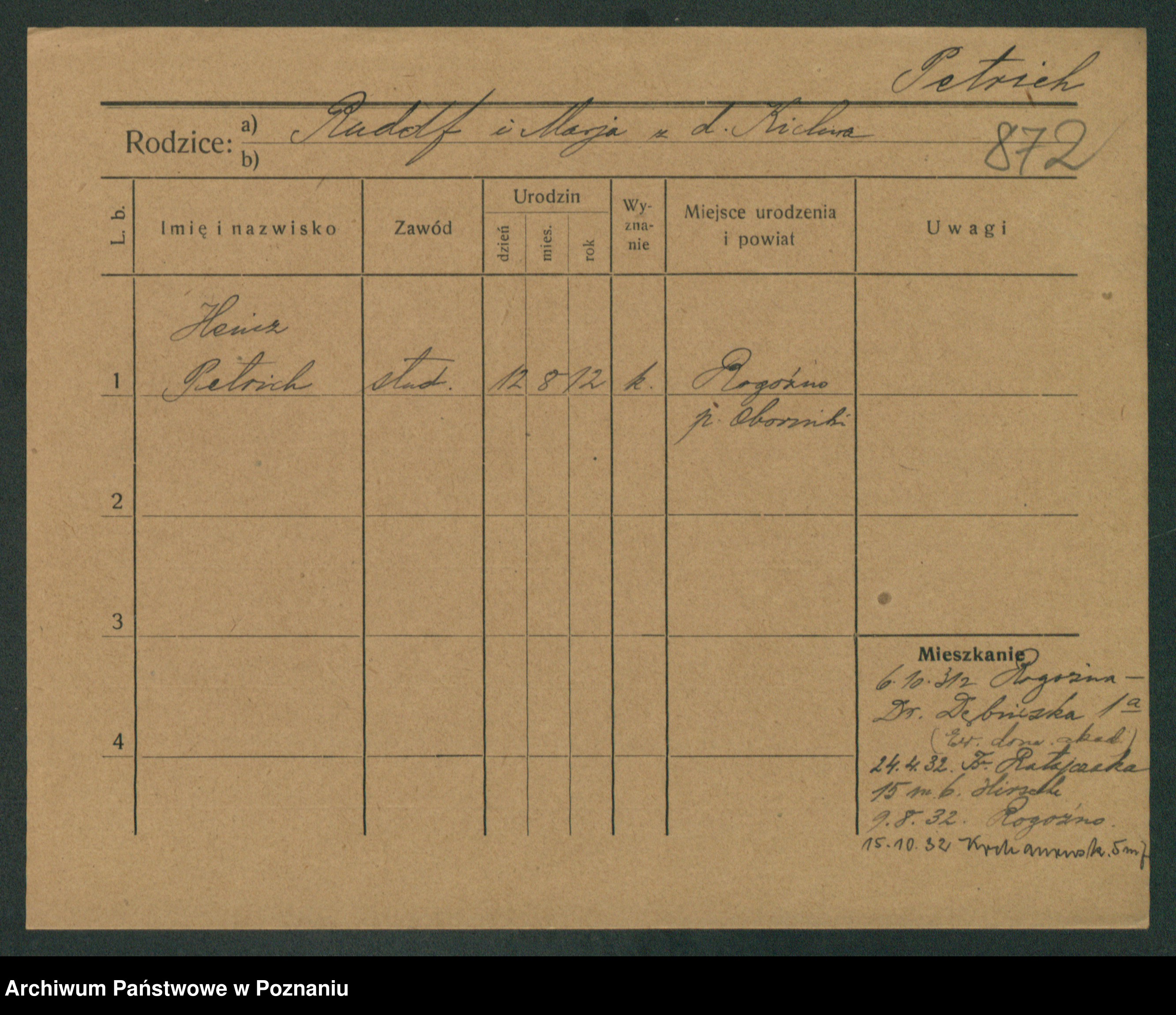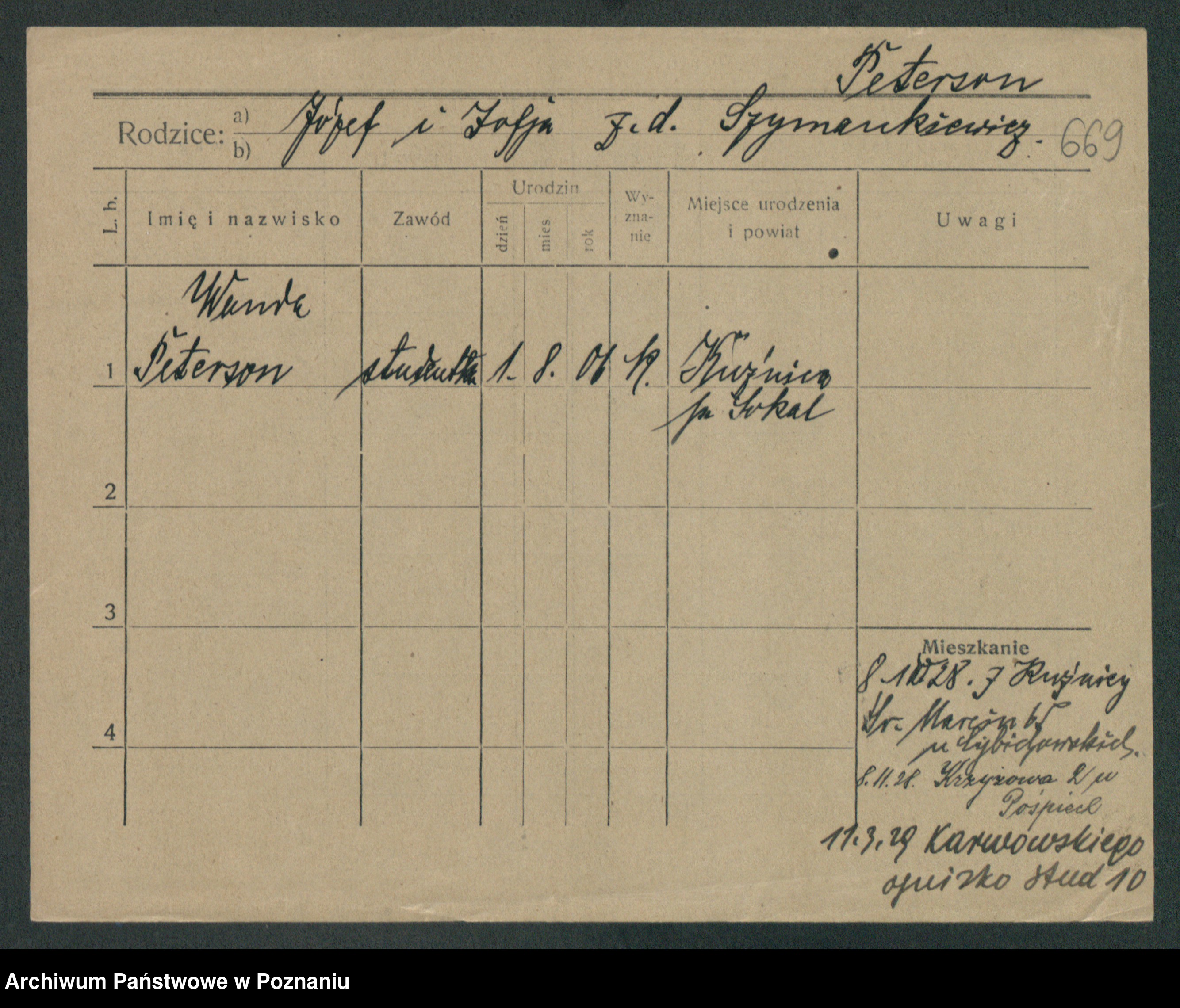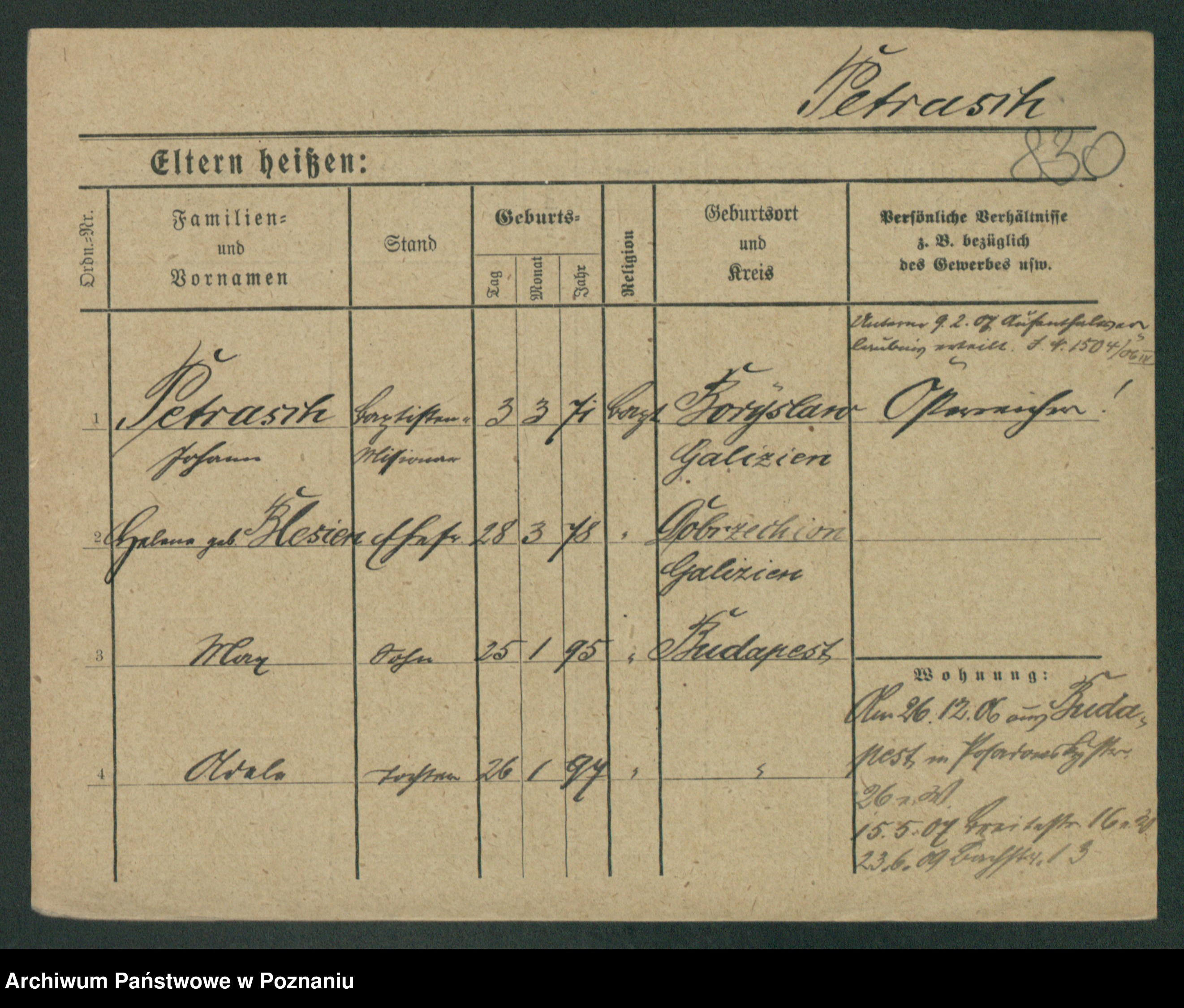 Podgląd karty osobowej dostępny jest po kliknięciu na nazwisko lub ikonkę karty. Można dokonywać powiększenia (ikony na górze) lub przechodzić między kolejnymi skanami (strzałki po bokach).