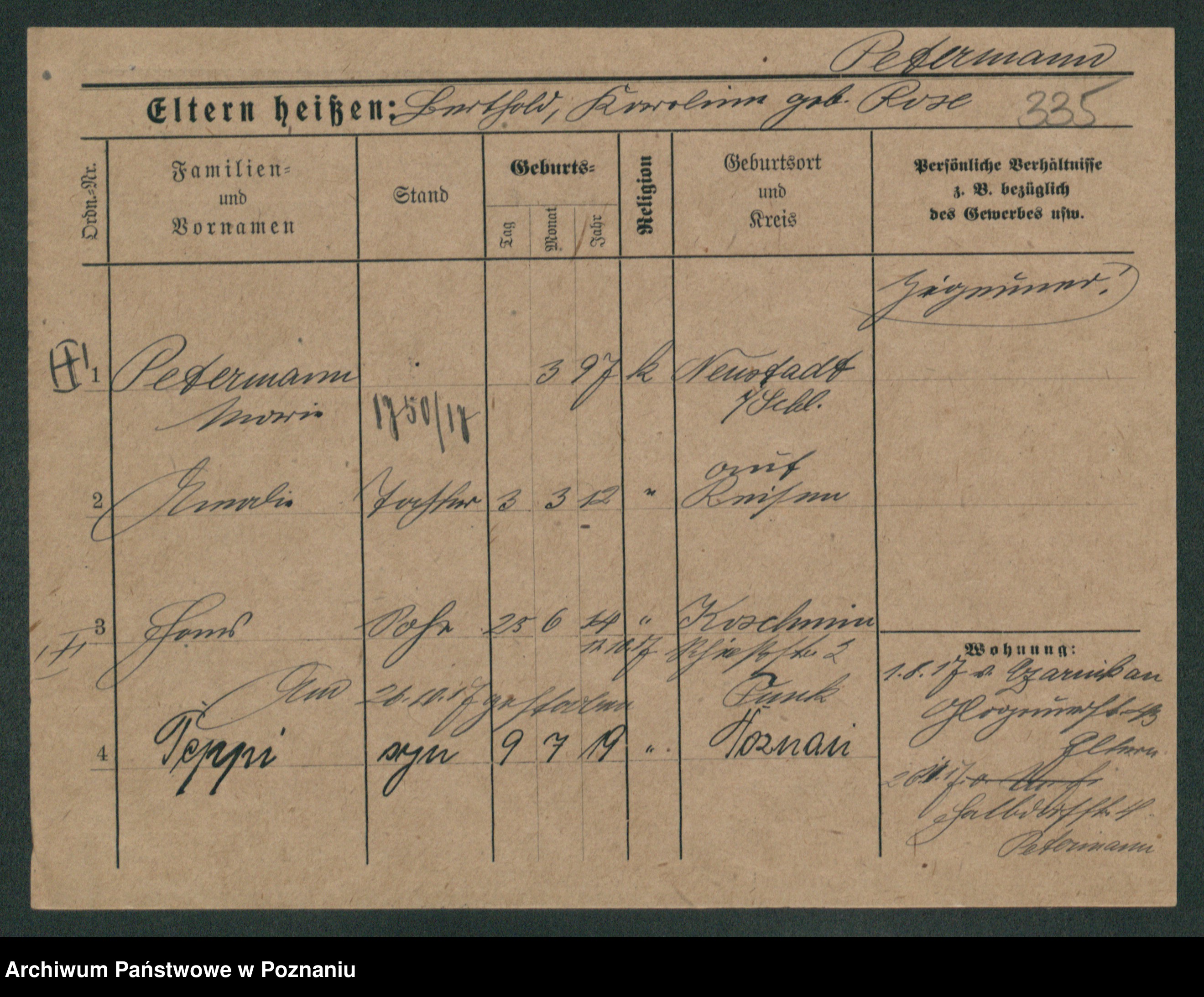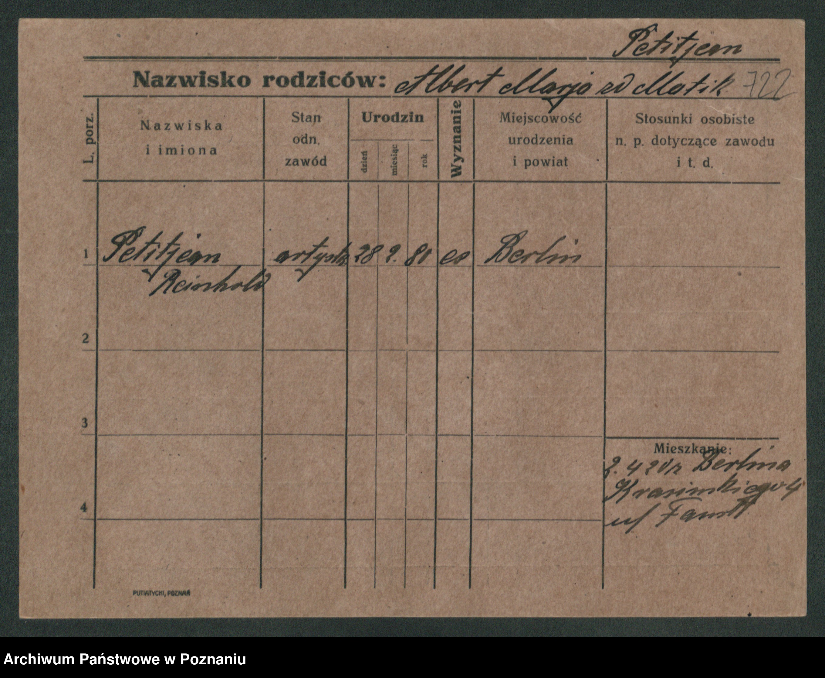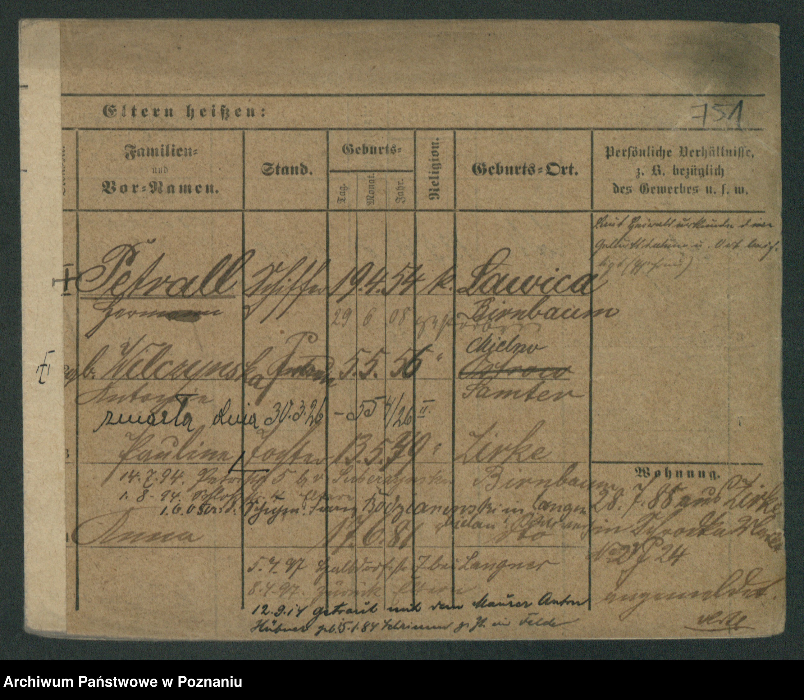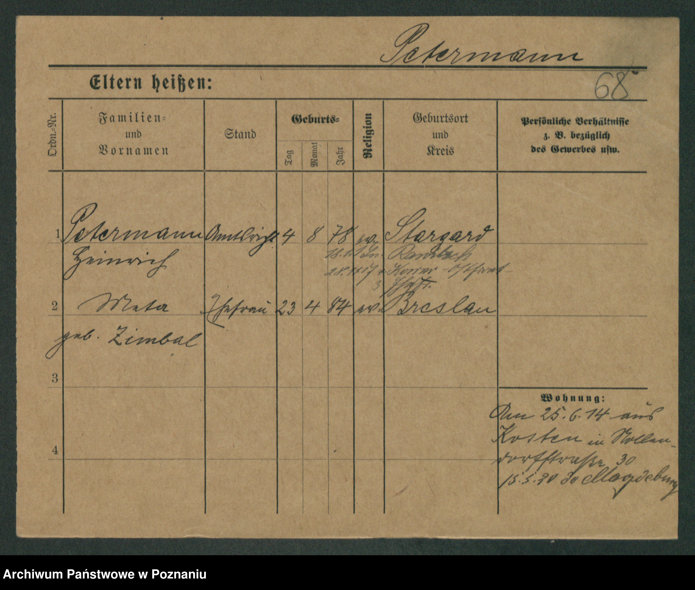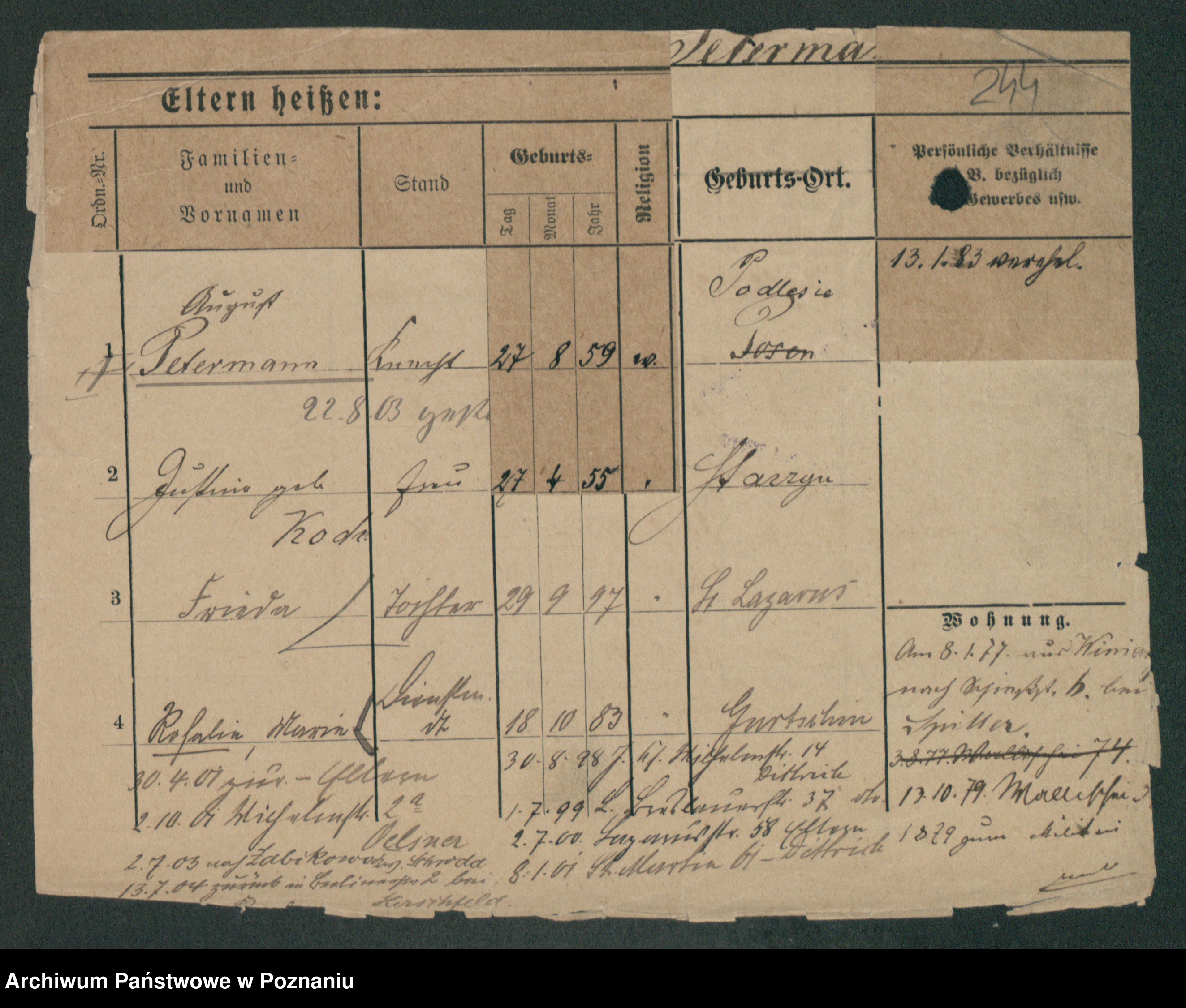 Podgląd karty osobowej dostępny jest po kliknięciu na nazwisko lub ikonkę karty. Można dokonywać powiększenia (ikony na górze) lub przechodzić między kolejnymi skanami (strzałki po bokach).