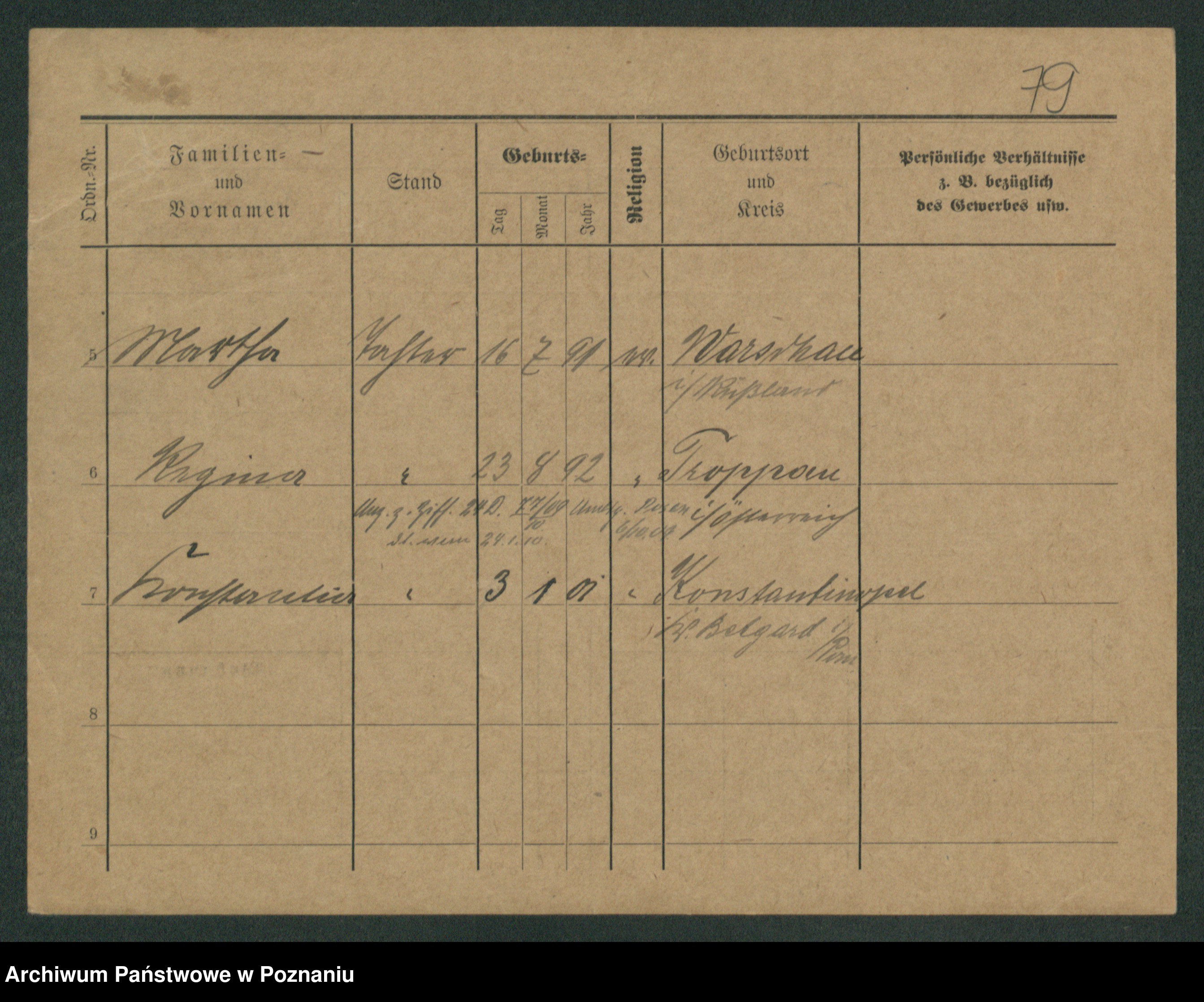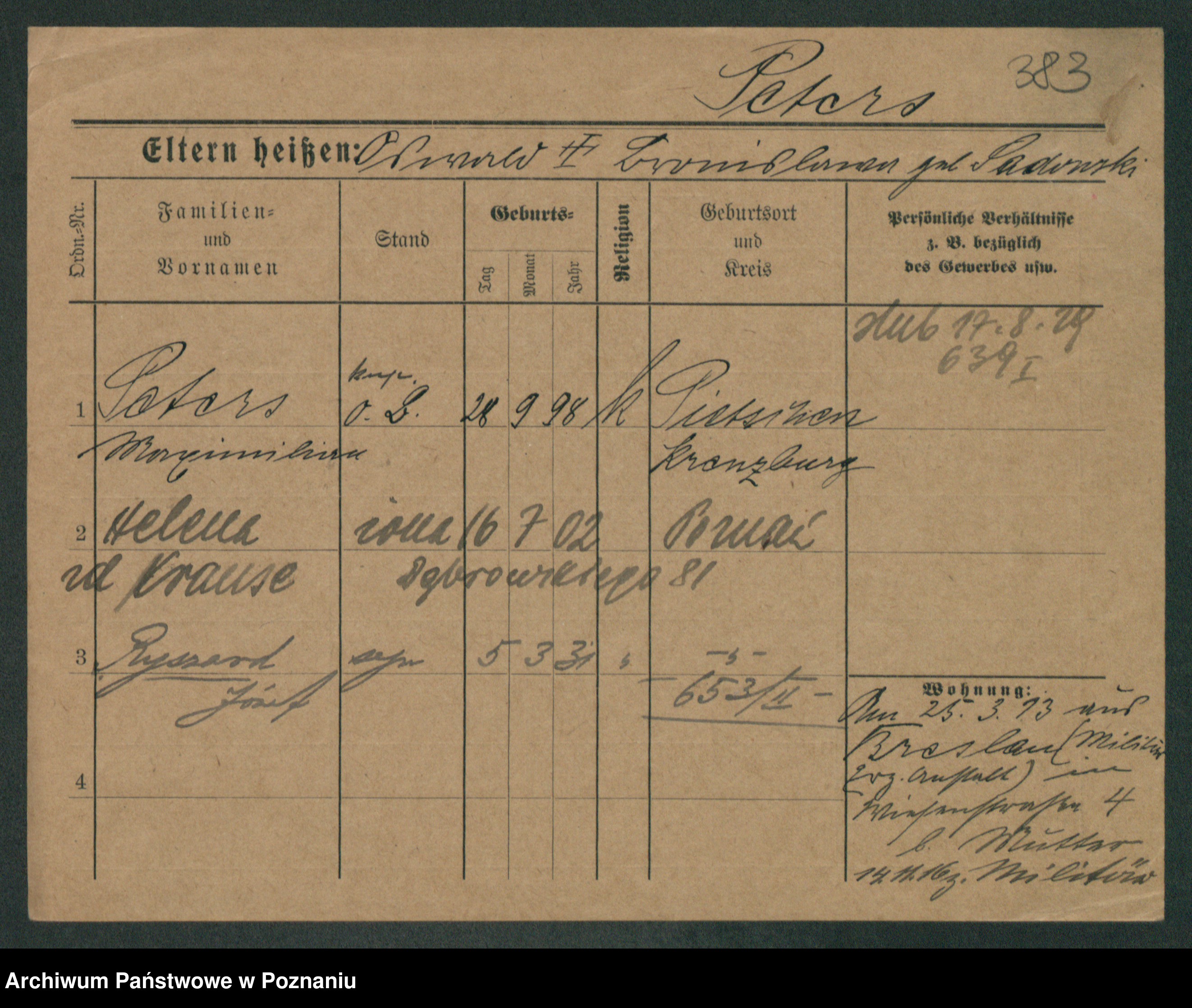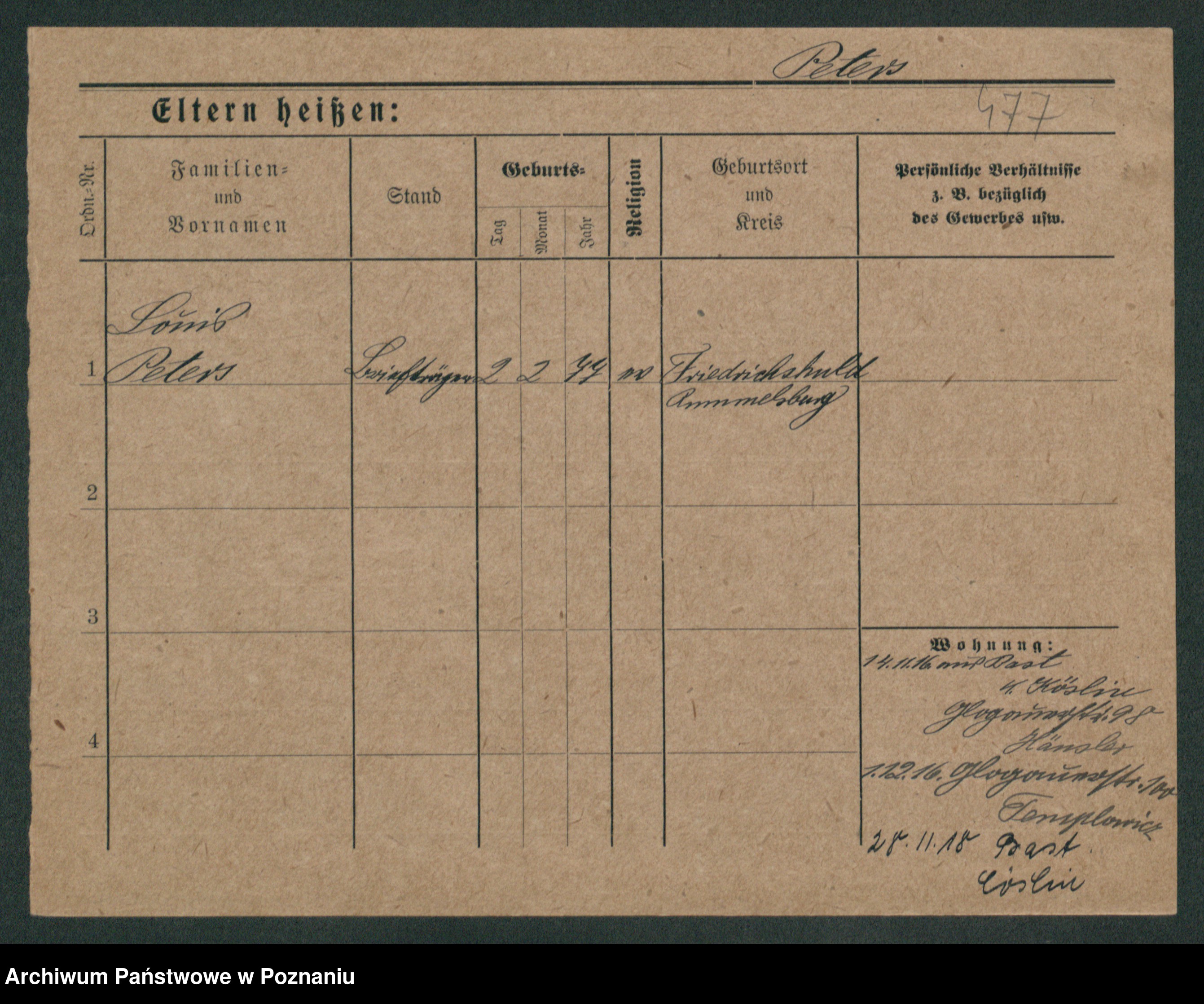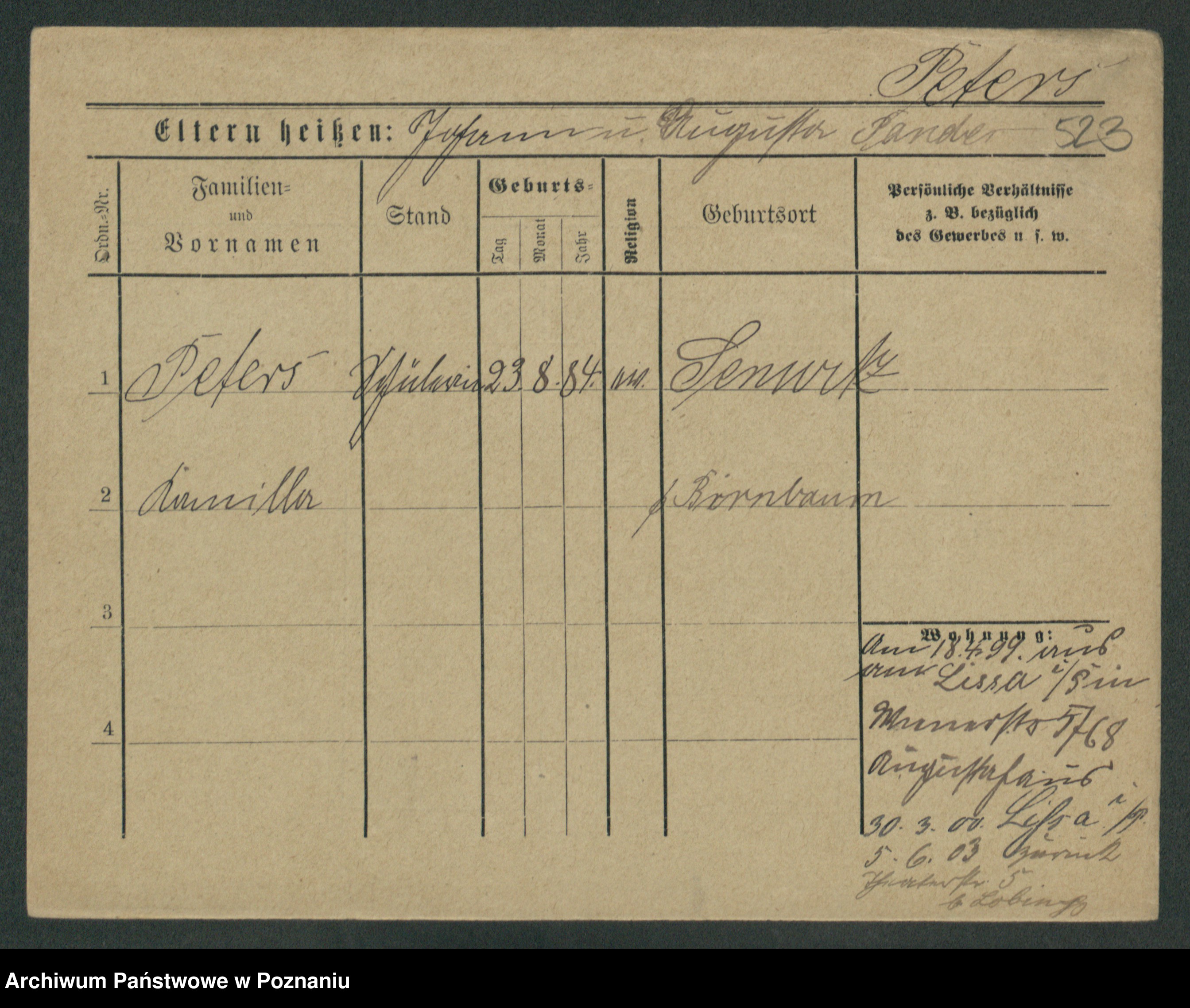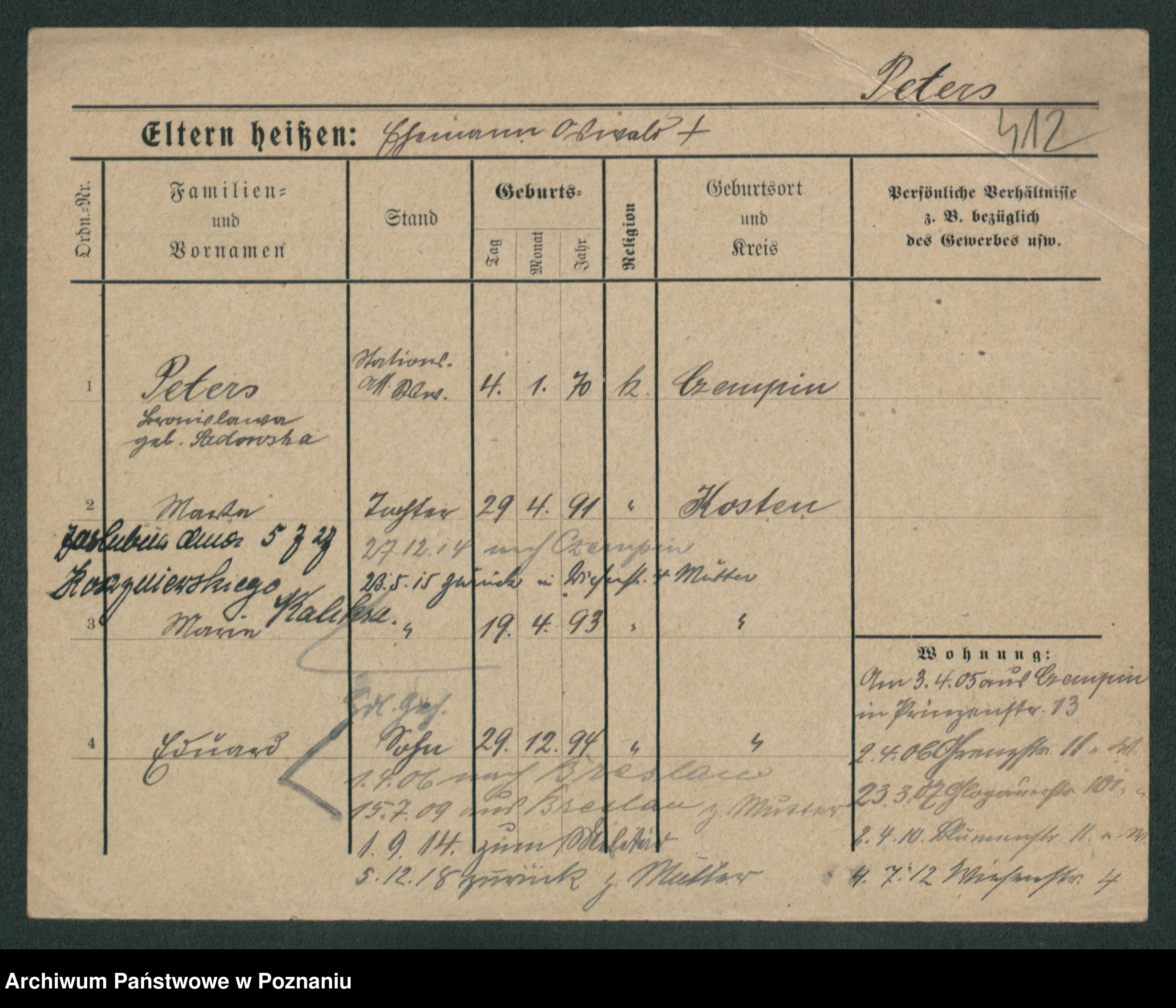 Podgląd karty osobowej dostępny jest po kliknięciu na nazwisko lub ikonkę karty. Można dokonywać powiększenia (ikony na górze) lub przechodzić między kolejnymi skanami (strzałki po bokach).