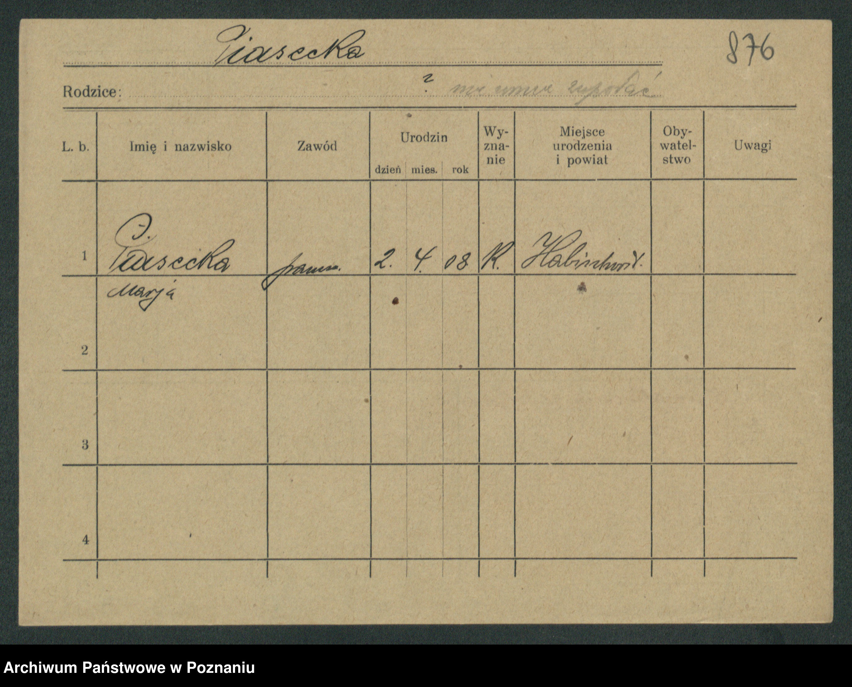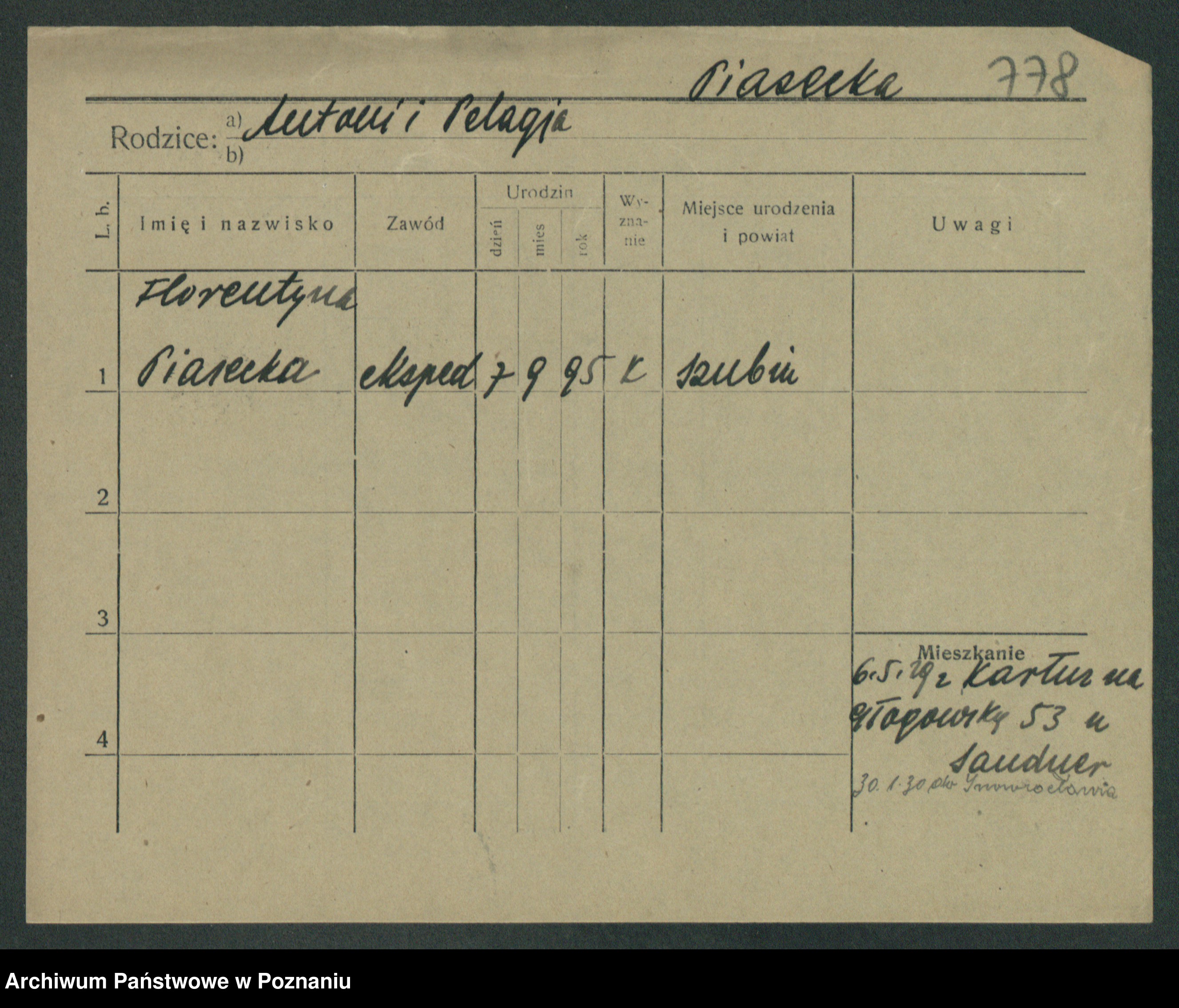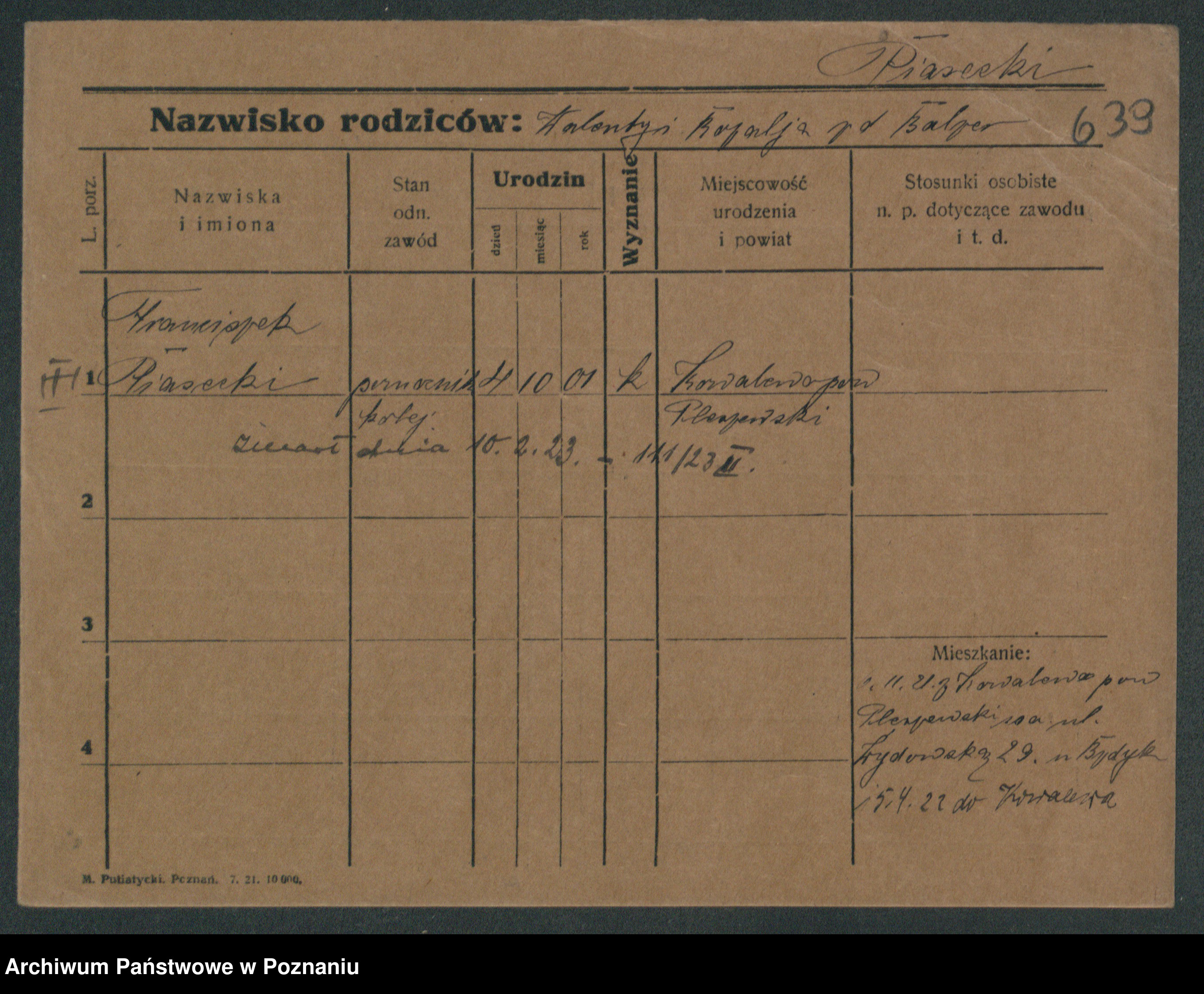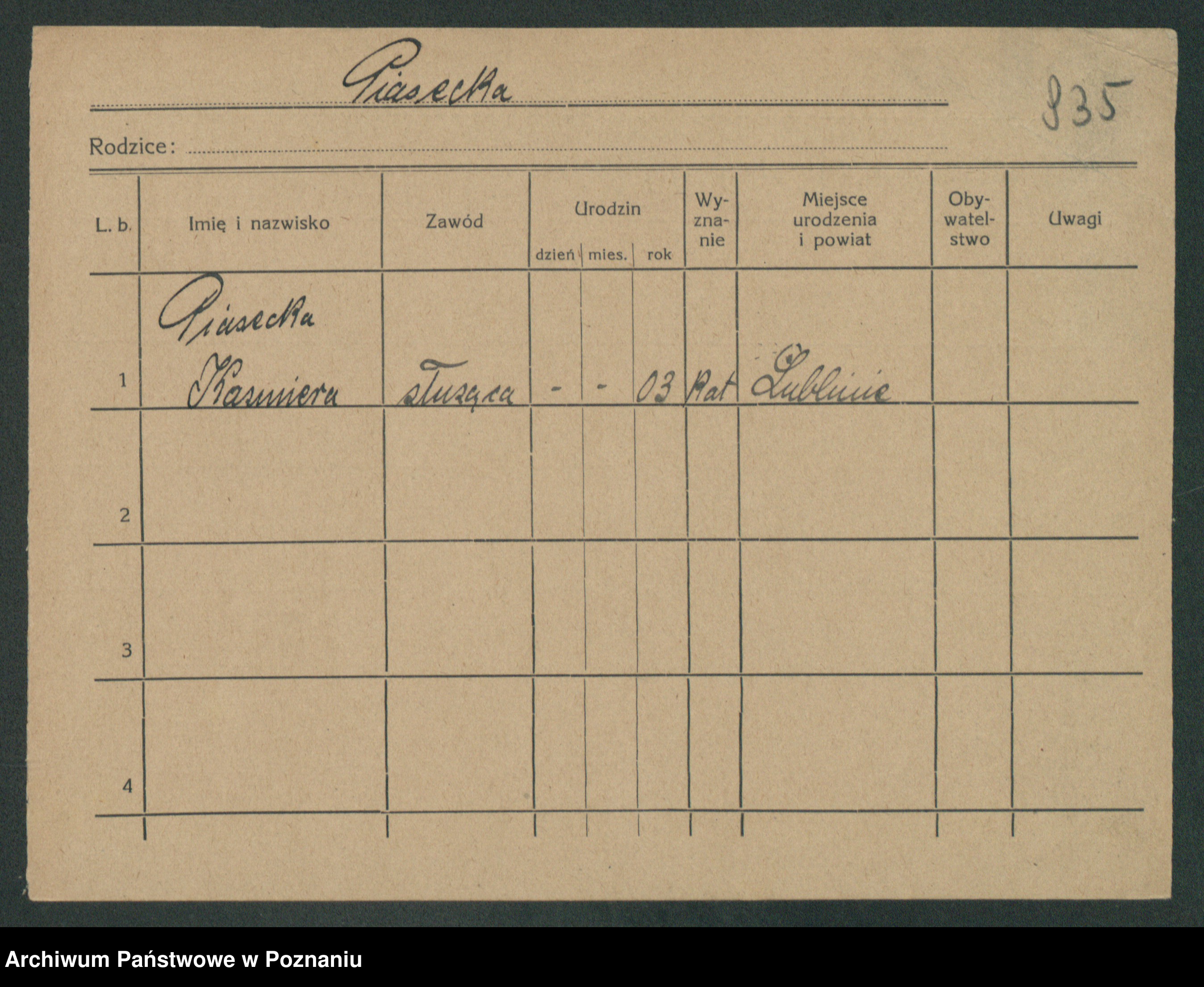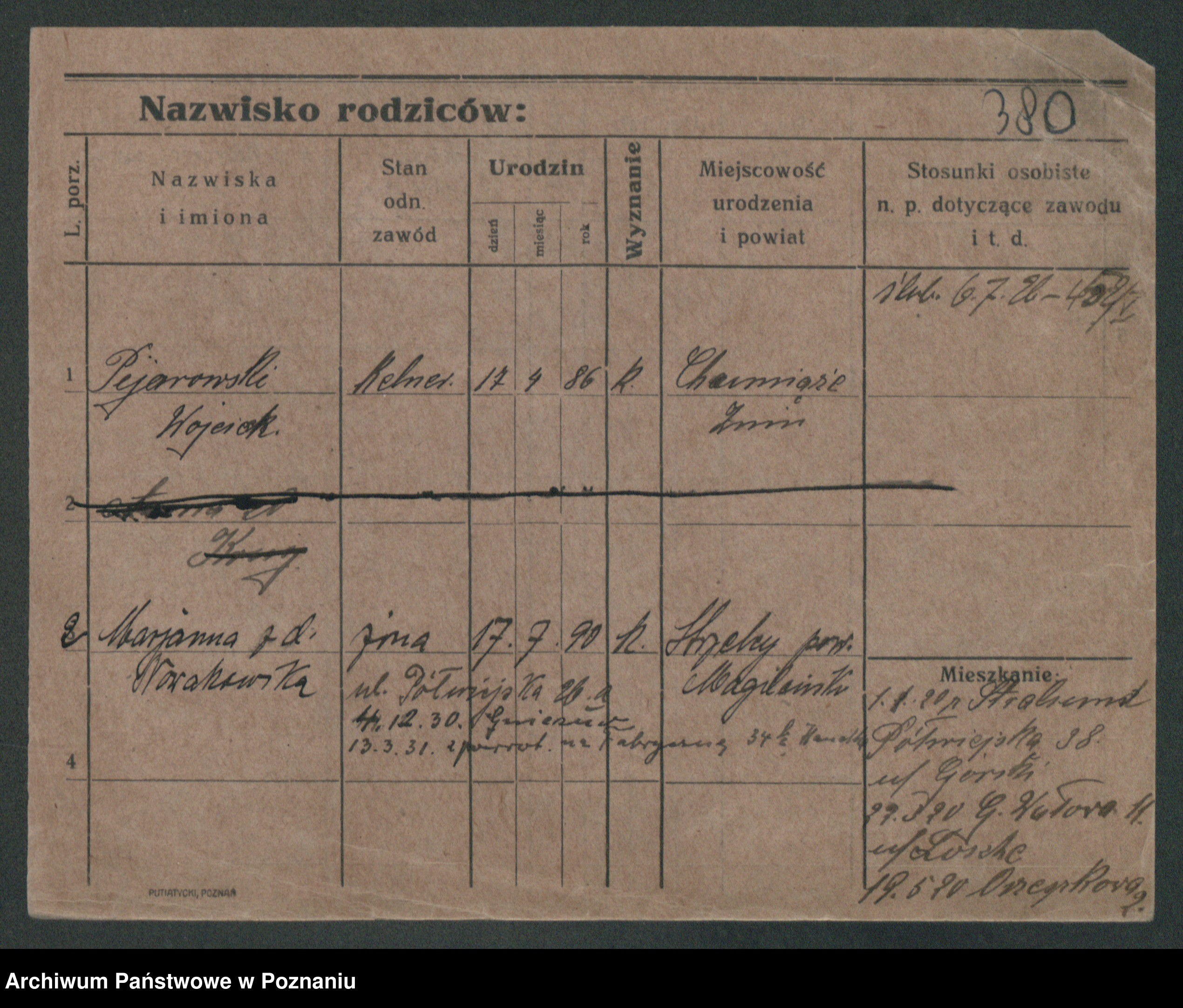 Podgląd karty osobowej dostępny jest po kliknięciu na nazwisko lub ikonkę karty. Można dokonywać powiększenia (ikony na górze) lub przechodzić między kolejnymi skanami (strzałki po bokach).