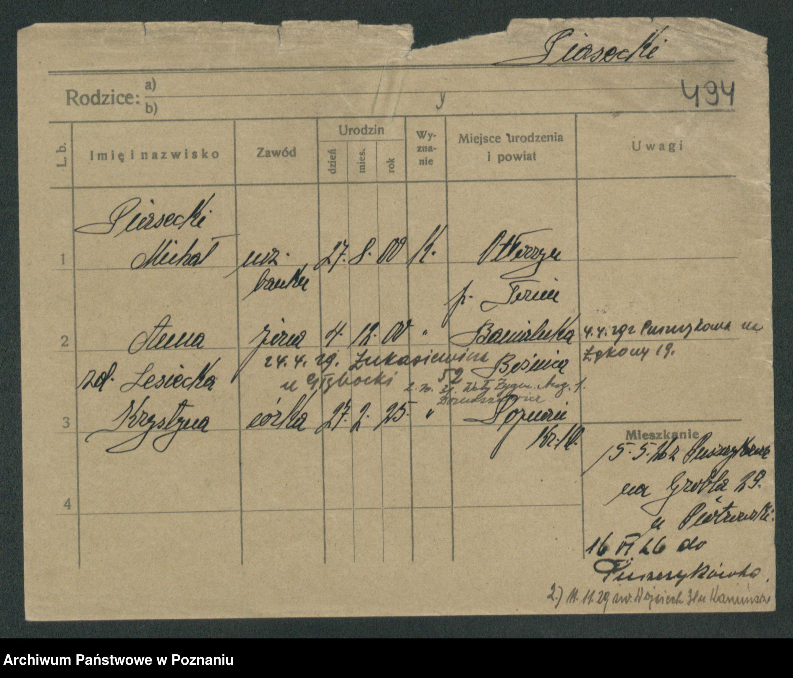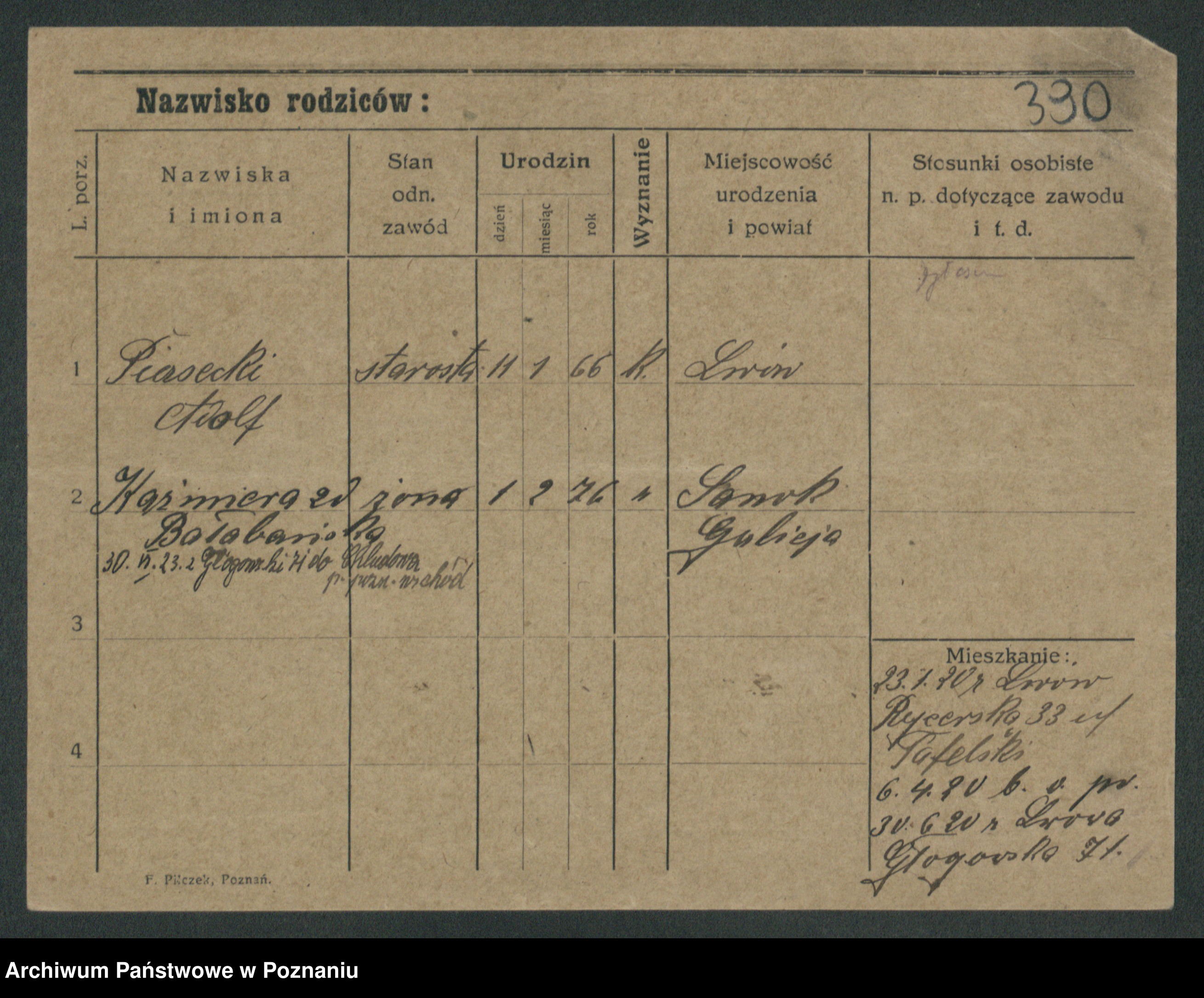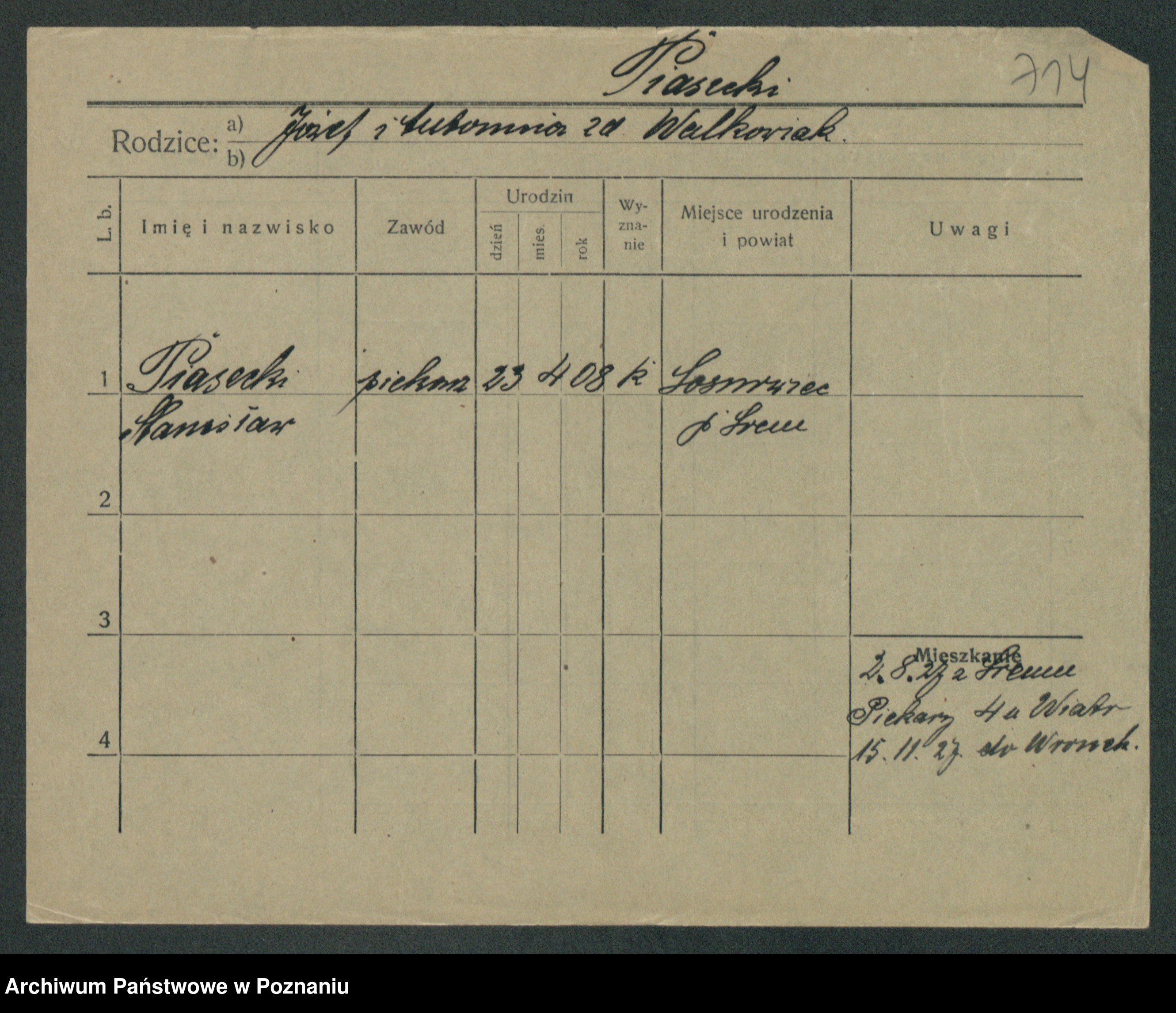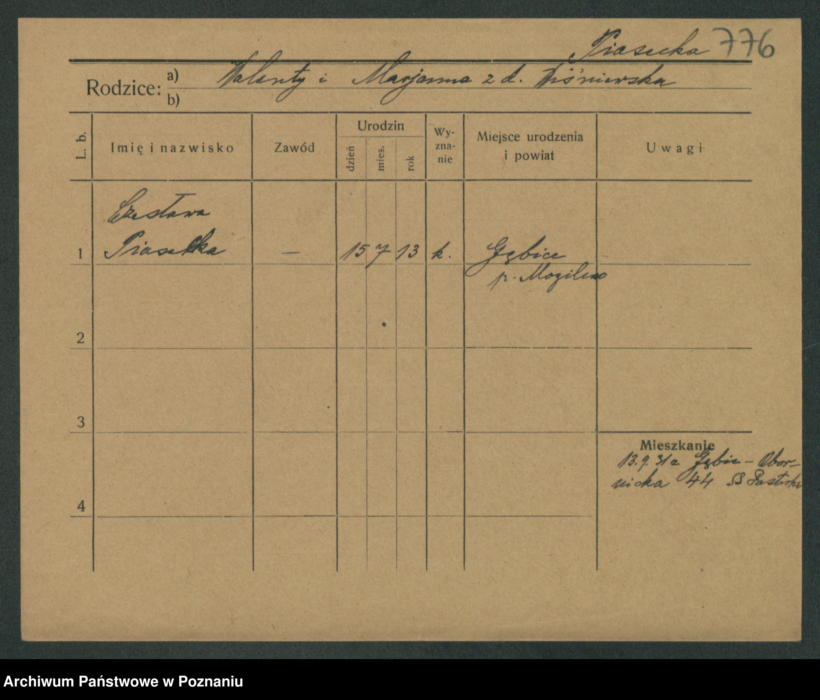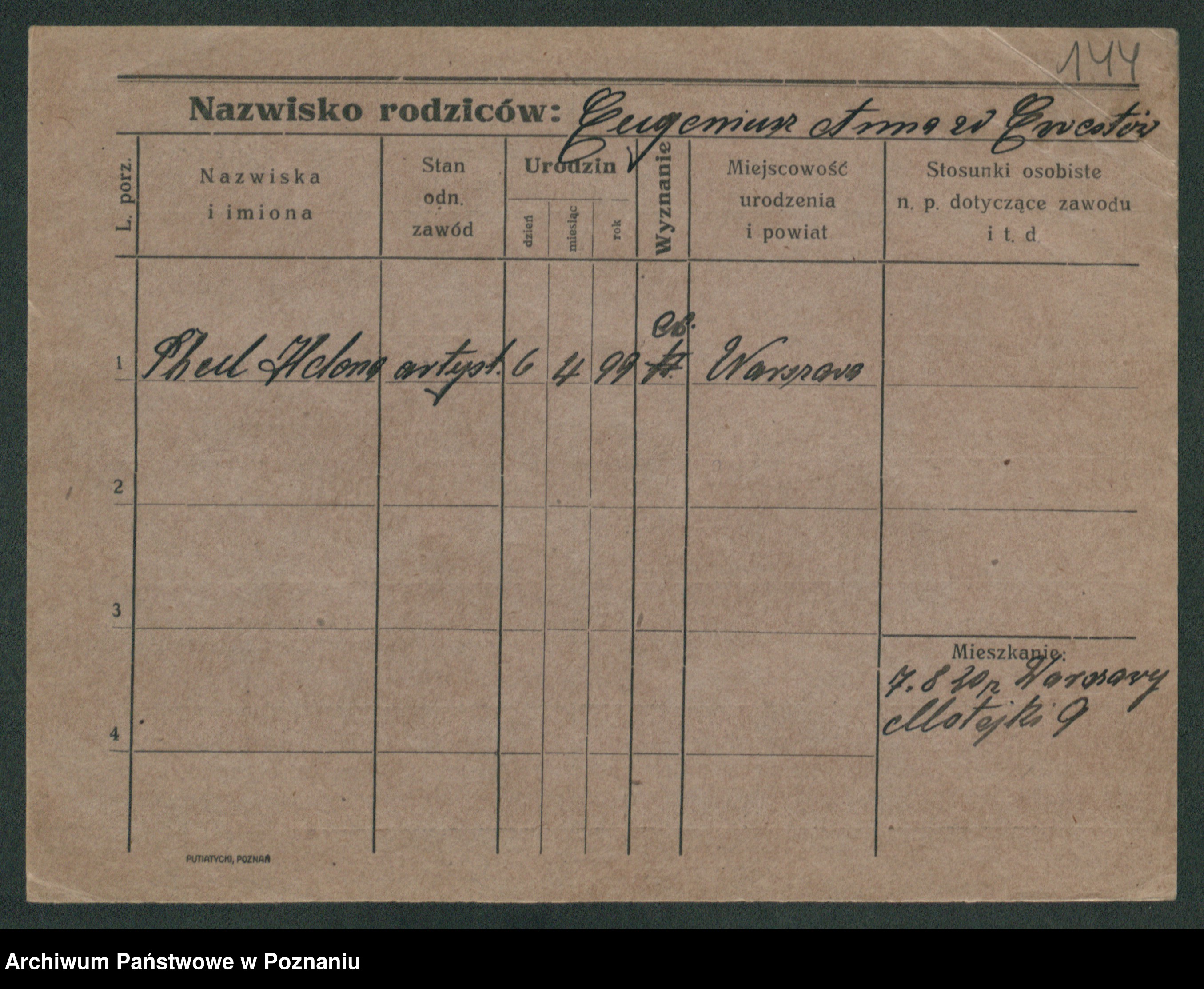 Podgląd karty osobowej dostępny jest po kliknięciu na nazwisko lub ikonkę karty. Można dokonywać powiększenia (ikony na górze) lub przechodzić między kolejnymi skanami (strzałki po bokach).