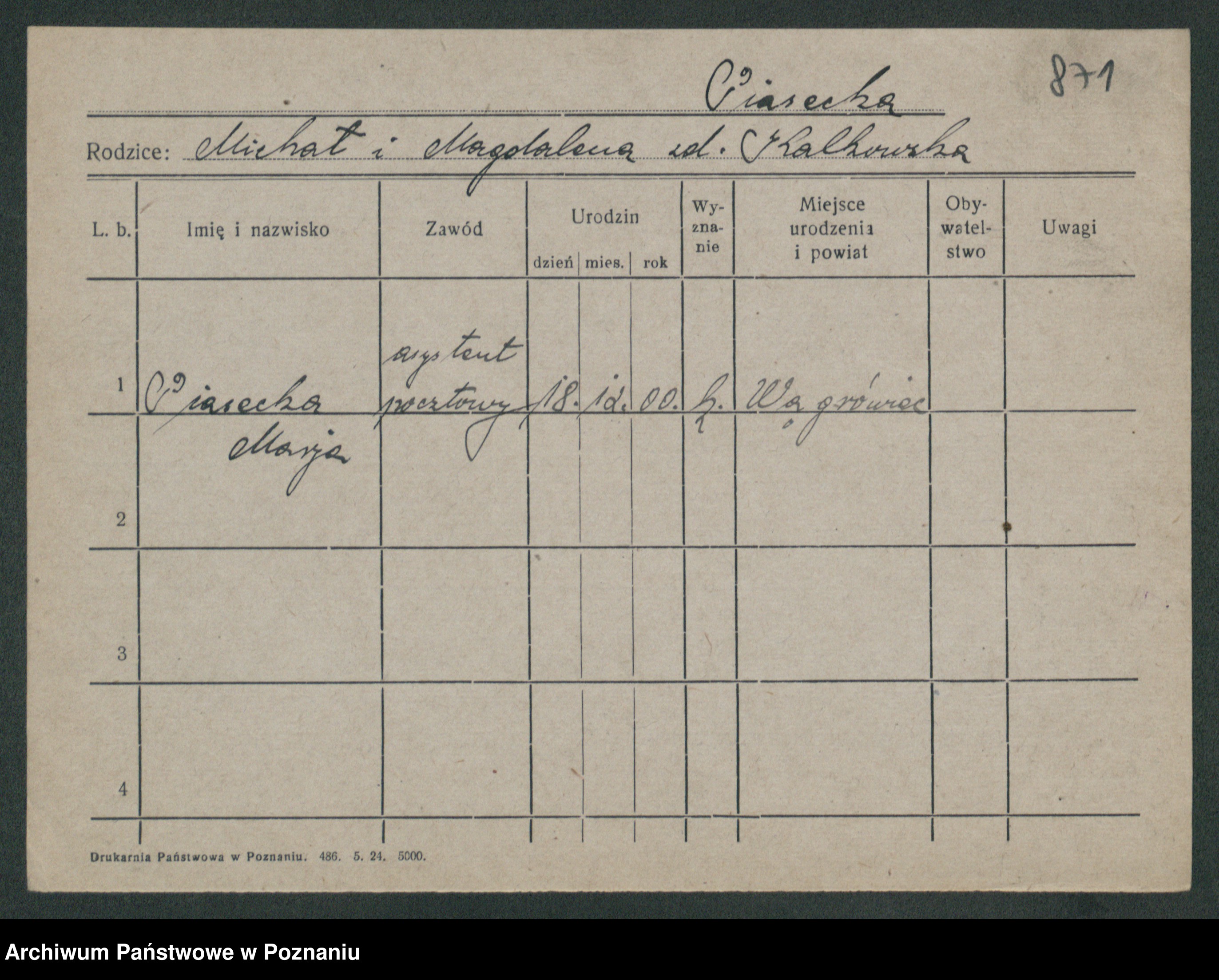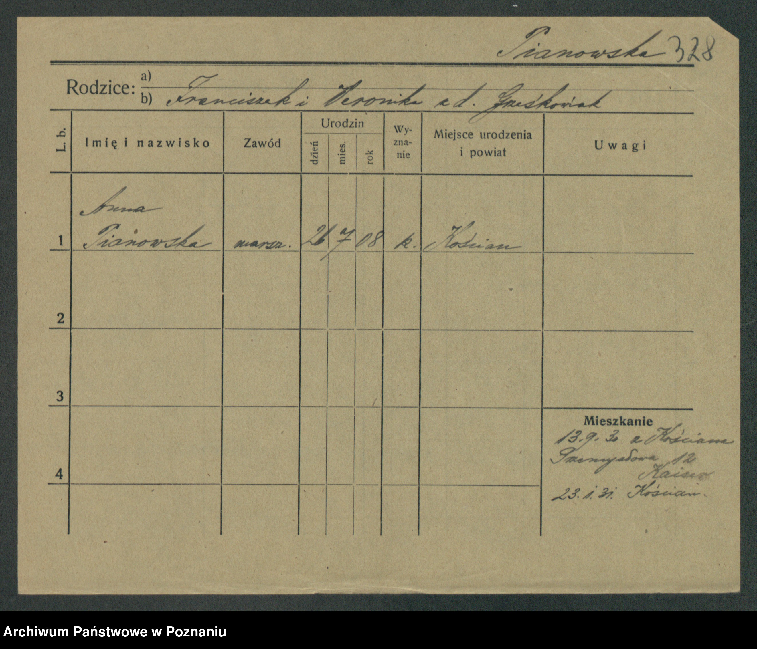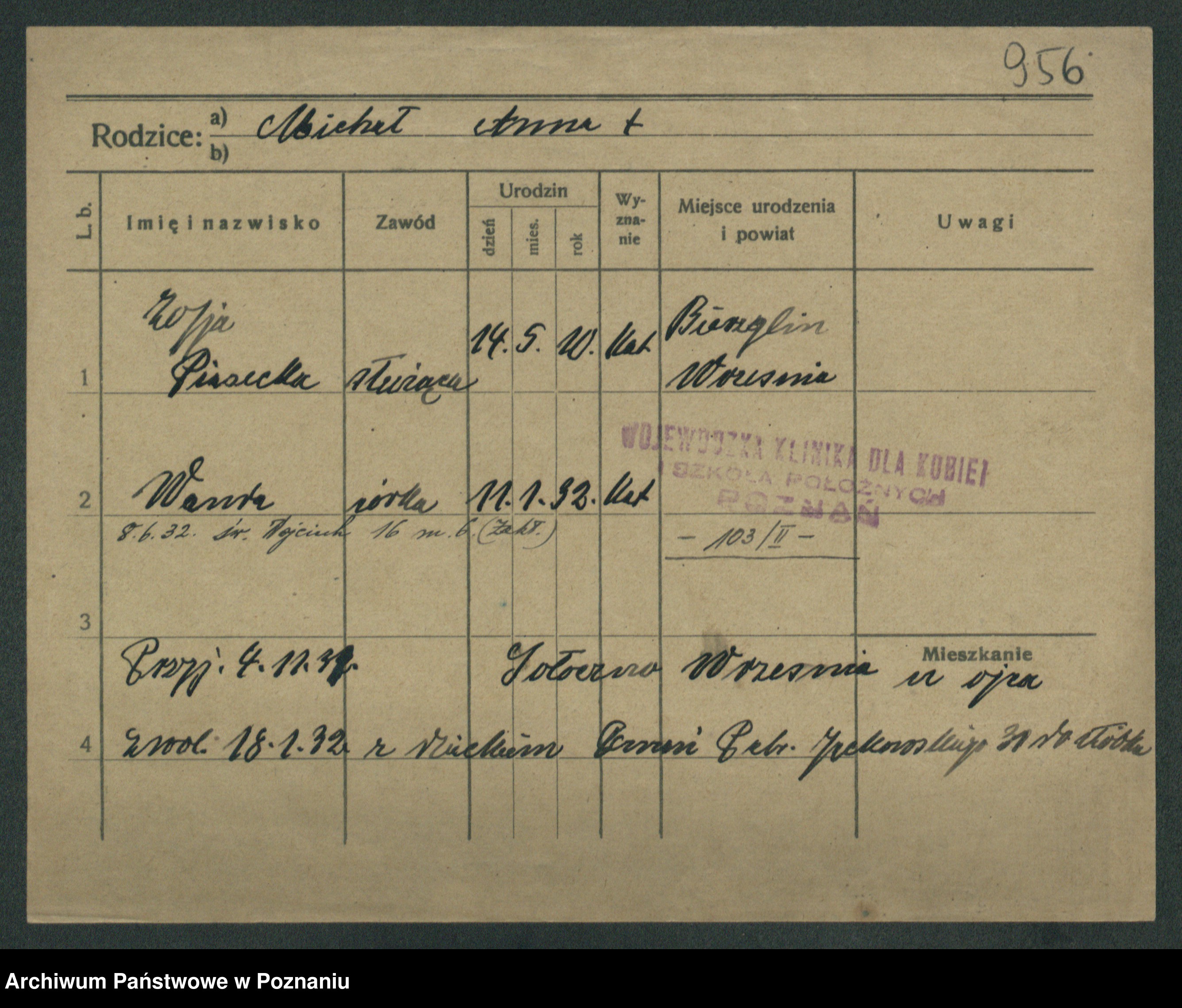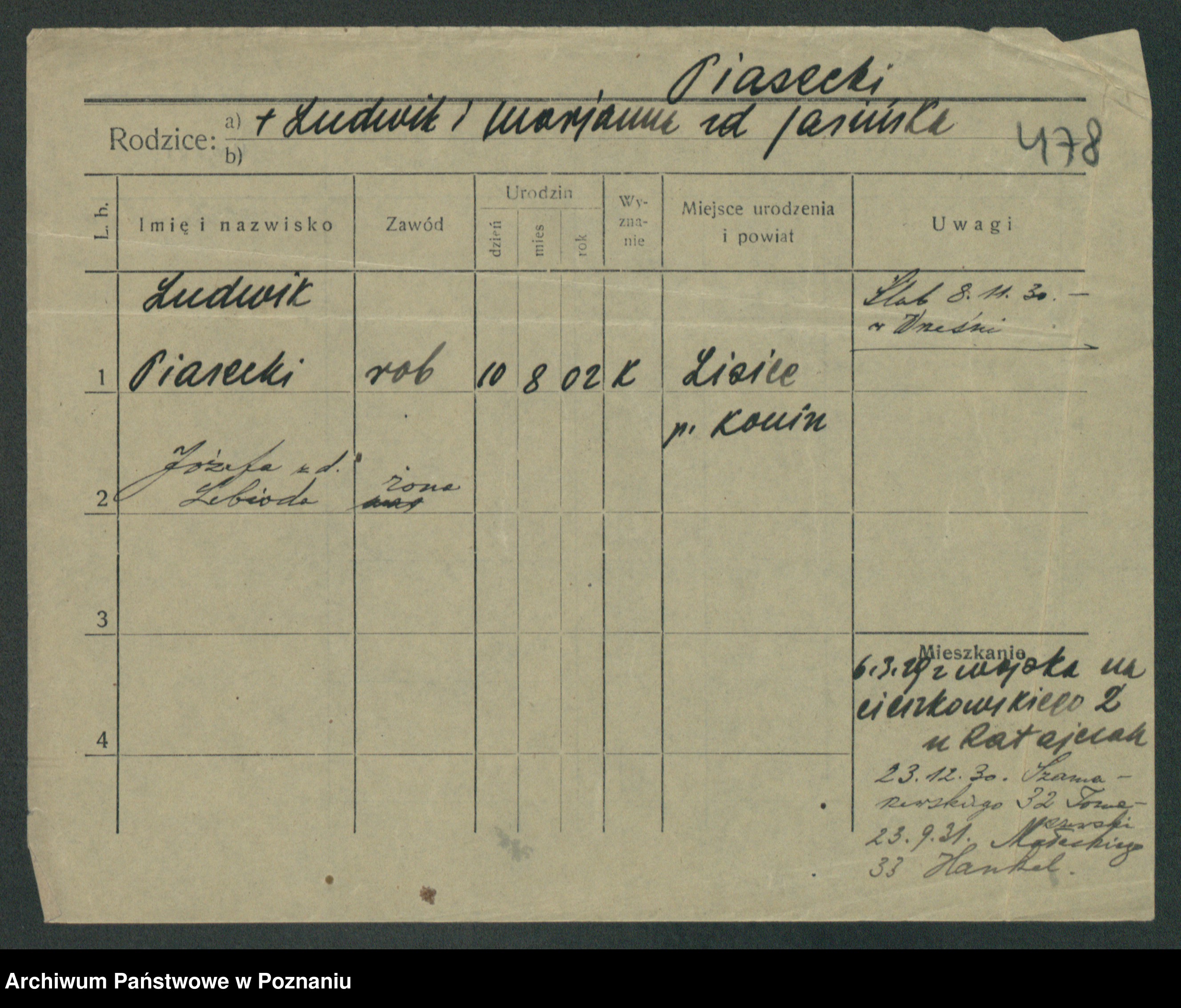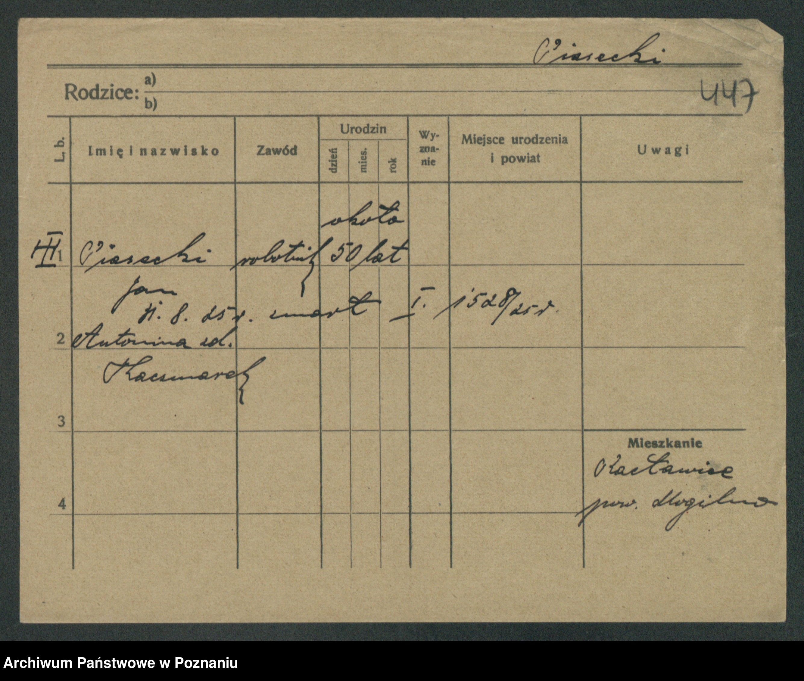 Podgląd karty osobowej dostępny jest po kliknięciu na nazwisko lub ikonkę karty. Można dokonywać powiększenia (ikony na górze) lub przechodzić między kolejnymi skanami (strzałki po bokach).