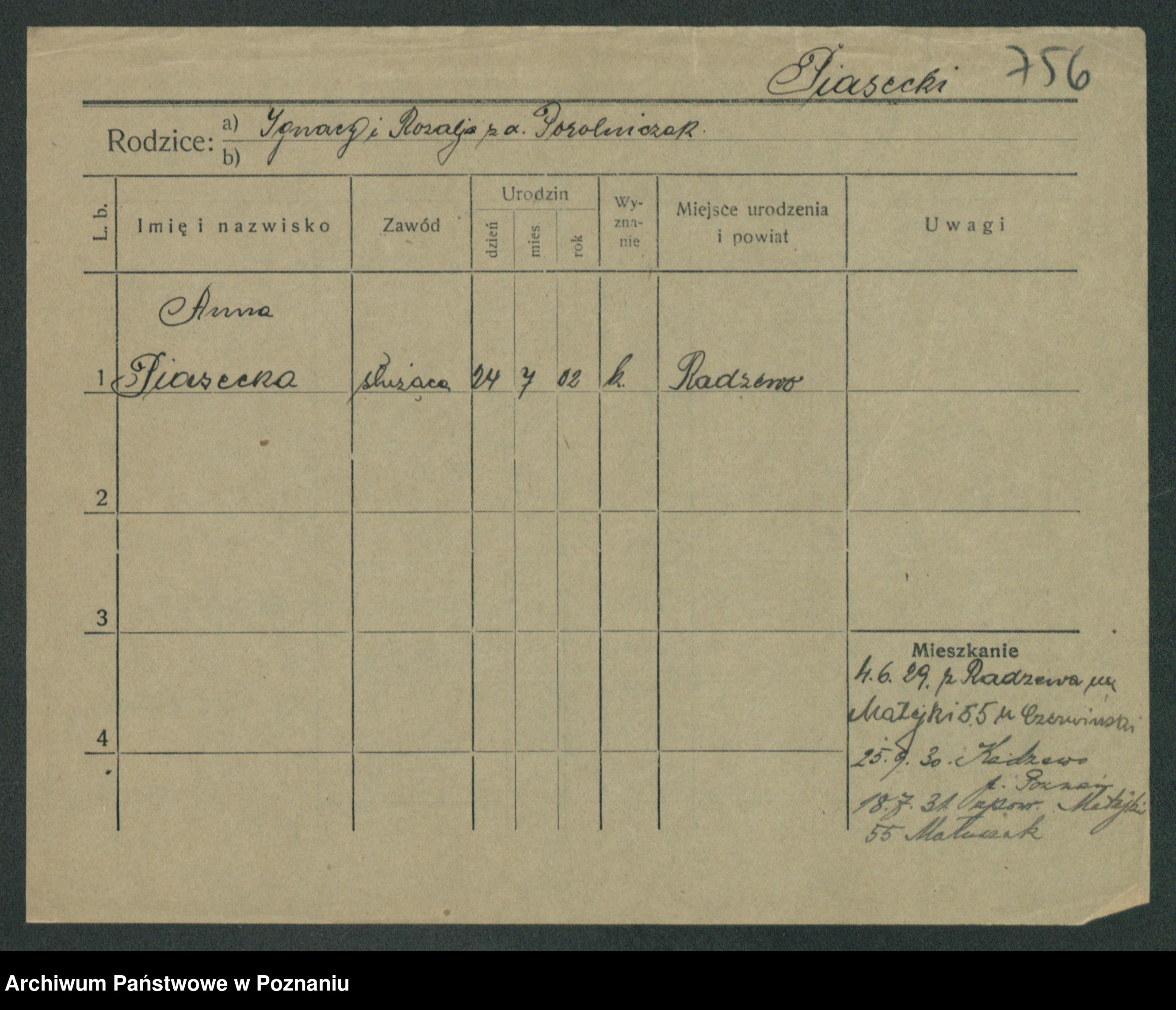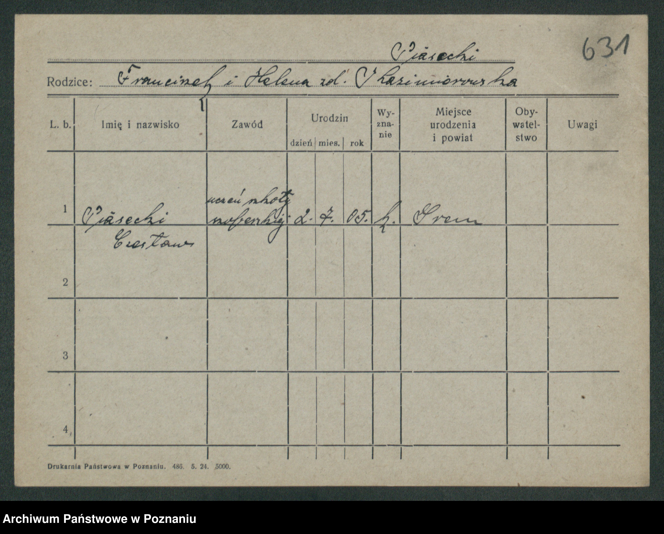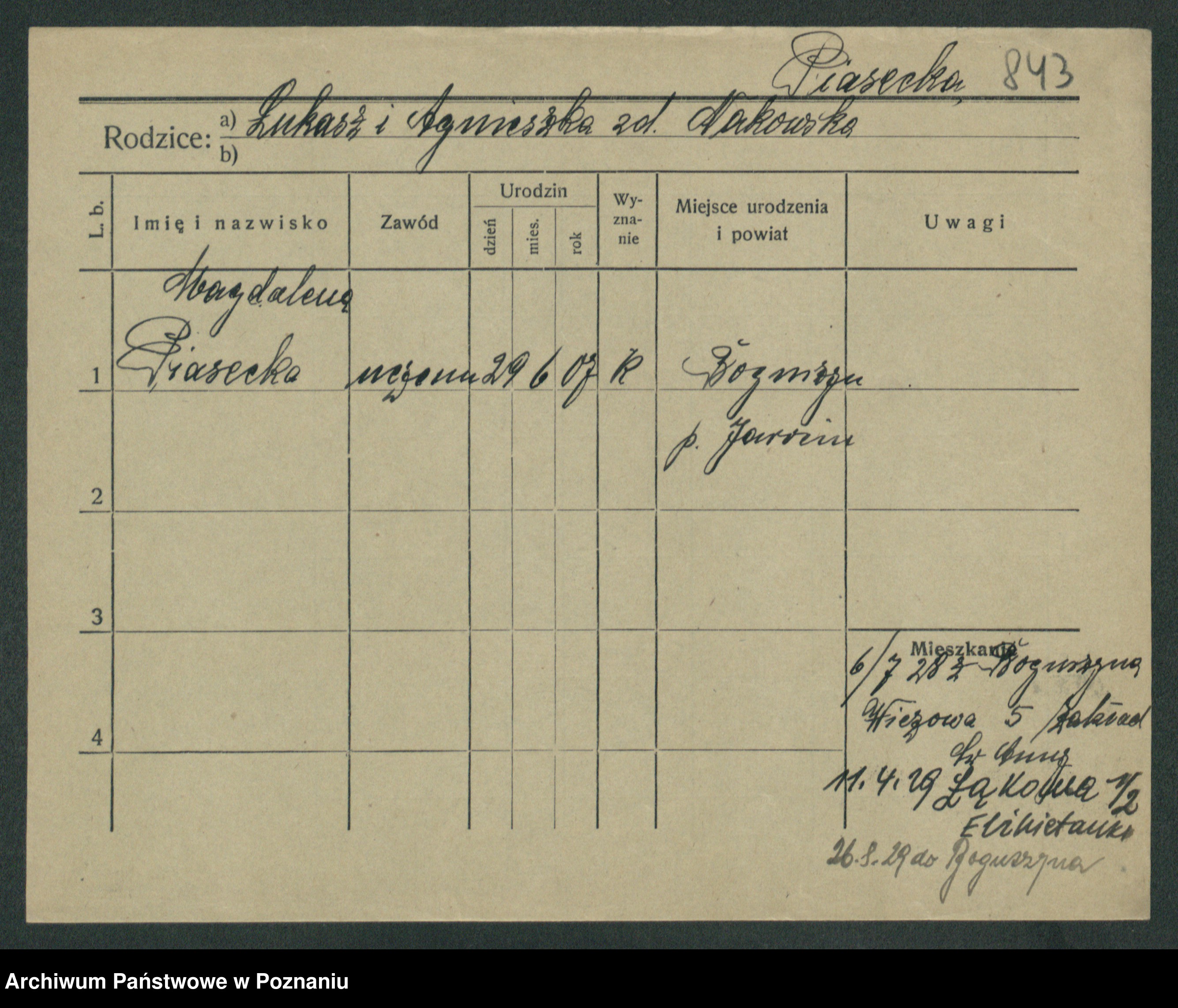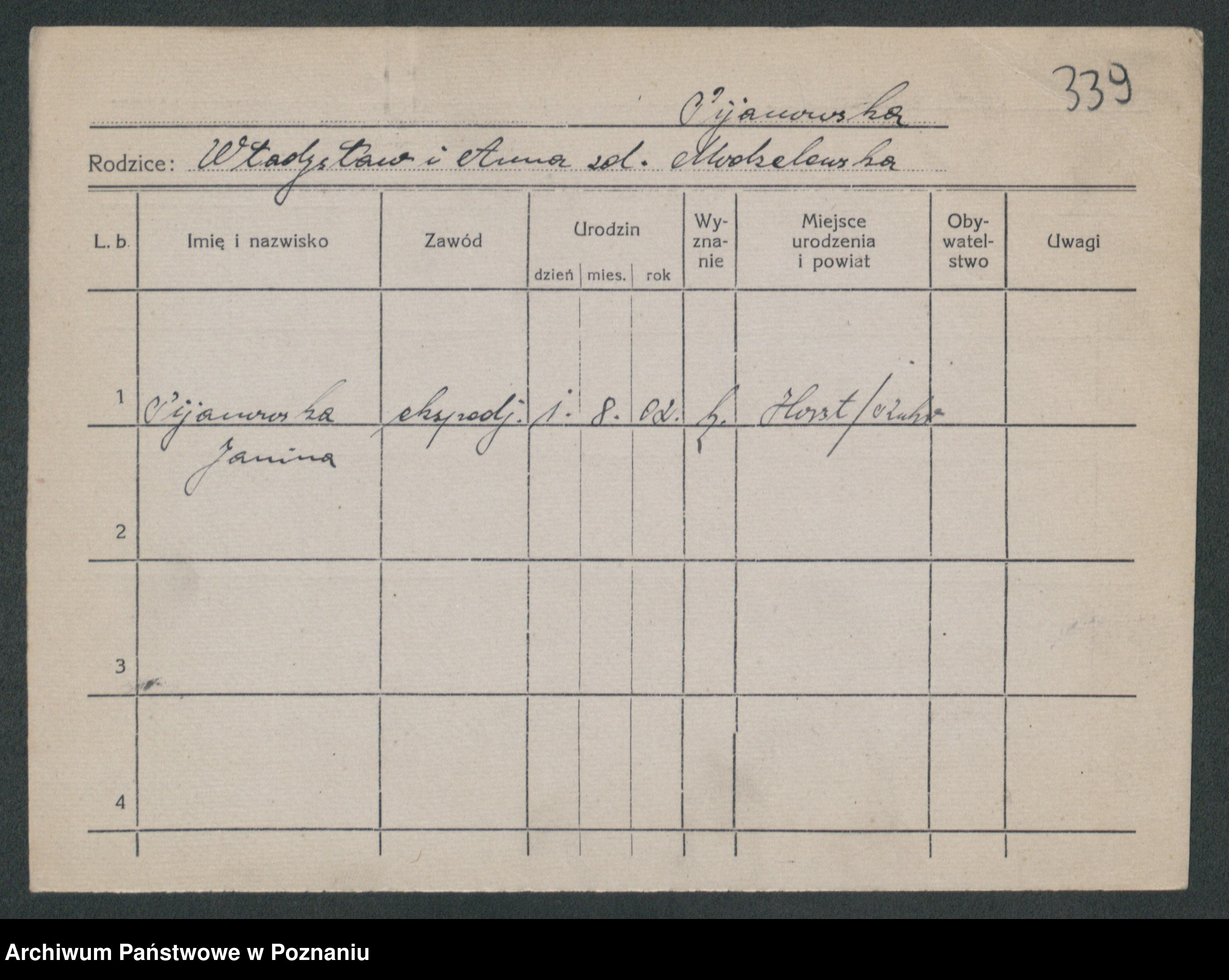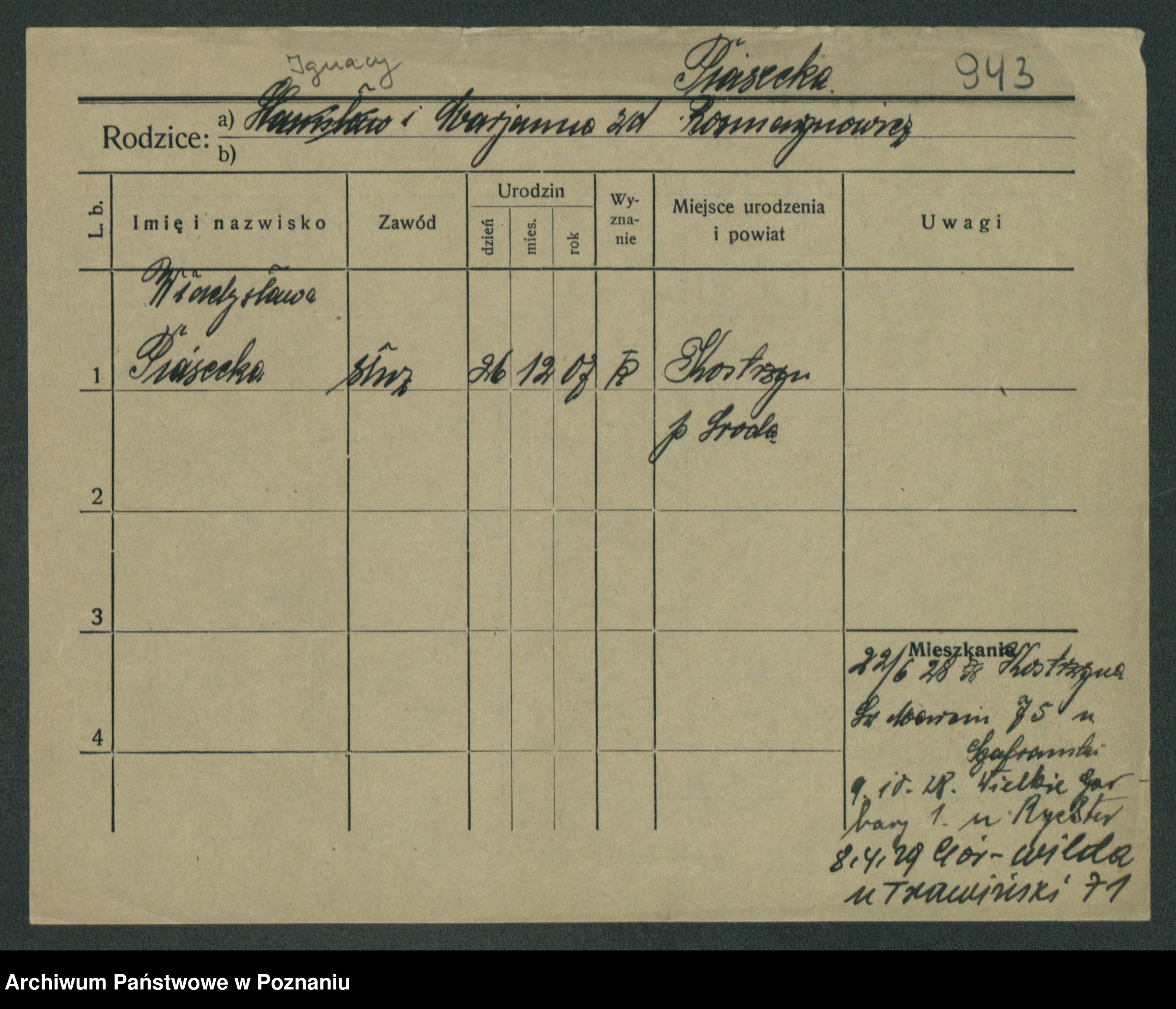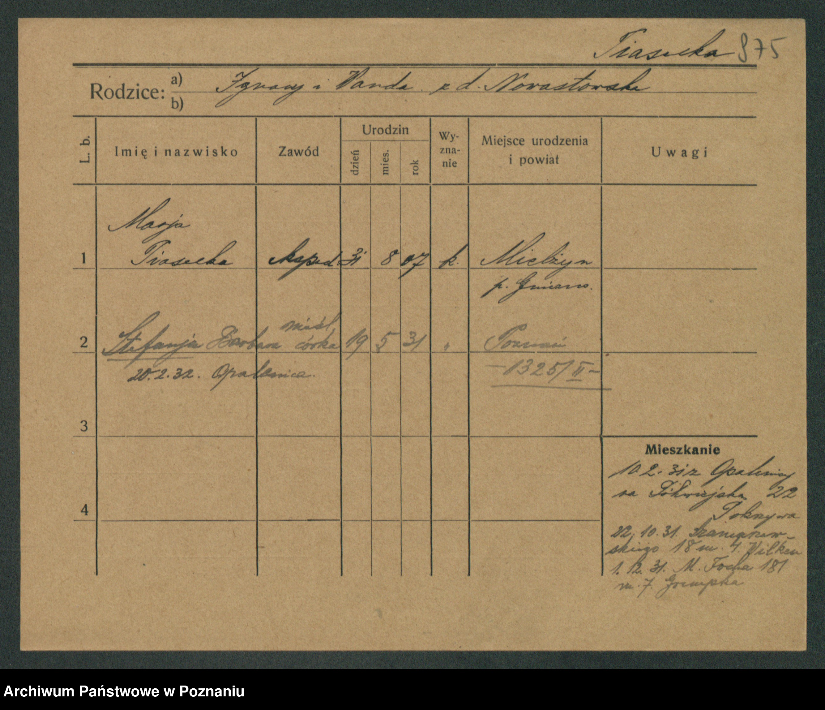 Podgląd karty osobowej dostępny jest po kliknięciu na nazwisko lub ikonkę karty. Można dokonywać powiększenia (ikony na górze) lub przechodzić między kolejnymi skanami (strzałki po bokach).