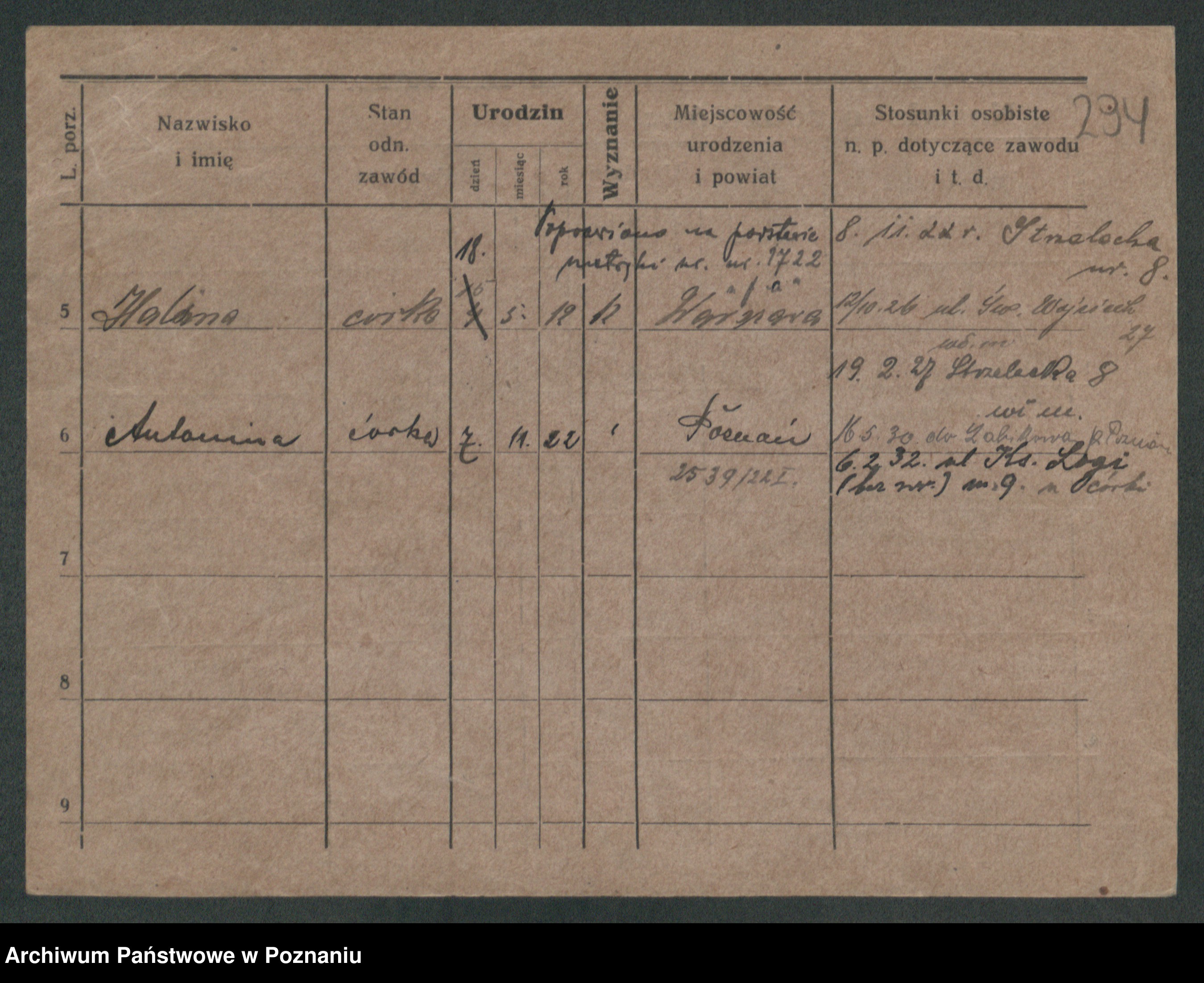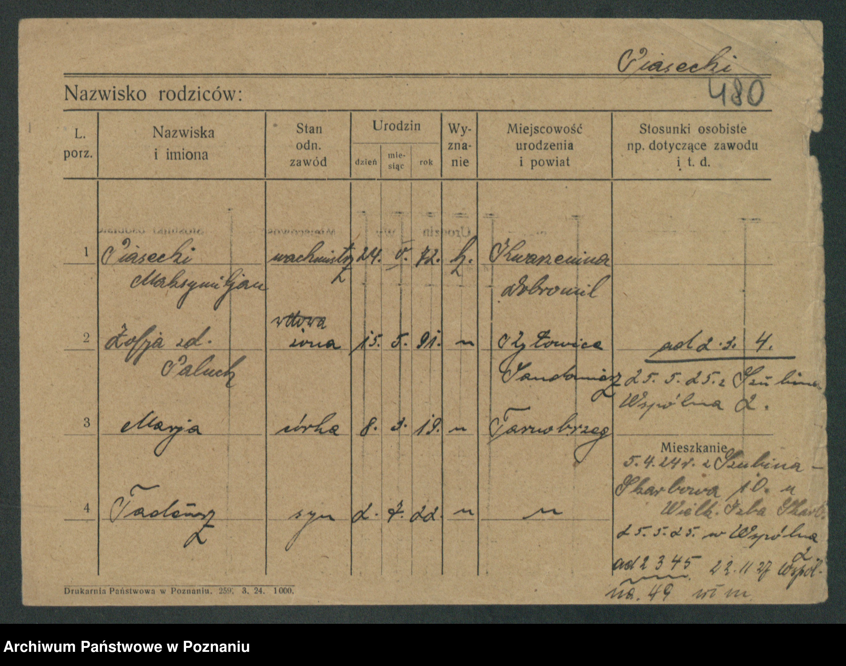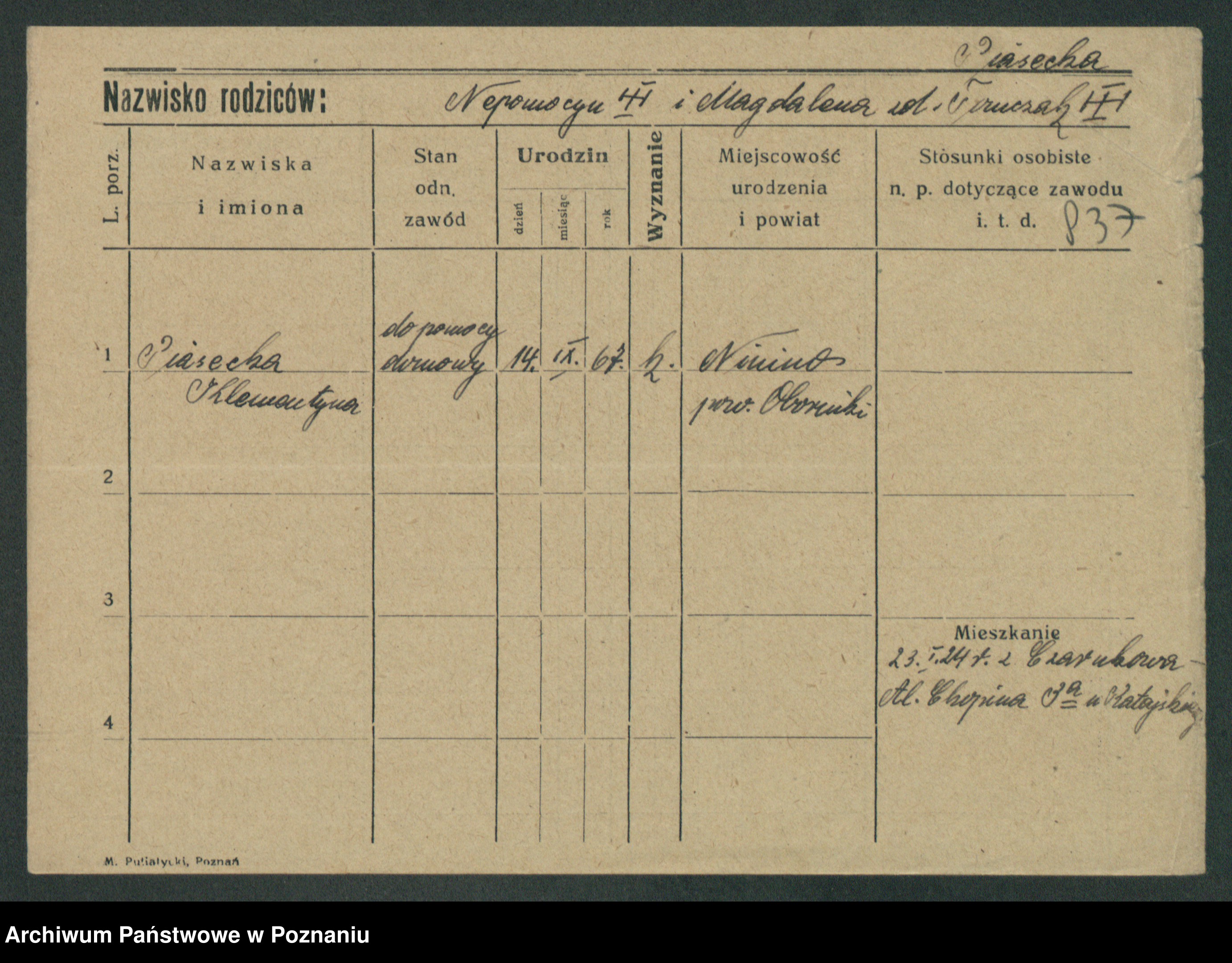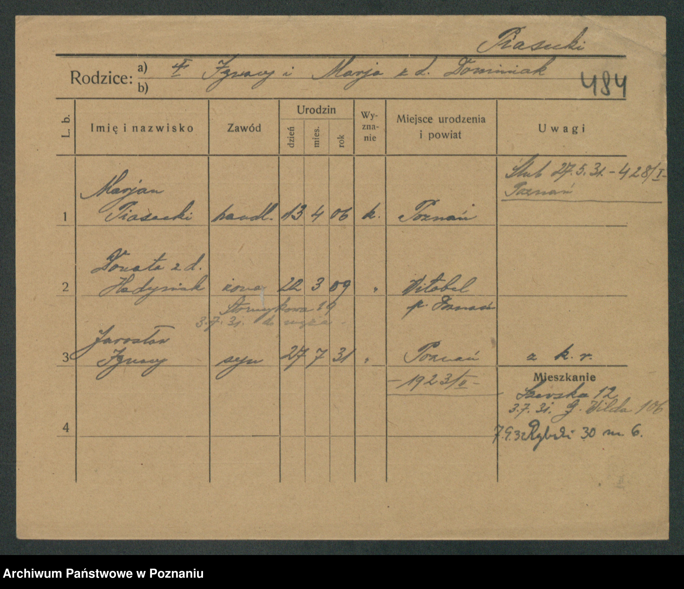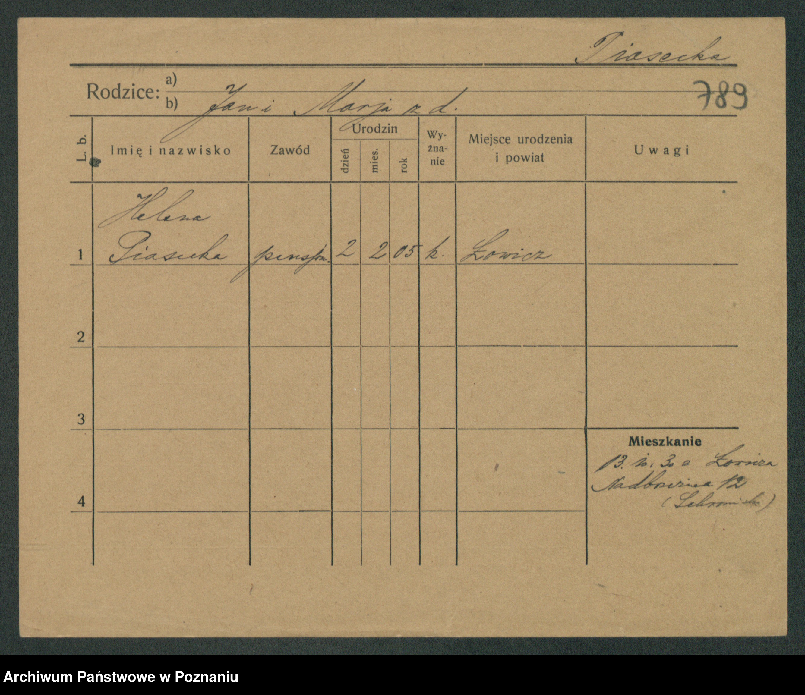 Podgląd karty osobowej dostępny jest po kliknięciu na nazwisko lub ikonkę karty. Można dokonywać powiększenia (ikony na górze) lub przechodzić między kolejnymi skanami (strzałki po bokach).
