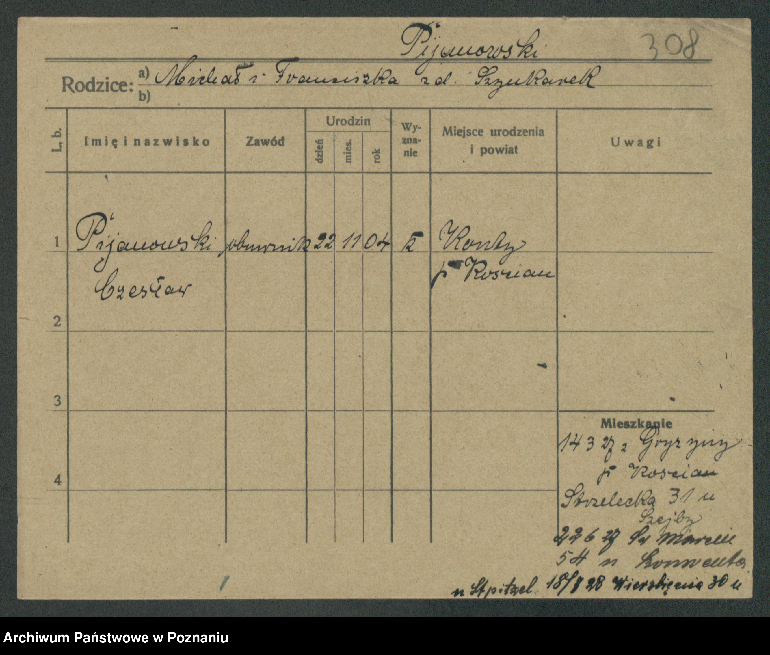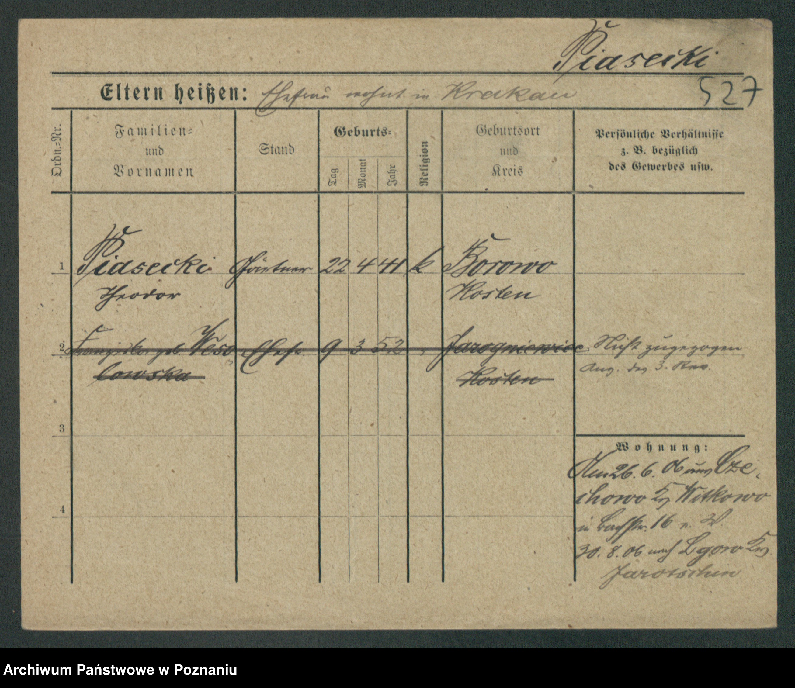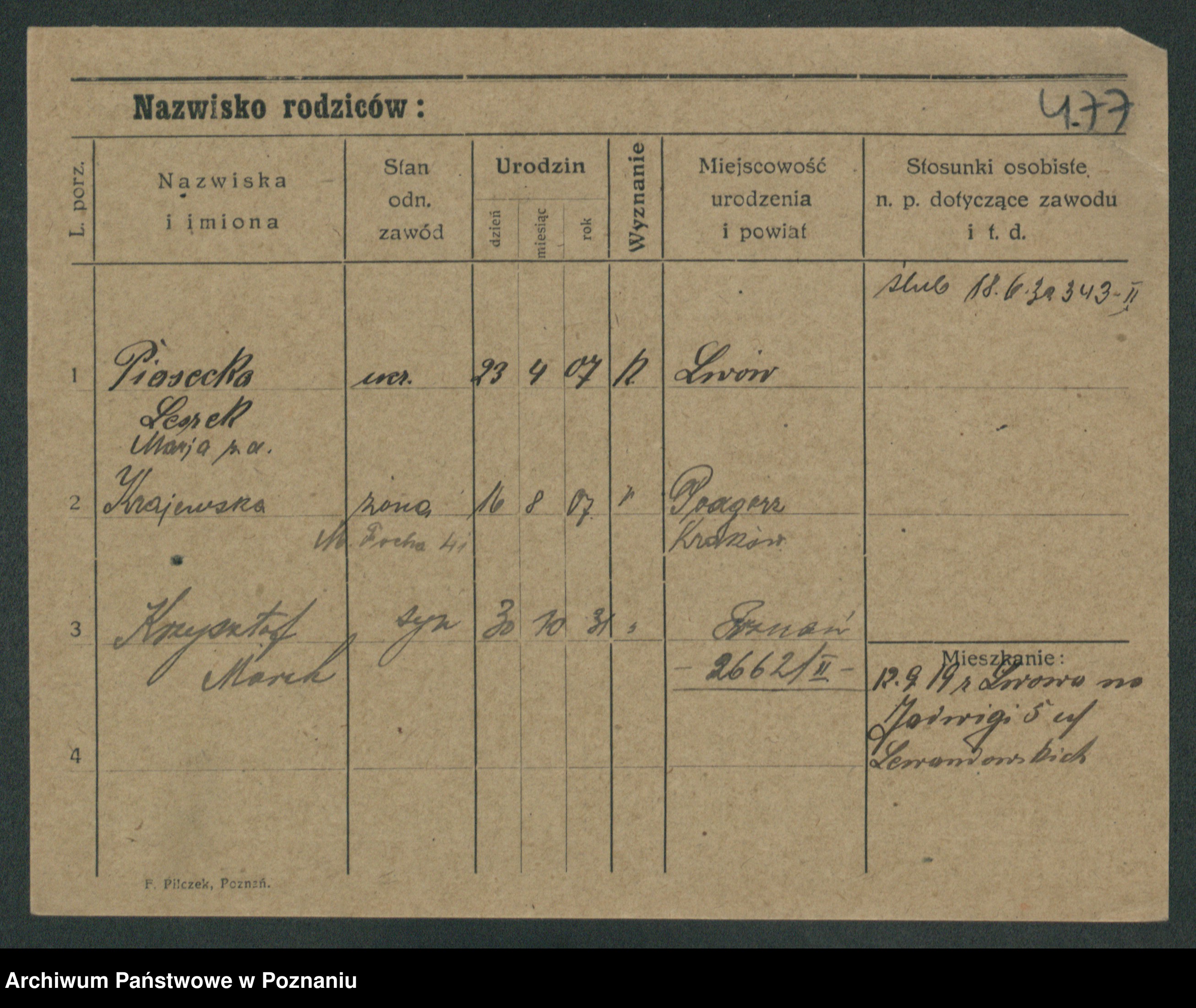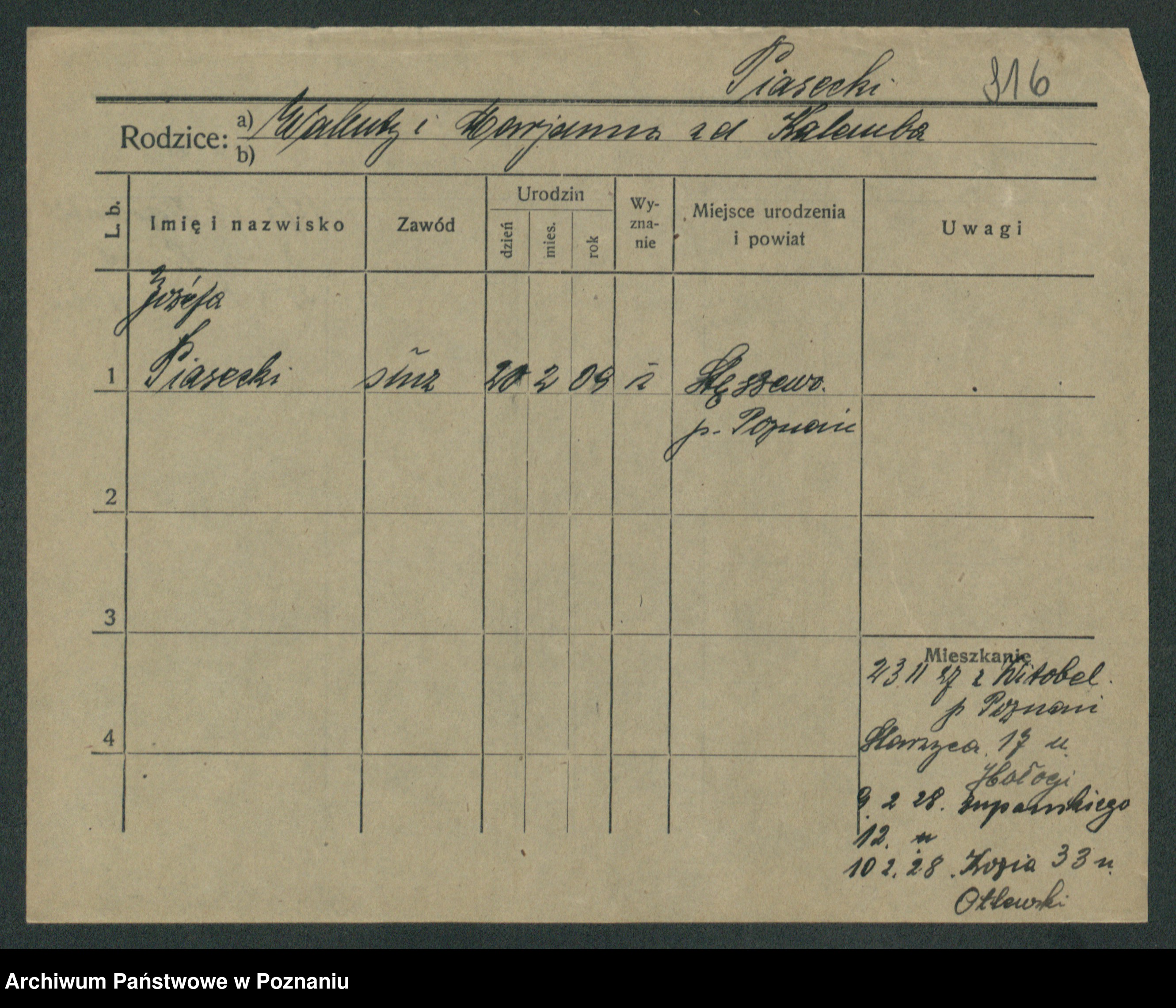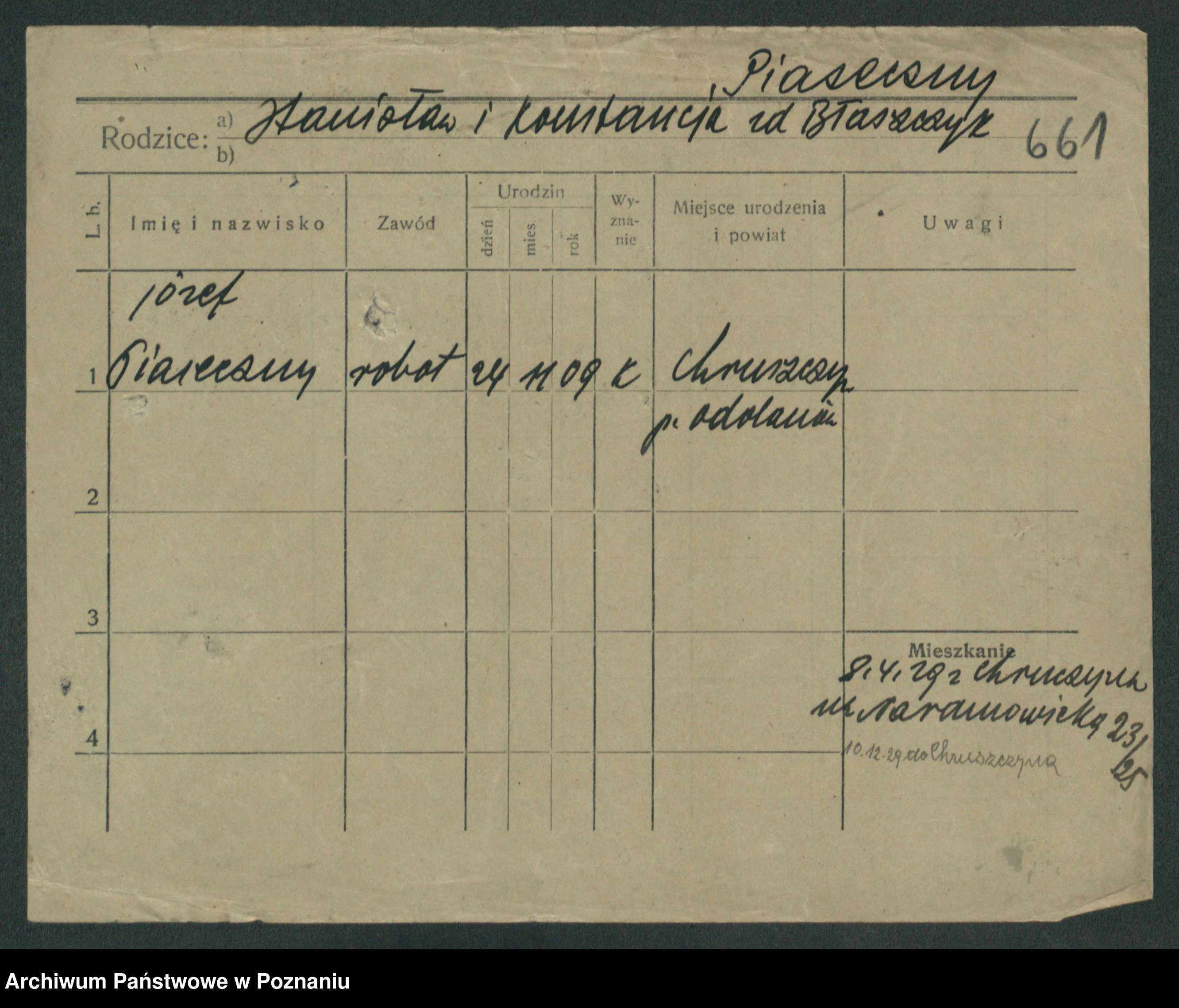 Podgląd karty osobowej dostępny jest po kliknięciu na nazwisko lub ikonkę karty. Można dokonywać powiększenia (ikony na górze) lub przechodzić między kolejnymi skanami (strzałki po bokach).