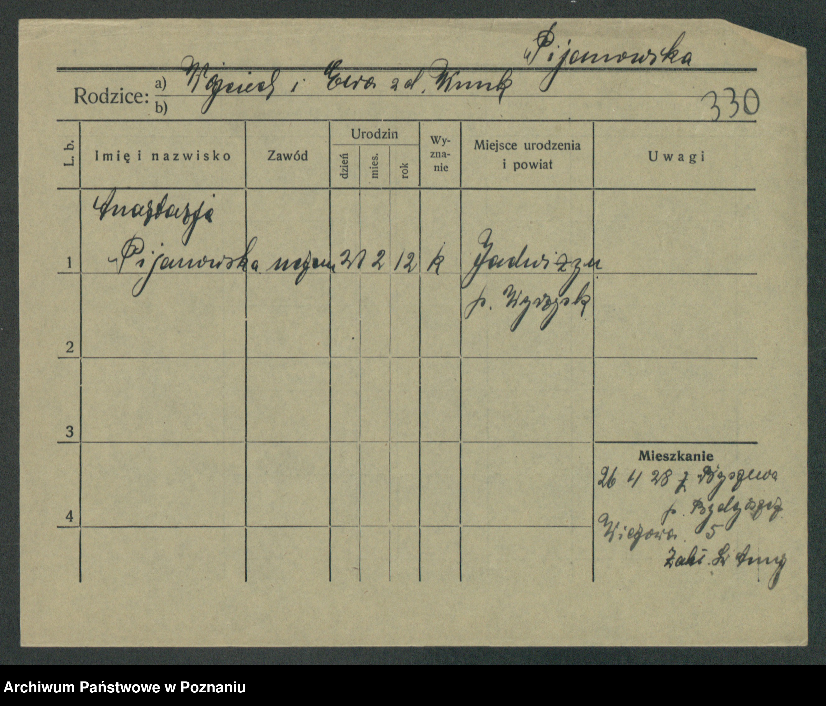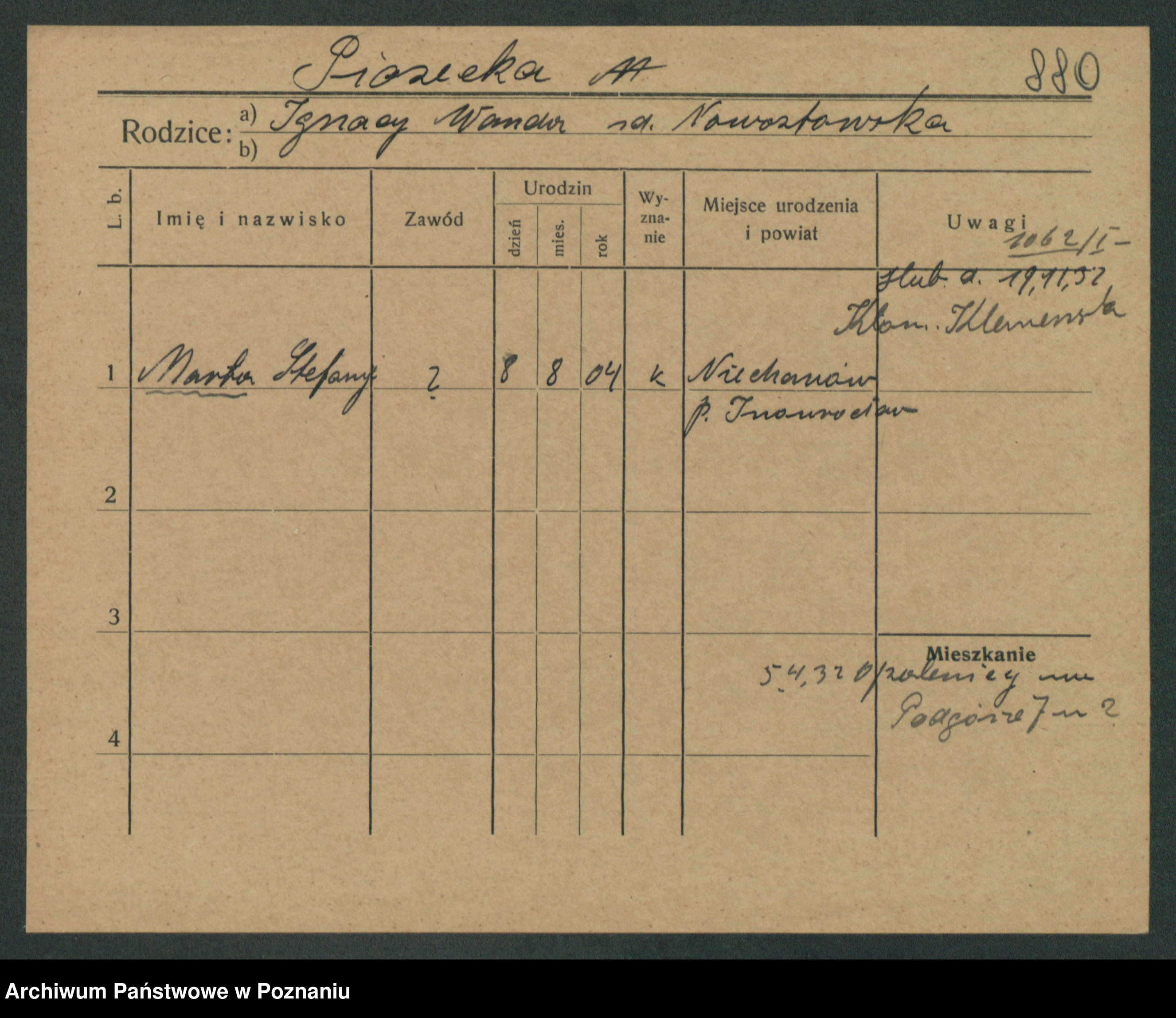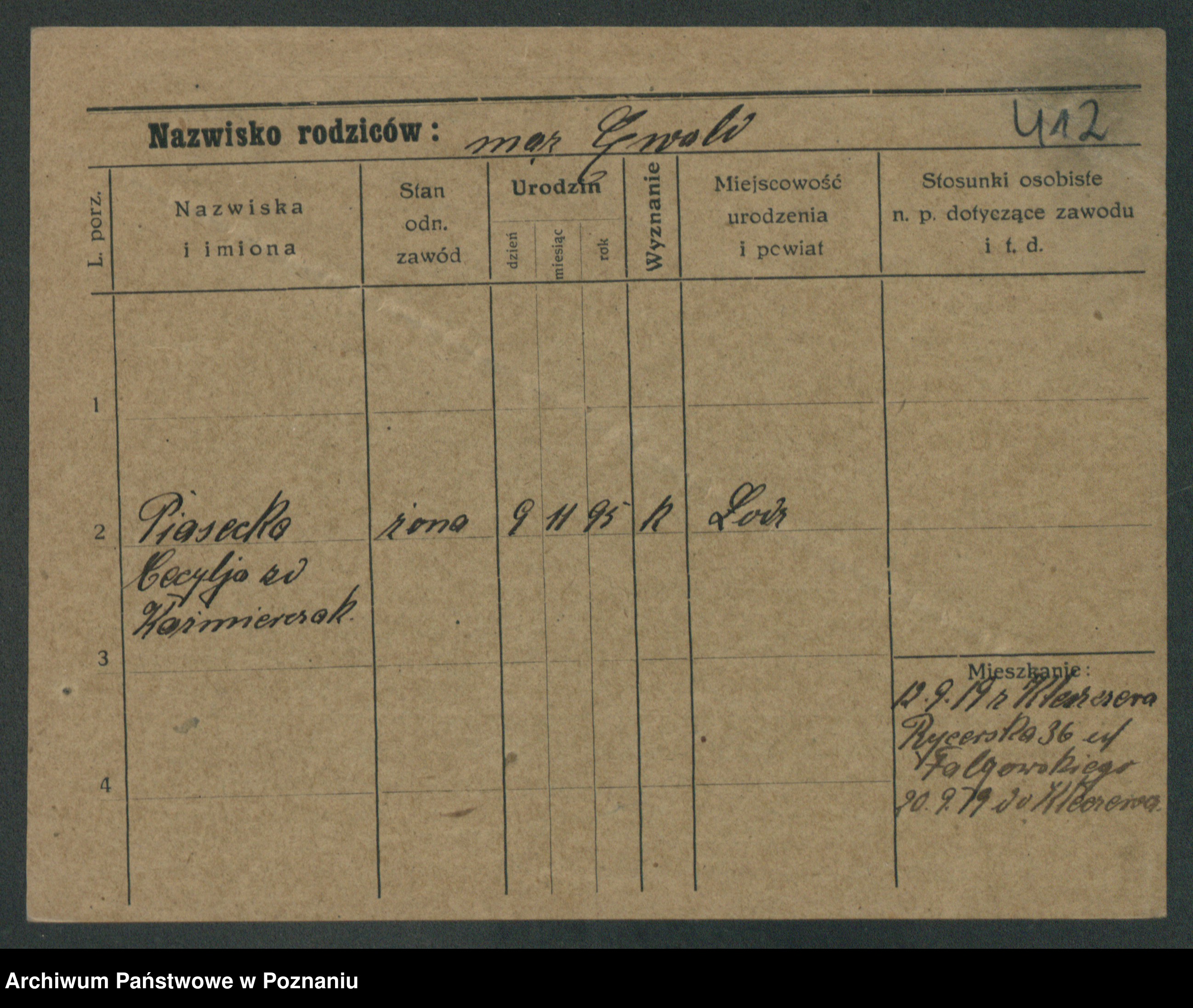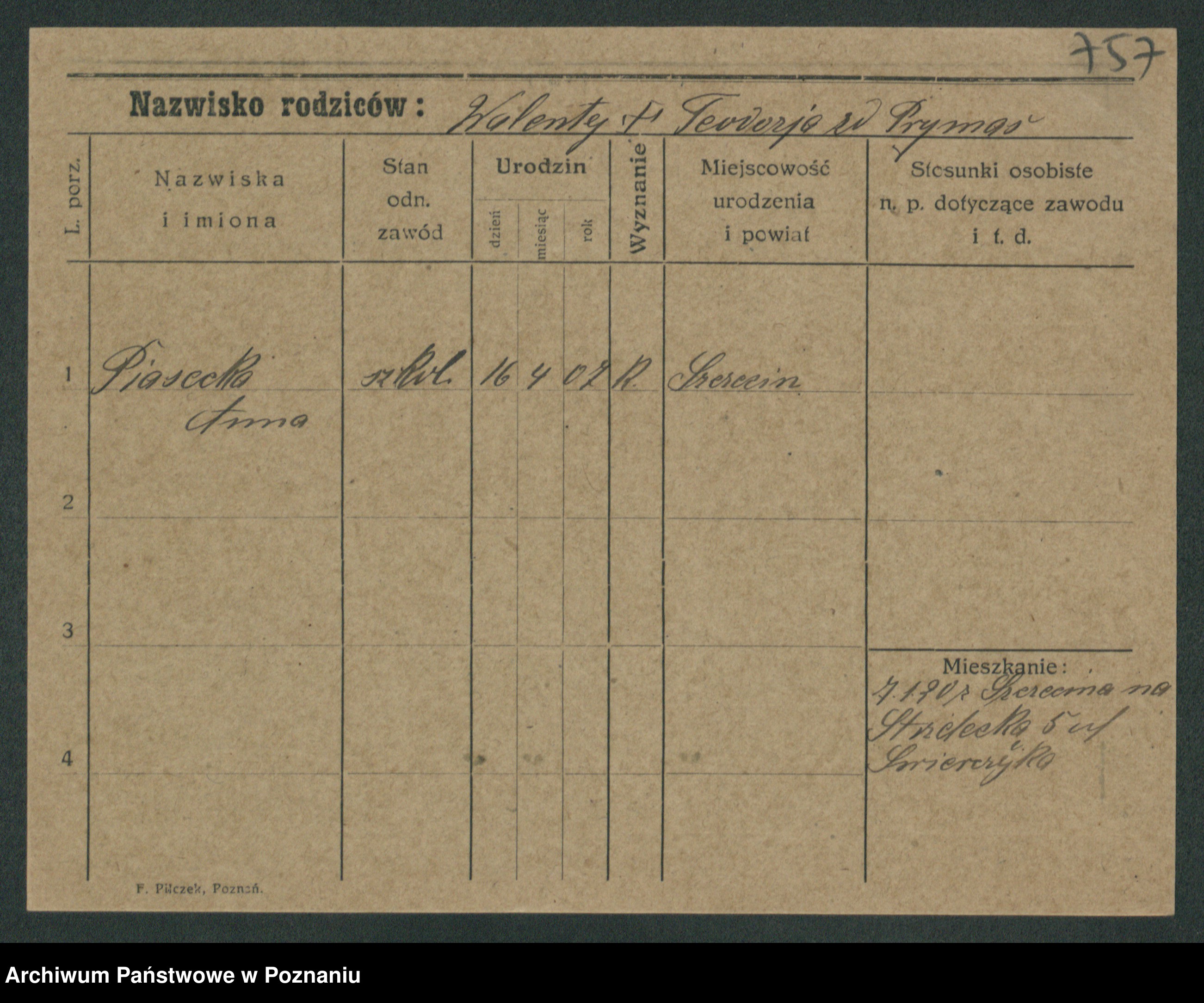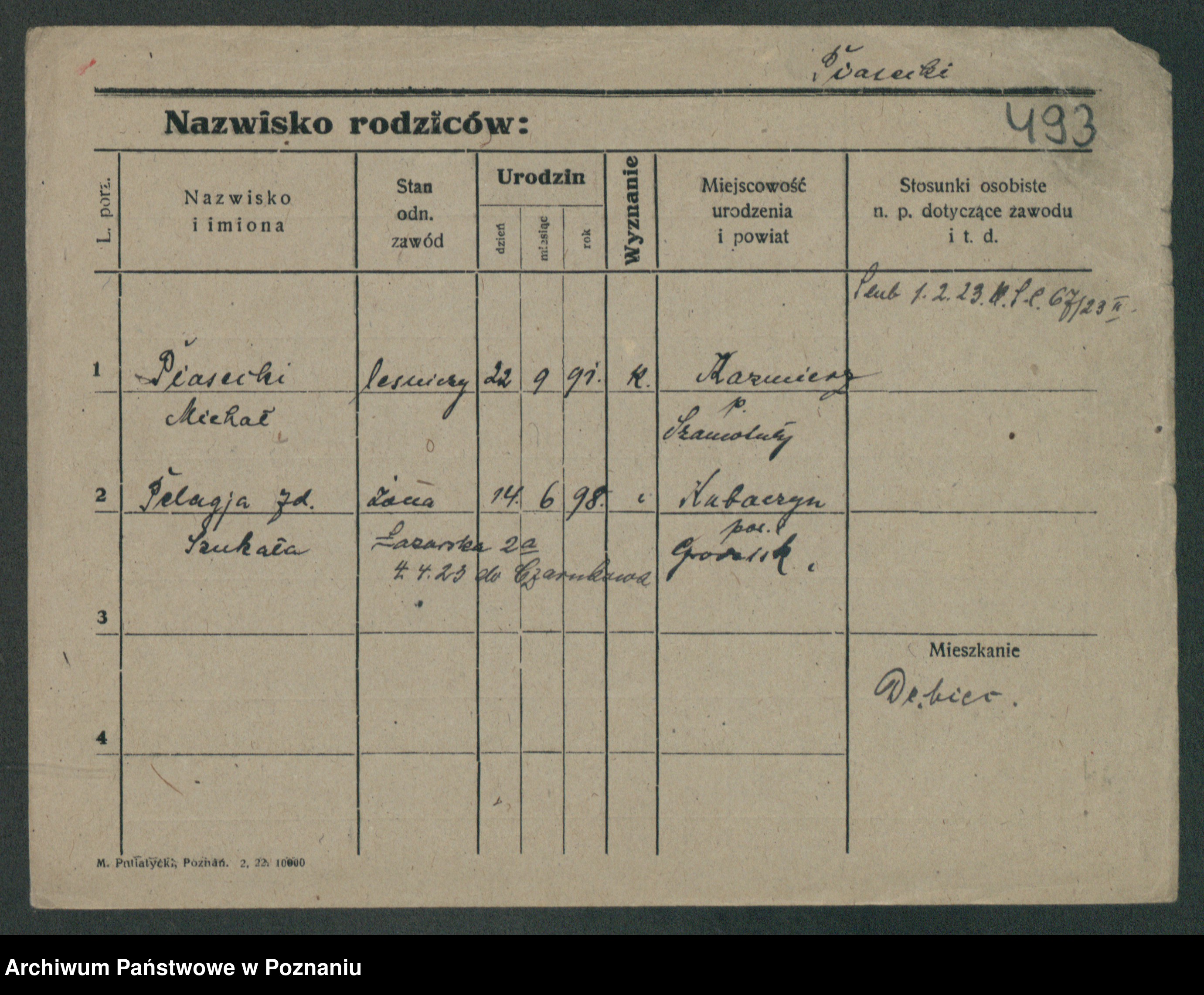 Podgląd karty osobowej dostępny jest po kliknięciu na nazwisko lub ikonkę karty. Można dokonywać powiększenia (ikony na górze) lub przechodzić między kolejnymi skanami (strzałki po bokach).