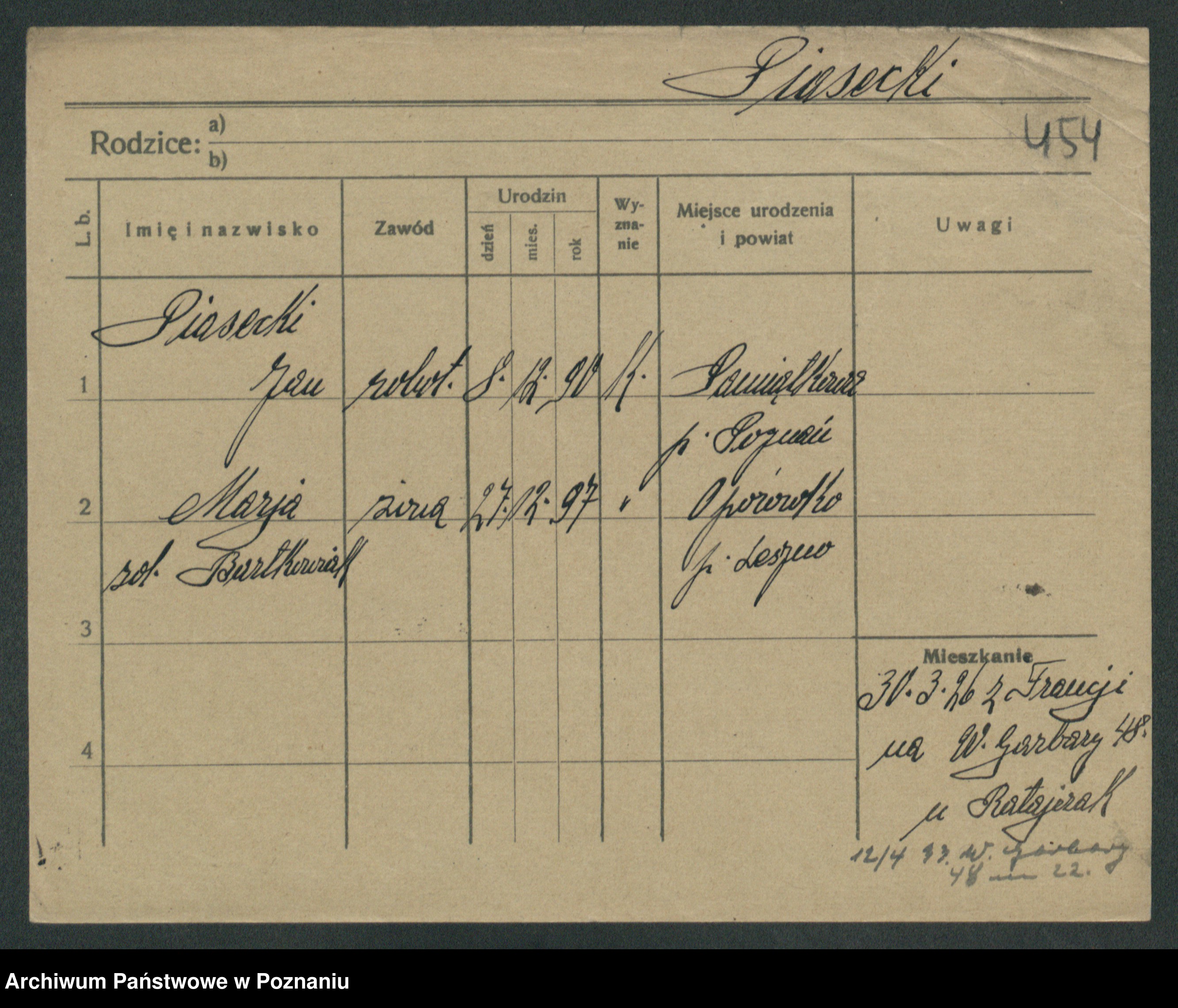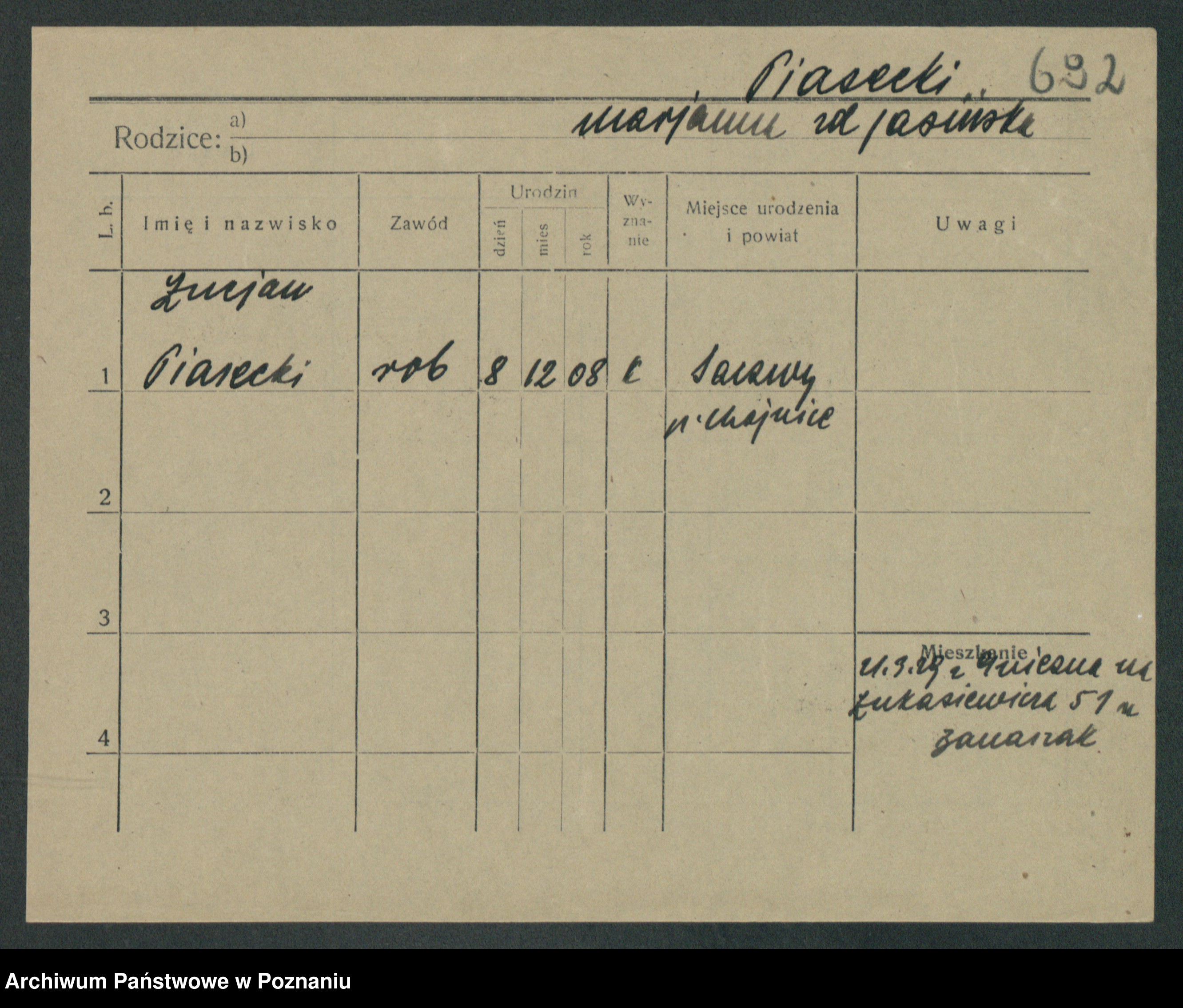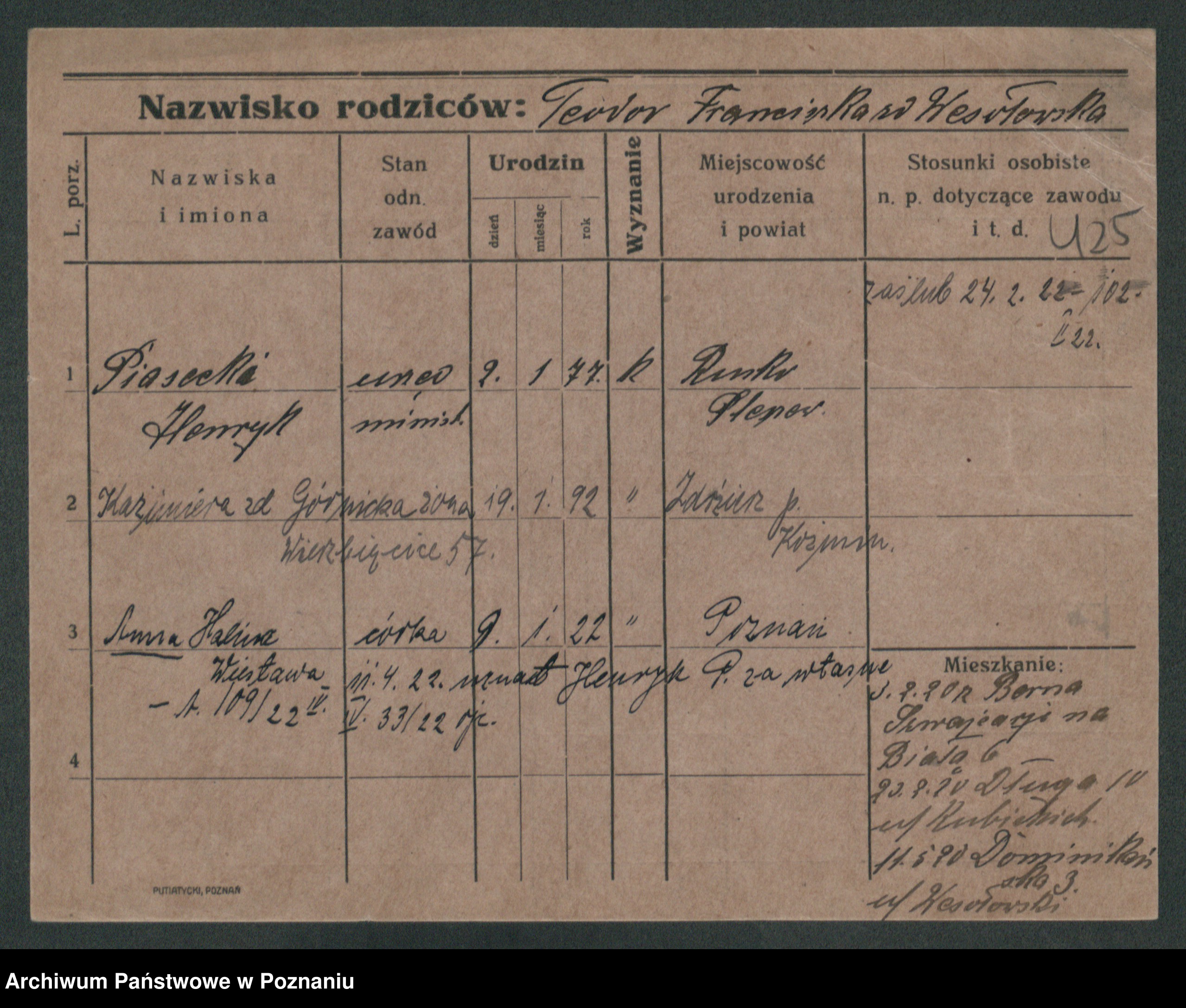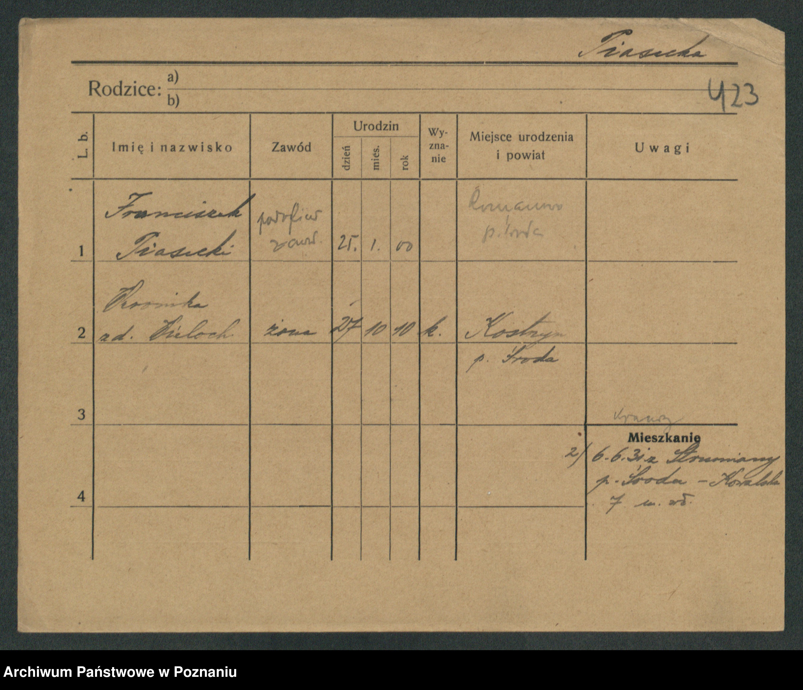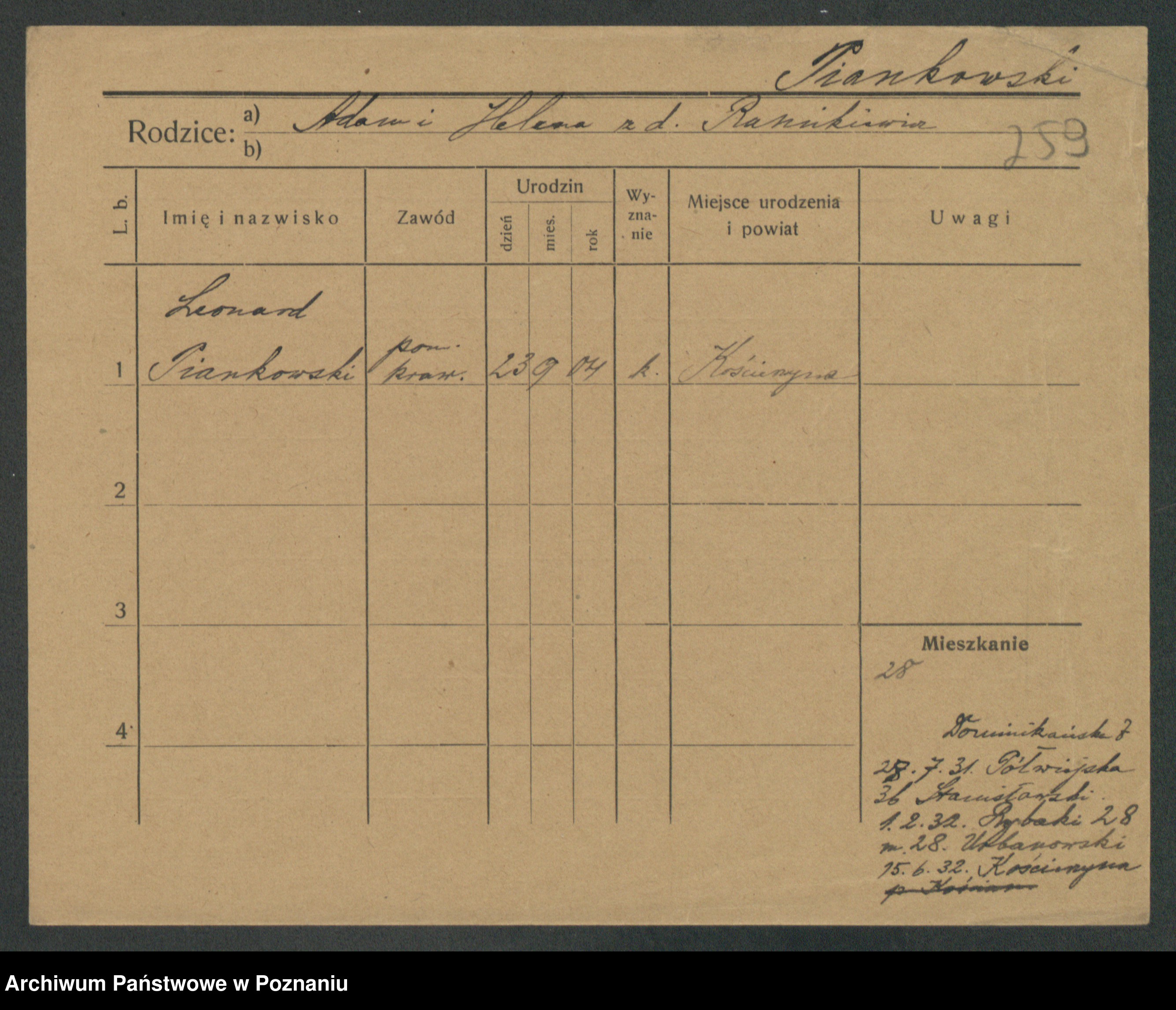 Podgląd karty osobowej dostępny jest po kliknięciu na nazwisko lub ikonkę karty. Można dokonywać powiększenia (ikony na górze) lub przechodzić między kolejnymi skanami (strzałki po bokach).