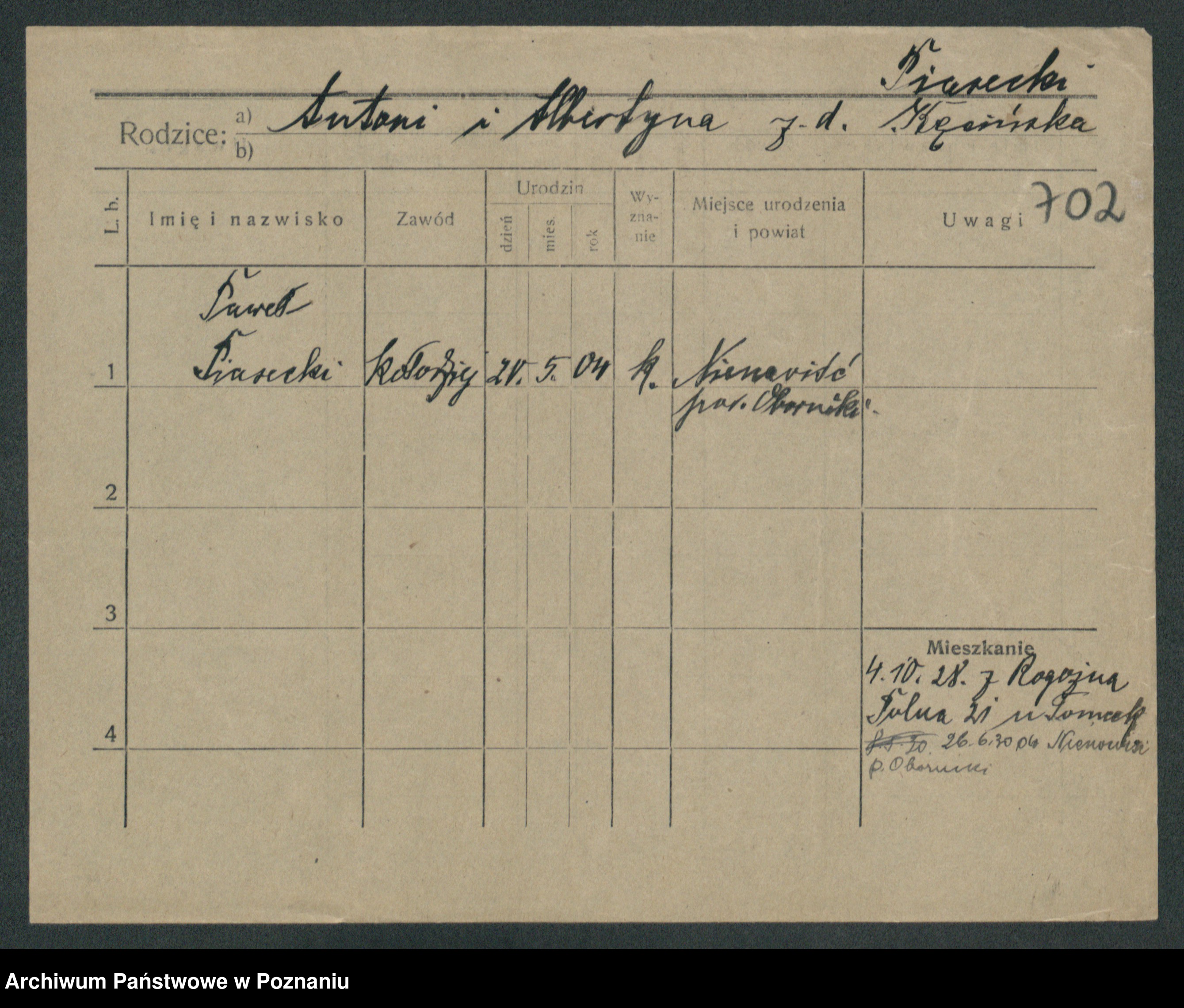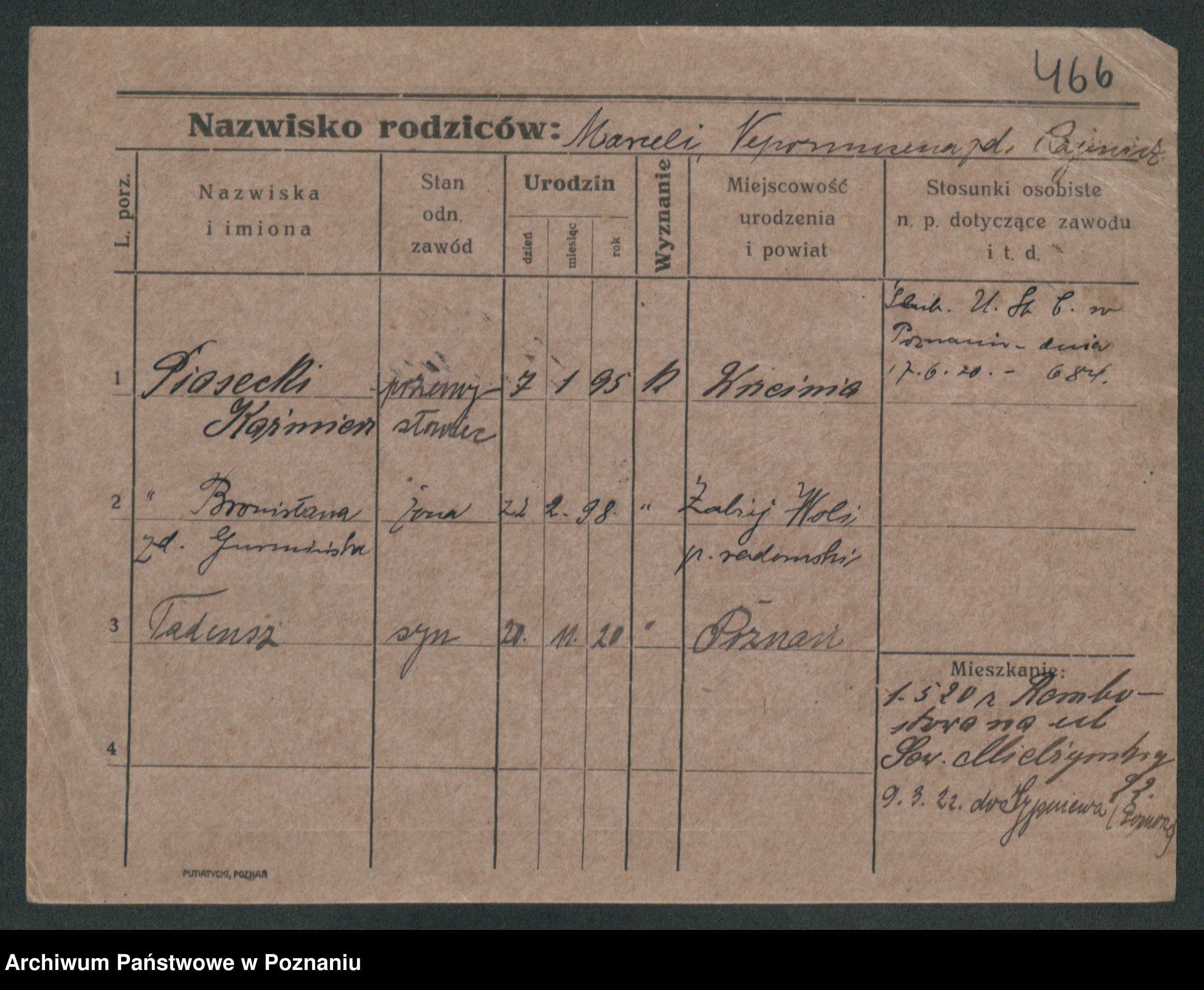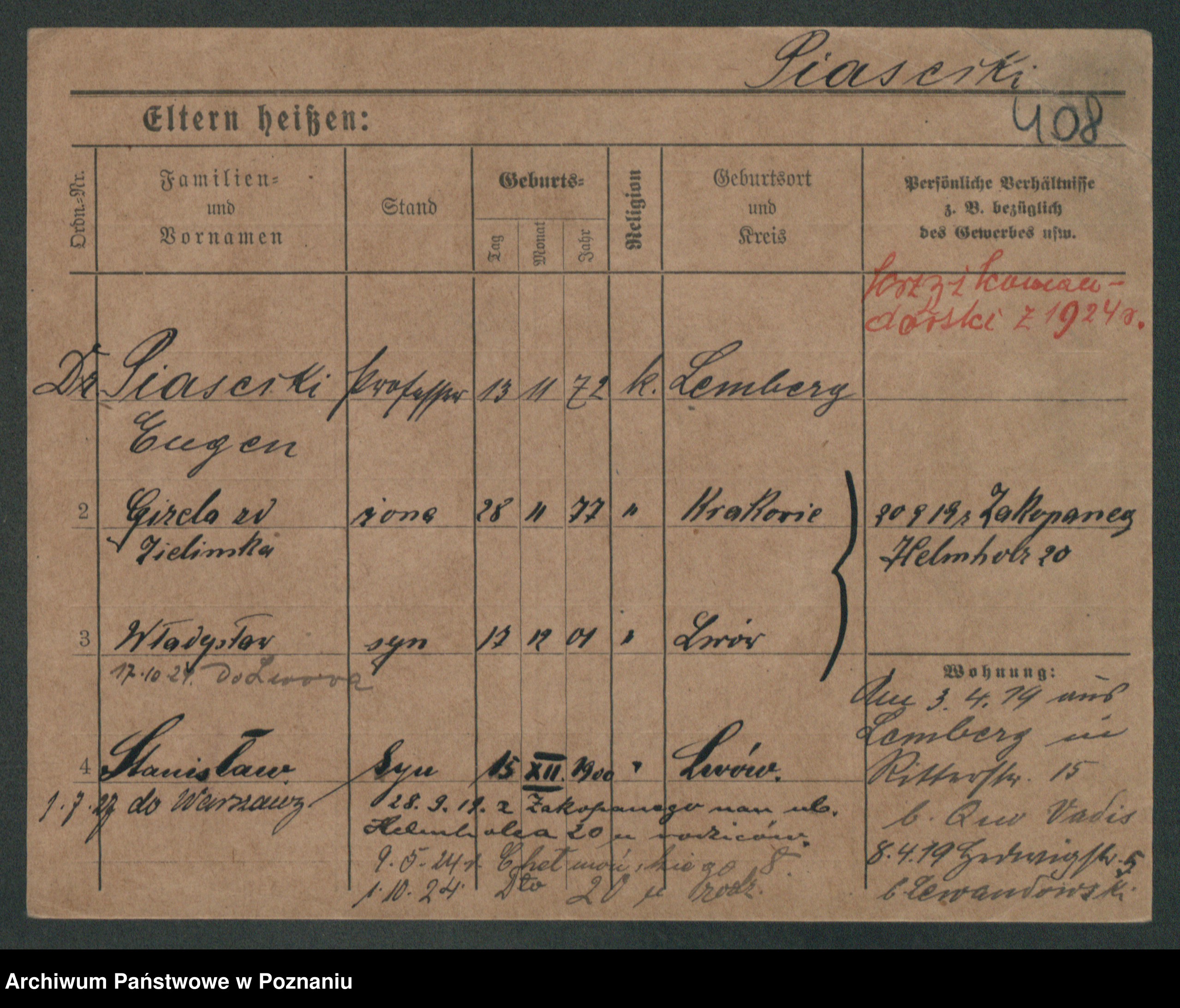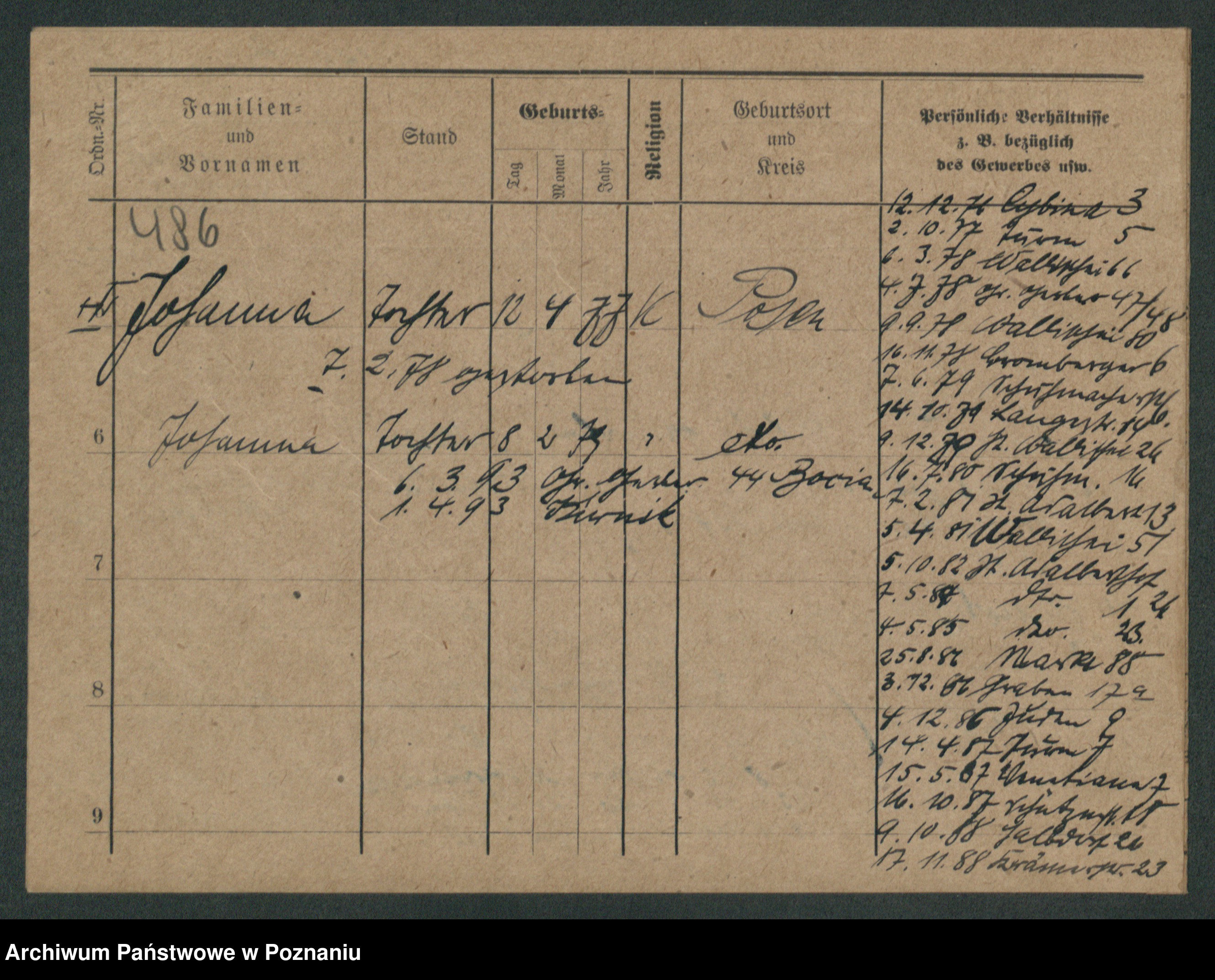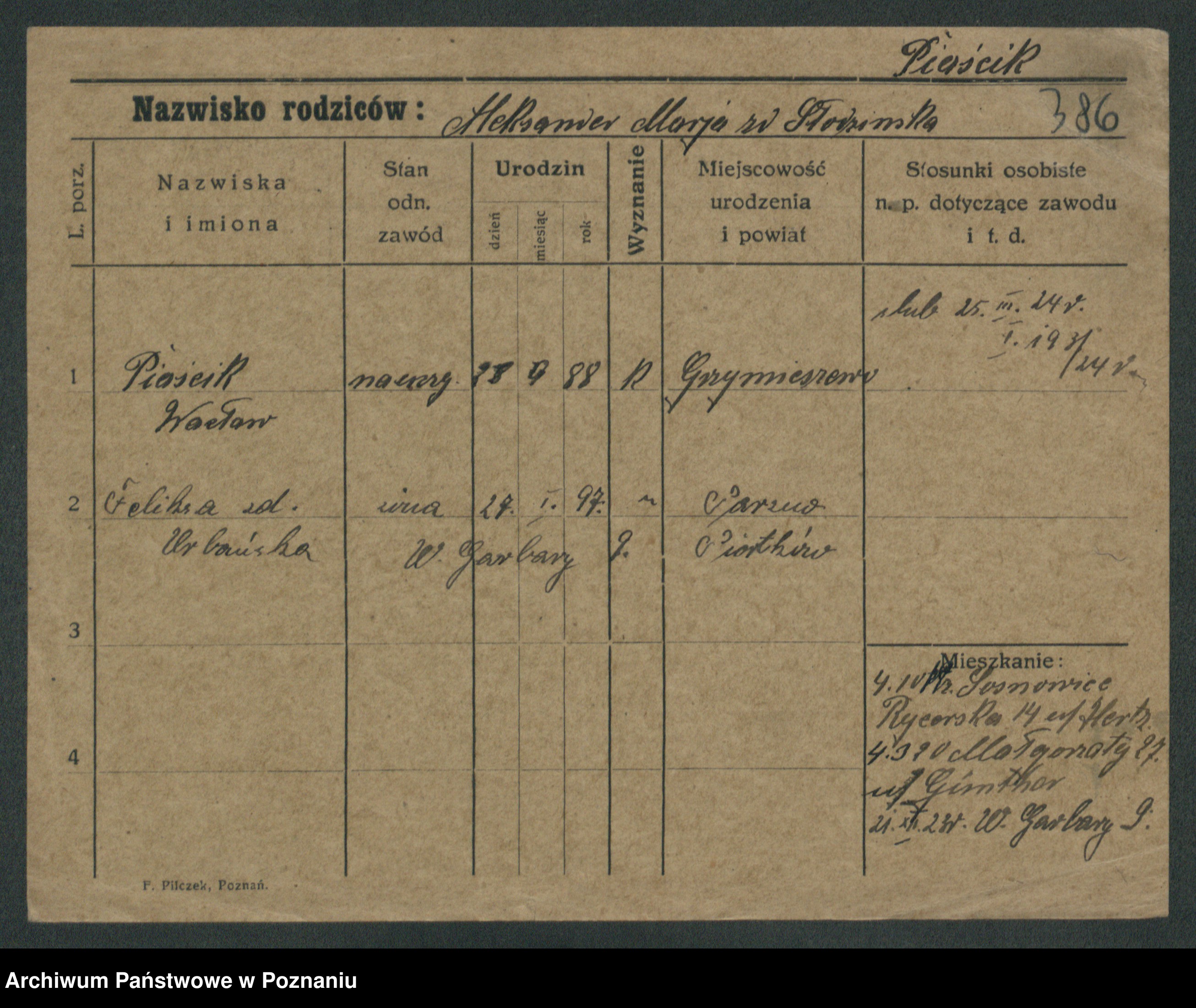 Podgląd karty osobowej dostępny jest po kliknięciu na nazwisko lub ikonkę karty. Można dokonywać powiększenia (ikony na górze) lub przechodzić między kolejnymi skanami (strzałki po bokach).