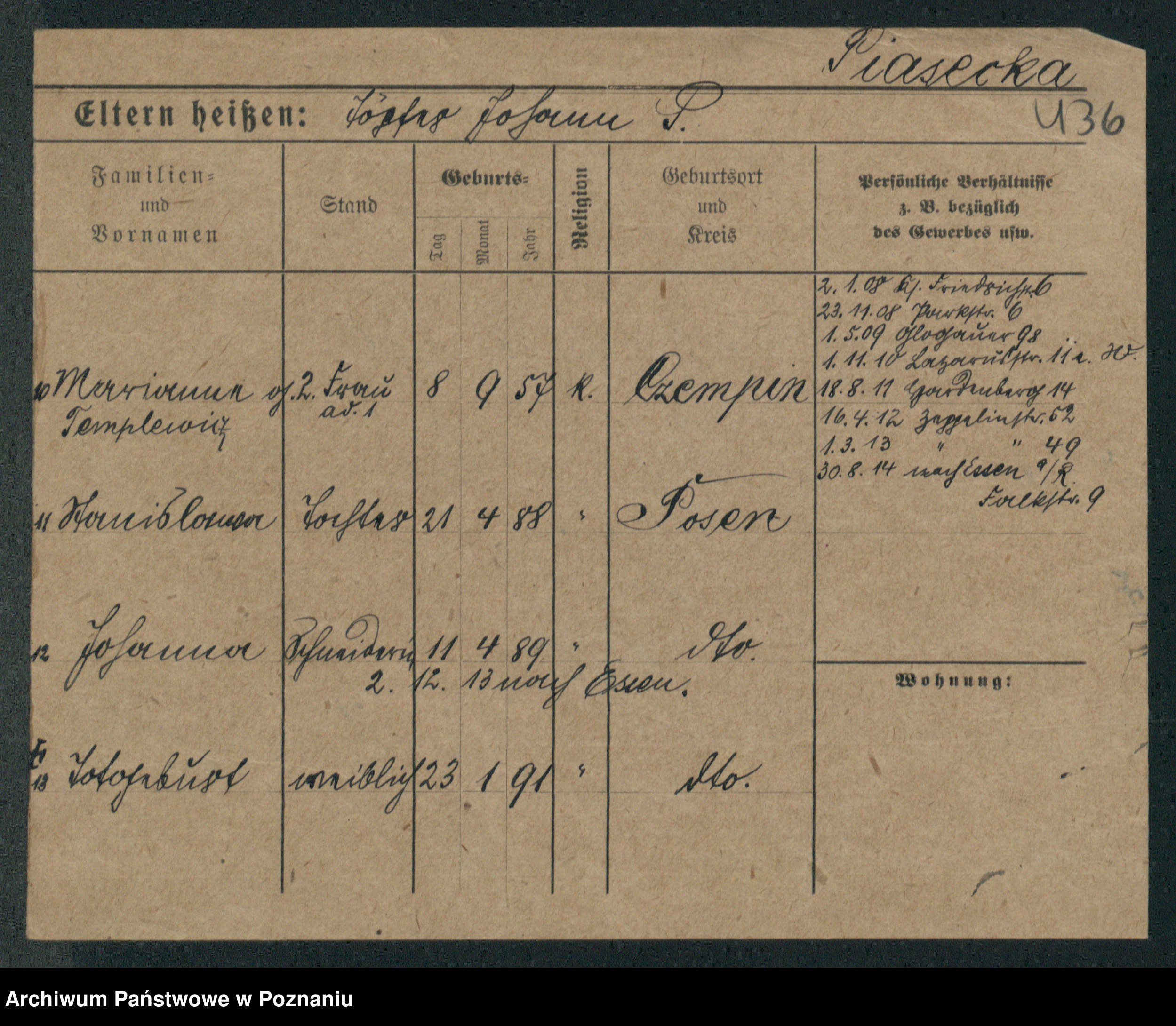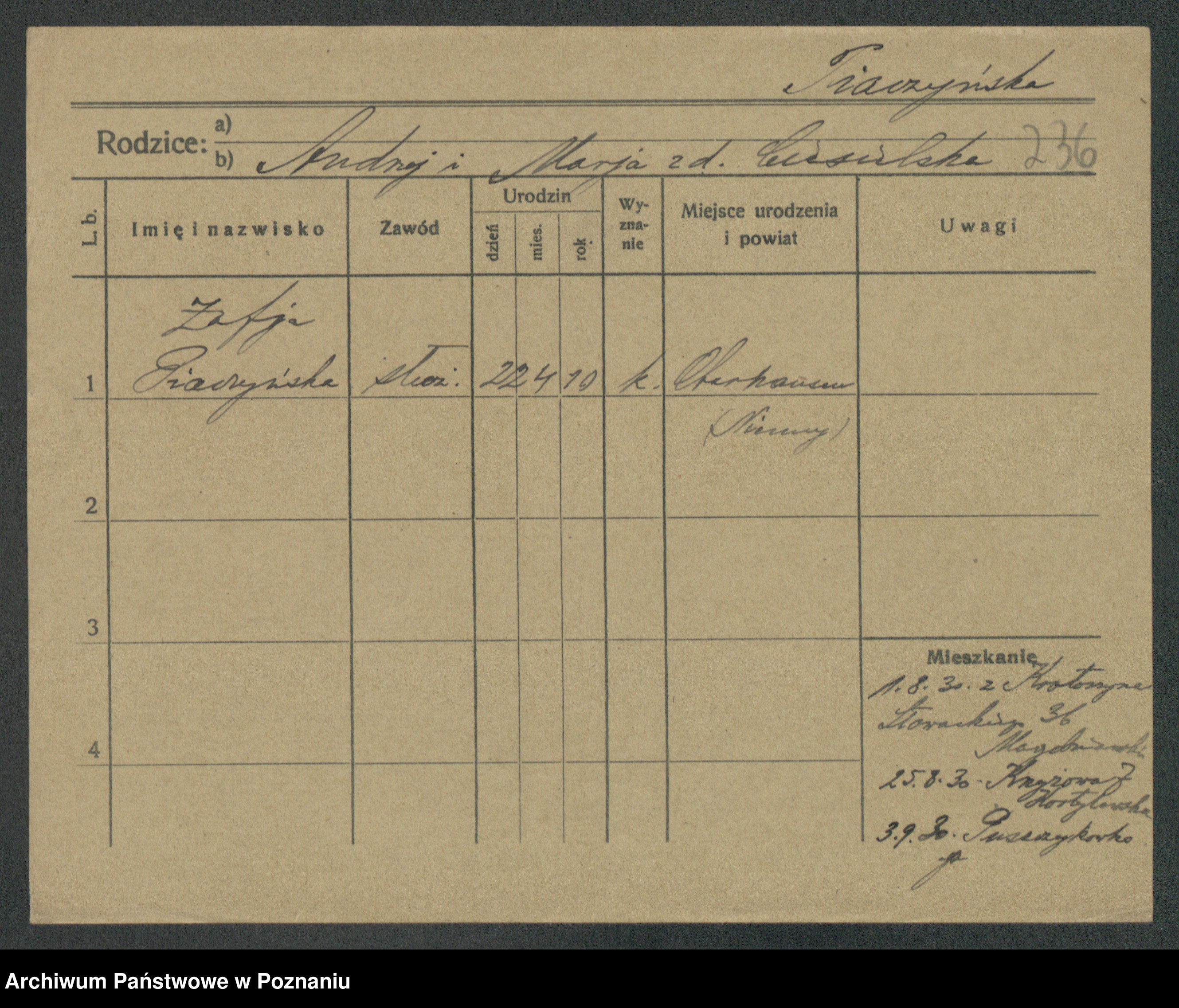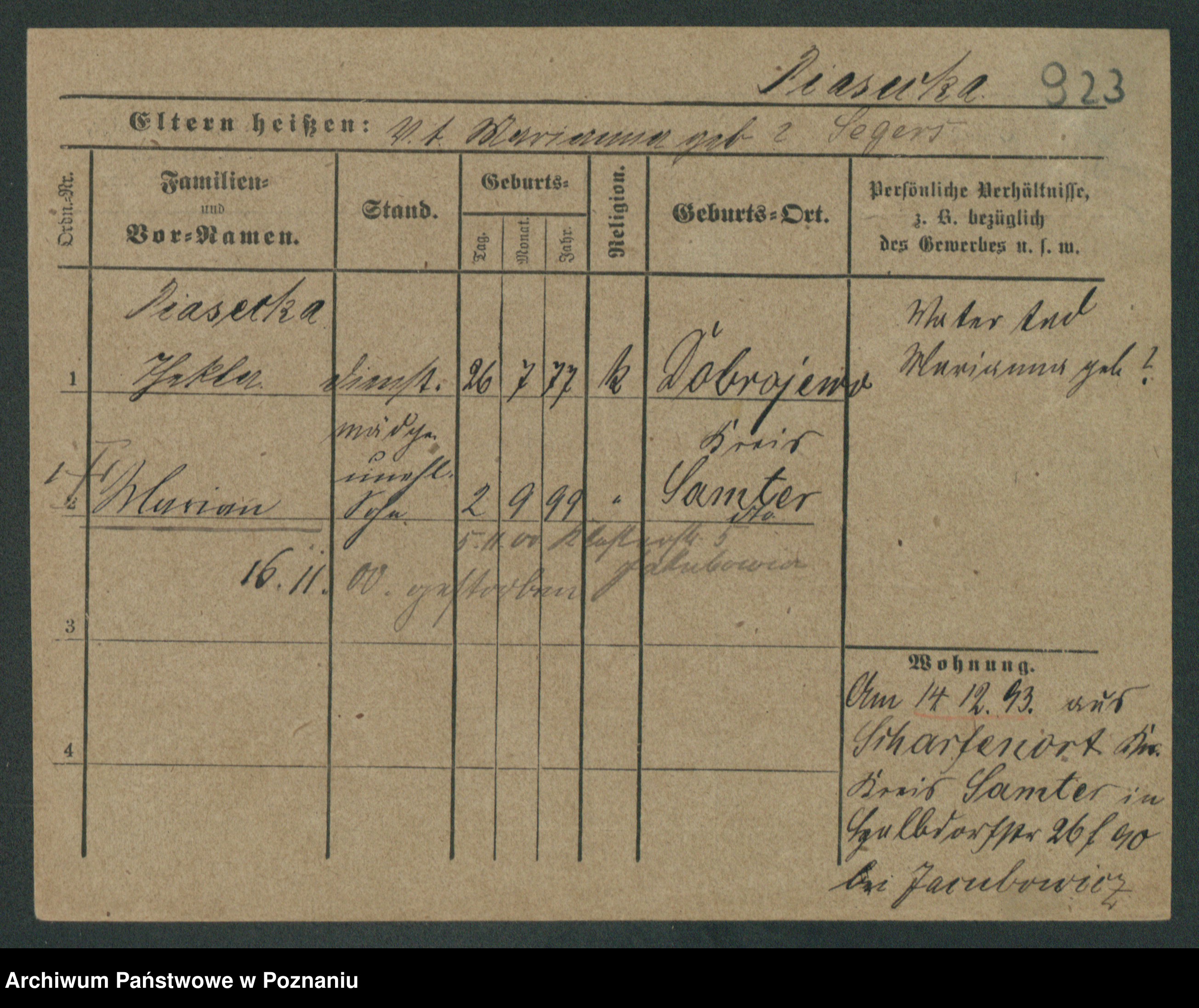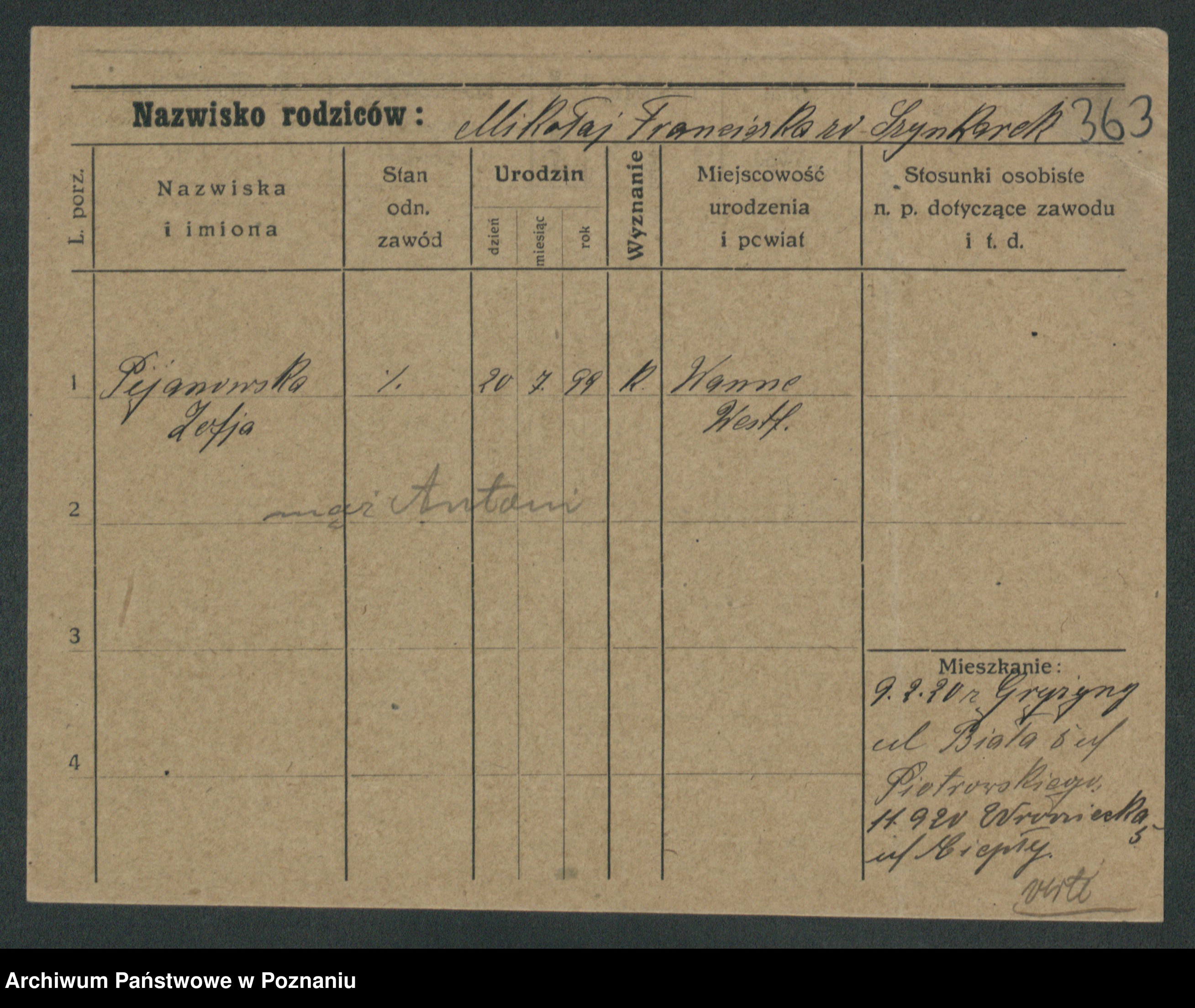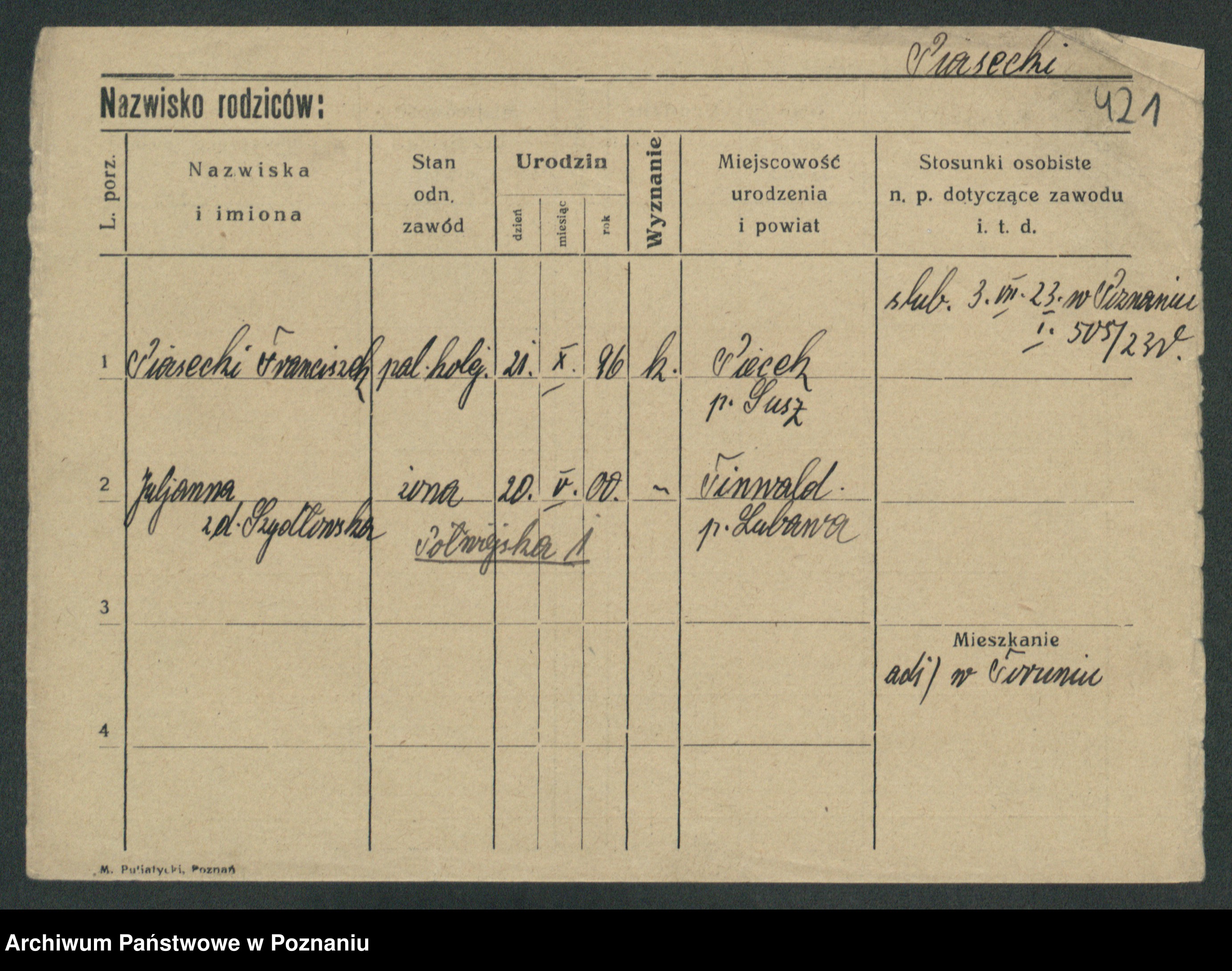 Podgląd karty osobowej dostępny jest po kliknięciu na nazwisko lub ikonkę karty. Można dokonywać powiększenia (ikony na górze) lub przechodzić między kolejnymi skanami (strzałki po bokach).