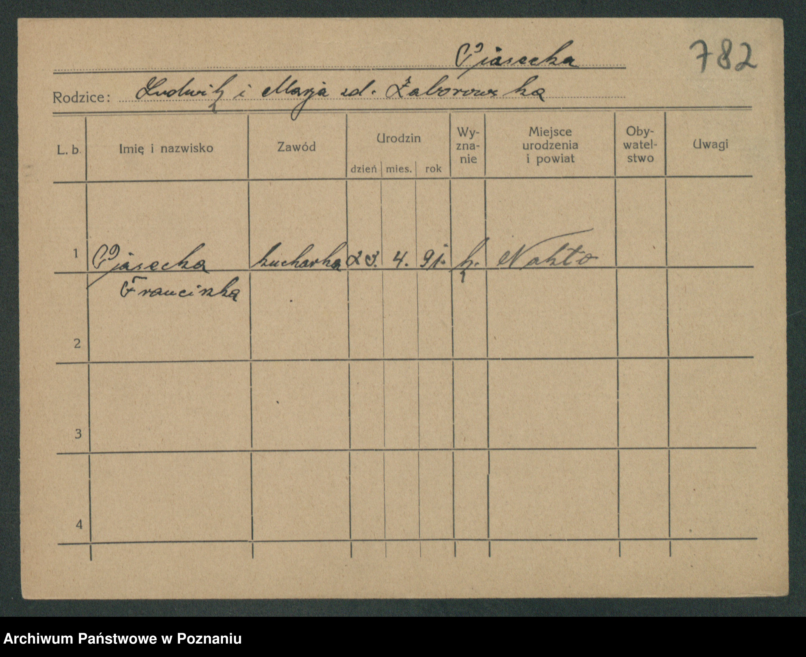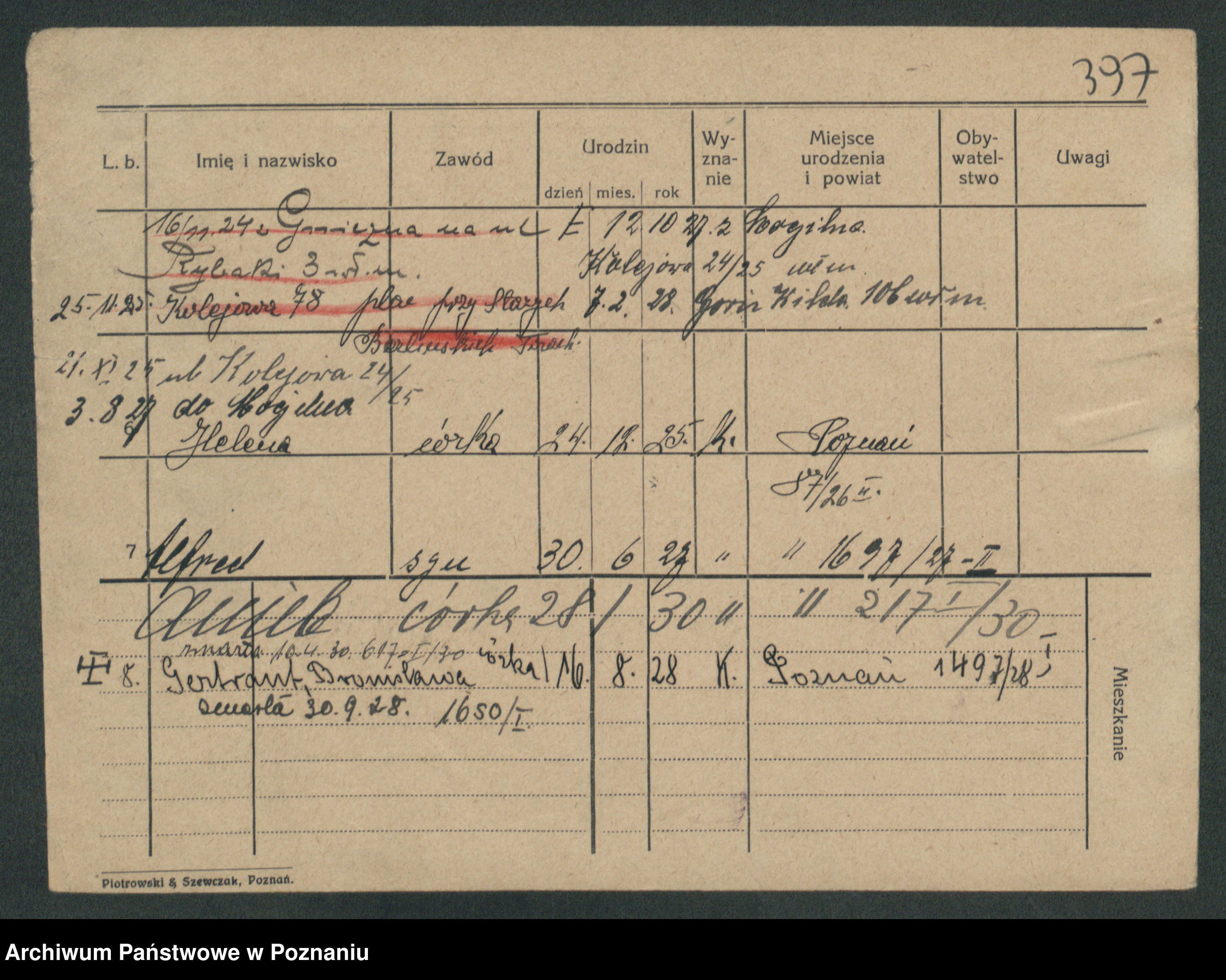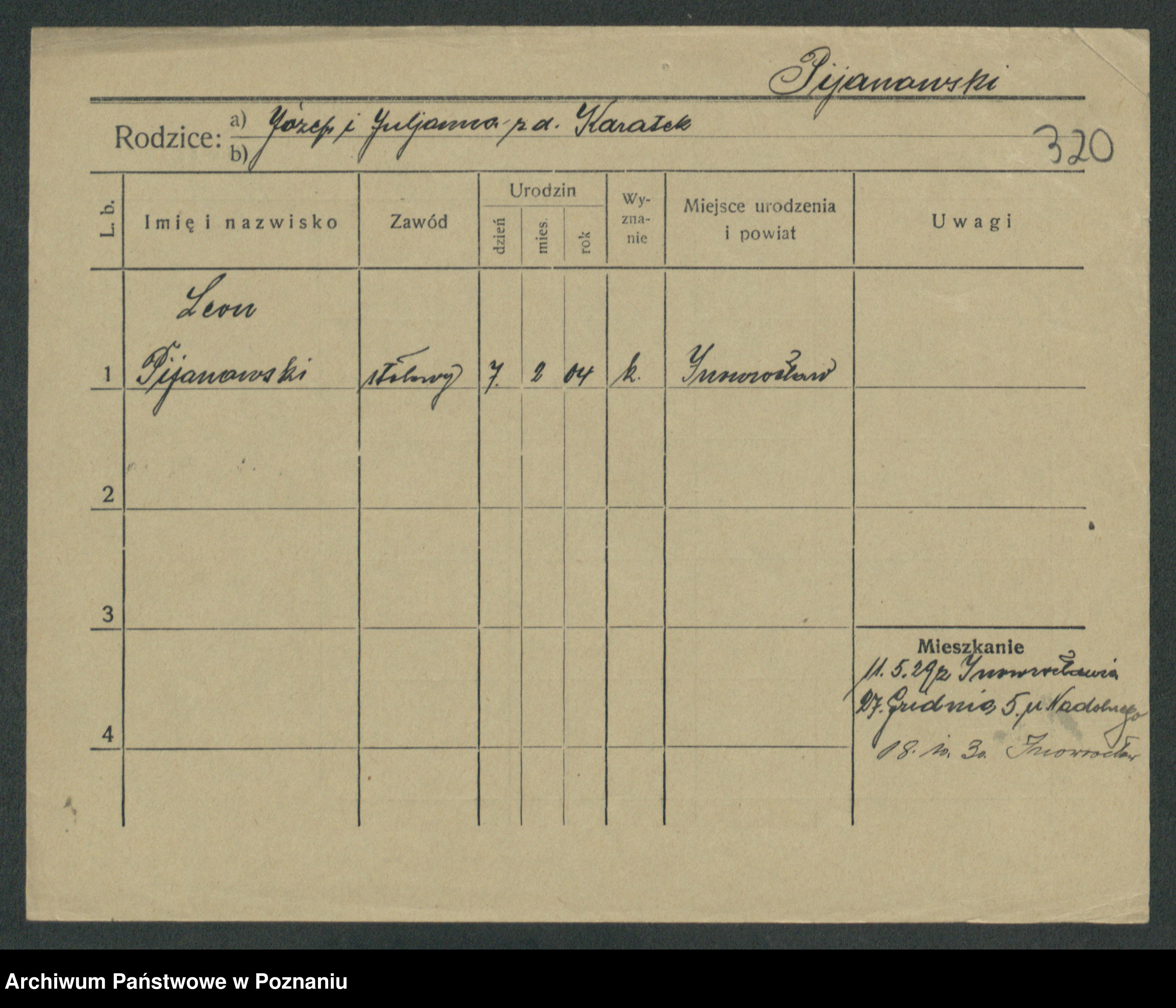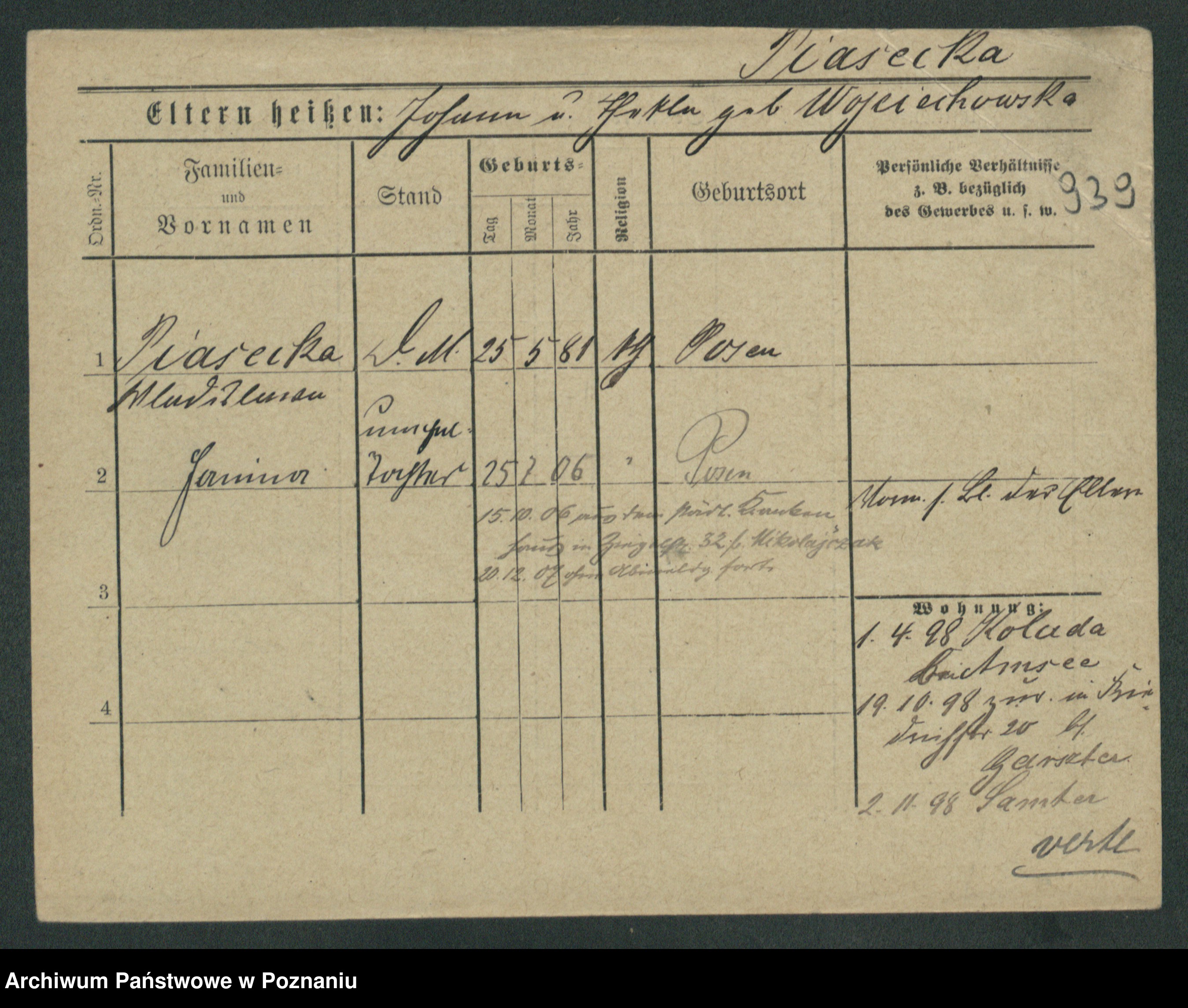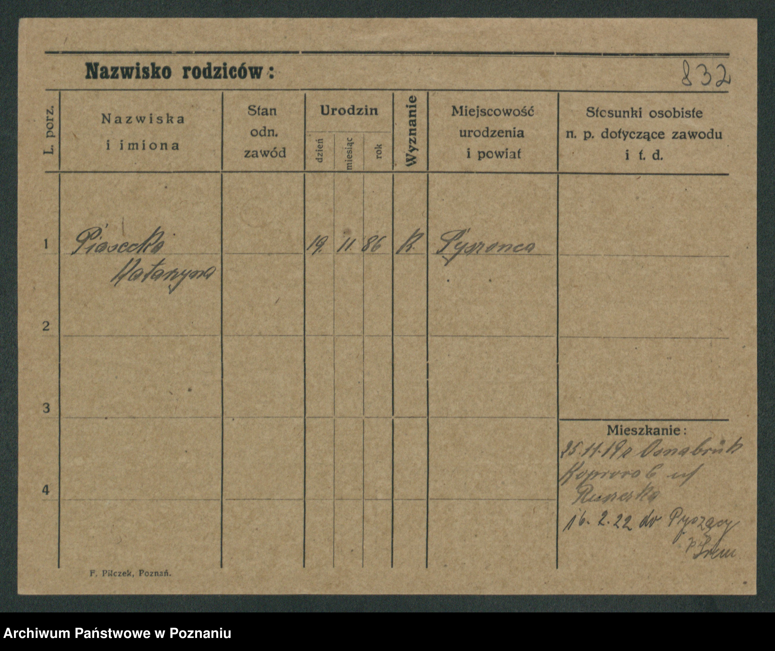Podgląd karty osobowej dostępny jest po kliknięciu na nazwisko lub ikonkę karty. Można dokonywać powiększenia (ikony na górze) lub przechodzić między kolejnymi skanami (strzałki po bokach).