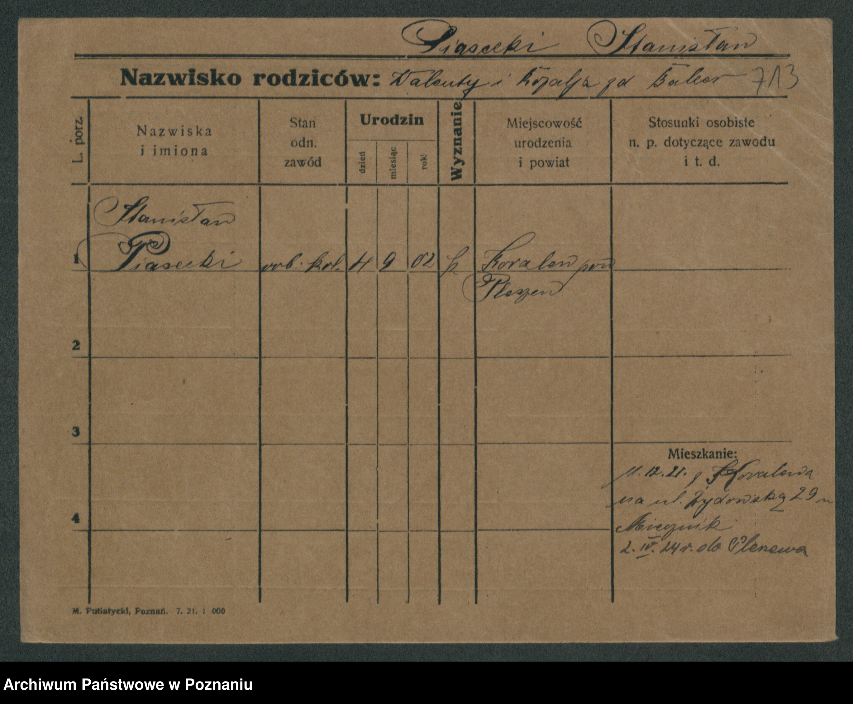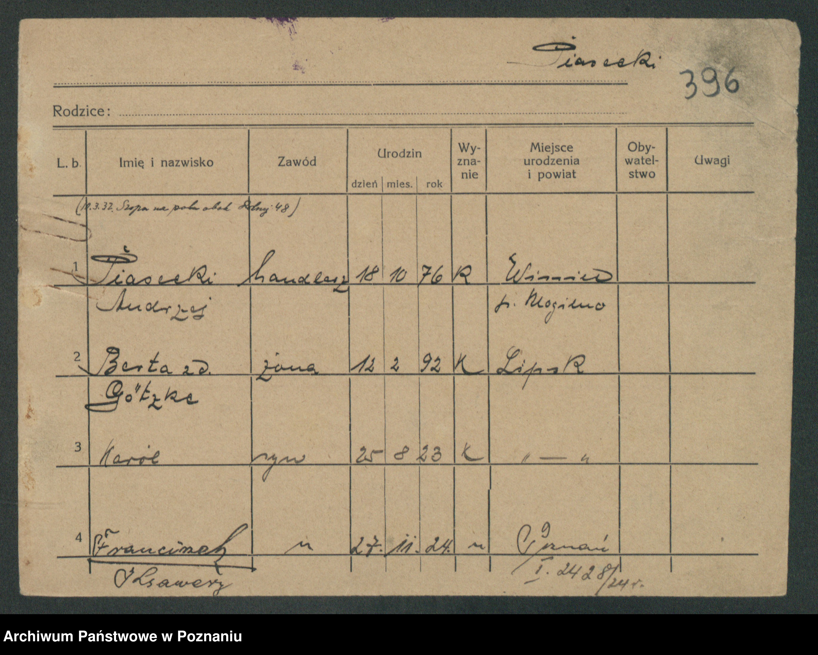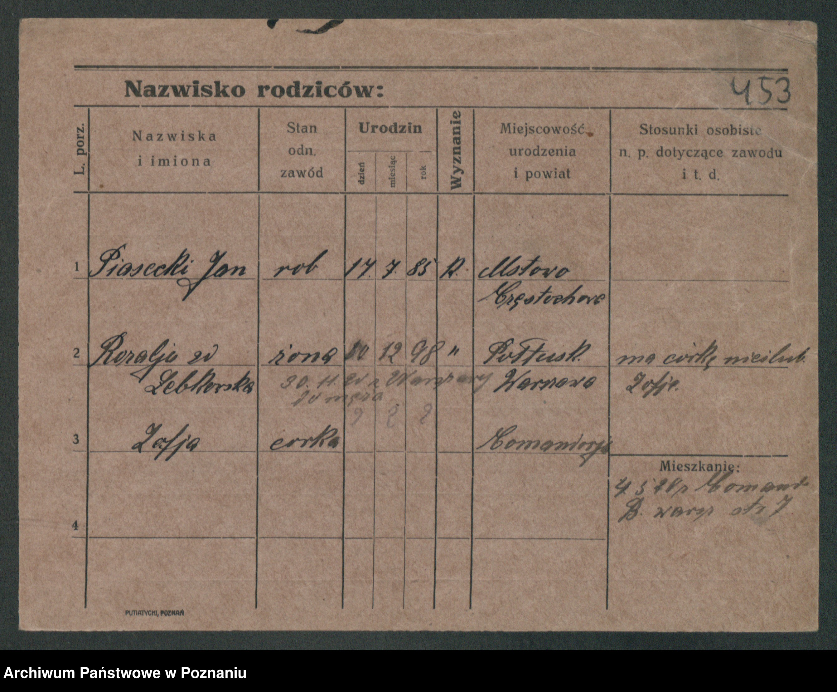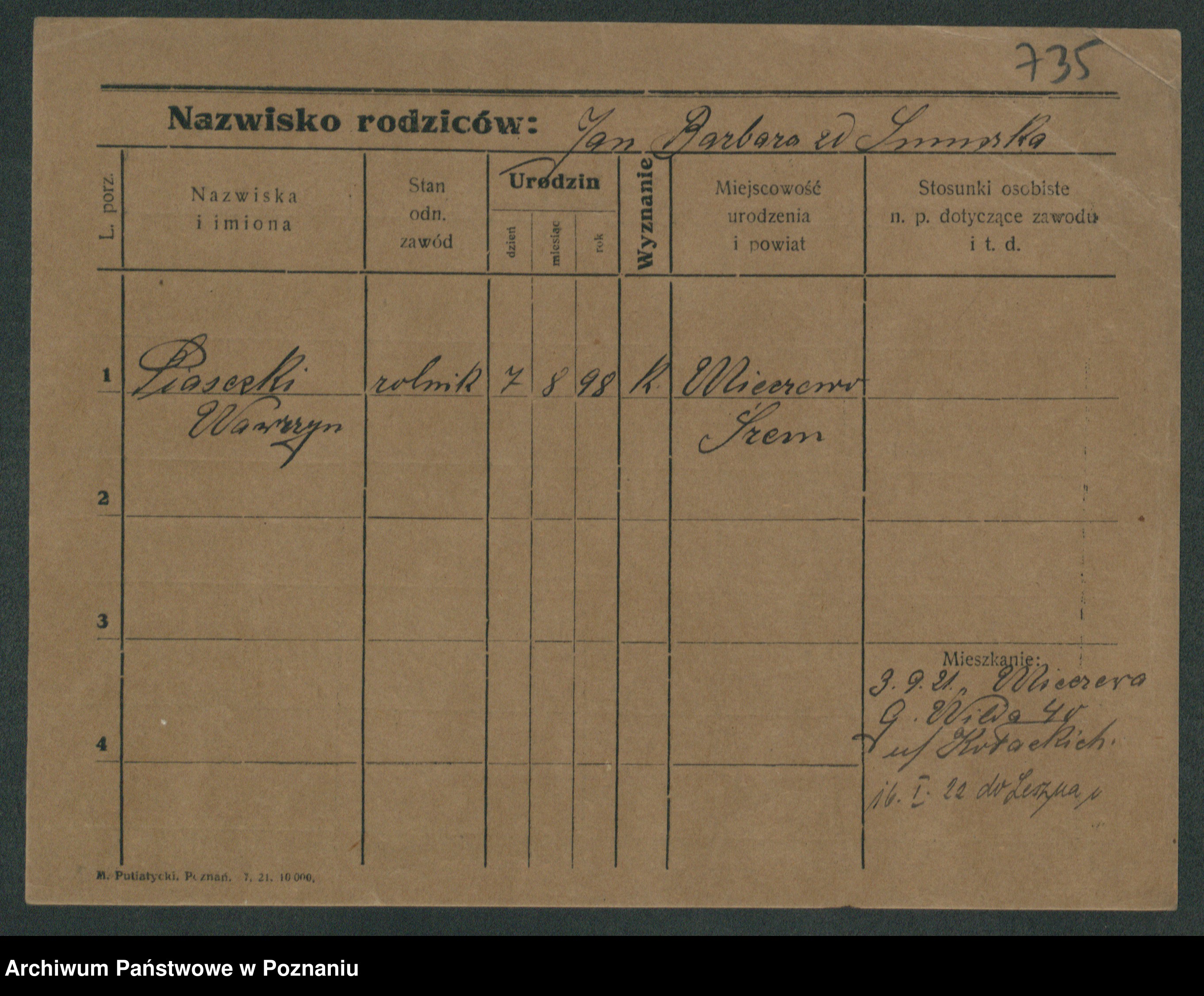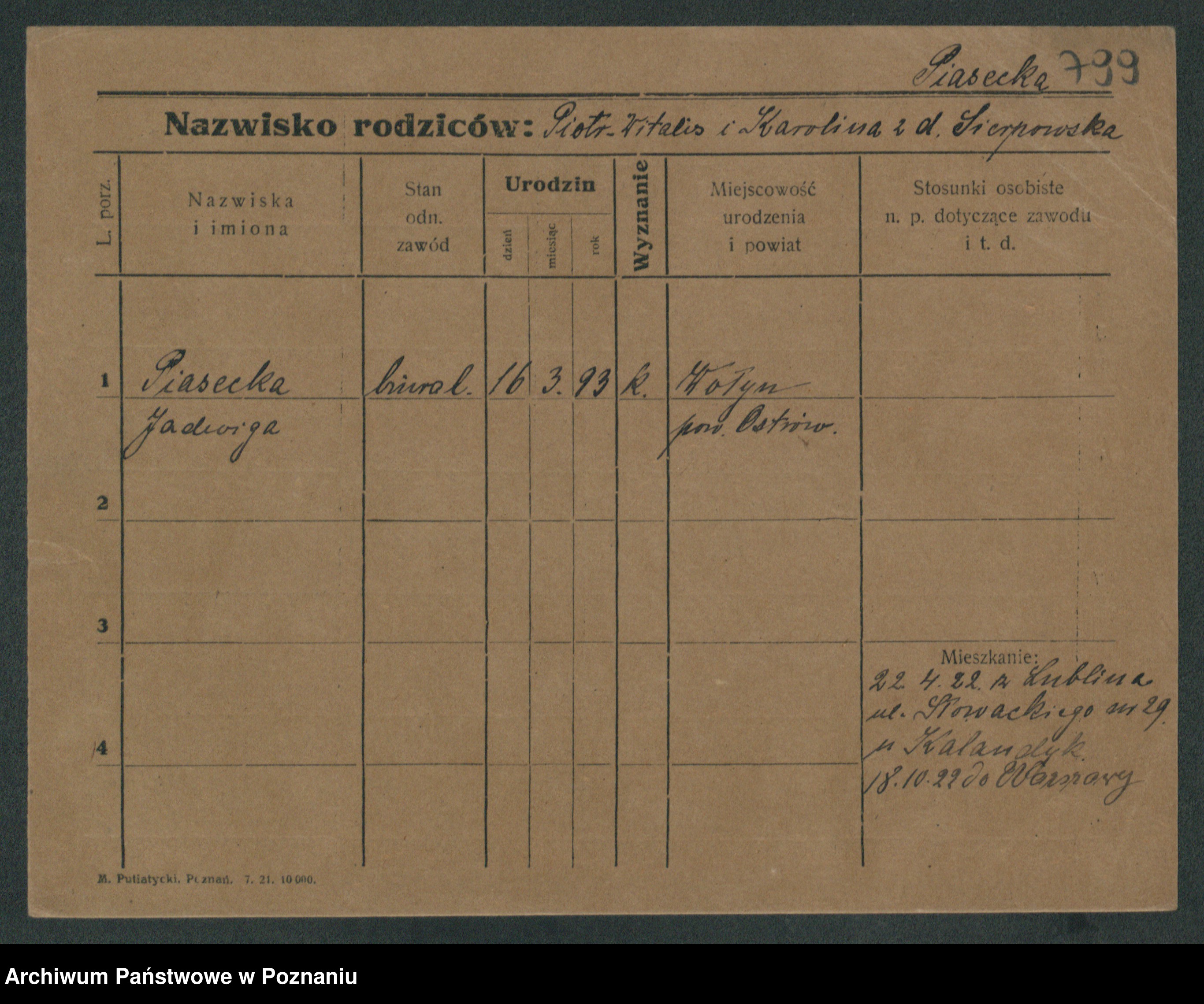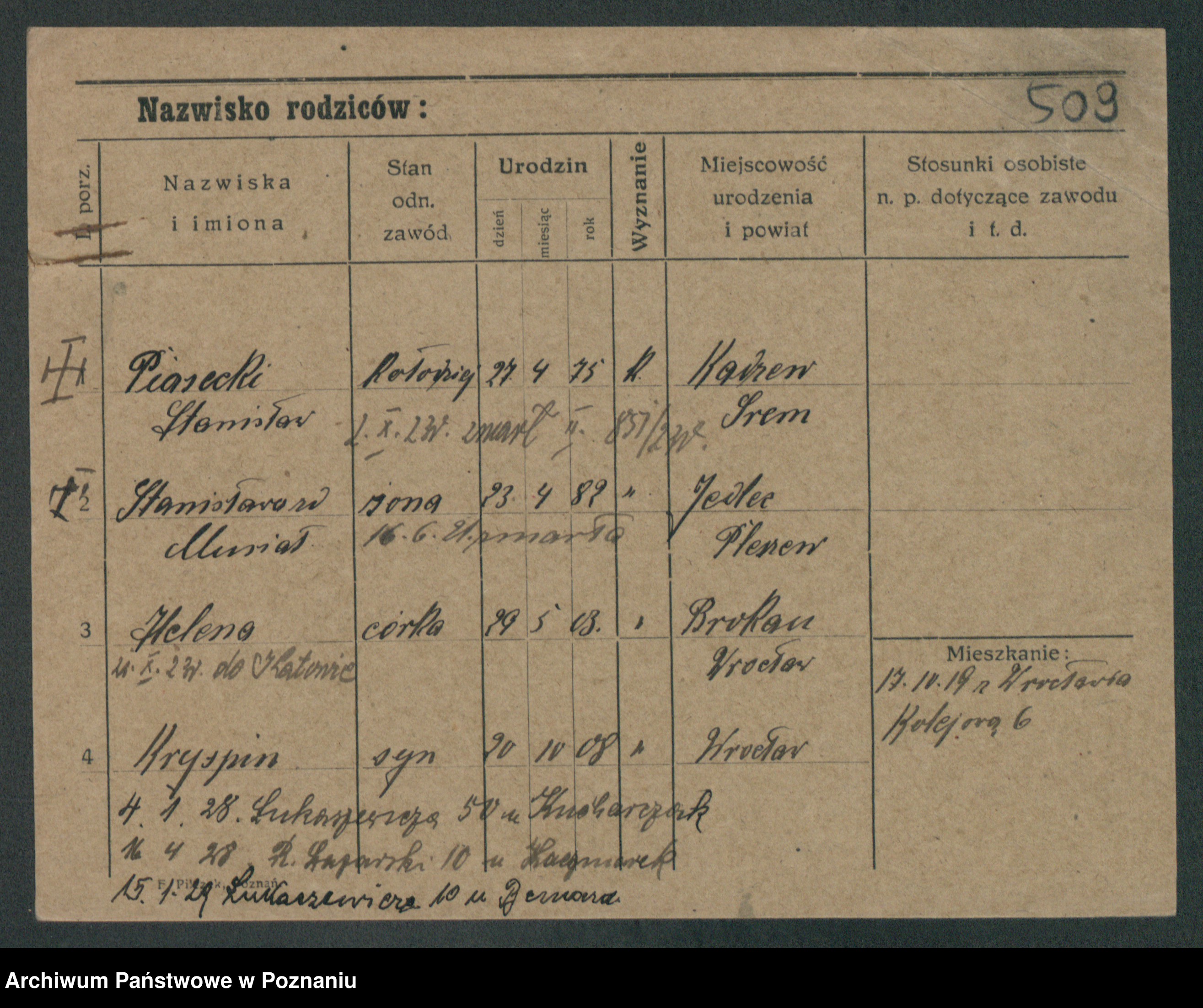 Podgląd karty osobowej dostępny jest po kliknięciu na nazwisko lub ikonkę karty. Można dokonywać powiększenia (ikony na górze) lub przechodzić między kolejnymi skanami (strzałki po bokach).