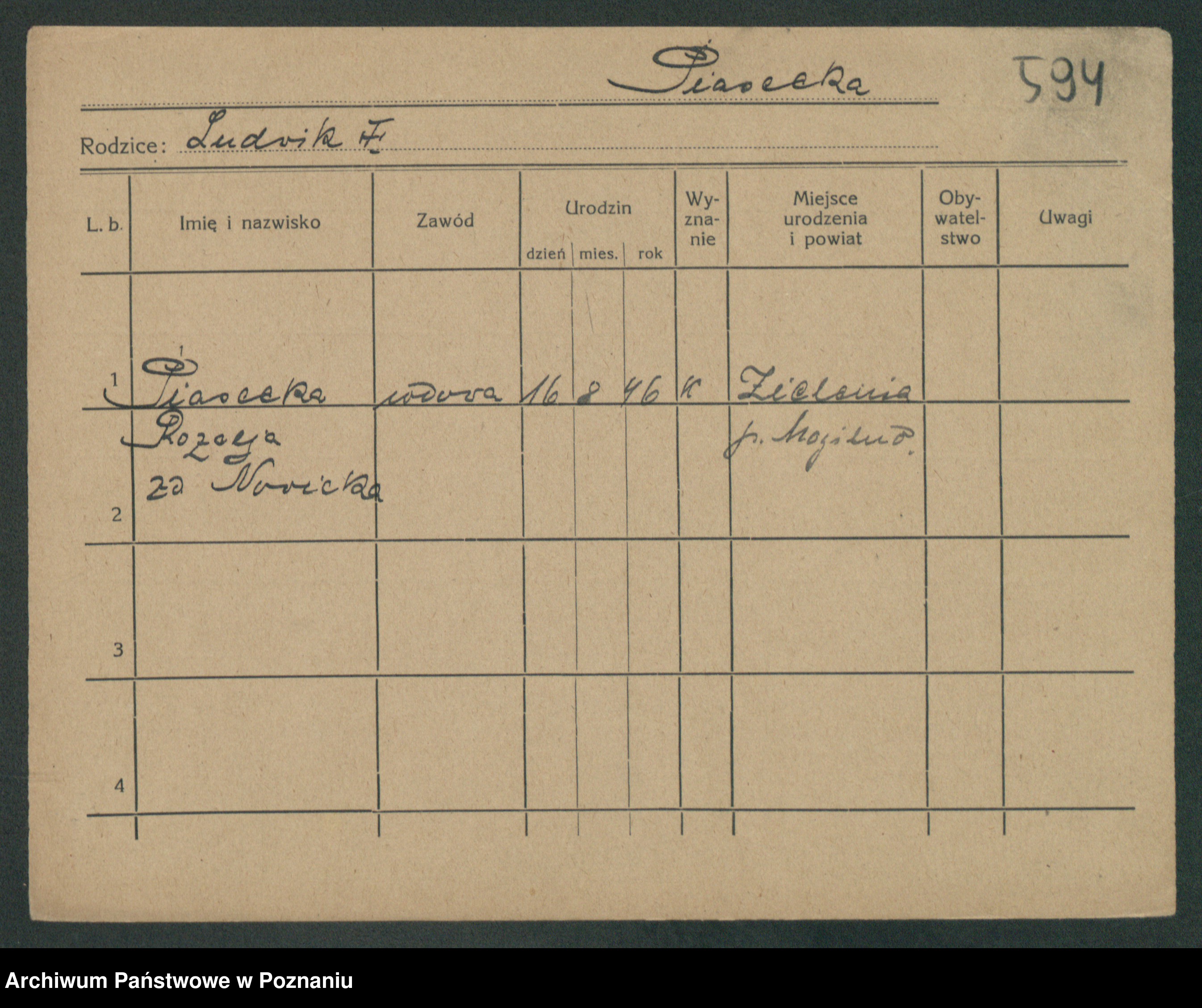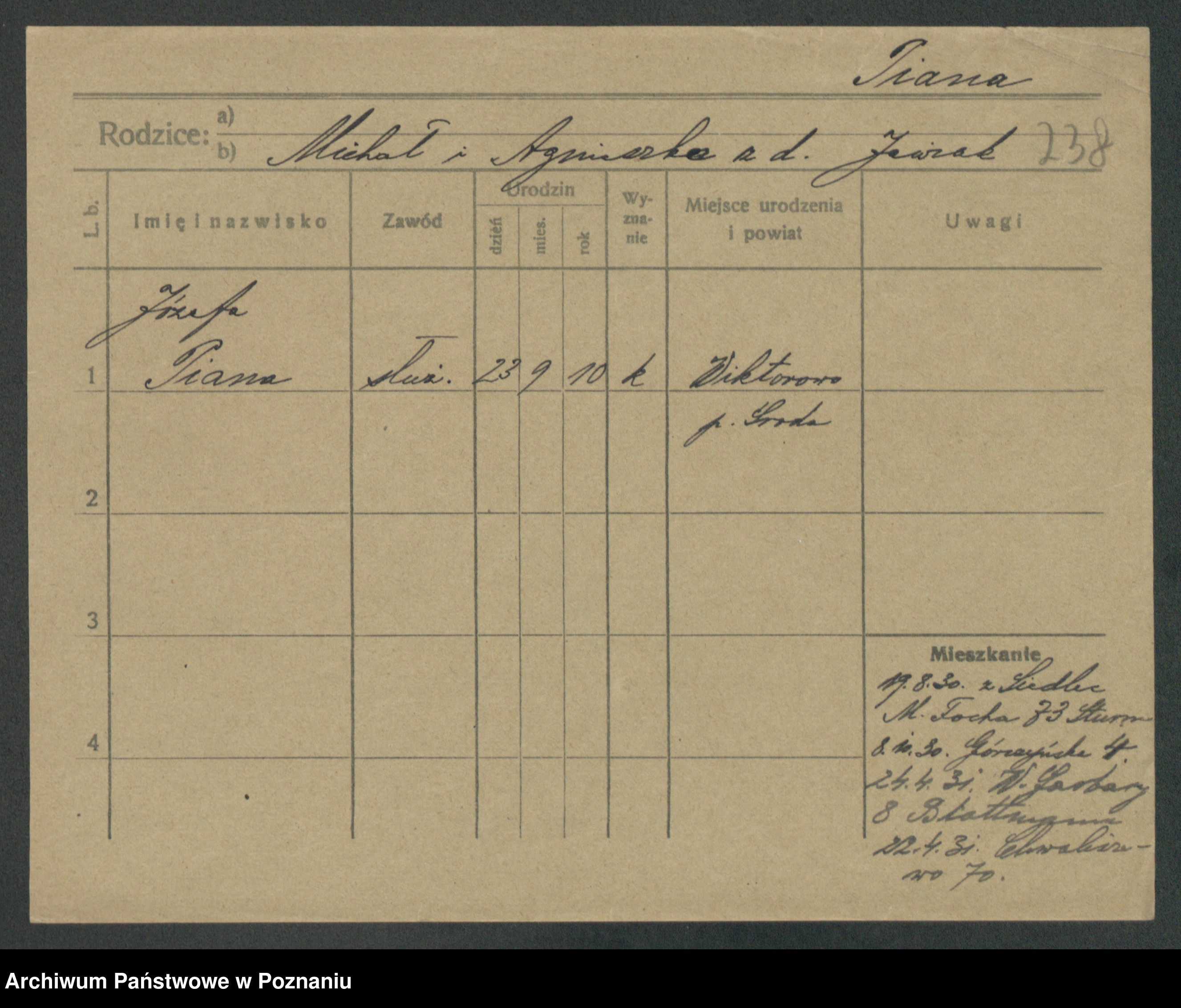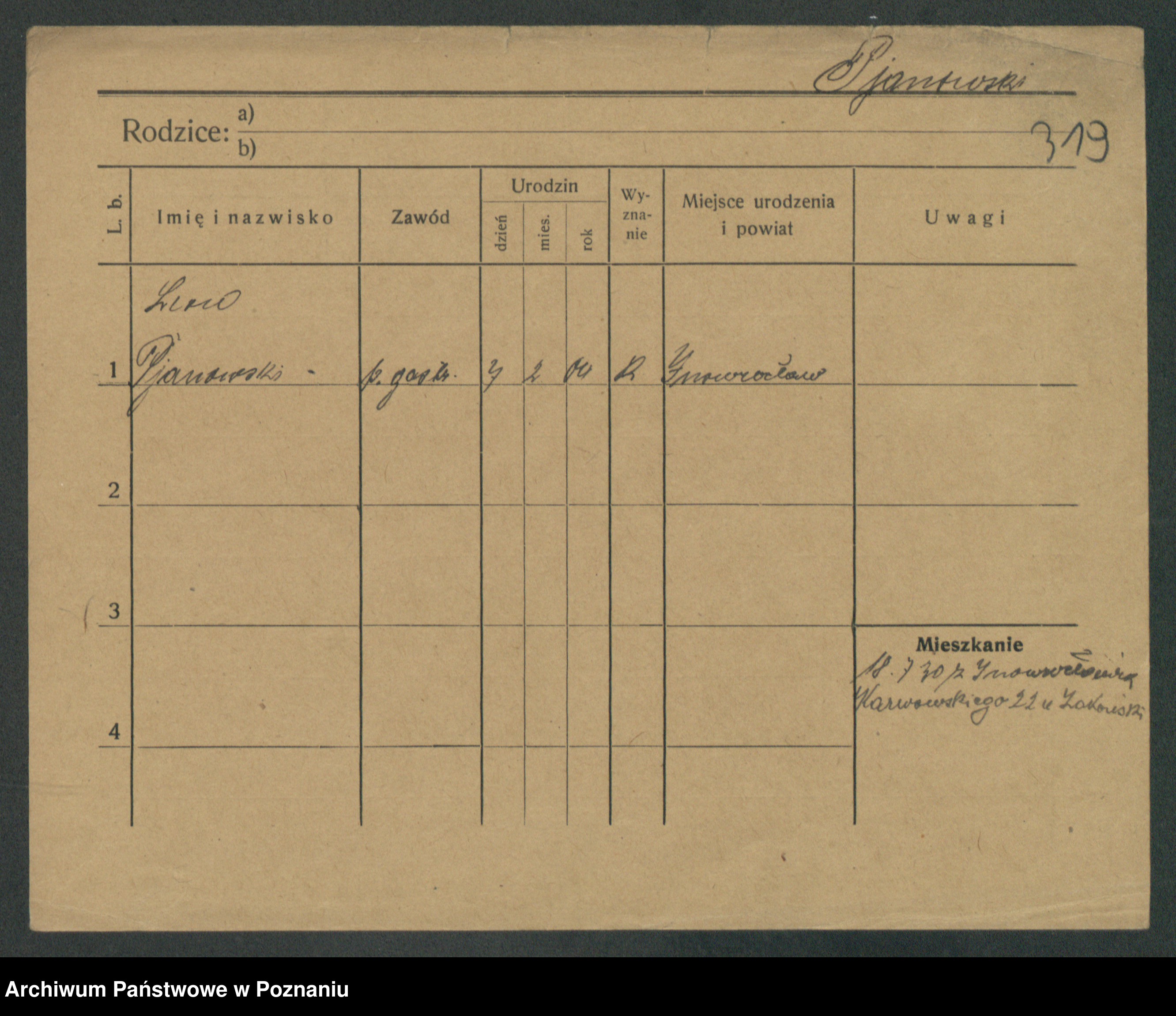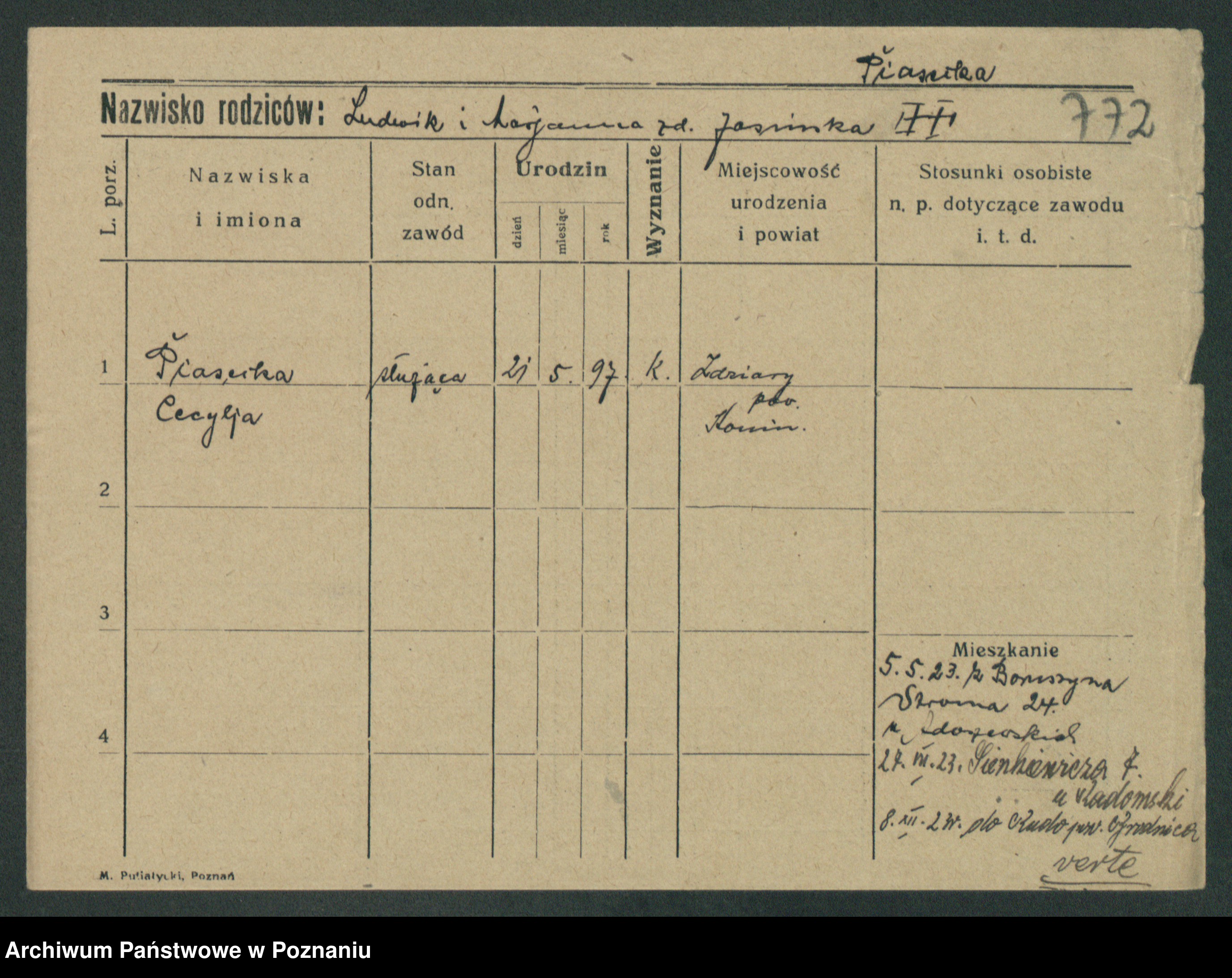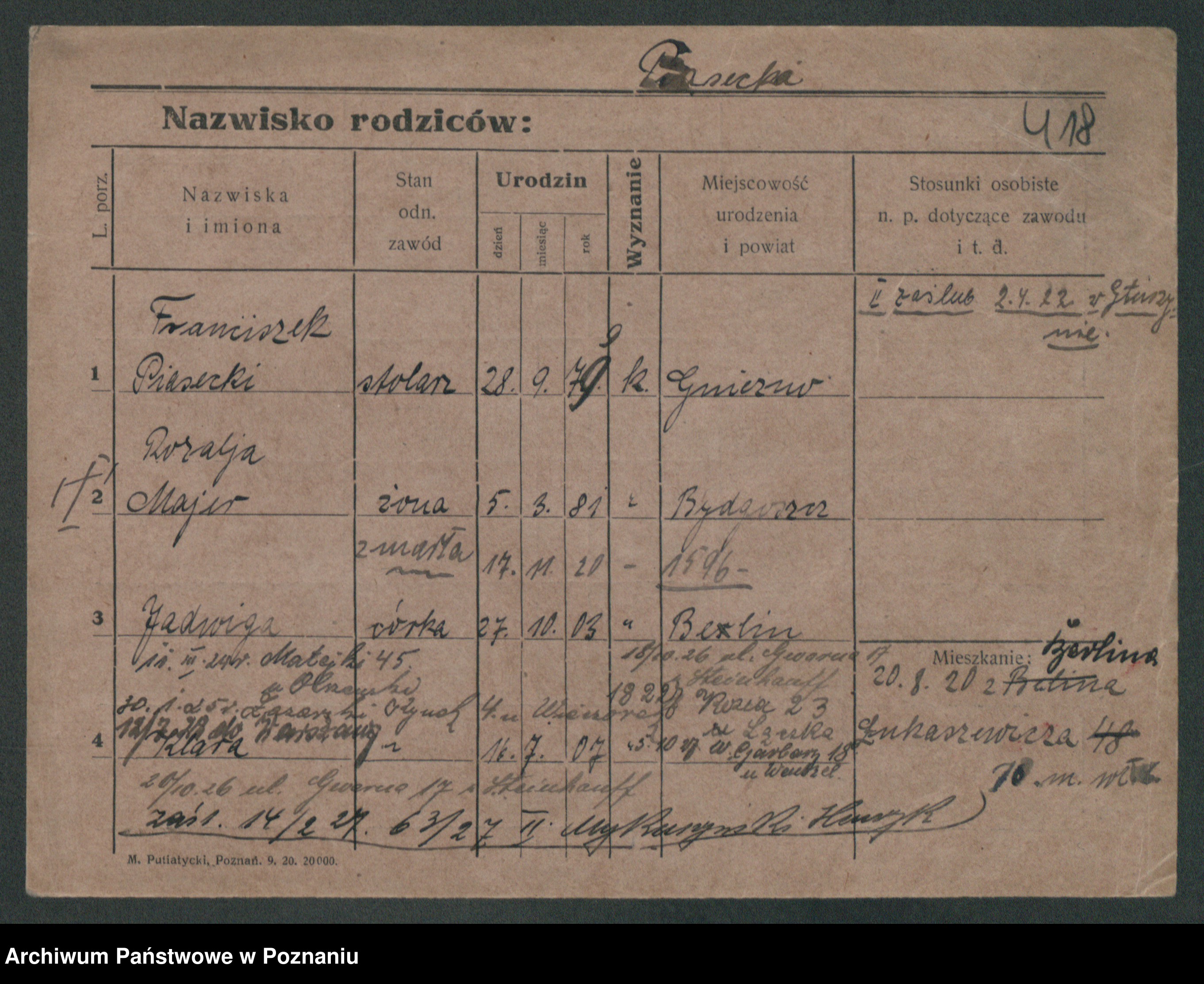 Podgląd karty osobowej dostępny jest po kliknięciu na nazwisko lub ikonkę karty. Można dokonywać powiększenia (ikony na górze) lub przechodzić między kolejnymi skanami (strzałki po bokach).