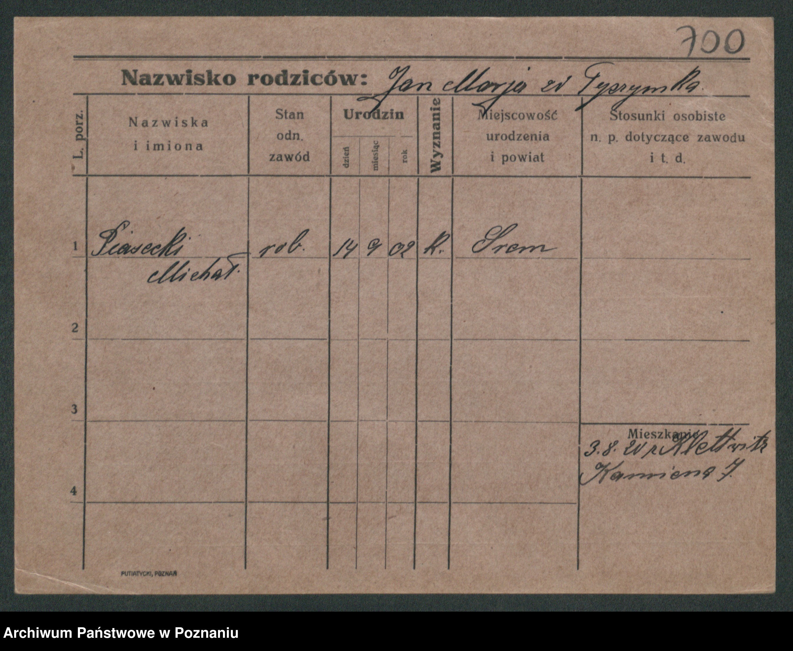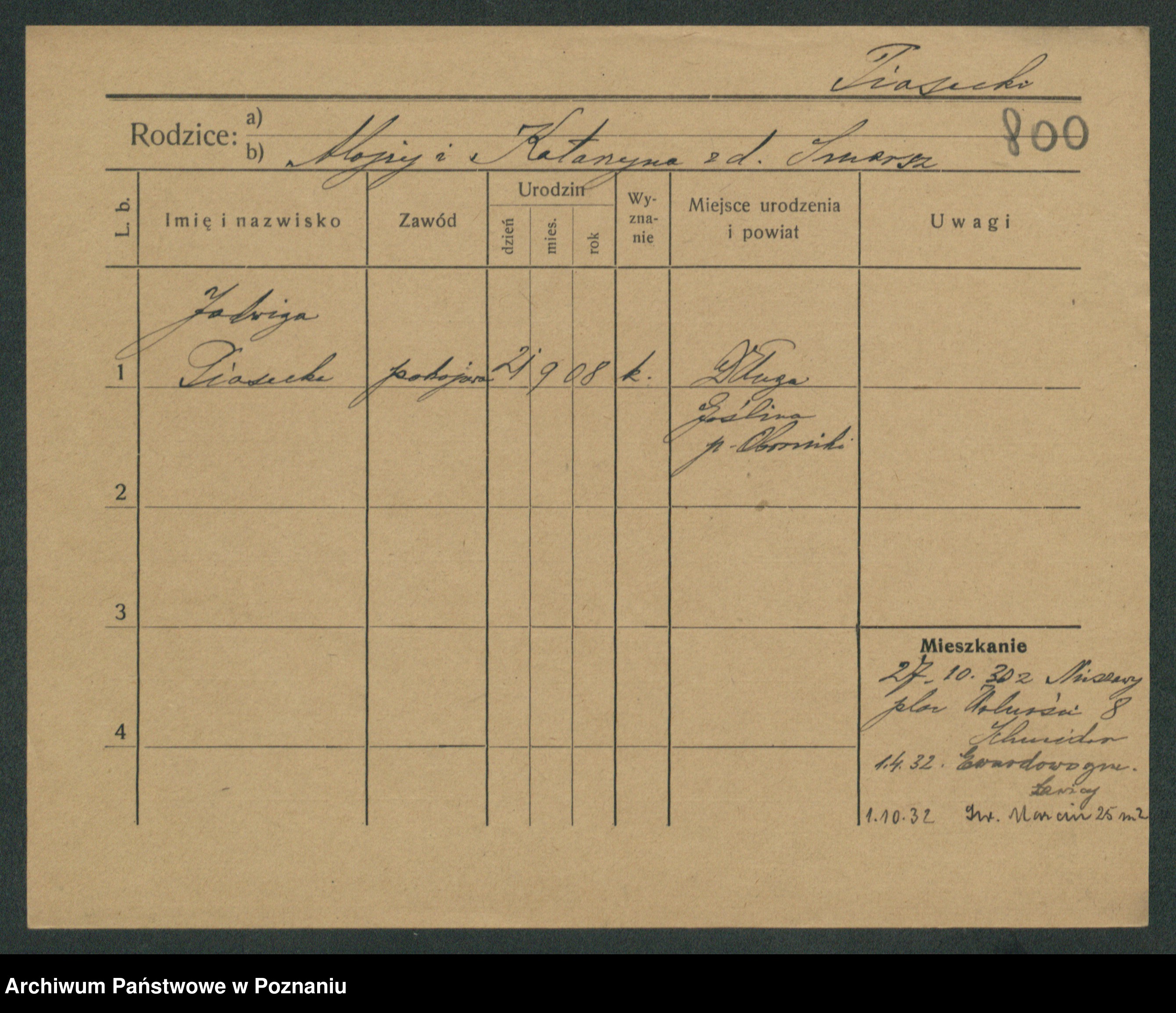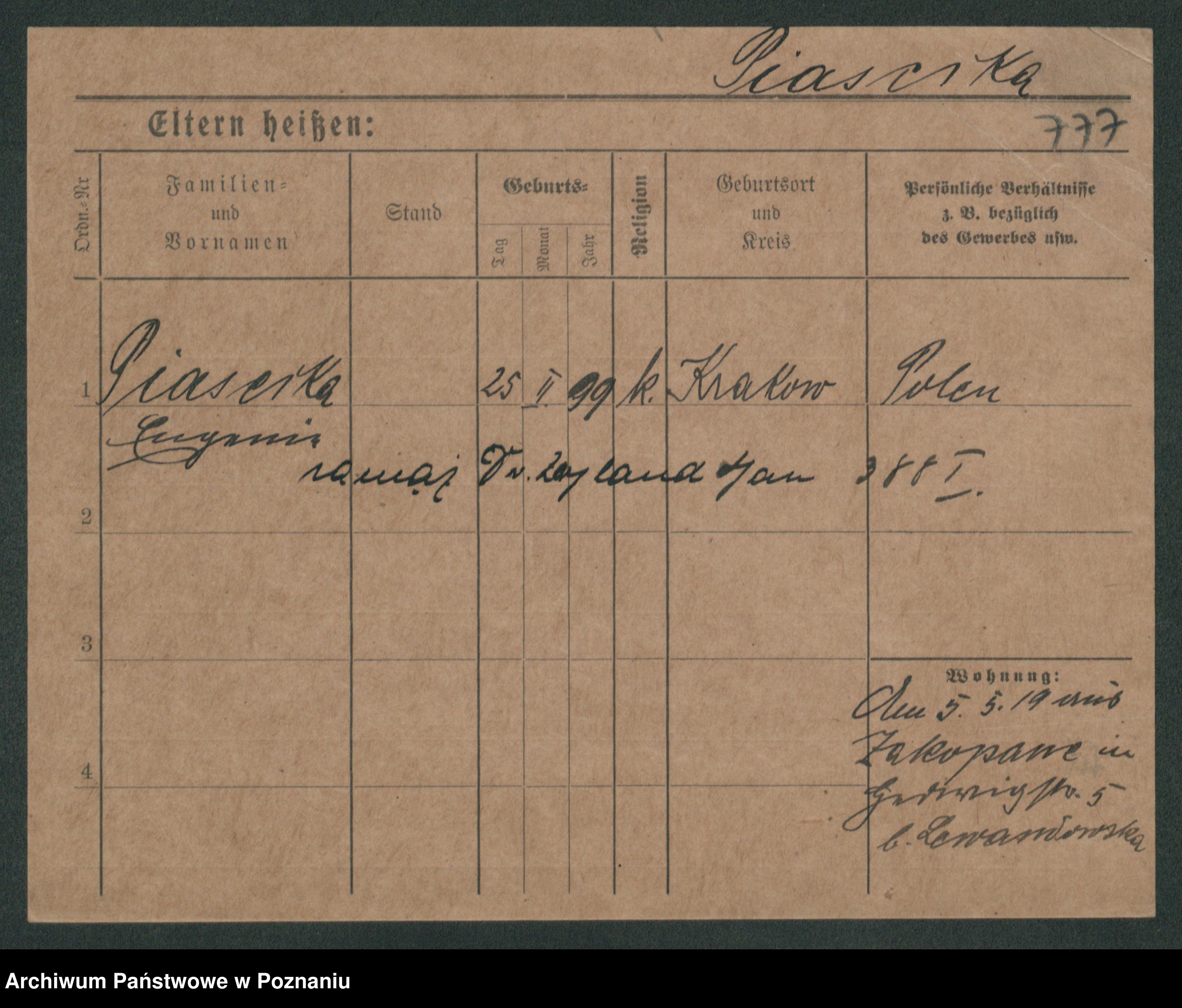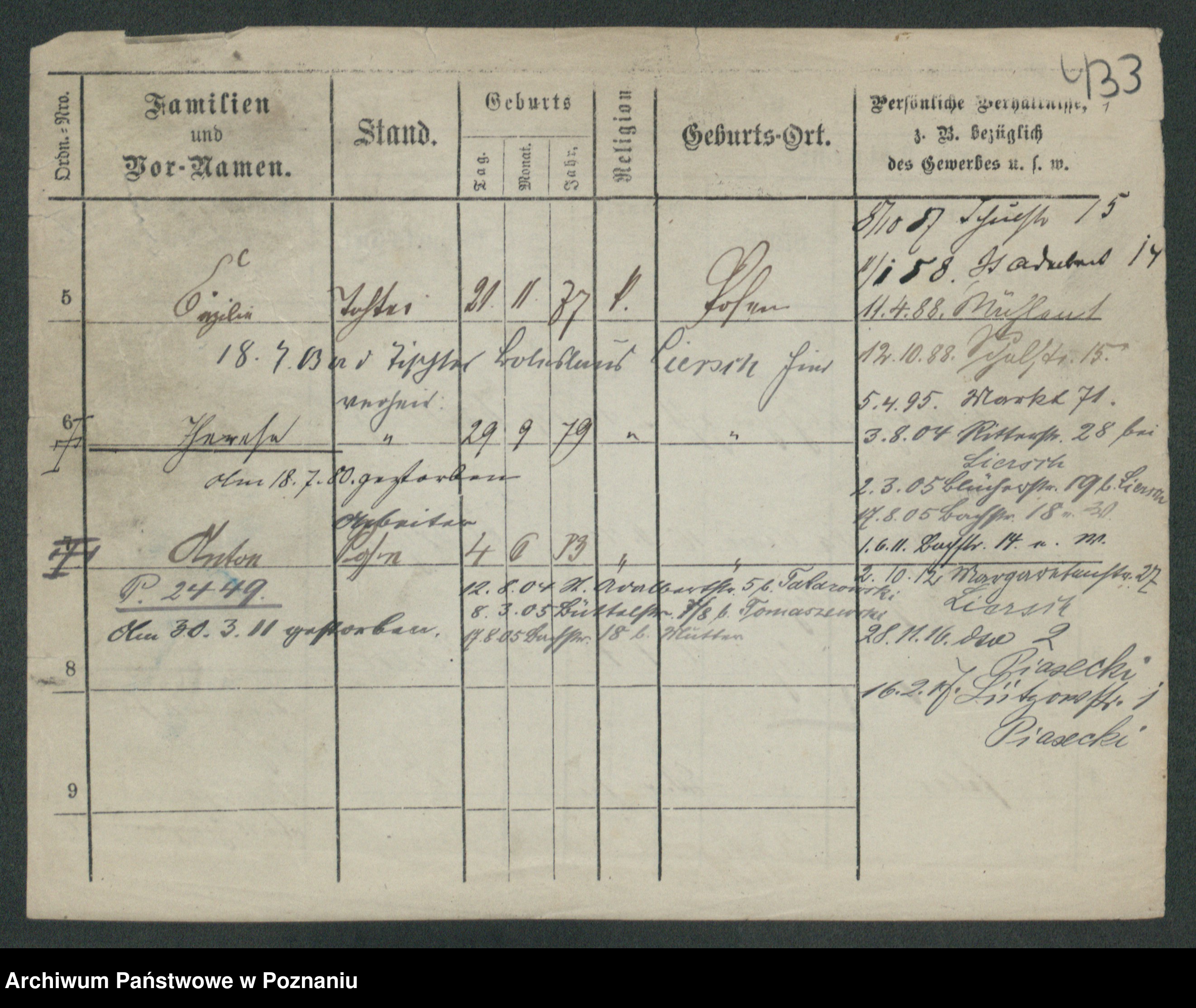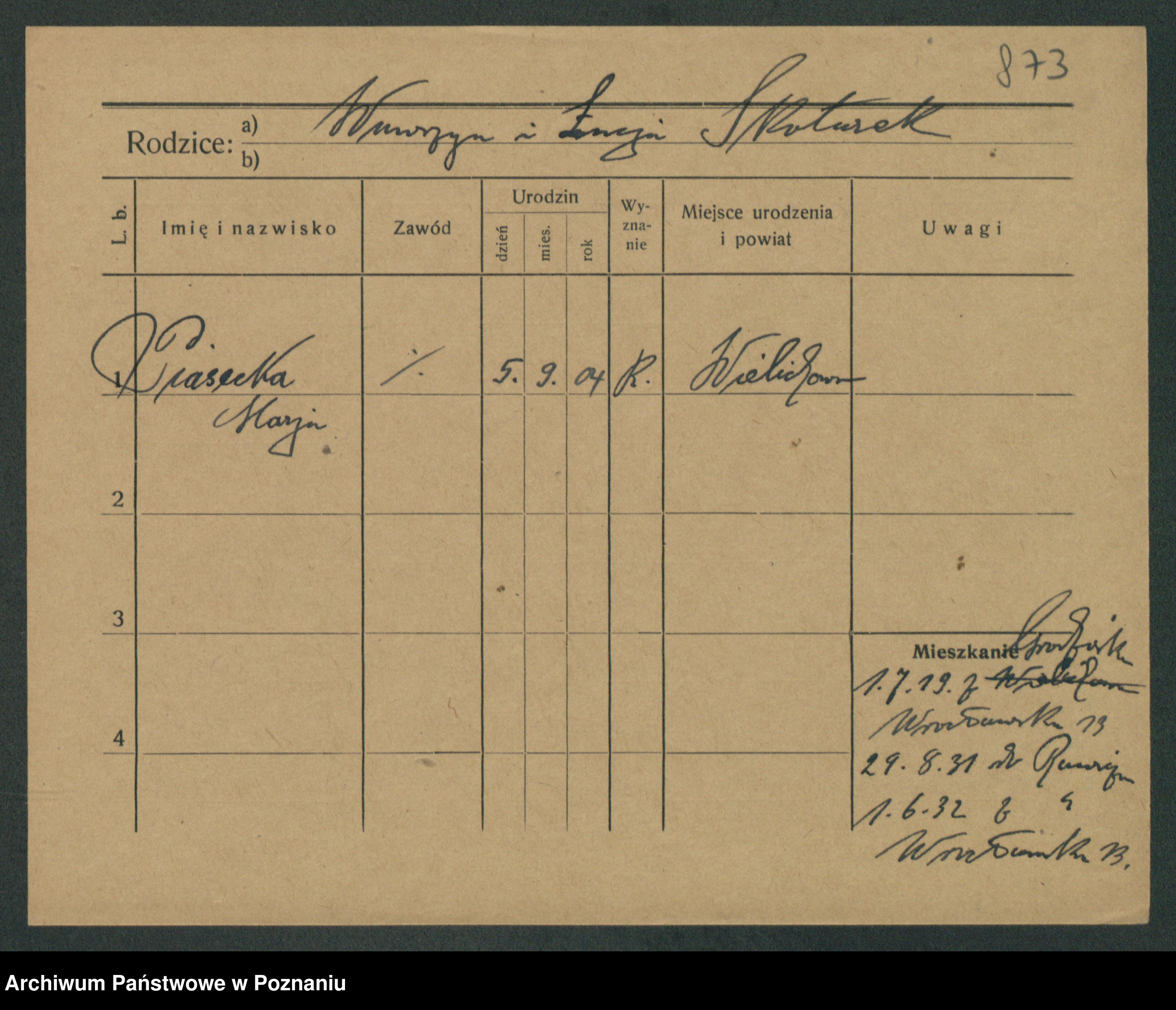 Podgląd karty osobowej dostępny jest po kliknięciu na nazwisko lub ikonkę karty. Można dokonywać powiększenia (ikony na górze) lub przechodzić między kolejnymi skanami (strzałki po bokach).