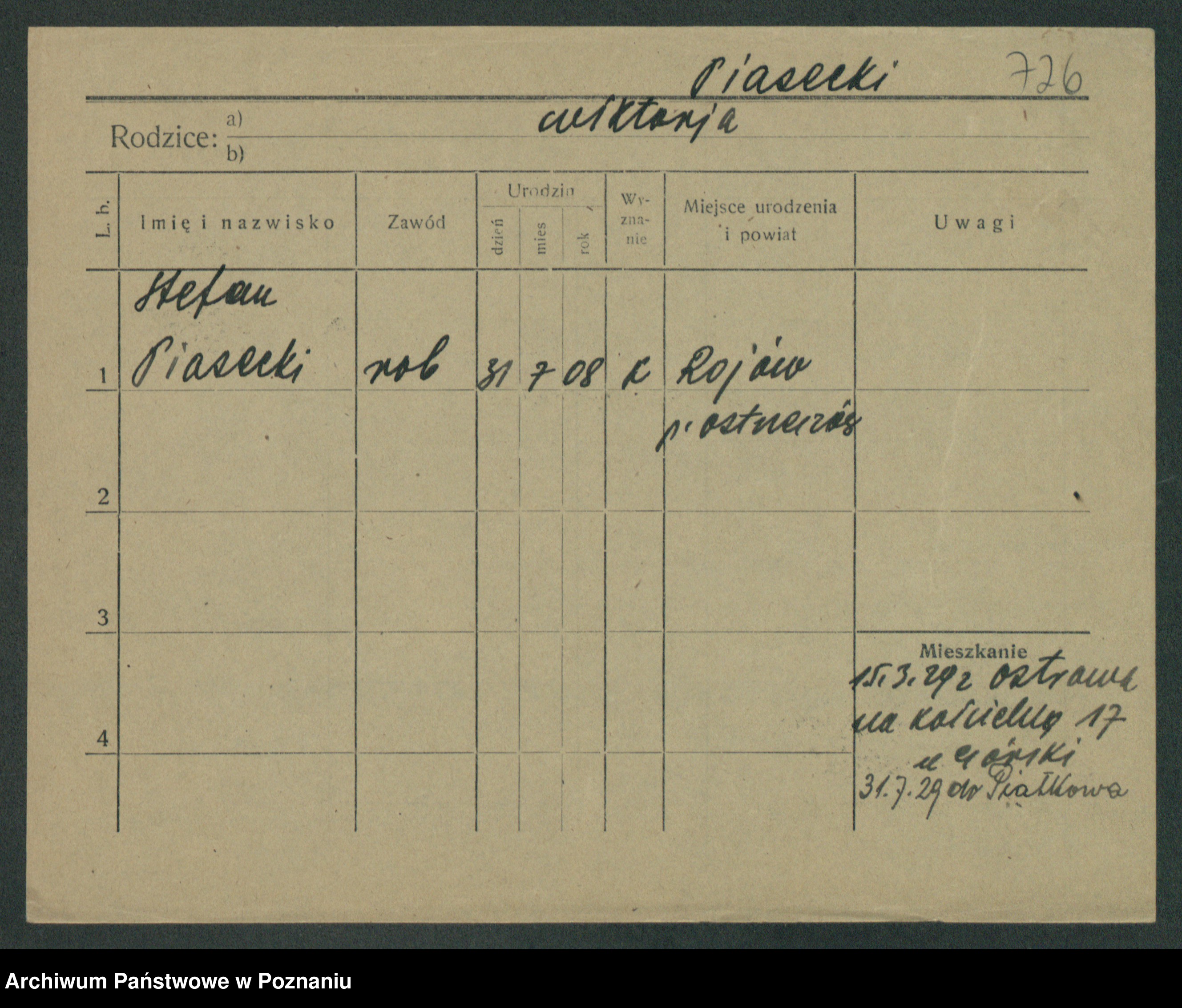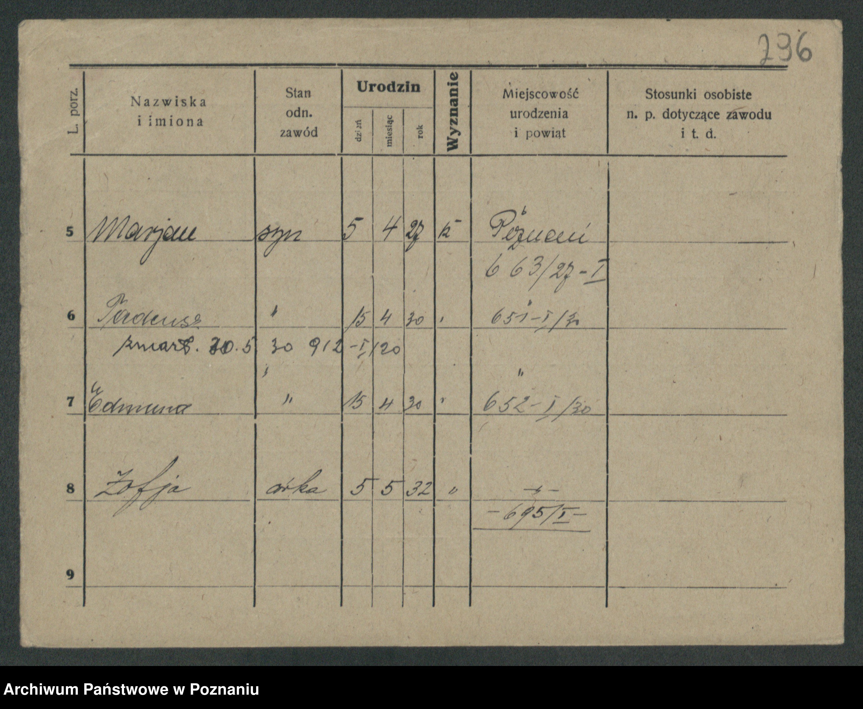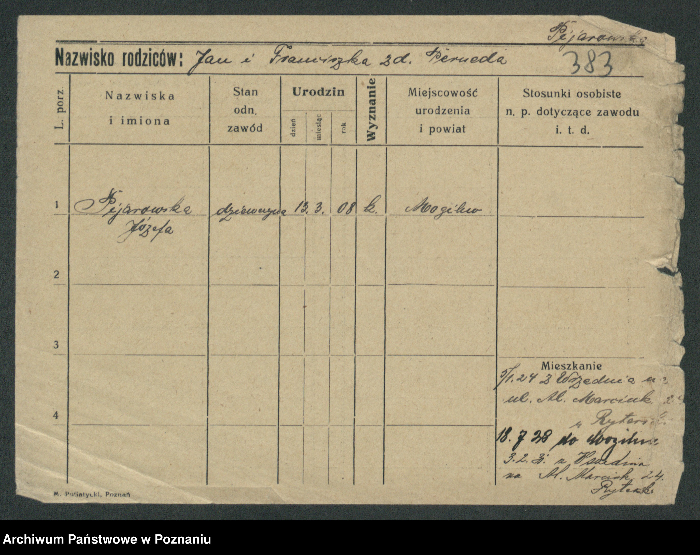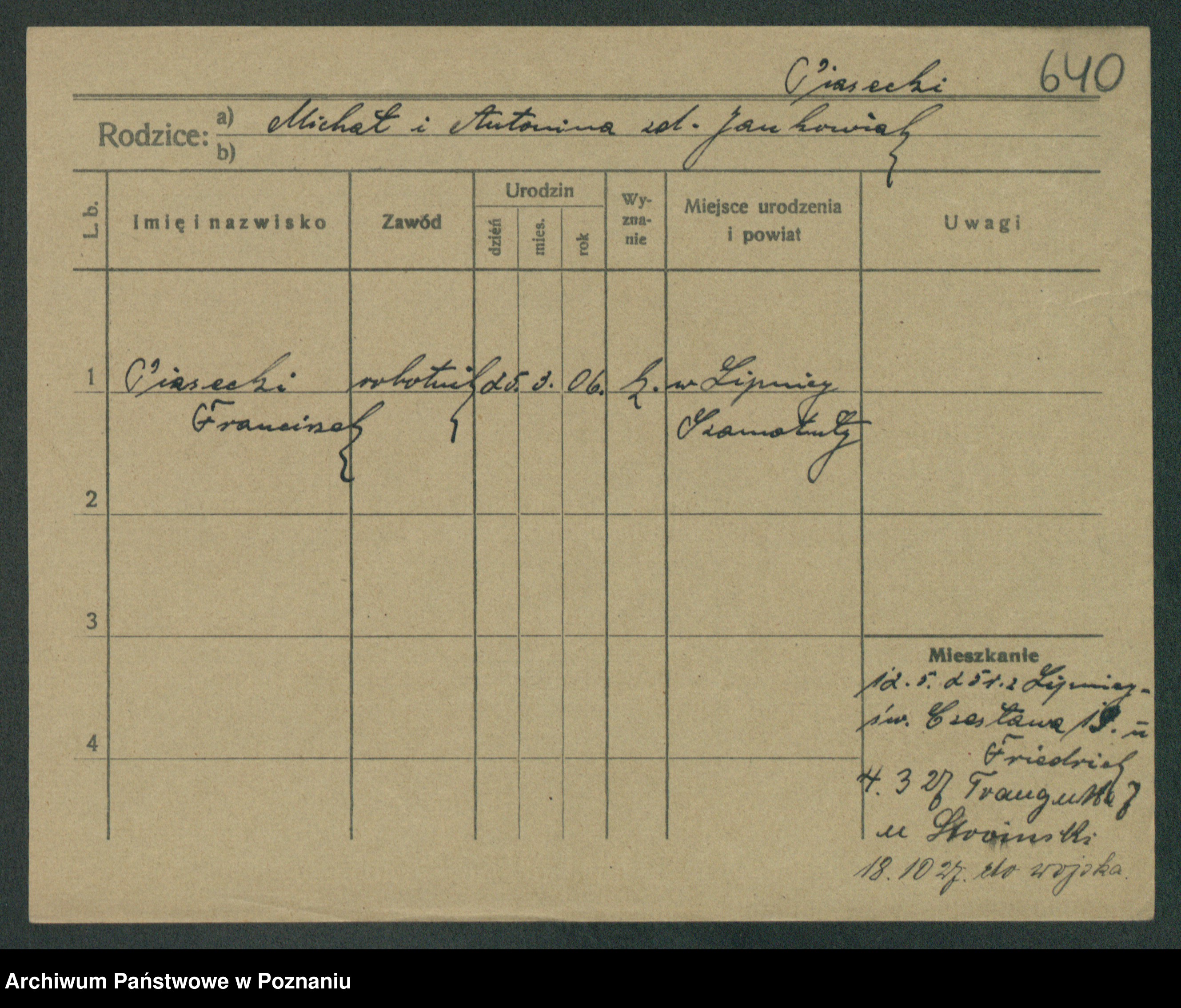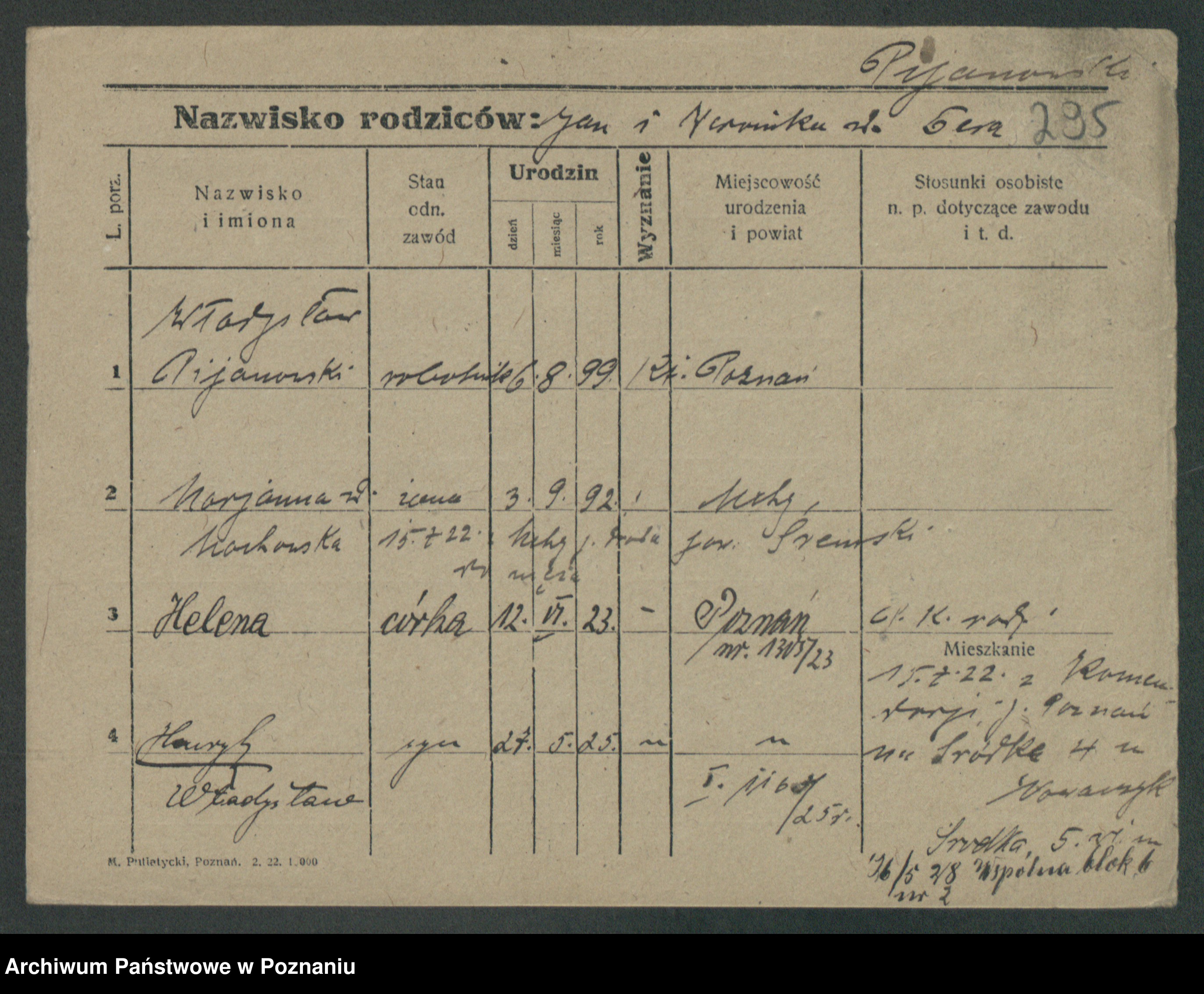 Podgląd karty osobowej dostępny jest po kliknięciu na nazwisko lub ikonkę karty. Można dokonywać powiększenia (ikony na górze) lub przechodzić między kolejnymi skanami (strzałki po bokach).