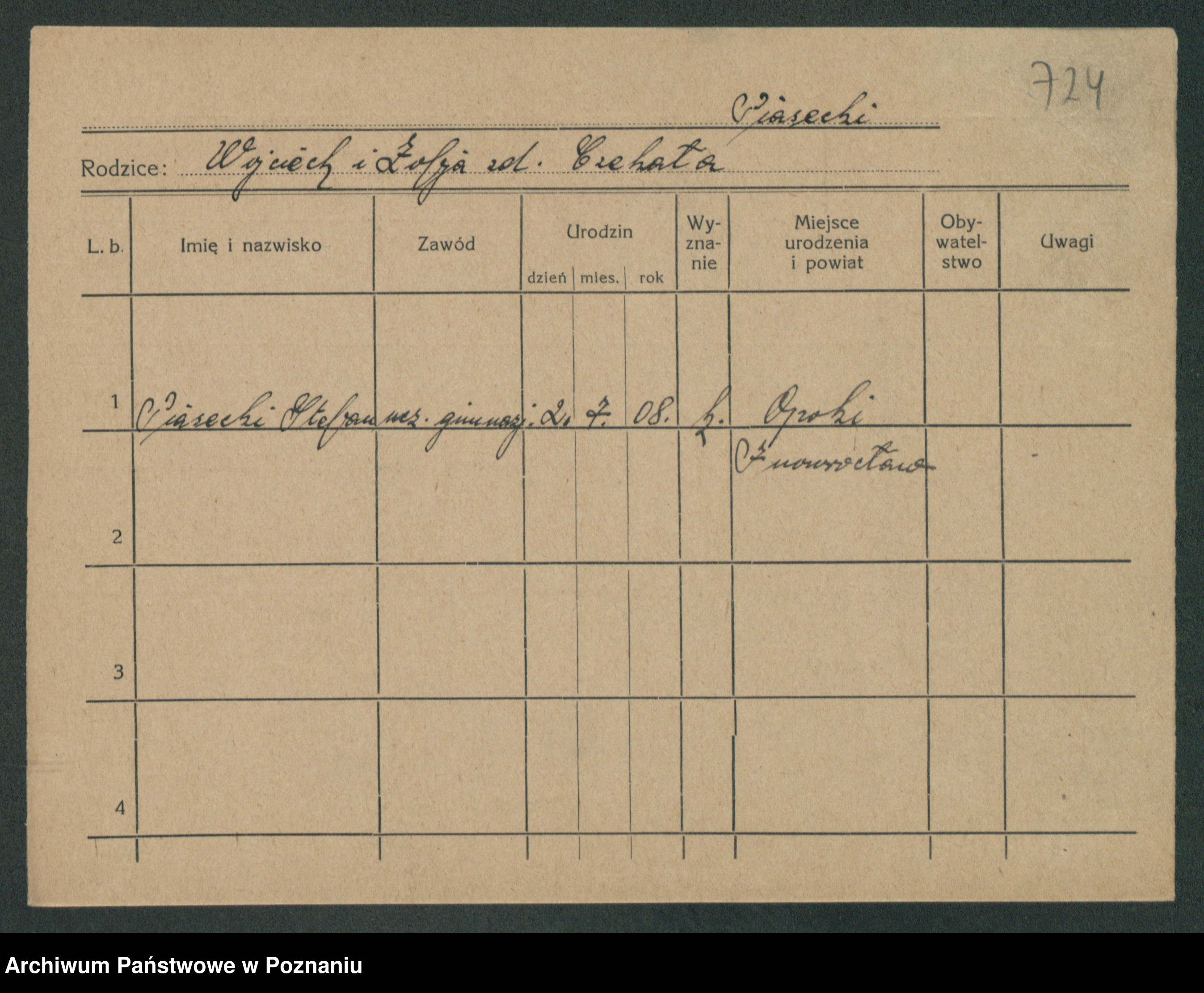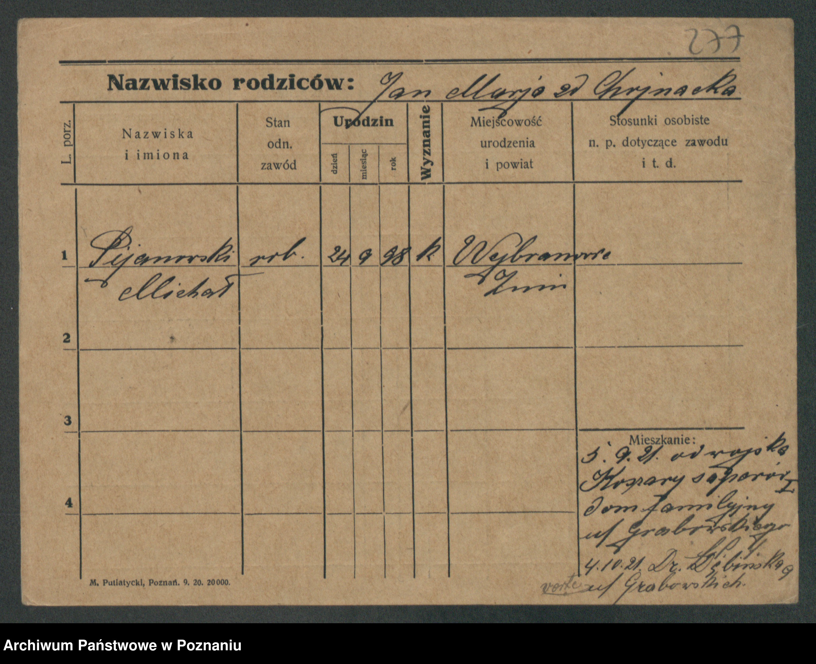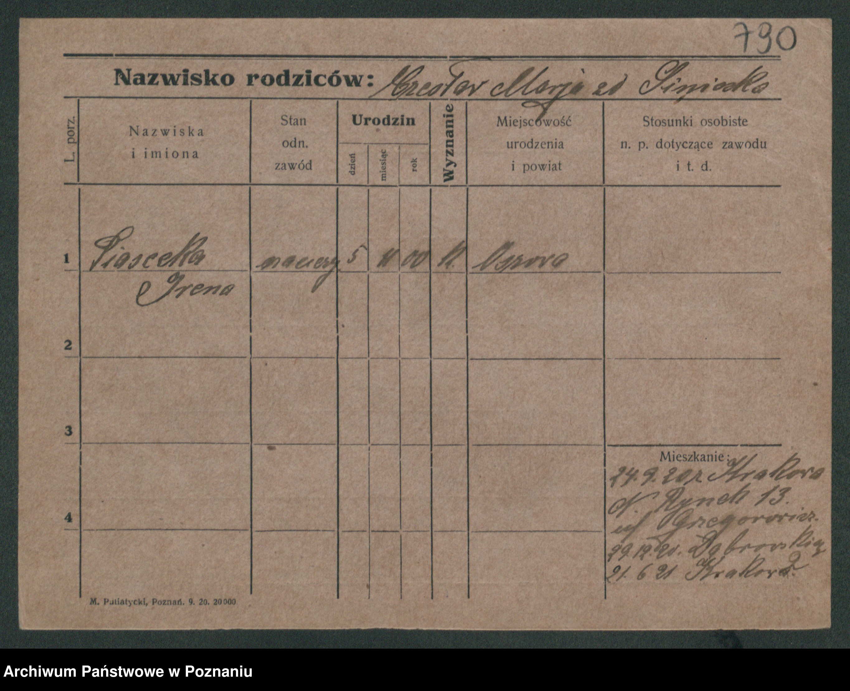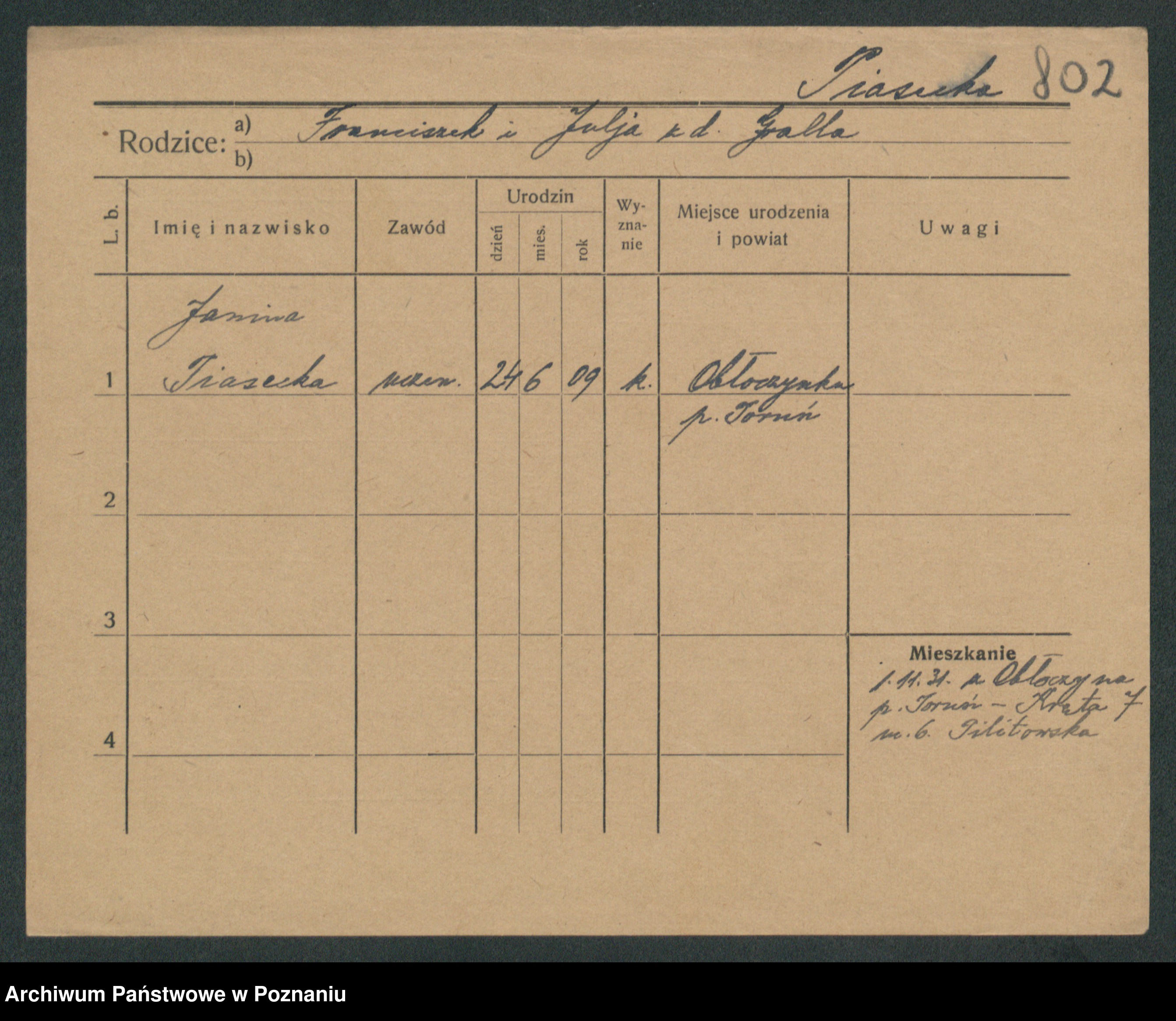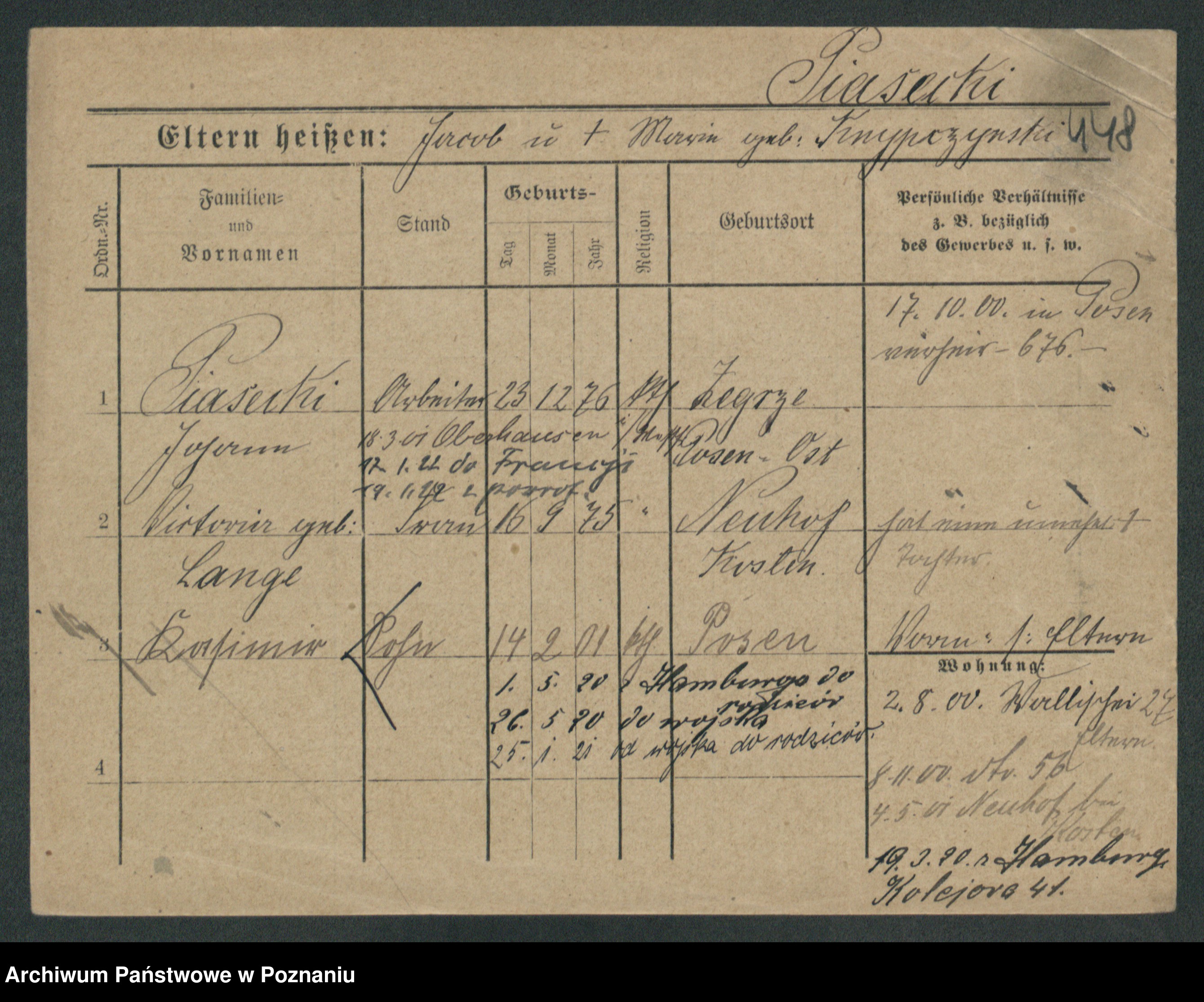 Podgląd karty osobowej dostępny jest po kliknięciu na nazwisko lub ikonkę karty. Można dokonywać powiększenia (ikony na górze) lub przechodzić między kolejnymi skanami (strzałki po bokach).