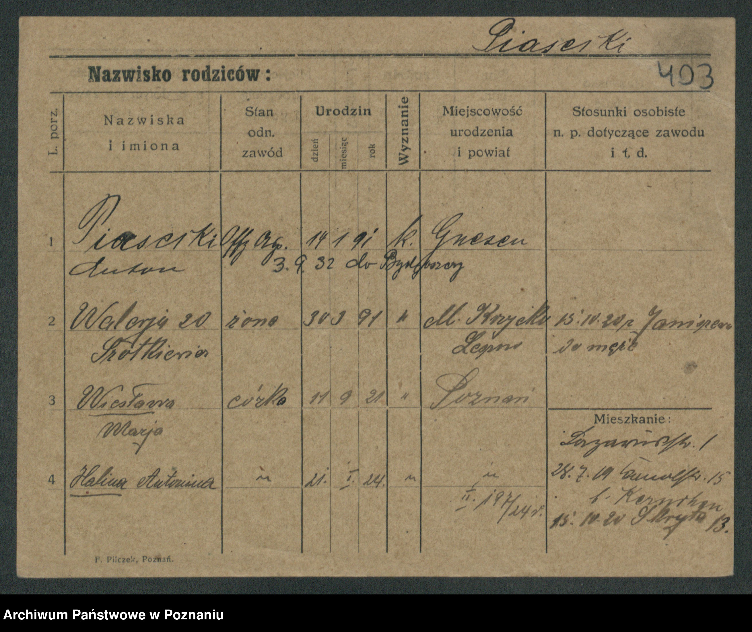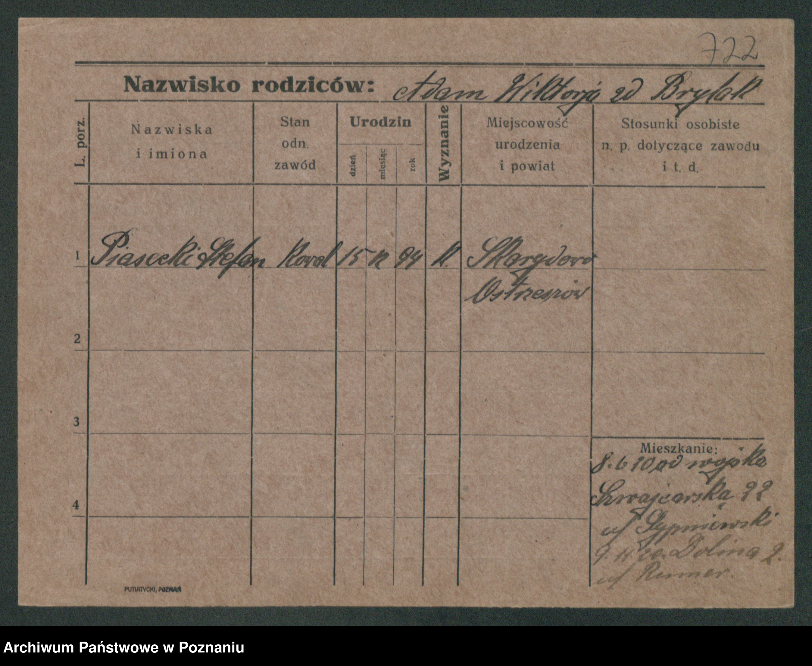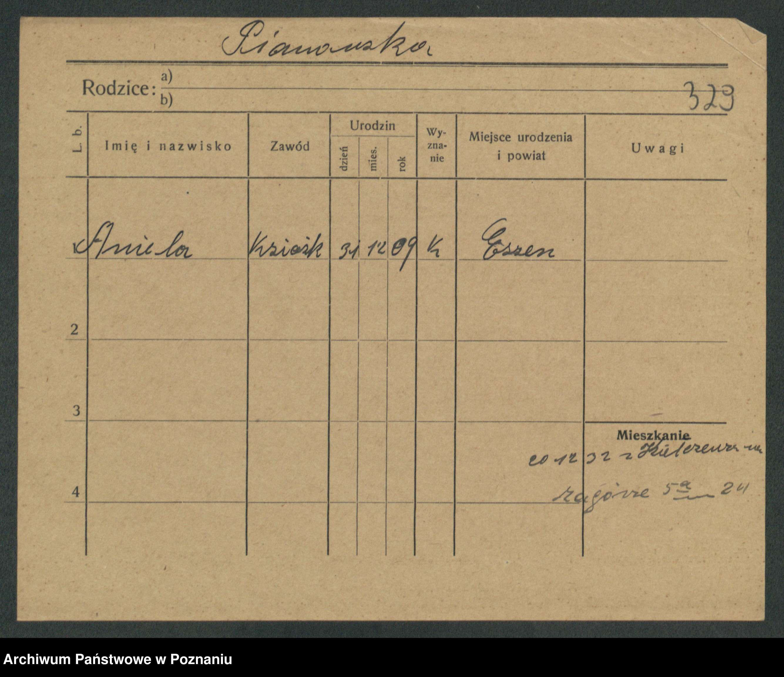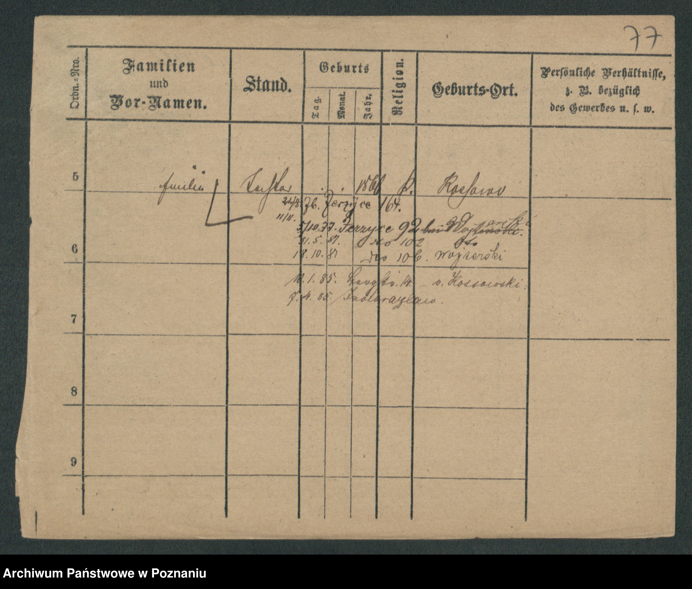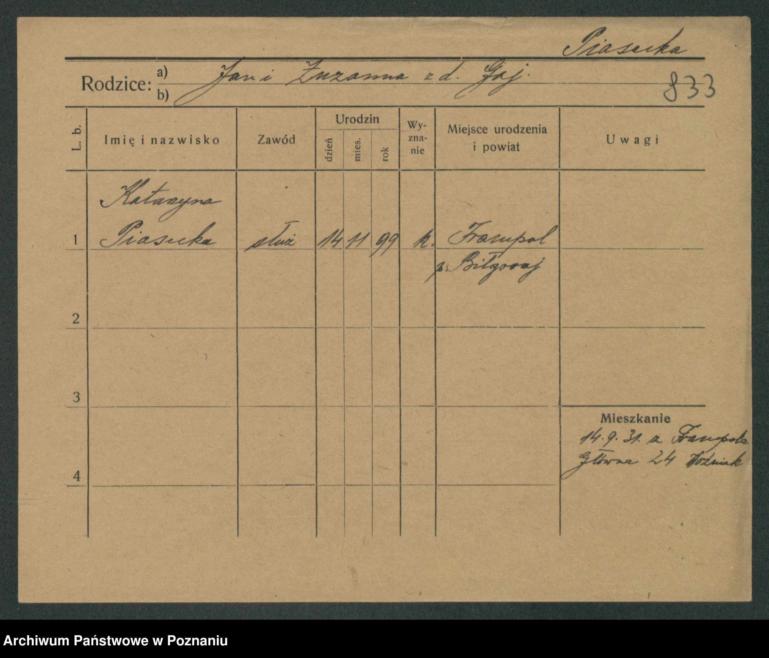 Podgląd karty osobowej dostępny jest po kliknięciu na nazwisko lub ikonkę karty. Można dokonywać powiększenia (ikony na górze) lub przechodzić między kolejnymi skanami (strzałki po bokach).
