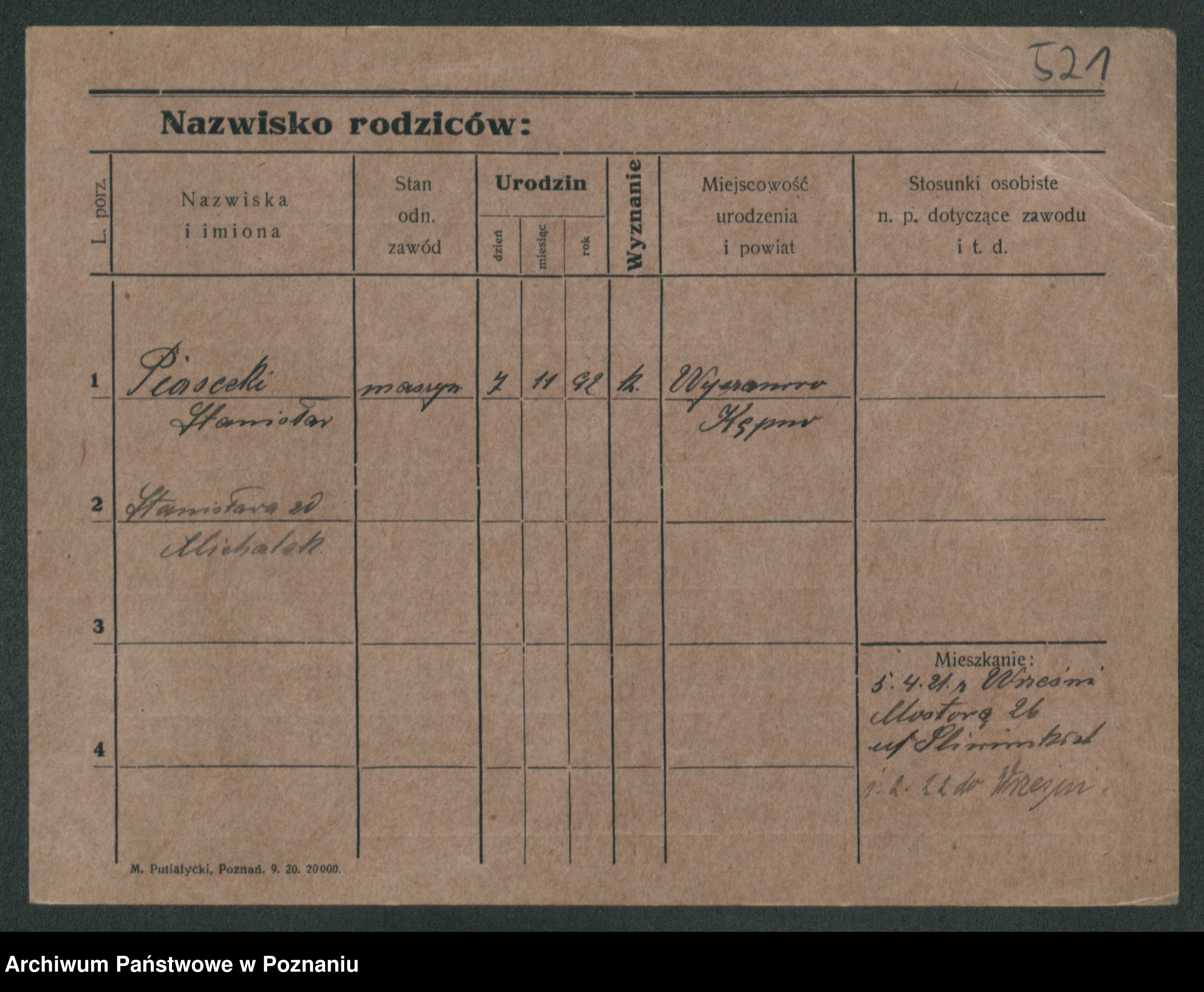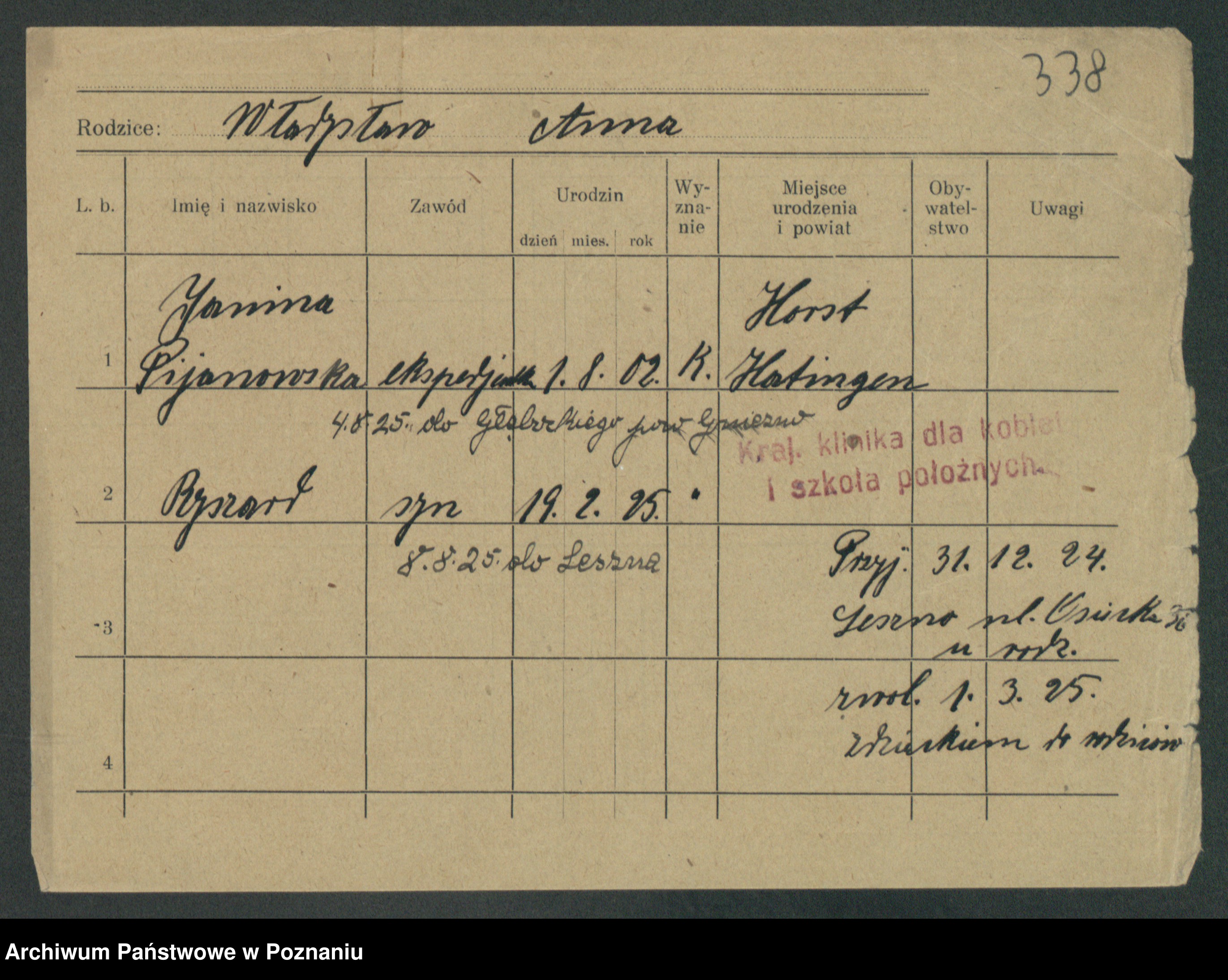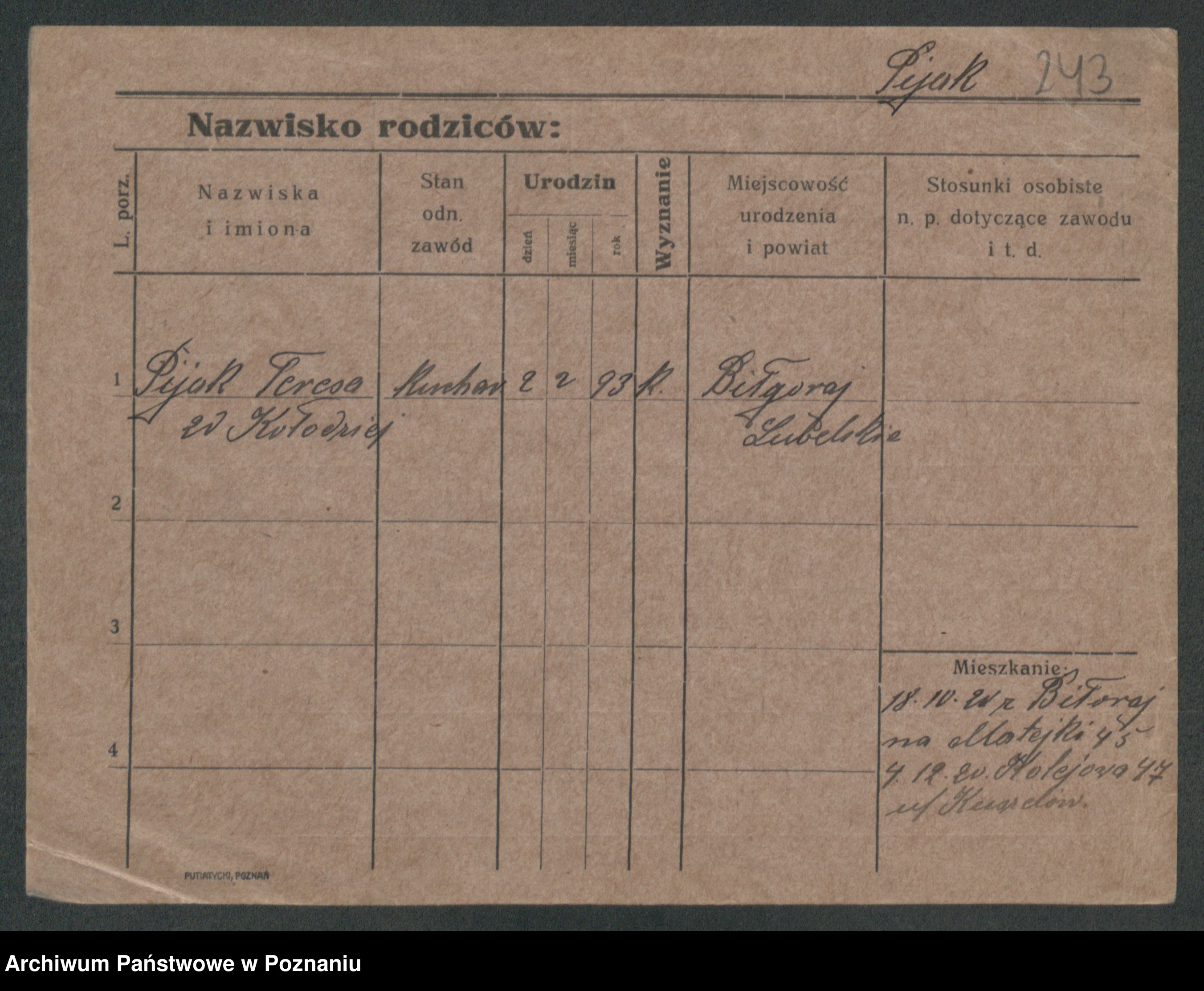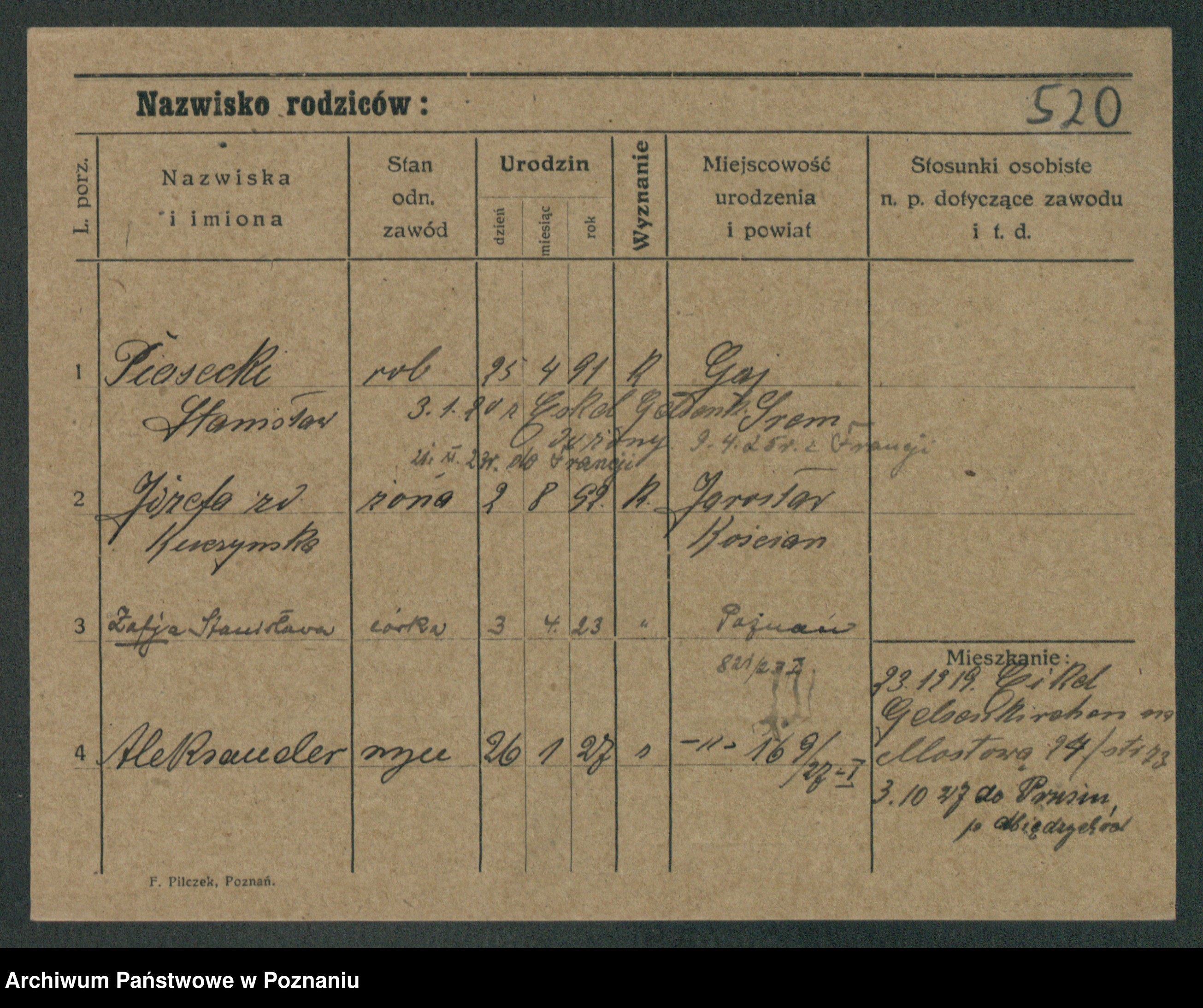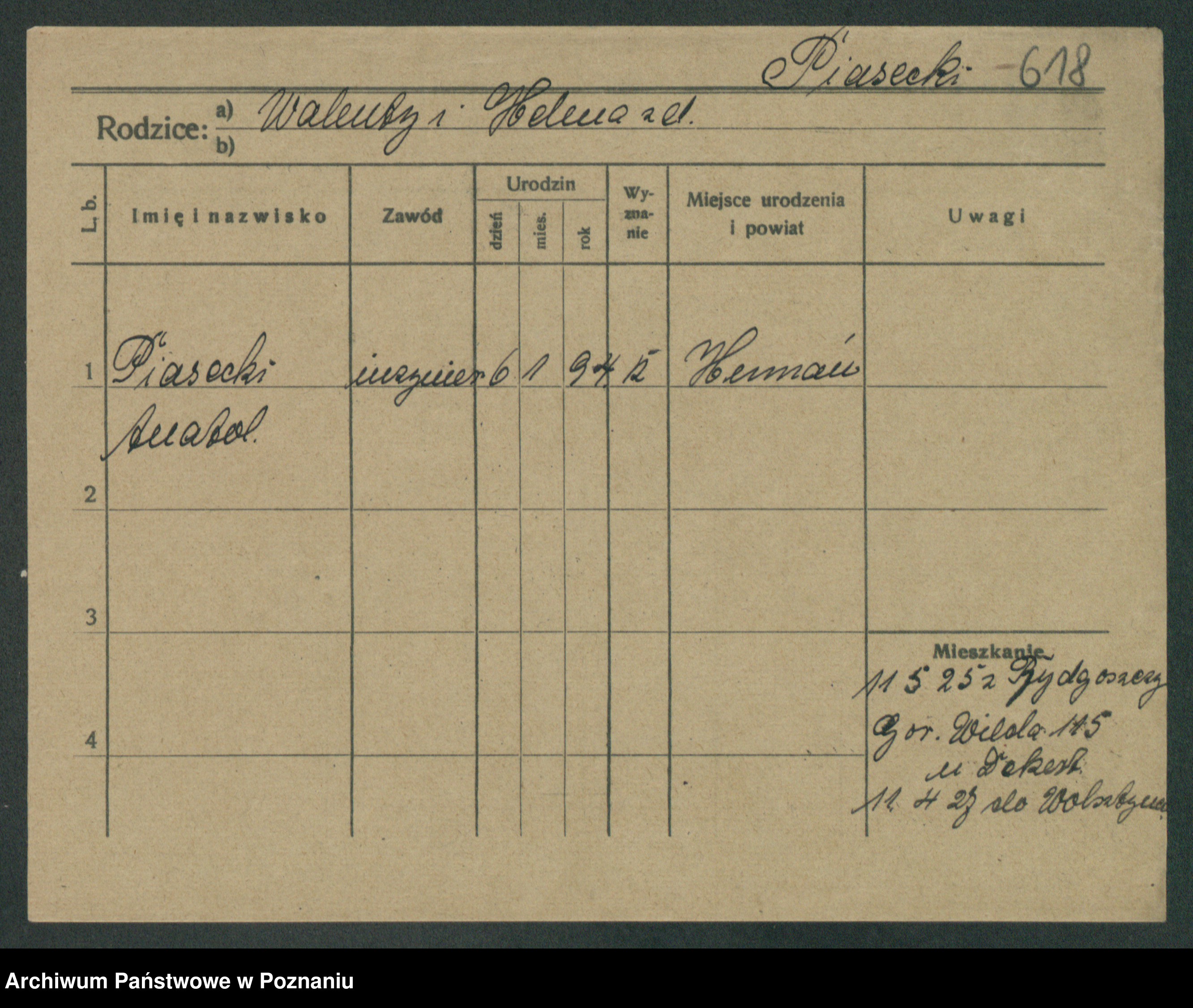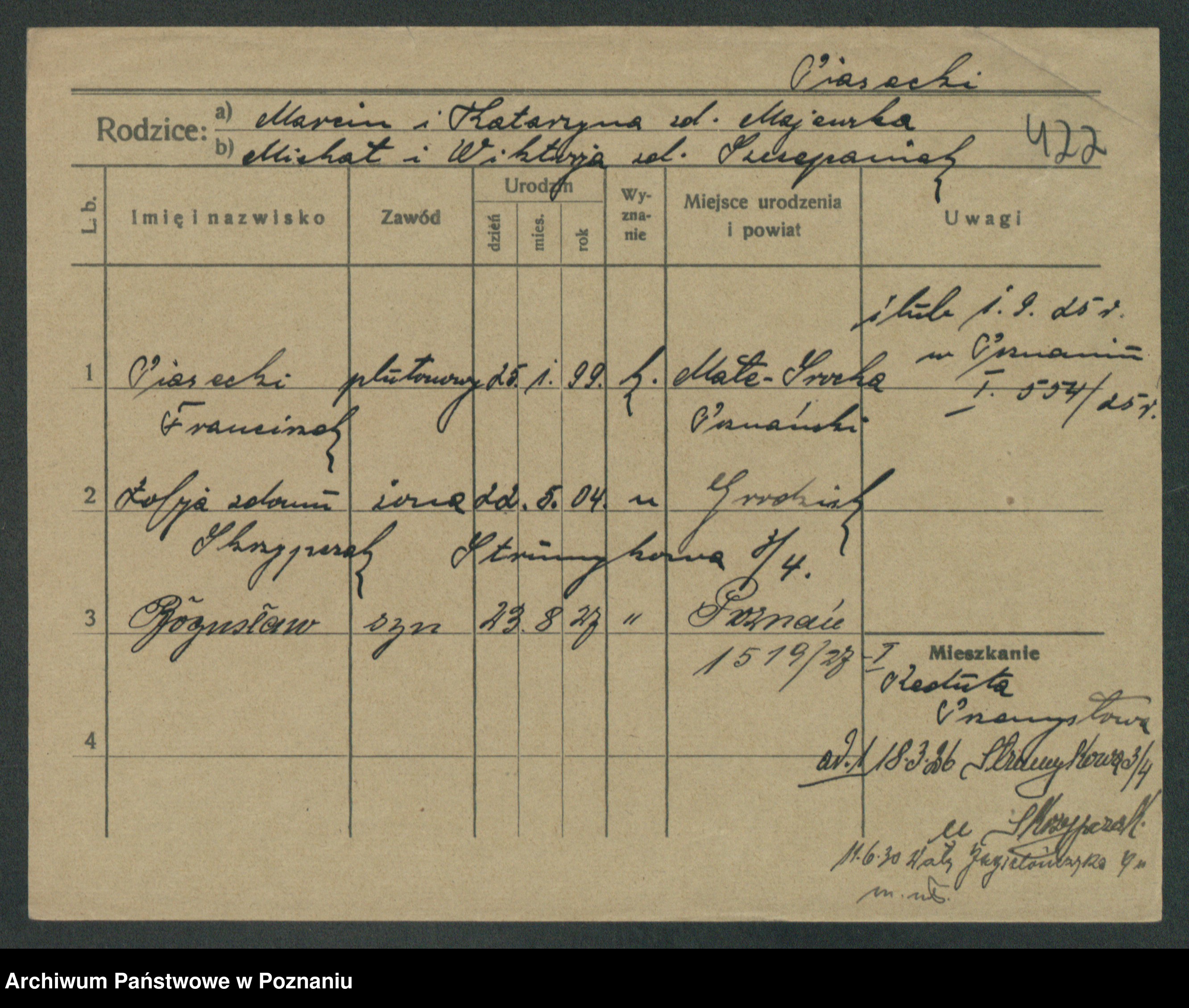Podgląd karty osobowej dostępny jest po kliknięciu na nazwisko lub ikonkę karty. Można dokonywać powiększenia (ikony na górze) lub przechodzić między kolejnymi skanami (strzałki po bokach).