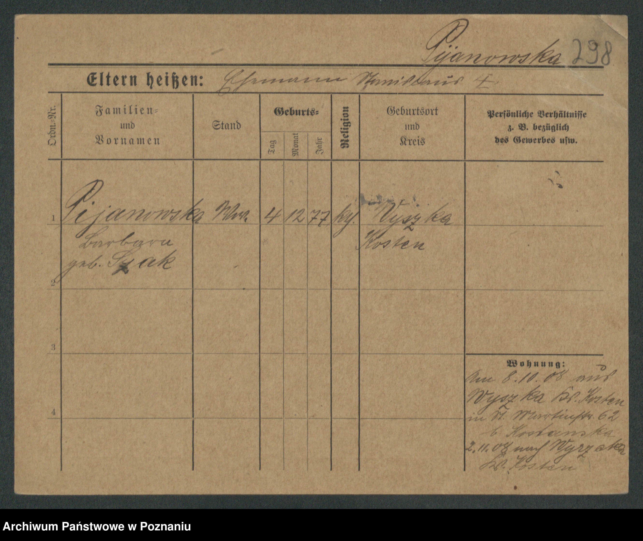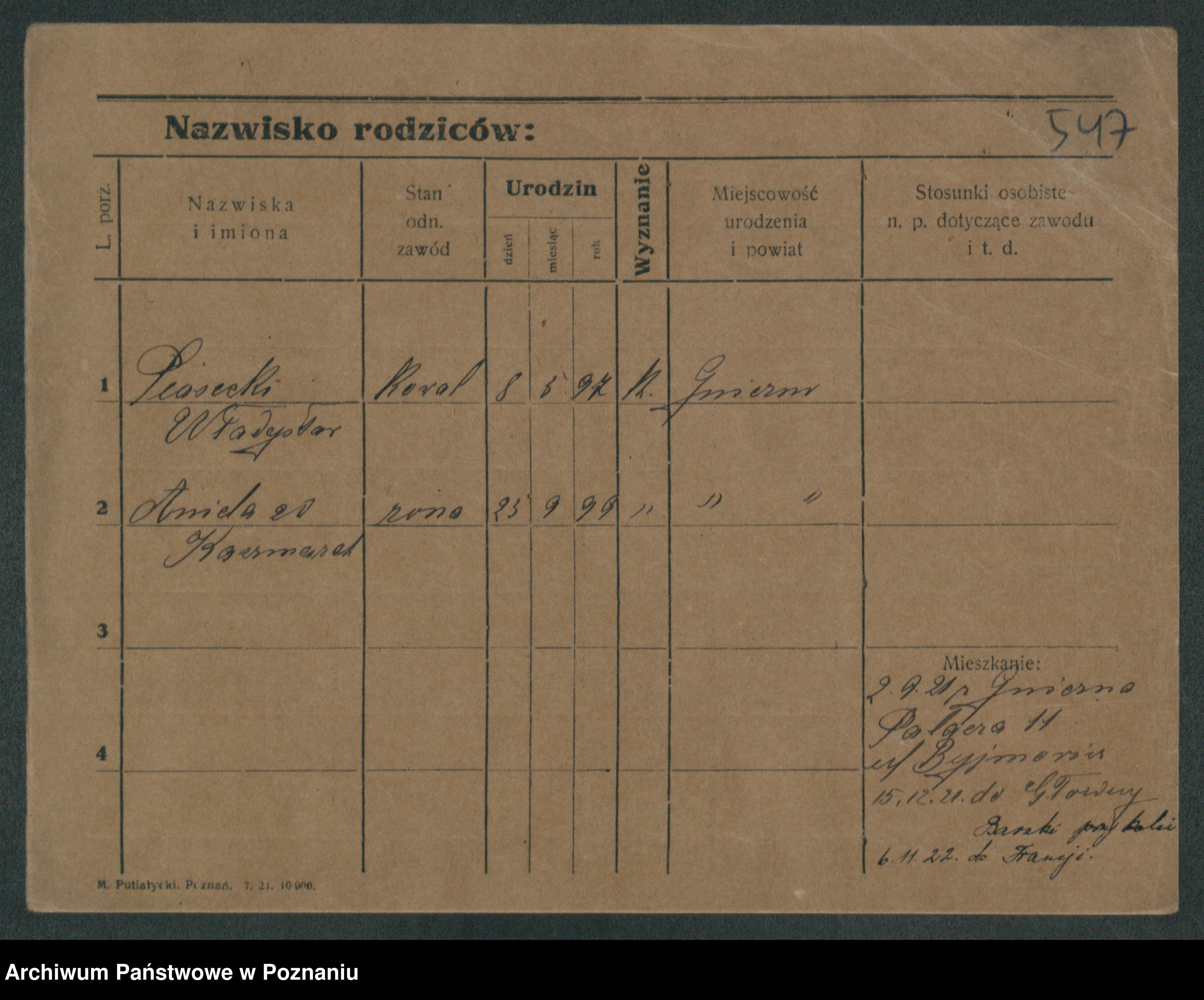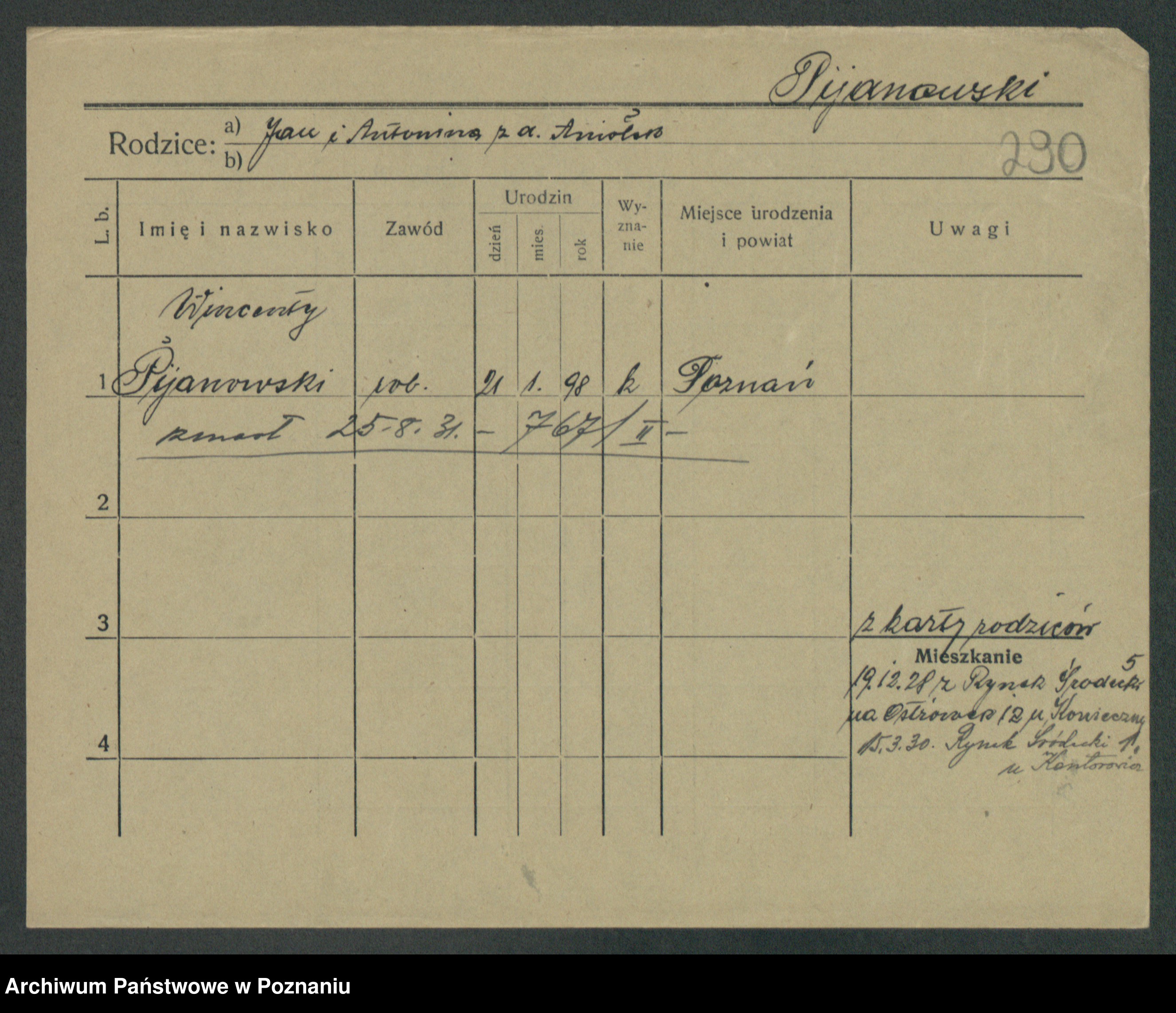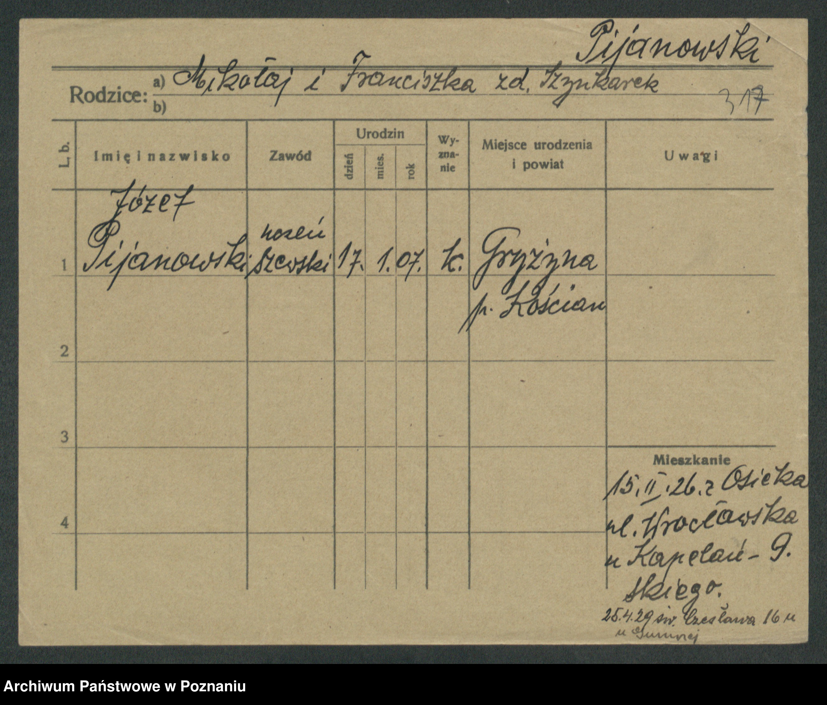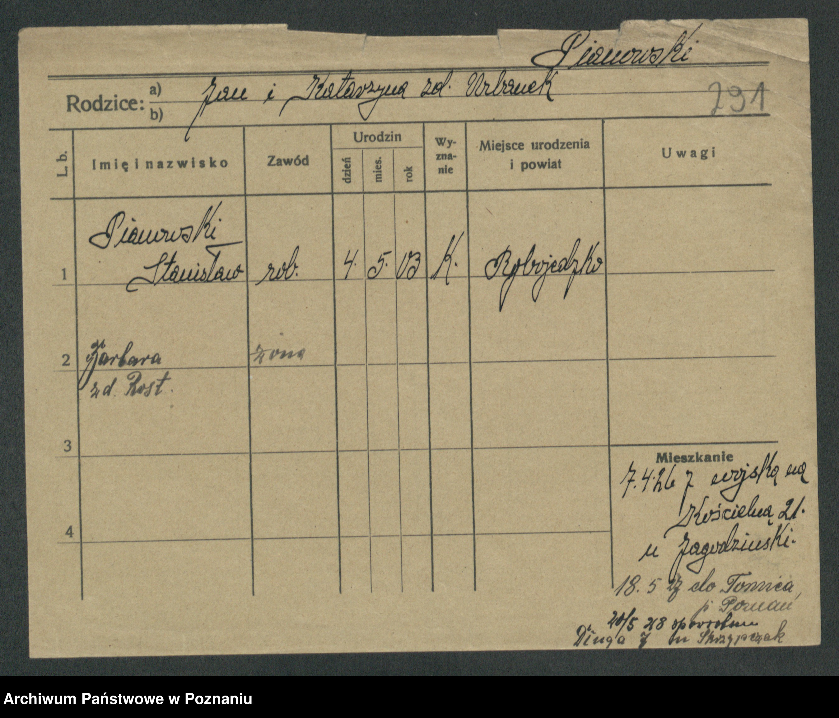 Podgląd karty osobowej dostępny jest po kliknięciu na nazwisko lub ikonkę karty. Można dokonywać powiększenia (ikony na górze) lub przechodzić między kolejnymi skanami (strzałki po bokach).