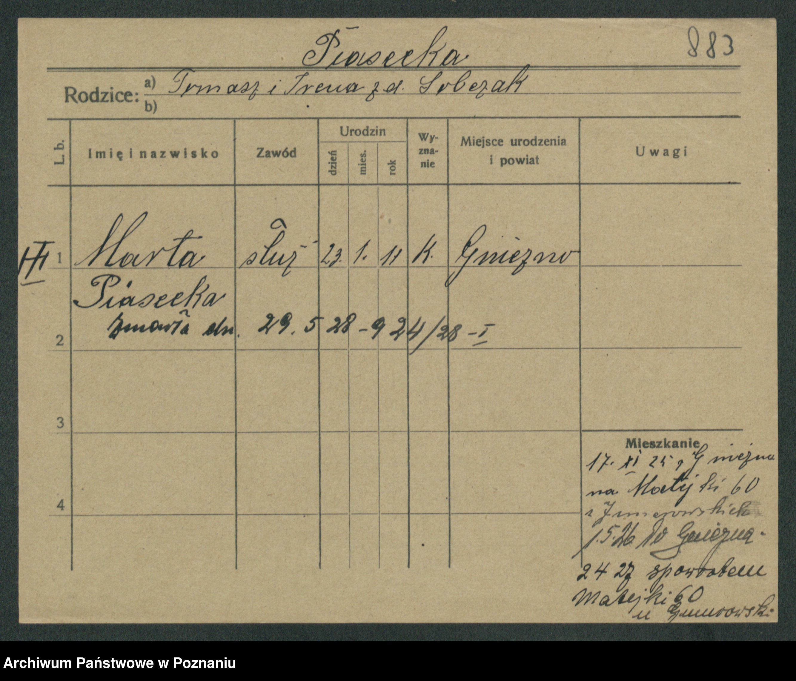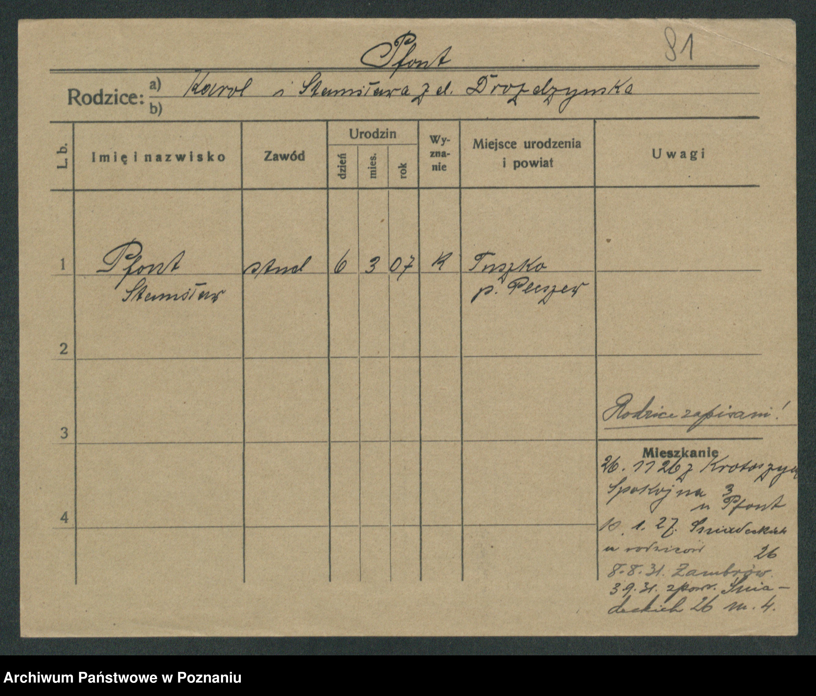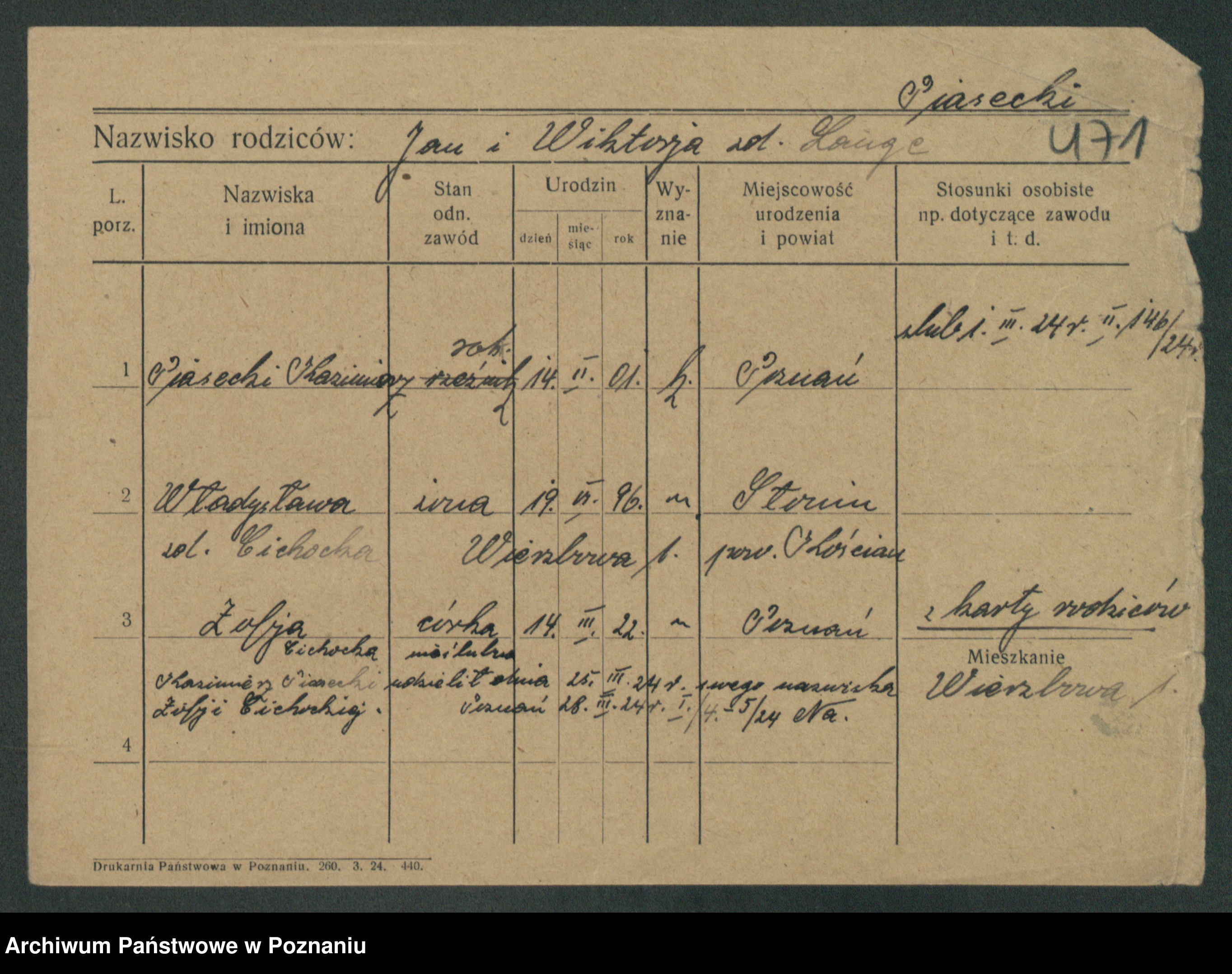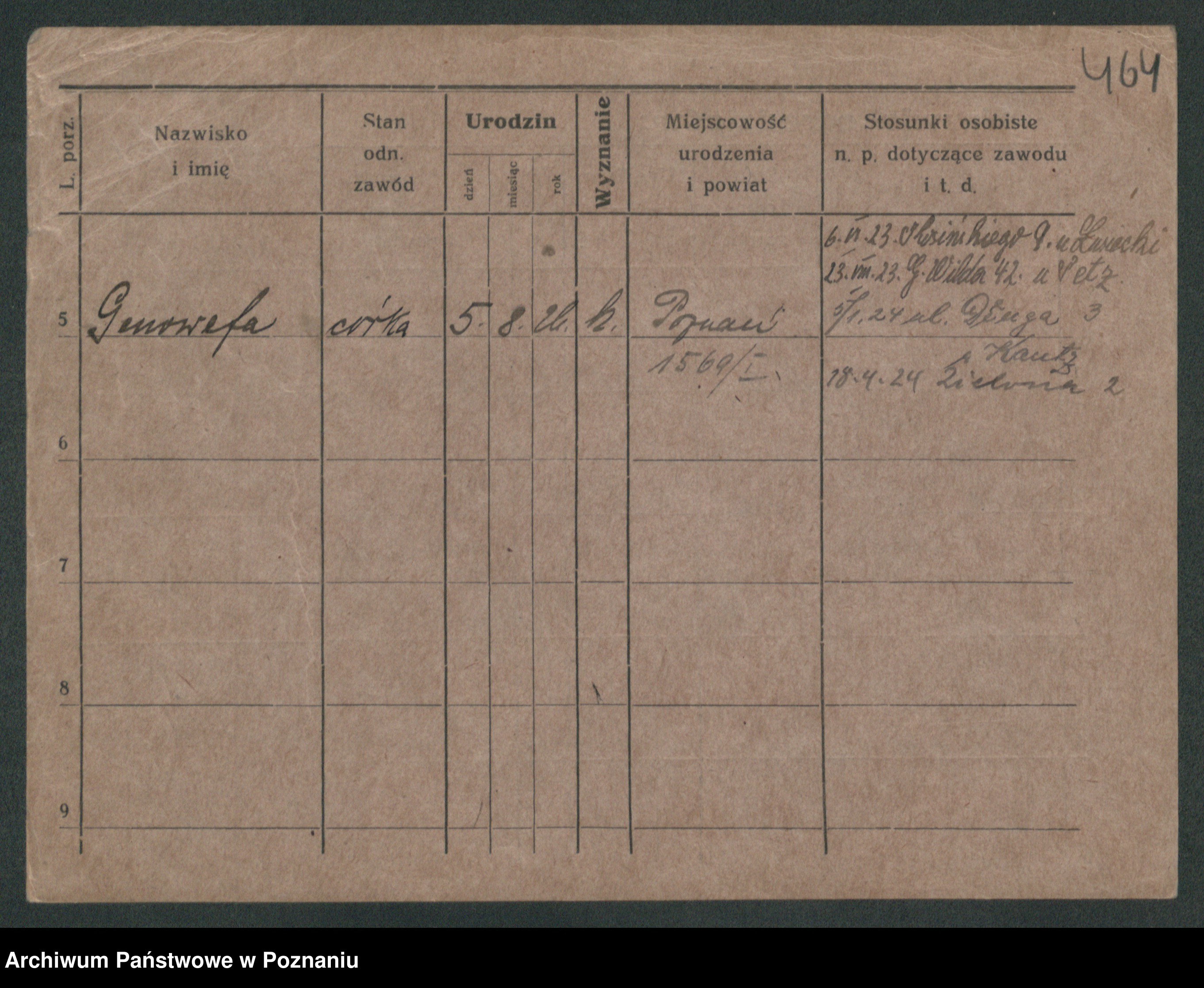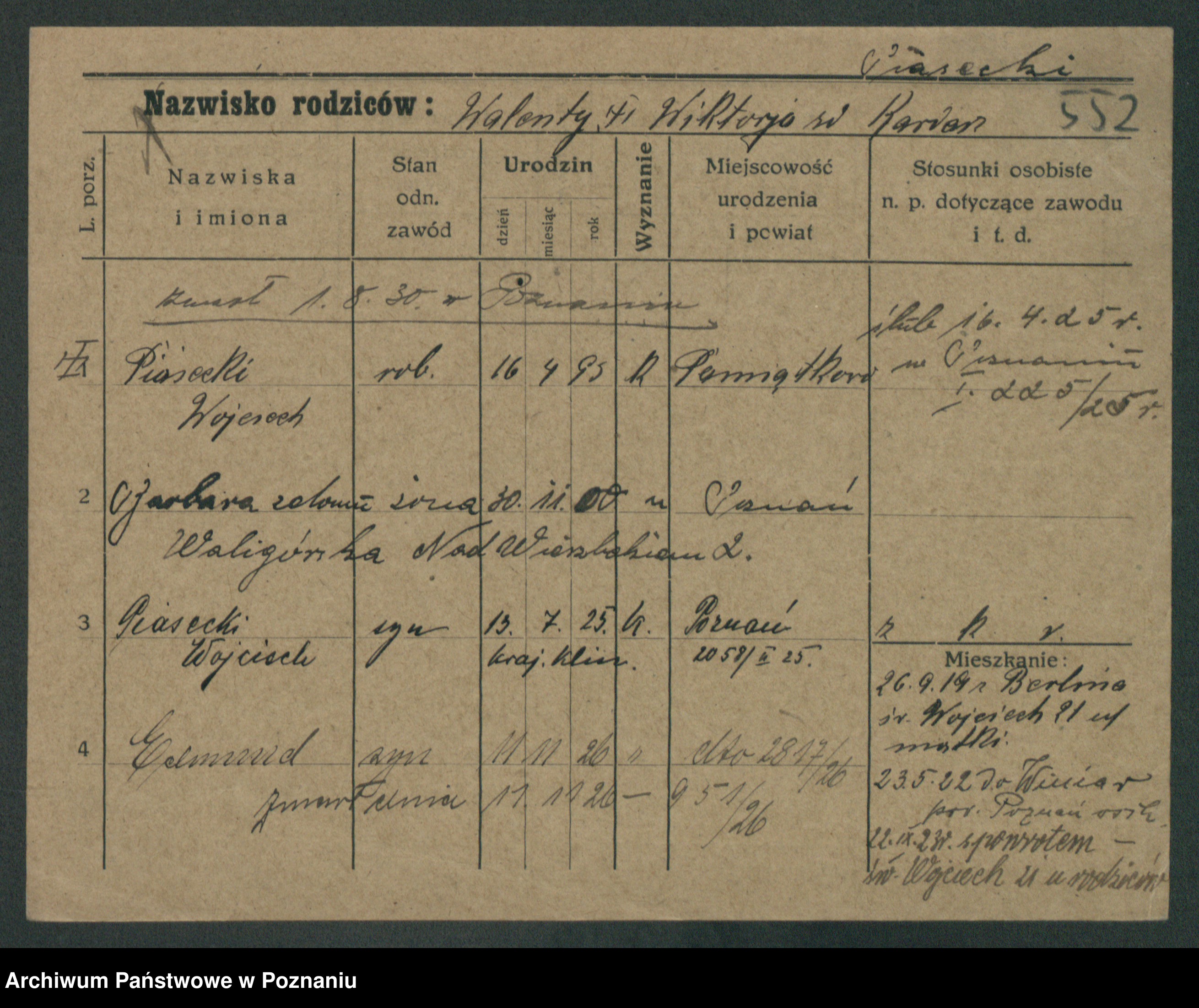 Podgląd karty osobowej dostępny jest po kliknięciu na nazwisko lub ikonkę karty. Można dokonywać powiększenia (ikony na górze) lub przechodzić między kolejnymi skanami (strzałki po bokach).