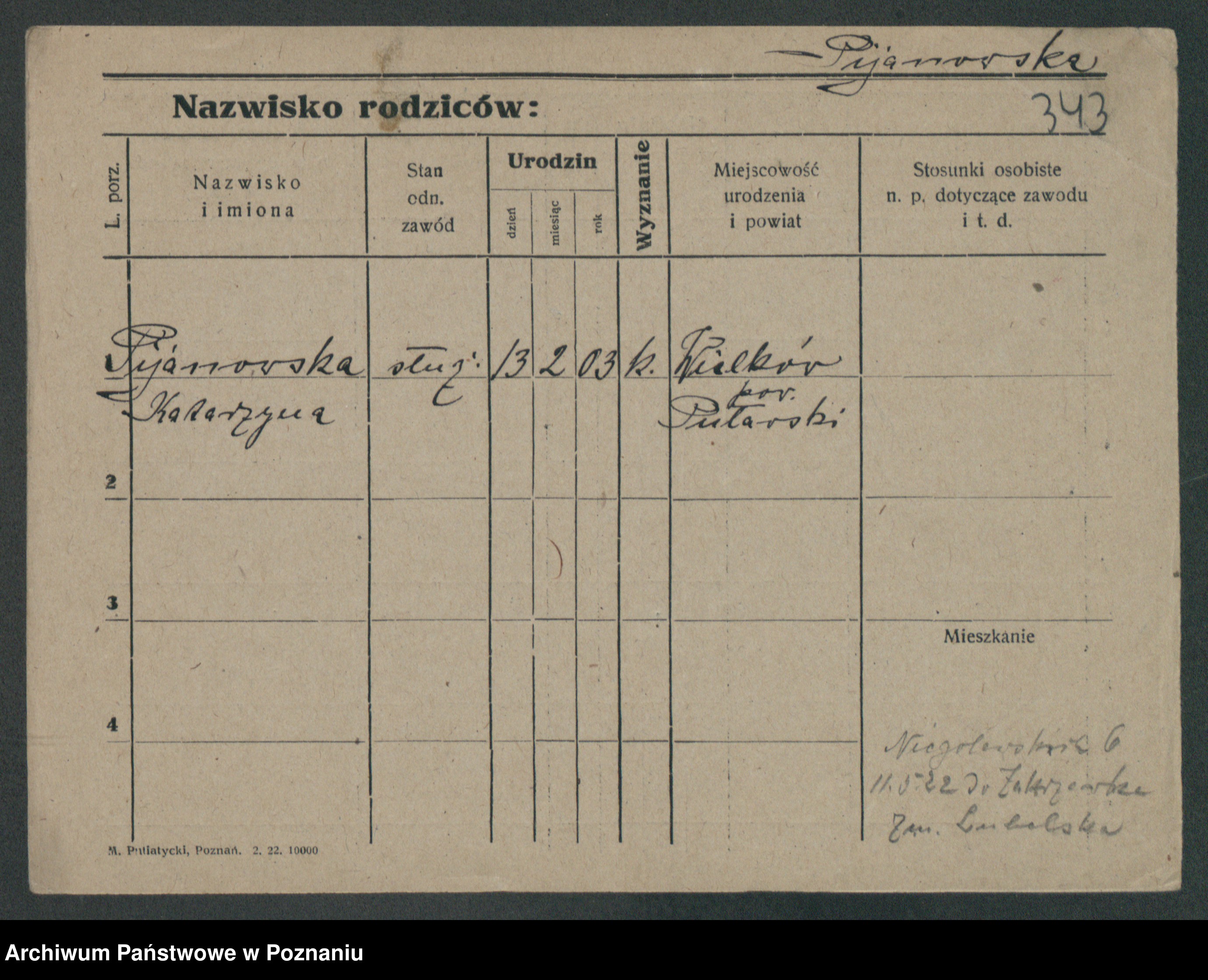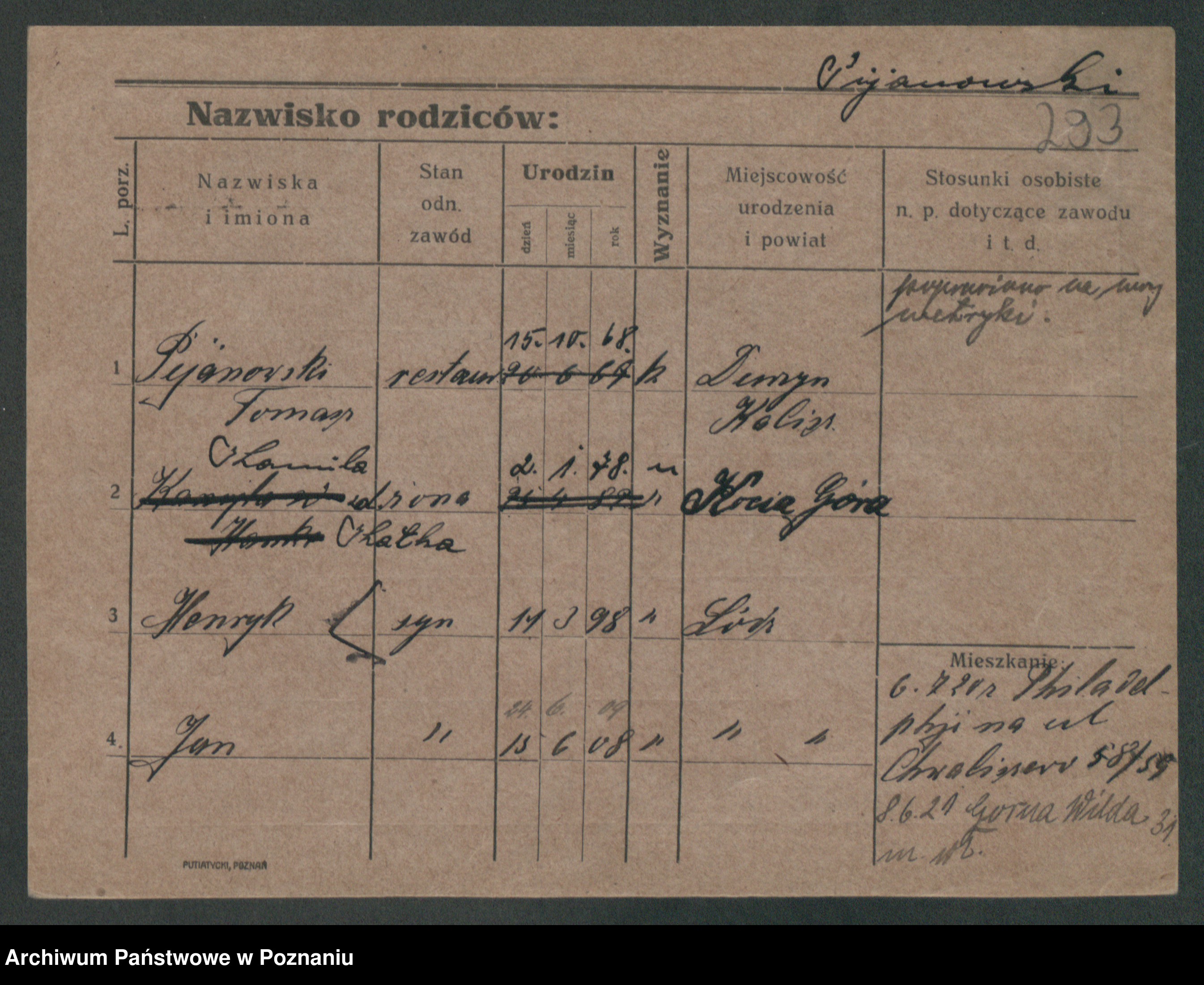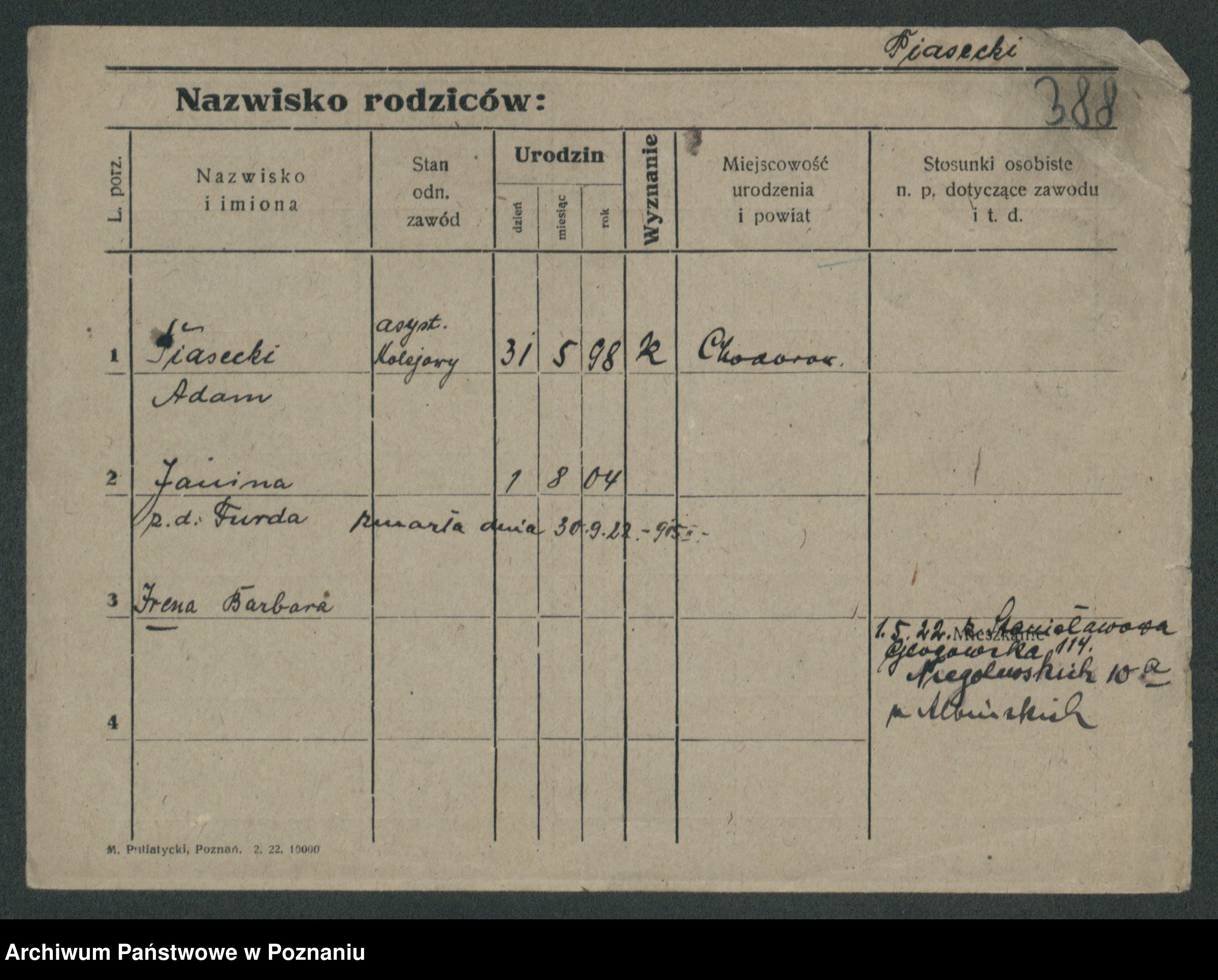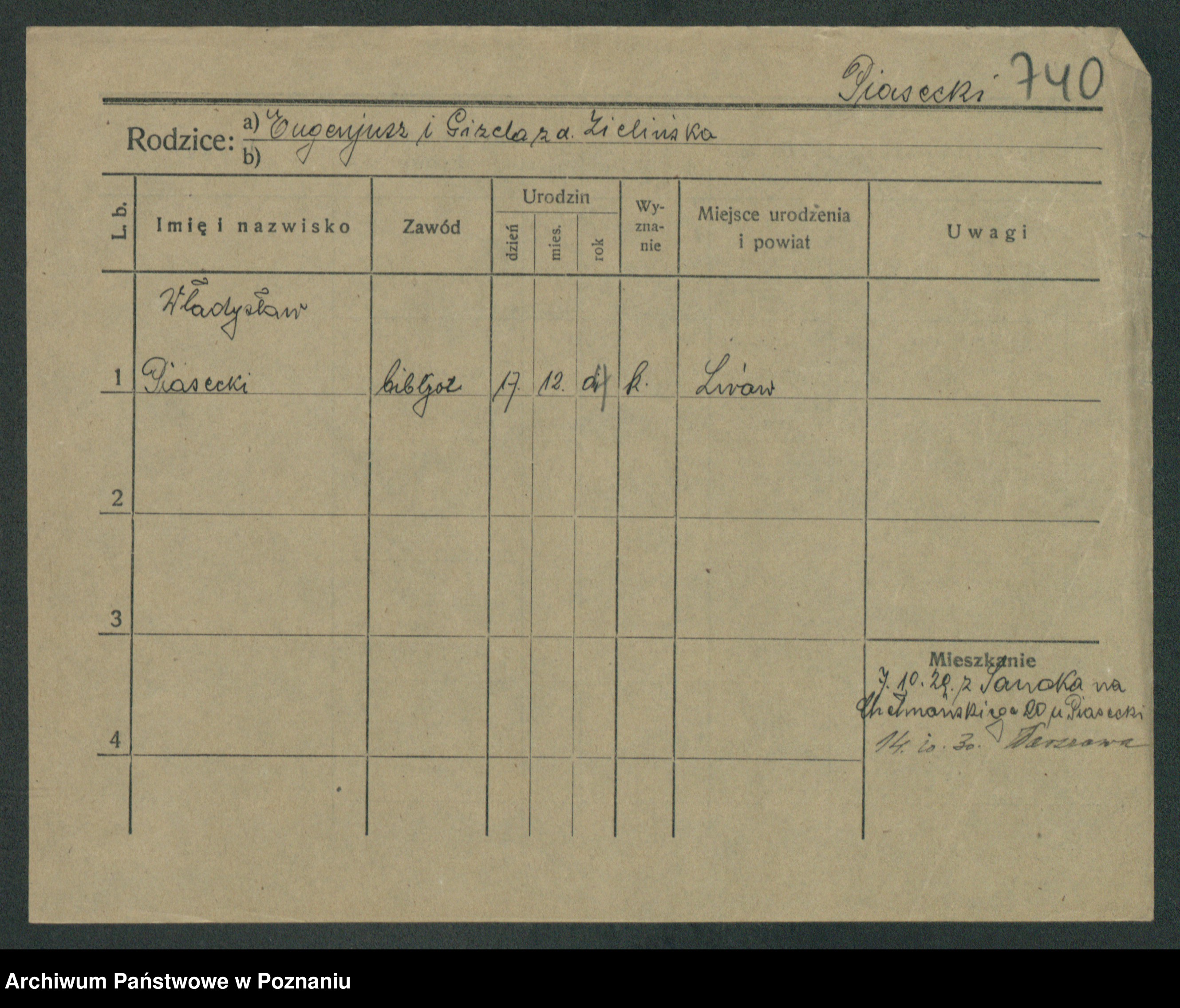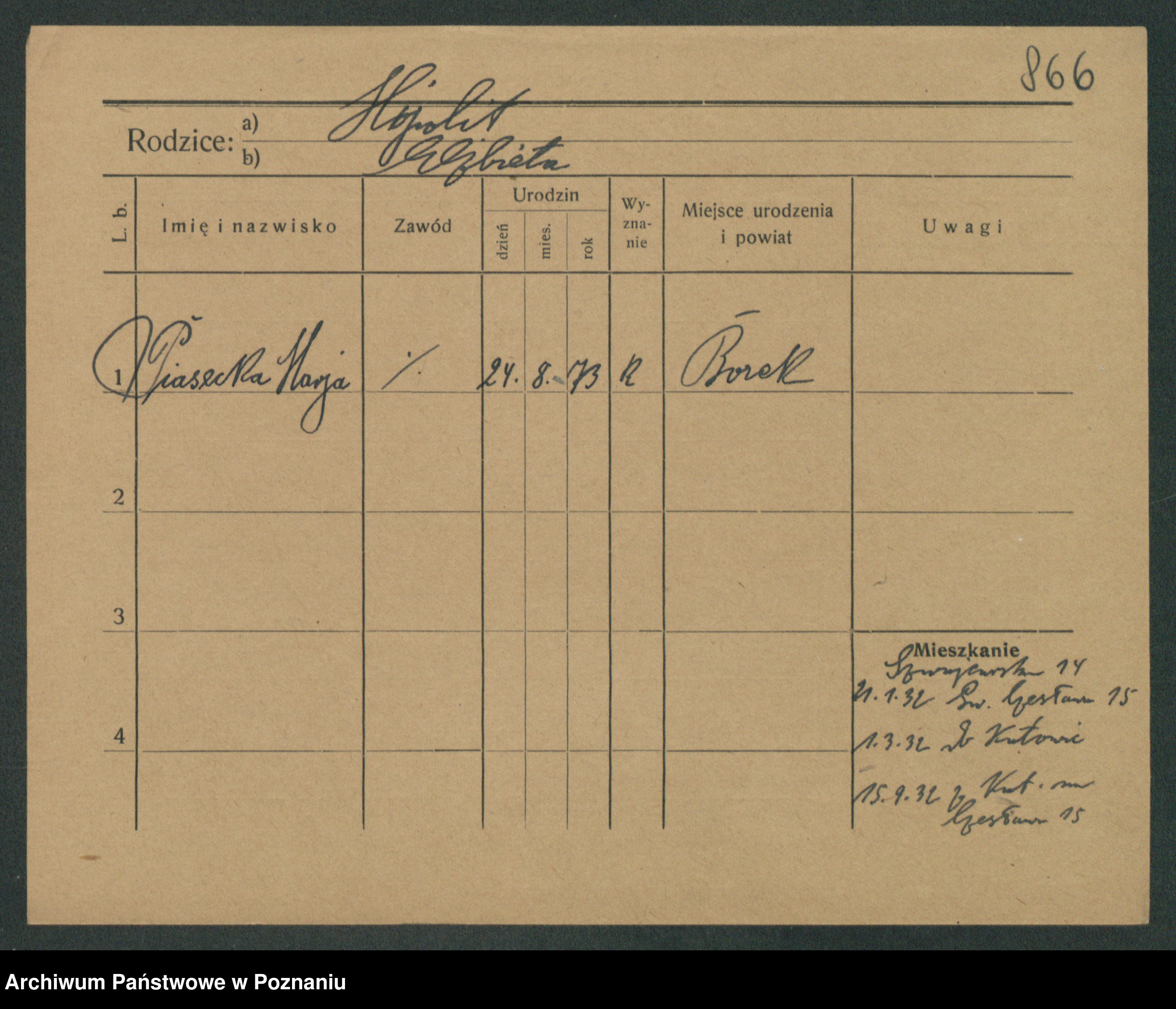Podgląd karty osobowej dostępny jest po kliknięciu na nazwisko lub ikonkę karty. Można dokonywać powiększenia (ikony na górze) lub przechodzić między kolejnymi skanami (strzałki po bokach).