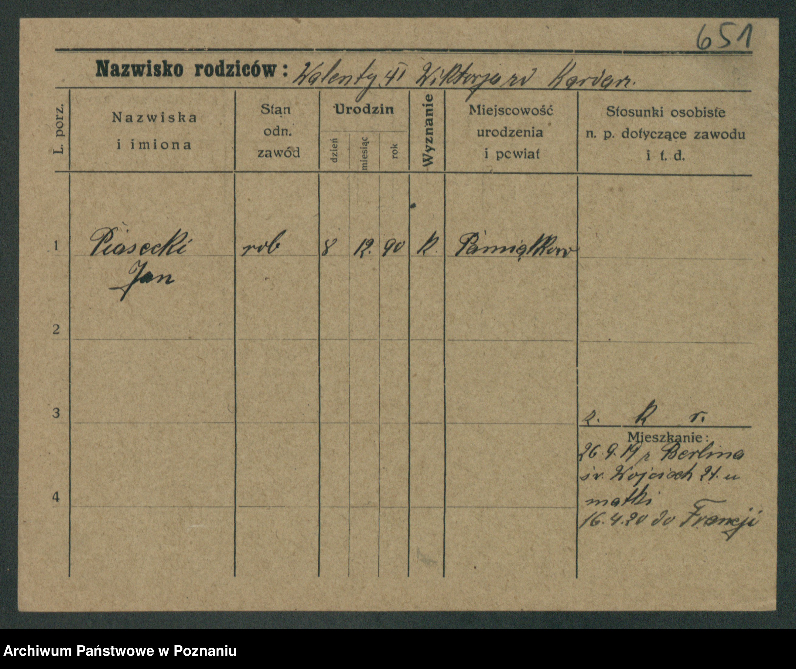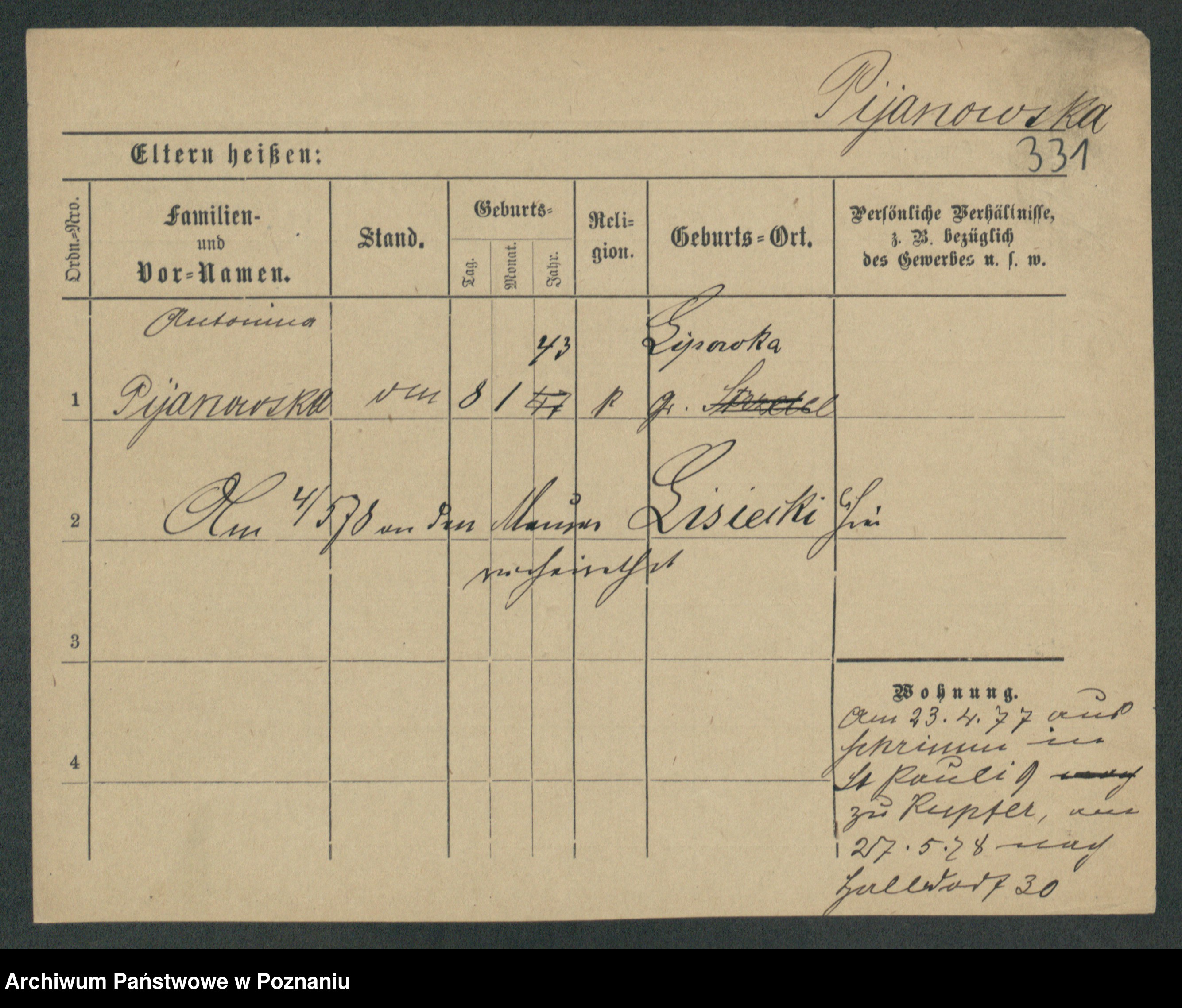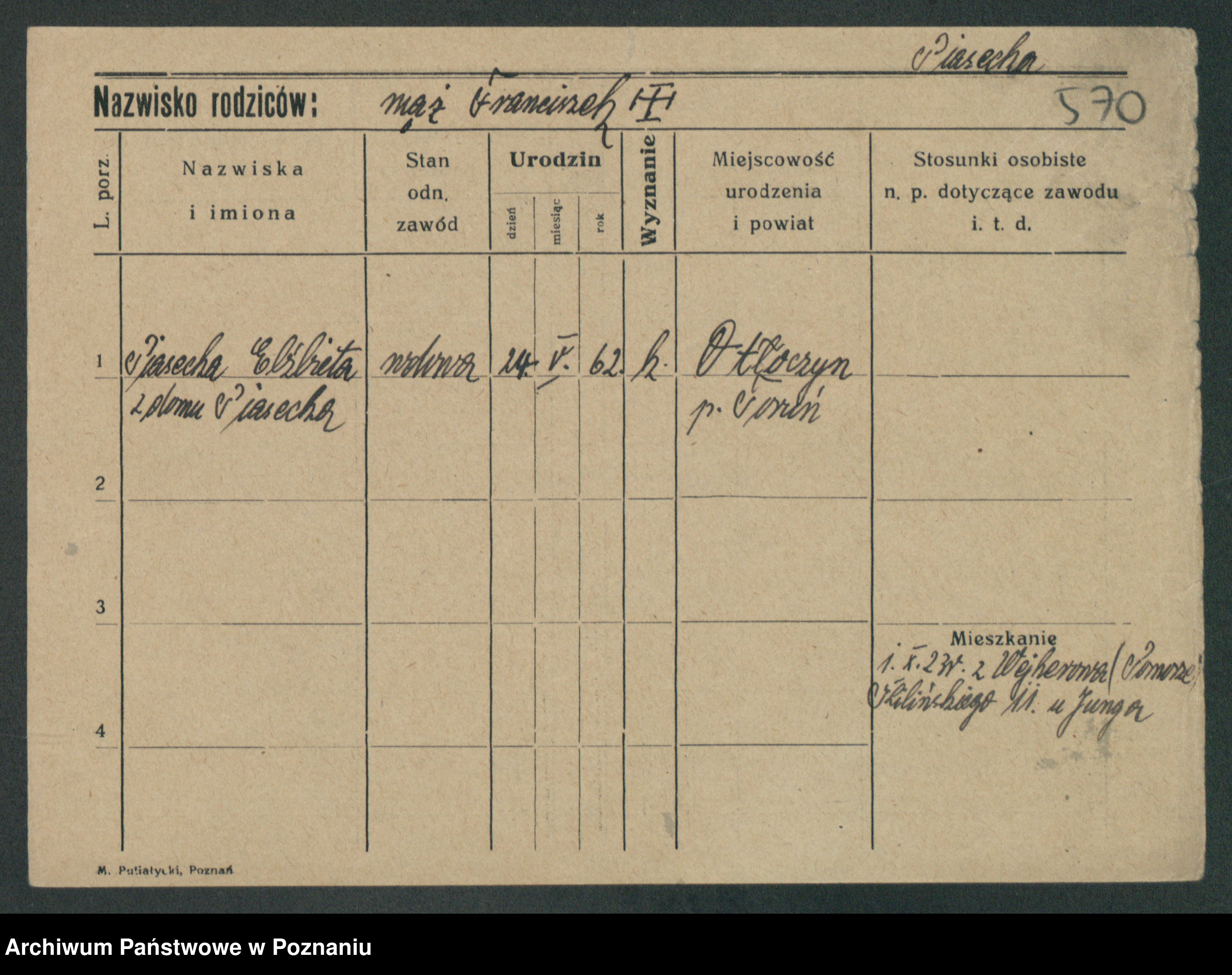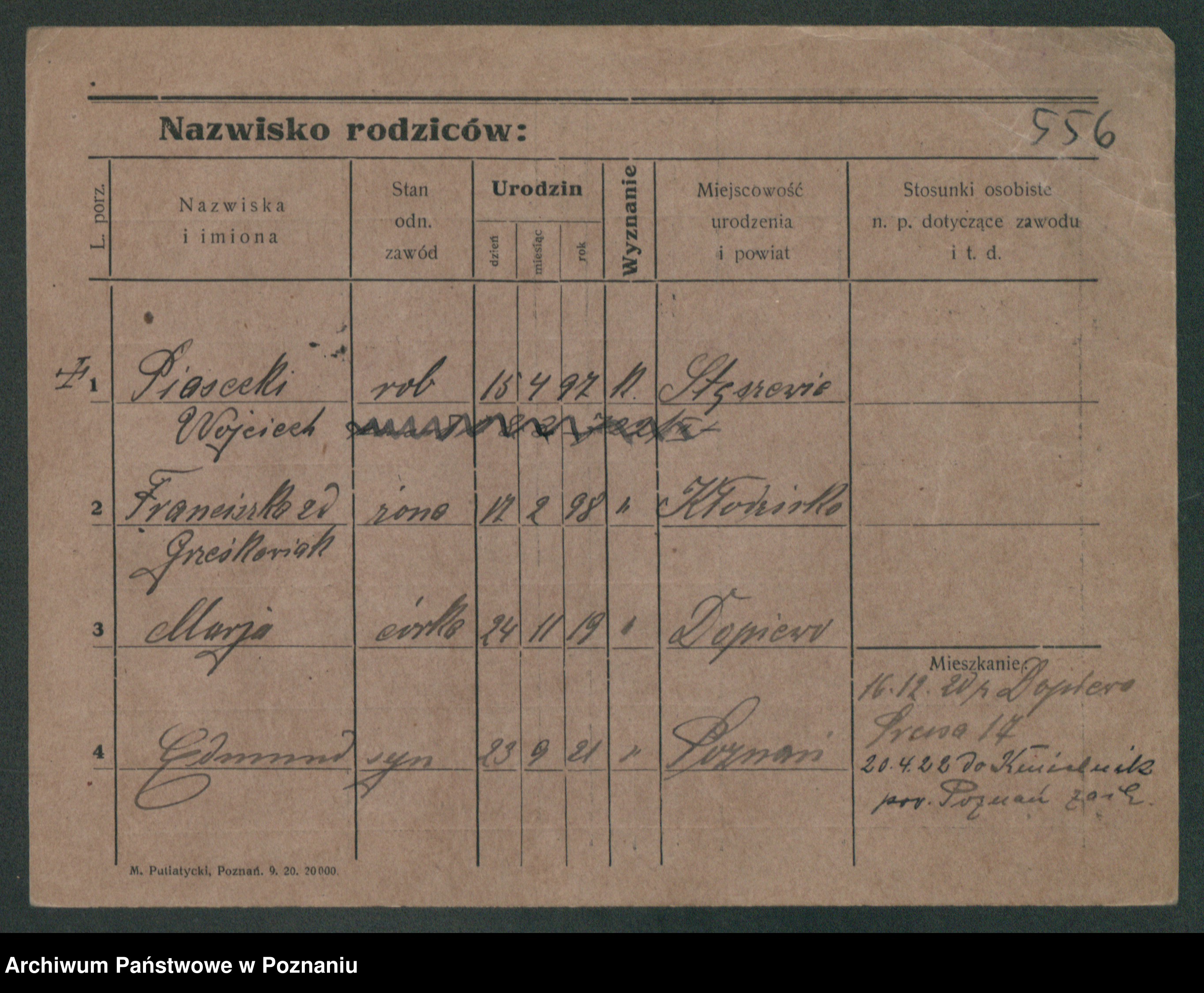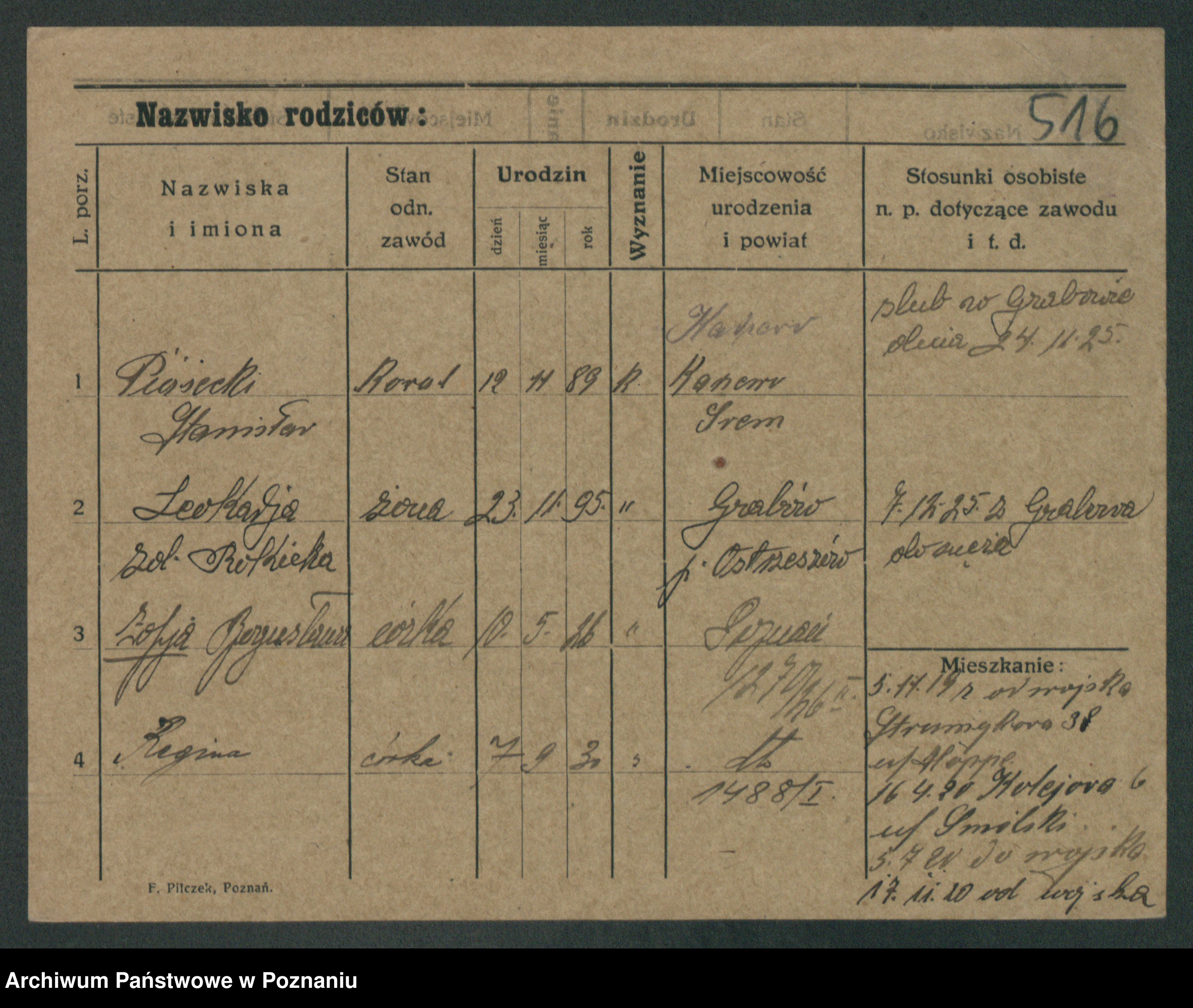 Podgląd karty osobowej dostępny jest po kliknięciu na nazwisko lub ikonkę karty. Można dokonywać powiększenia (ikony na górze) lub przechodzić między kolejnymi skanami (strzałki po bokach).