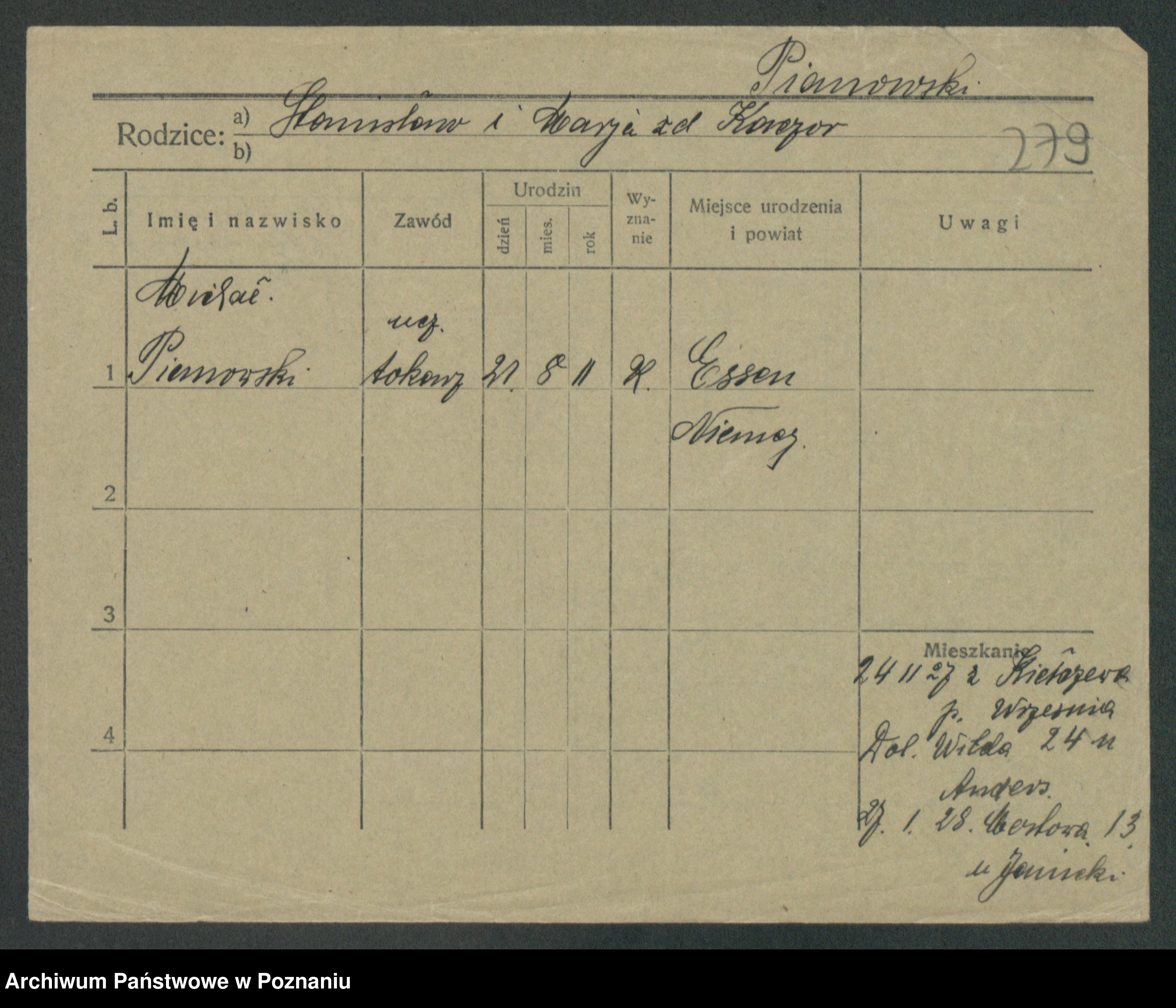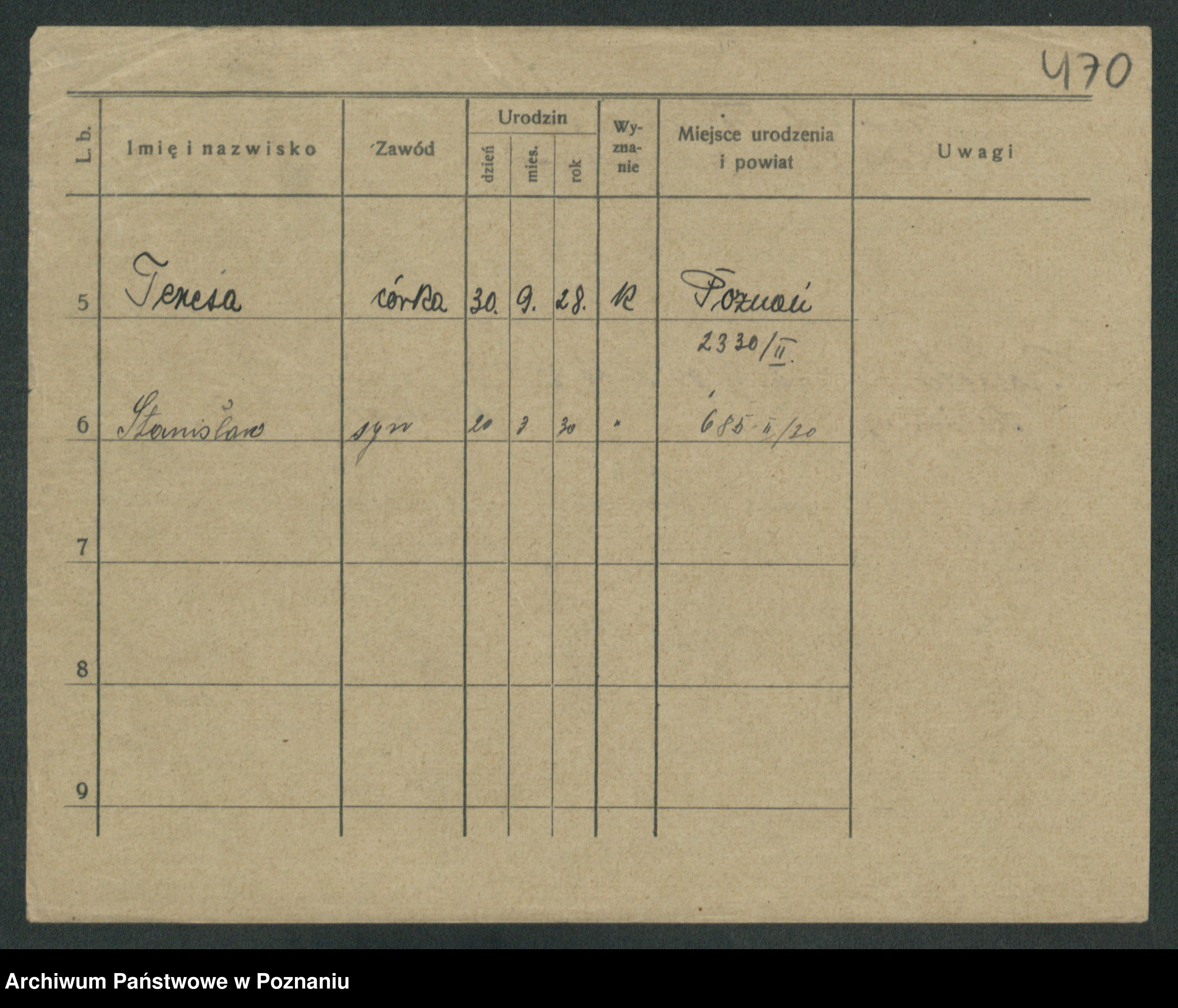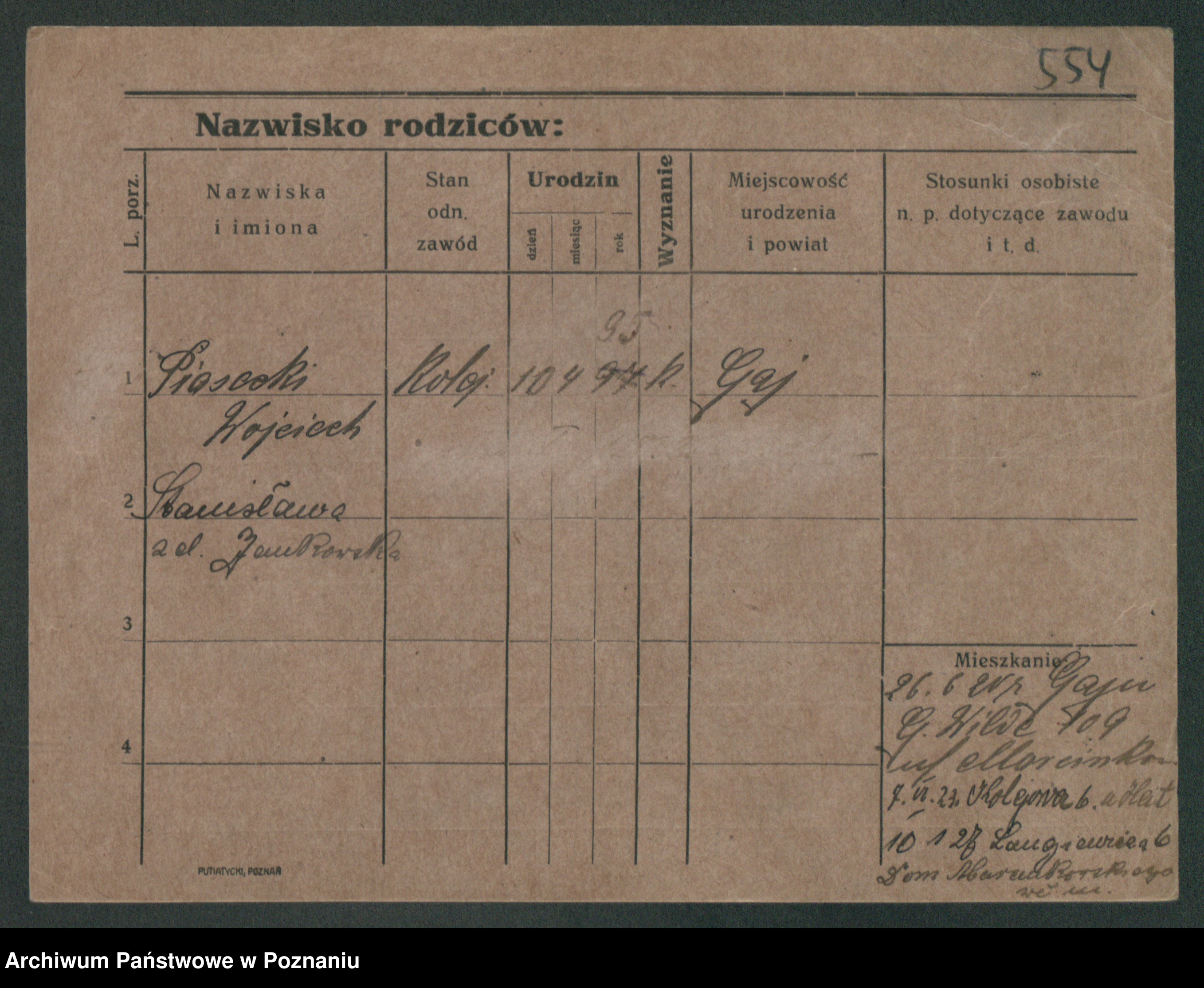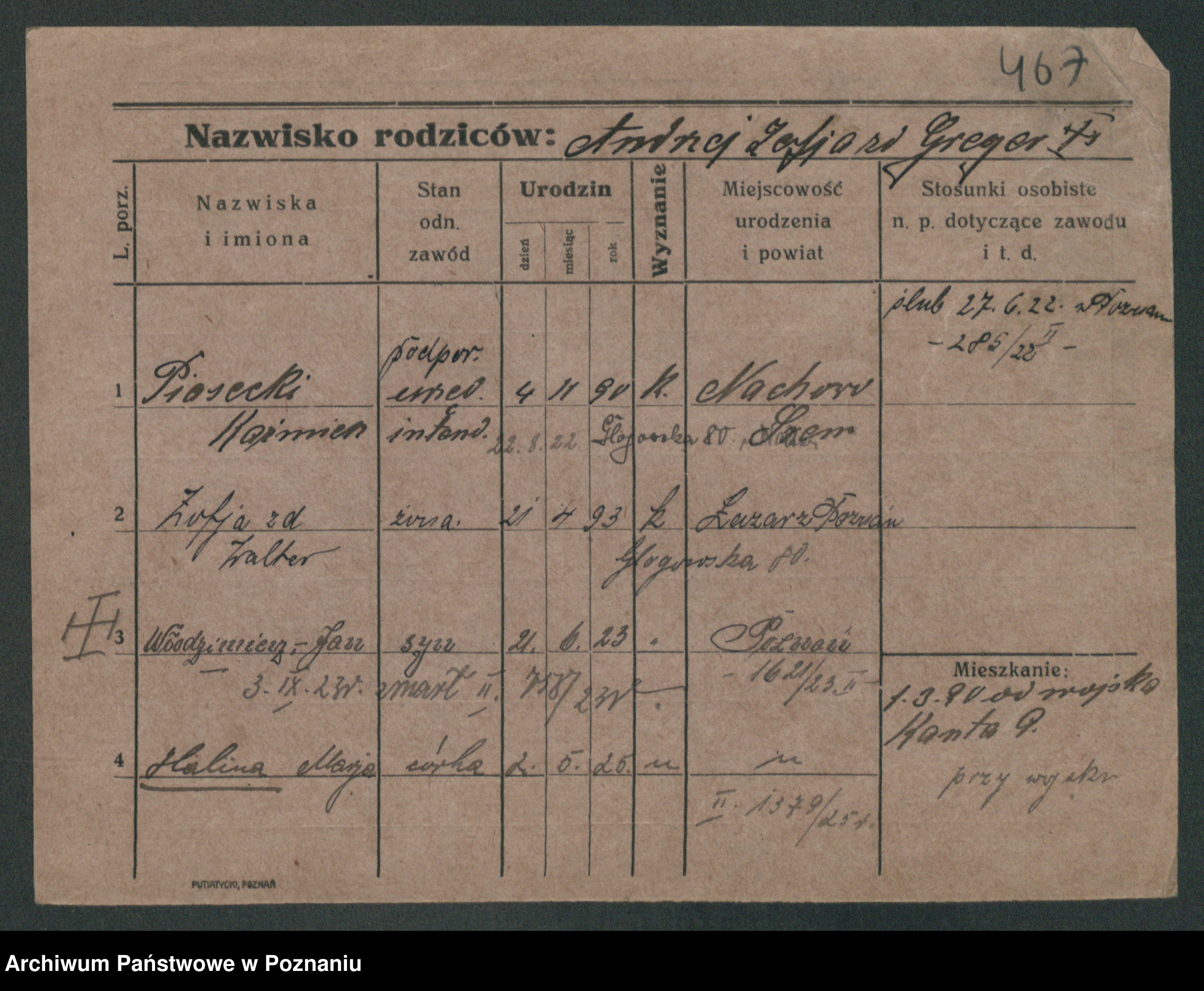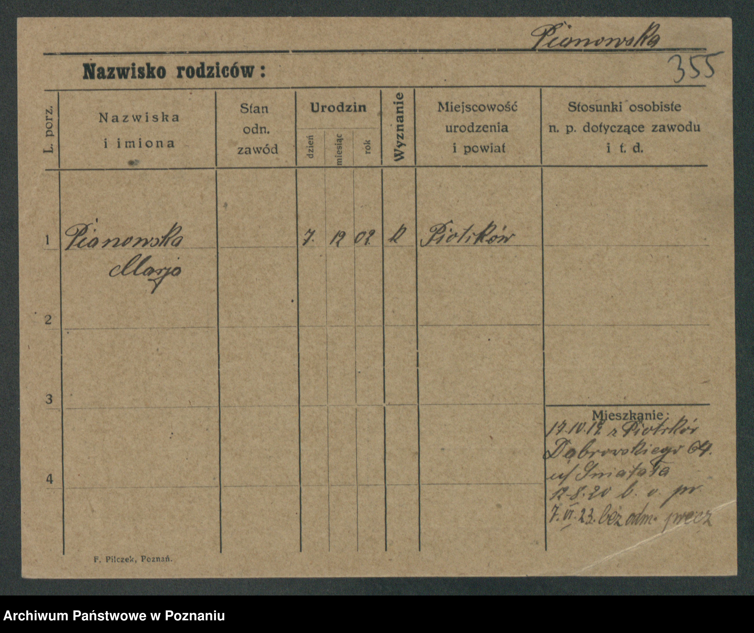 Podgląd karty osobowej dostępny jest po kliknięciu na nazwisko lub ikonkę karty. Można dokonywać powiększenia (ikony na górze) lub przechodzić między kolejnymi skanami (strzałki po bokach).