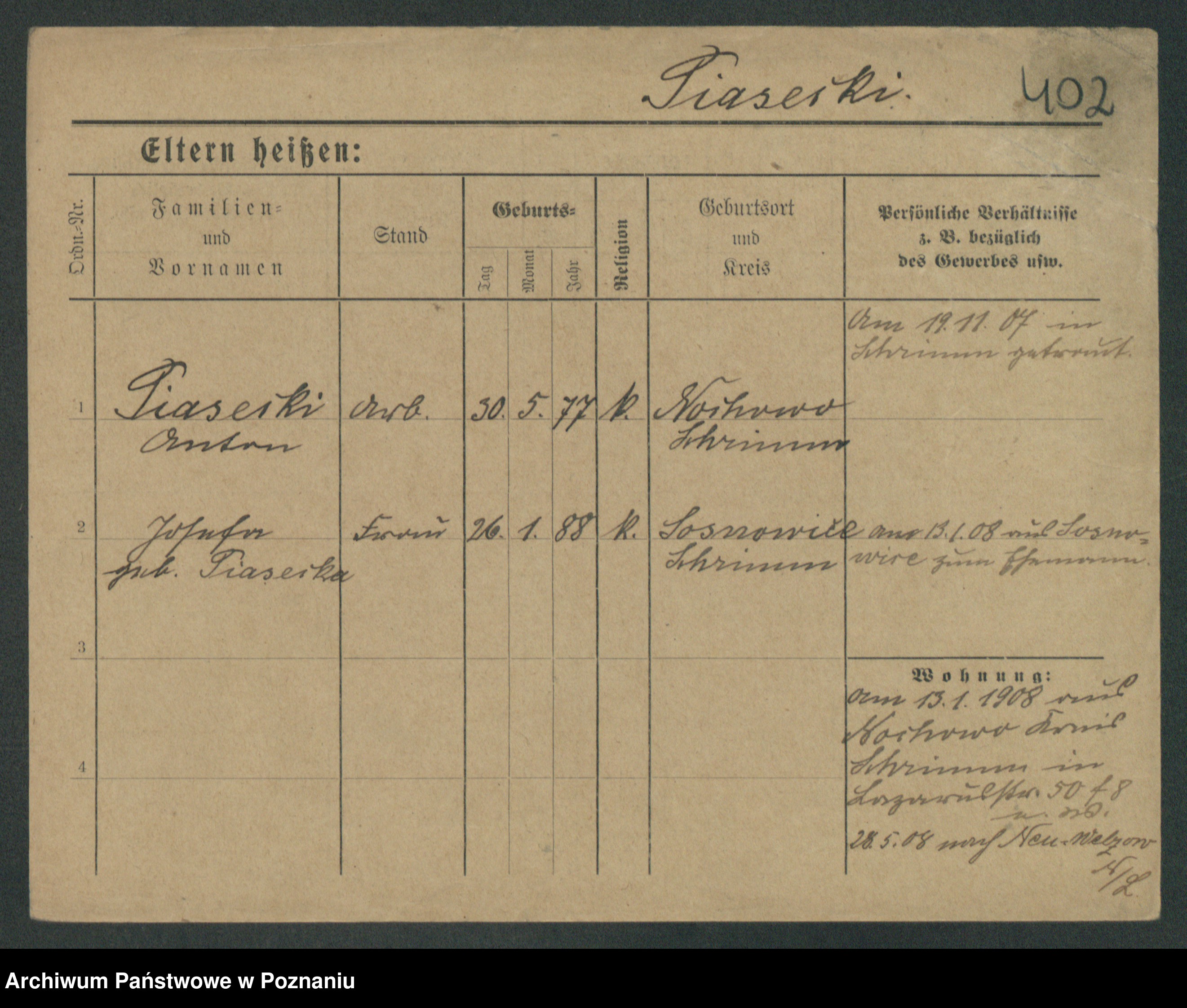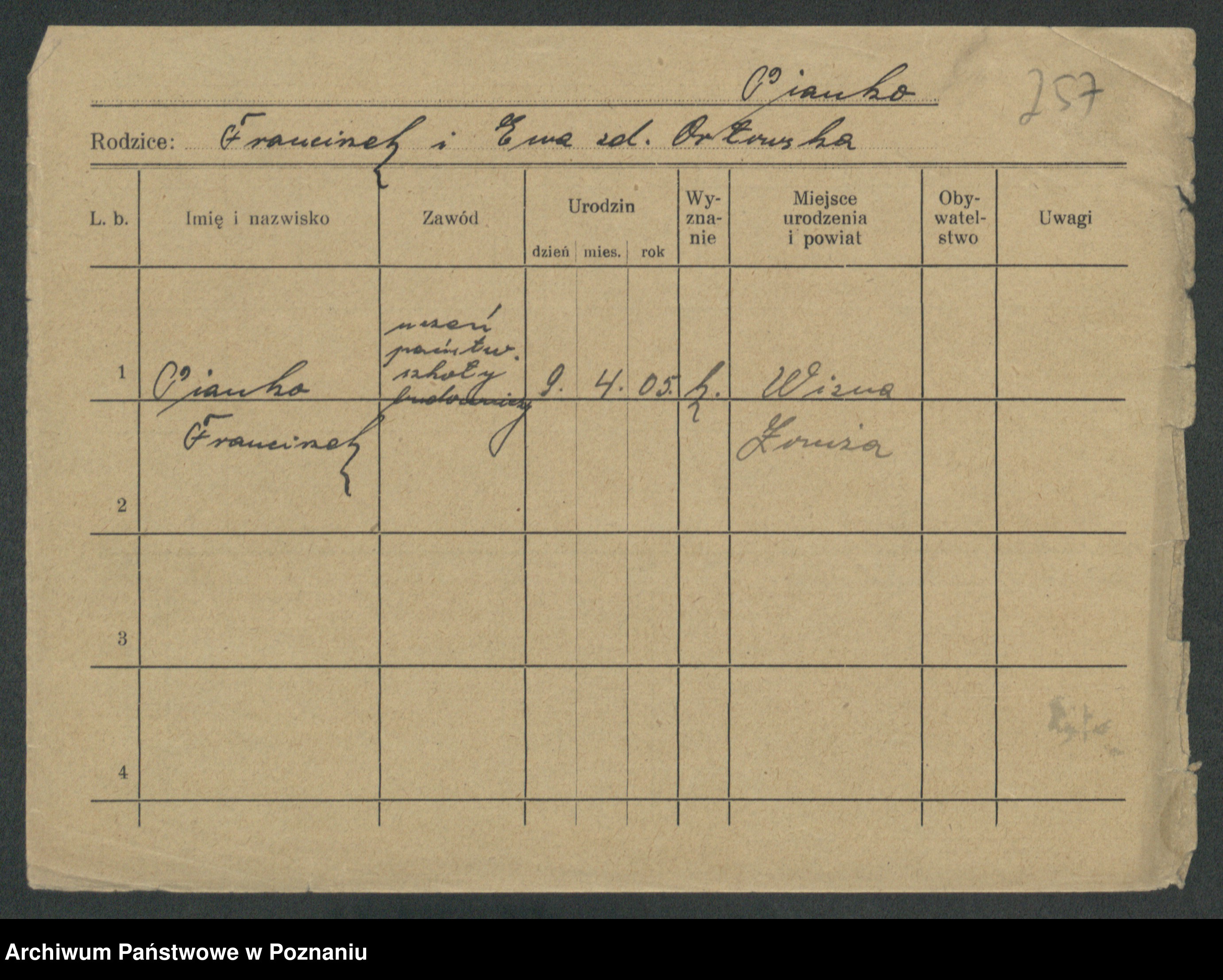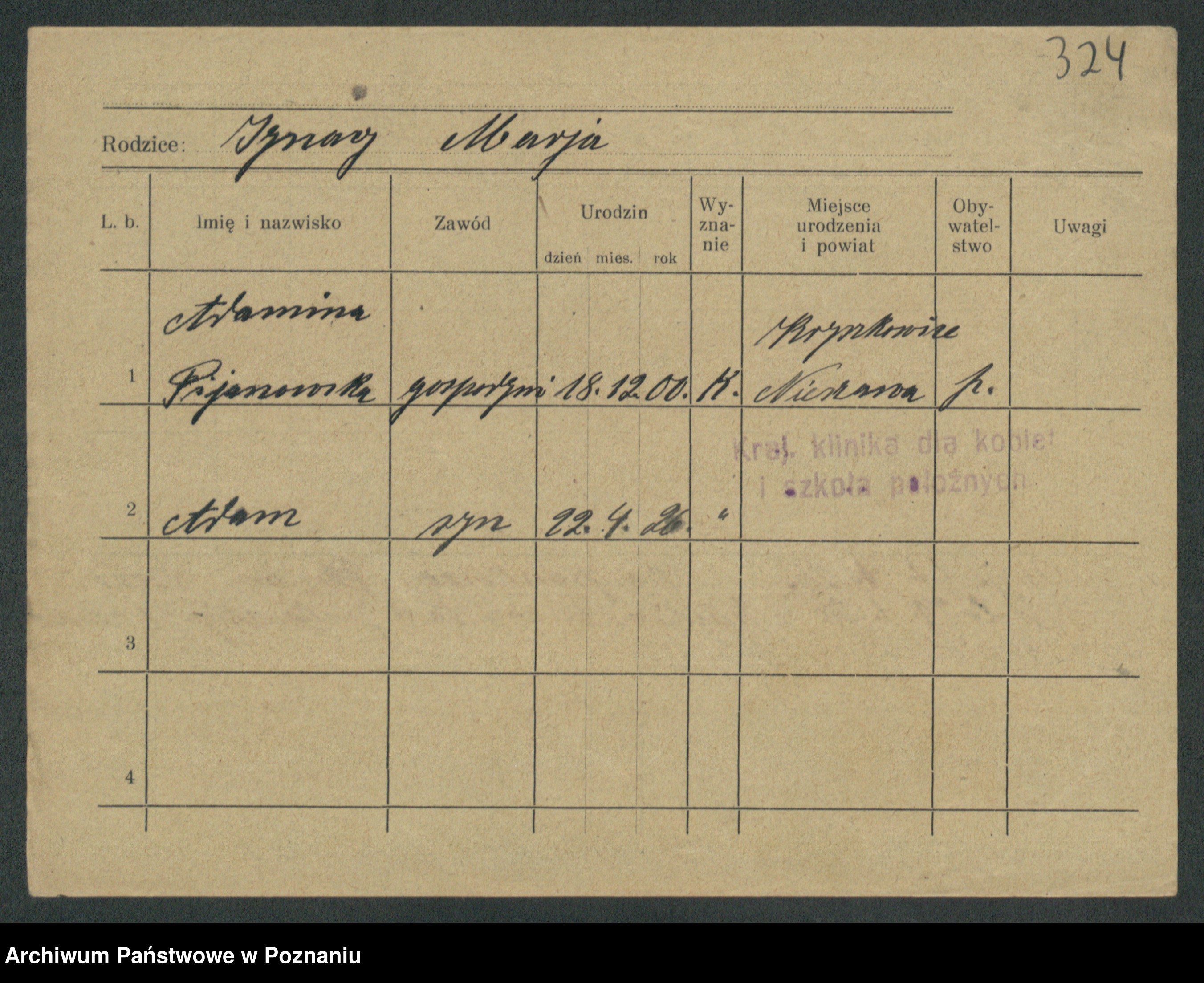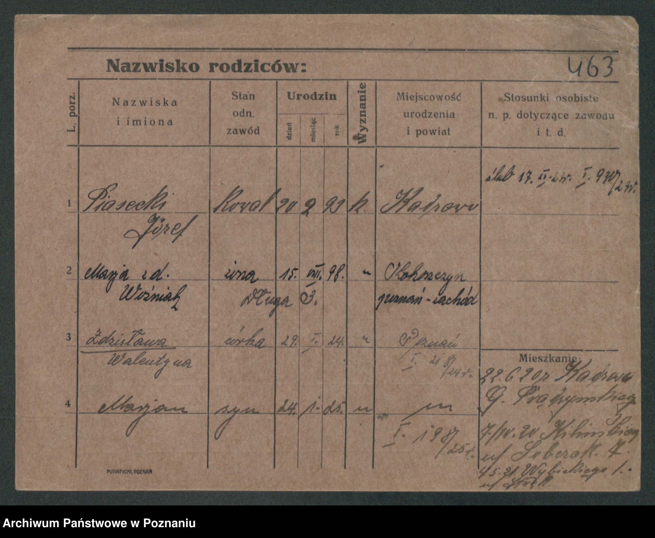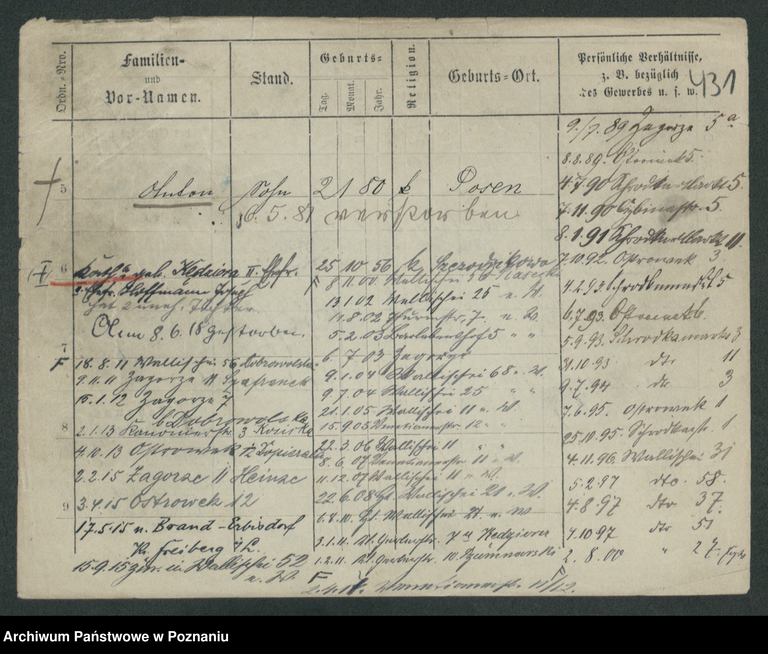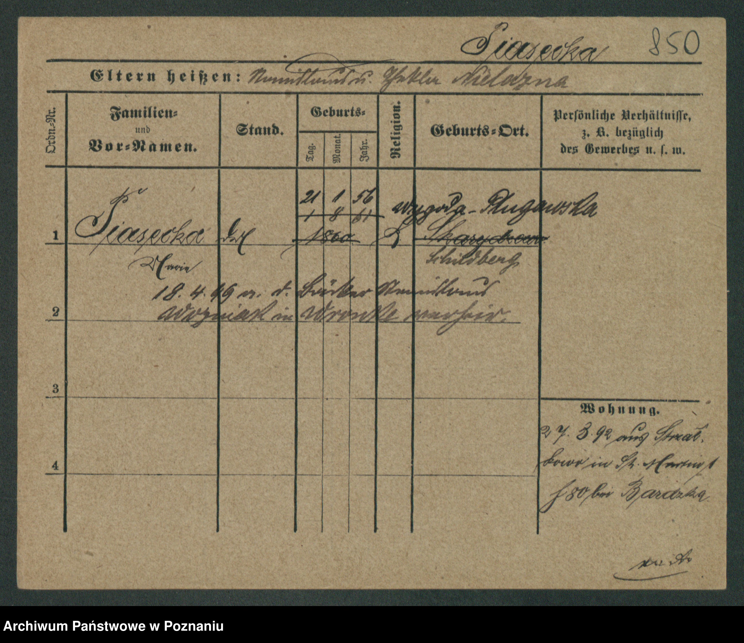 Podgląd karty osobowej dostępny jest po kliknięciu na nazwisko lub ikonkę karty. Można dokonywać powiększenia (ikony na górze) lub przechodzić między kolejnymi skanami (strzałki po bokach).