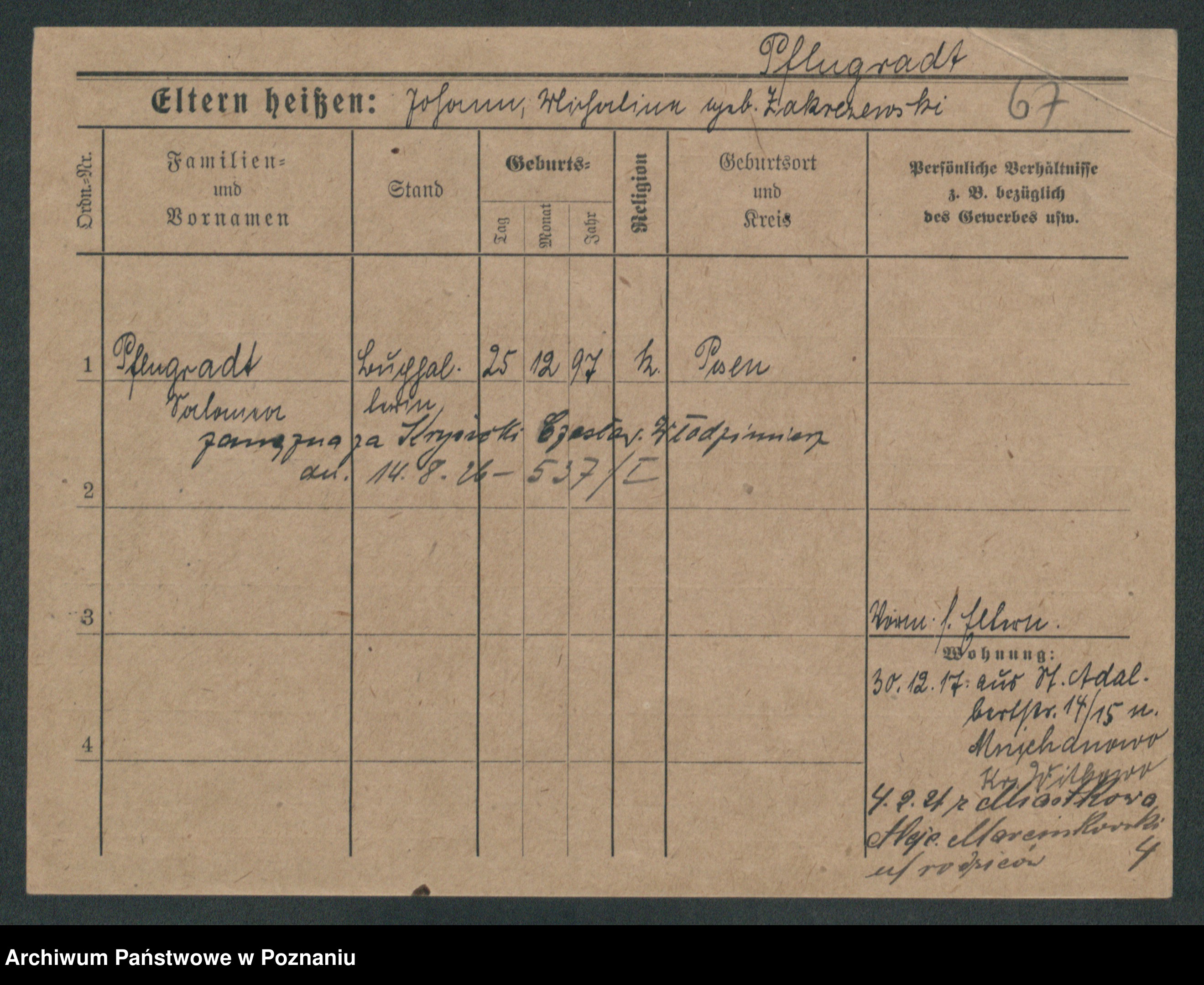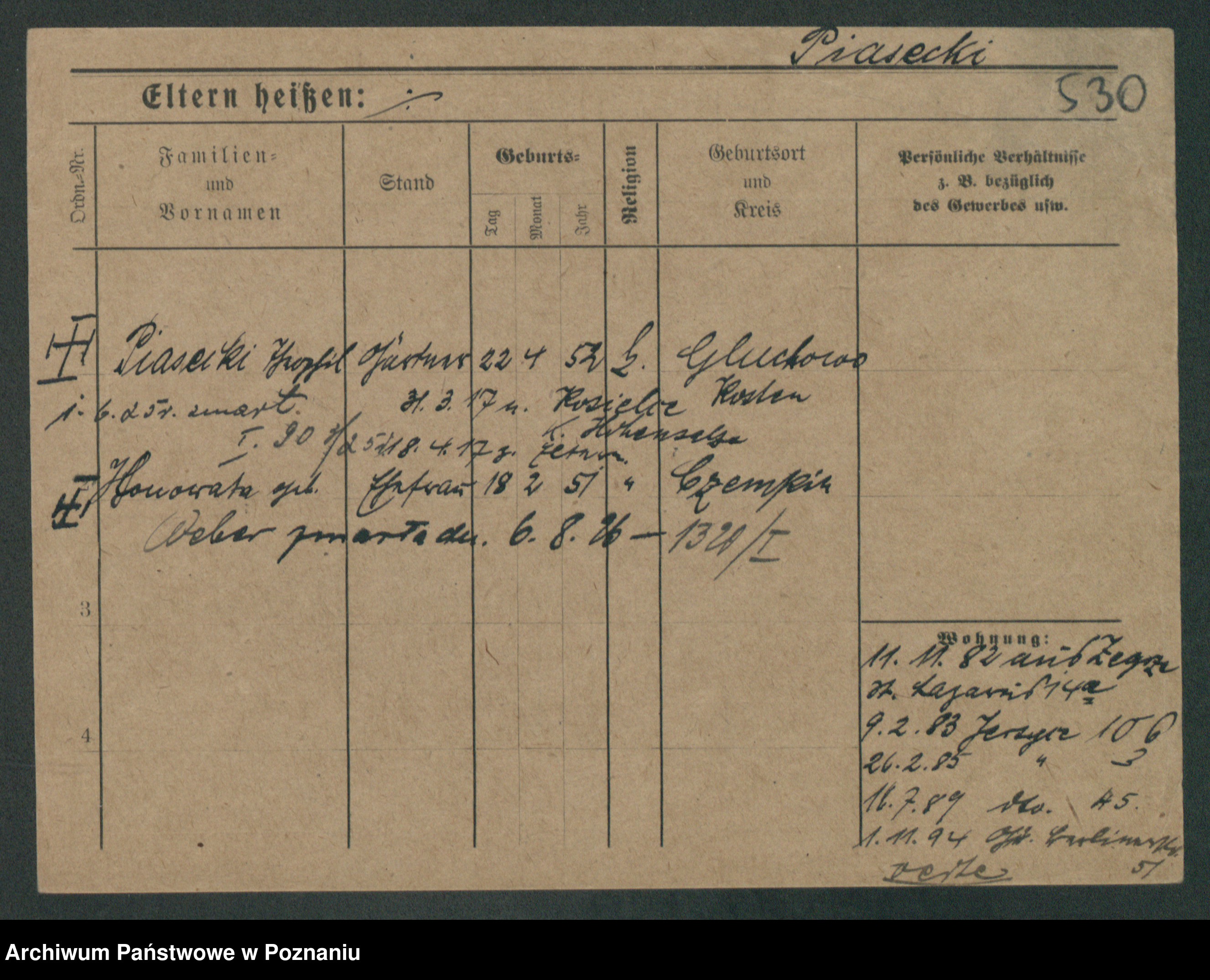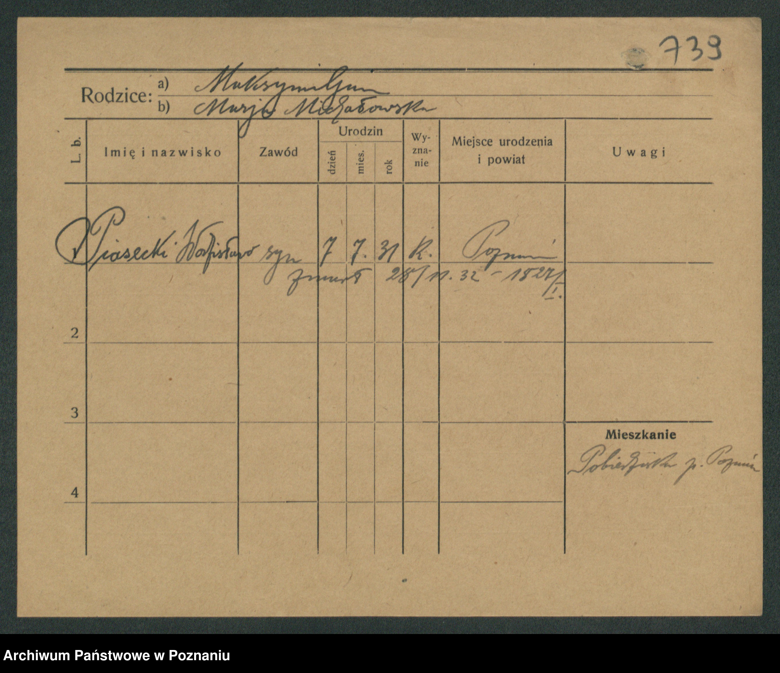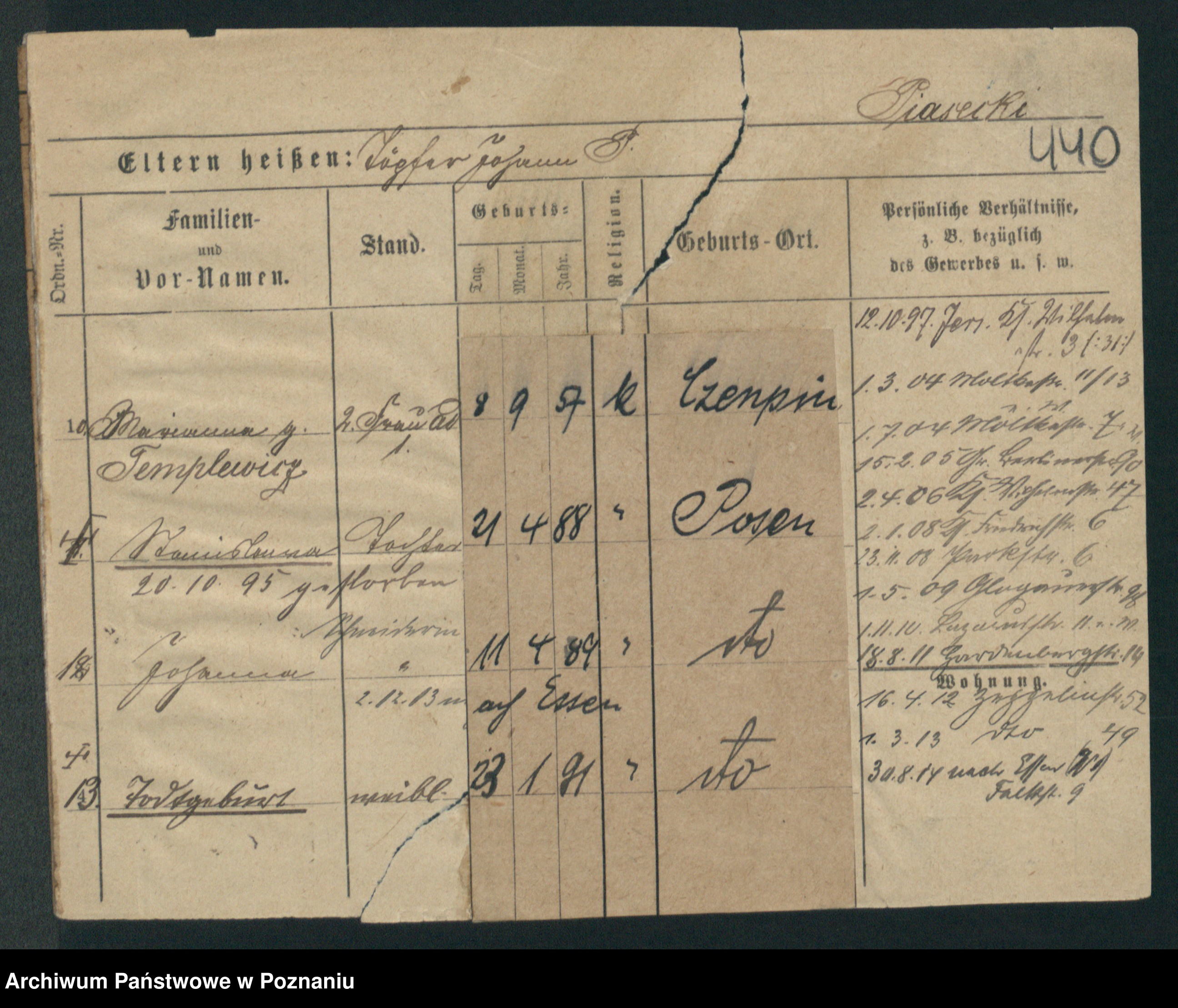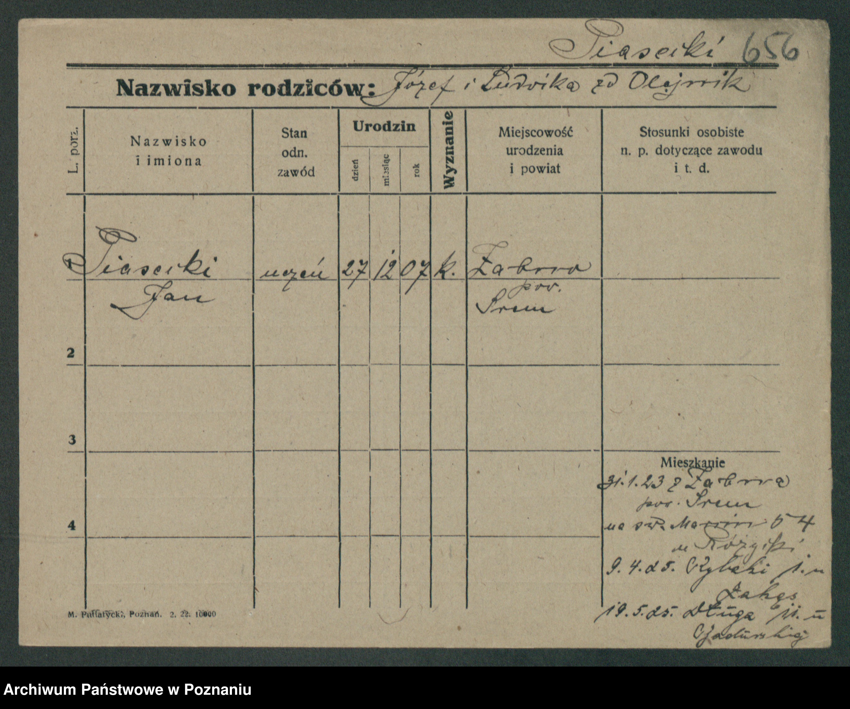Podgląd karty osobowej dostępny jest po kliknięciu na nazwisko lub ikonkę karty. Można dokonywać powiększenia (ikony na górze) lub przechodzić między kolejnymi skanami (strzałki po bokach).