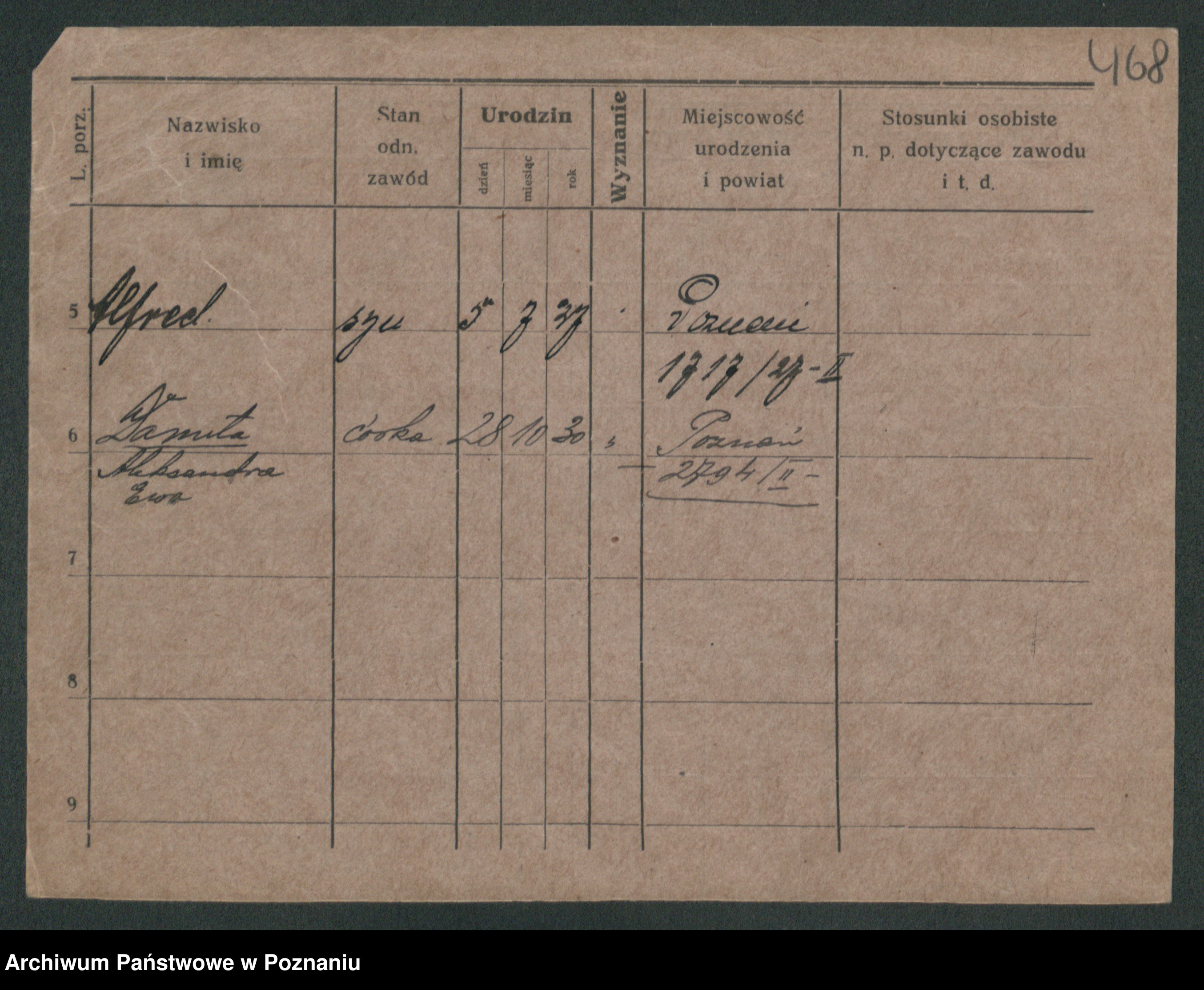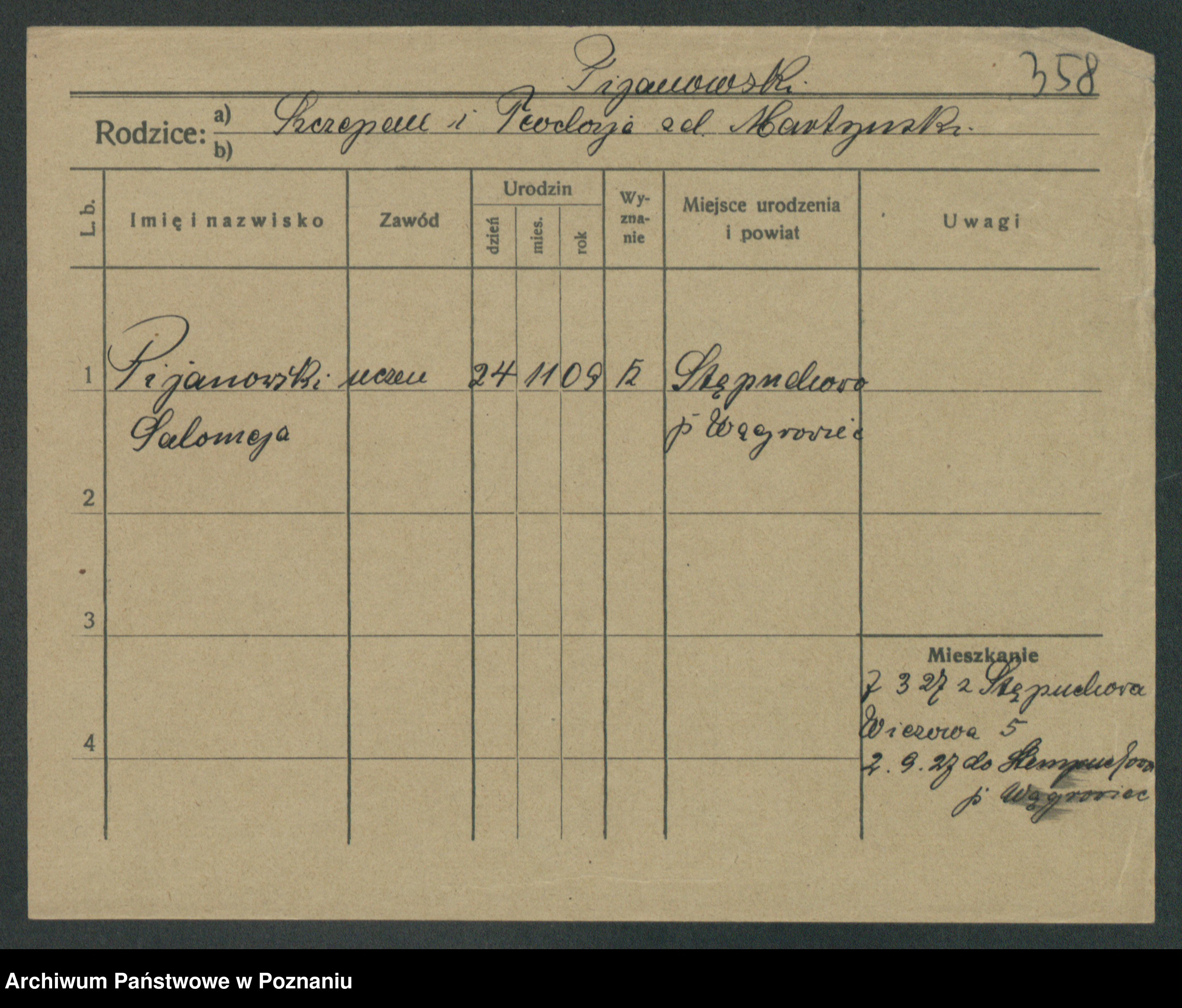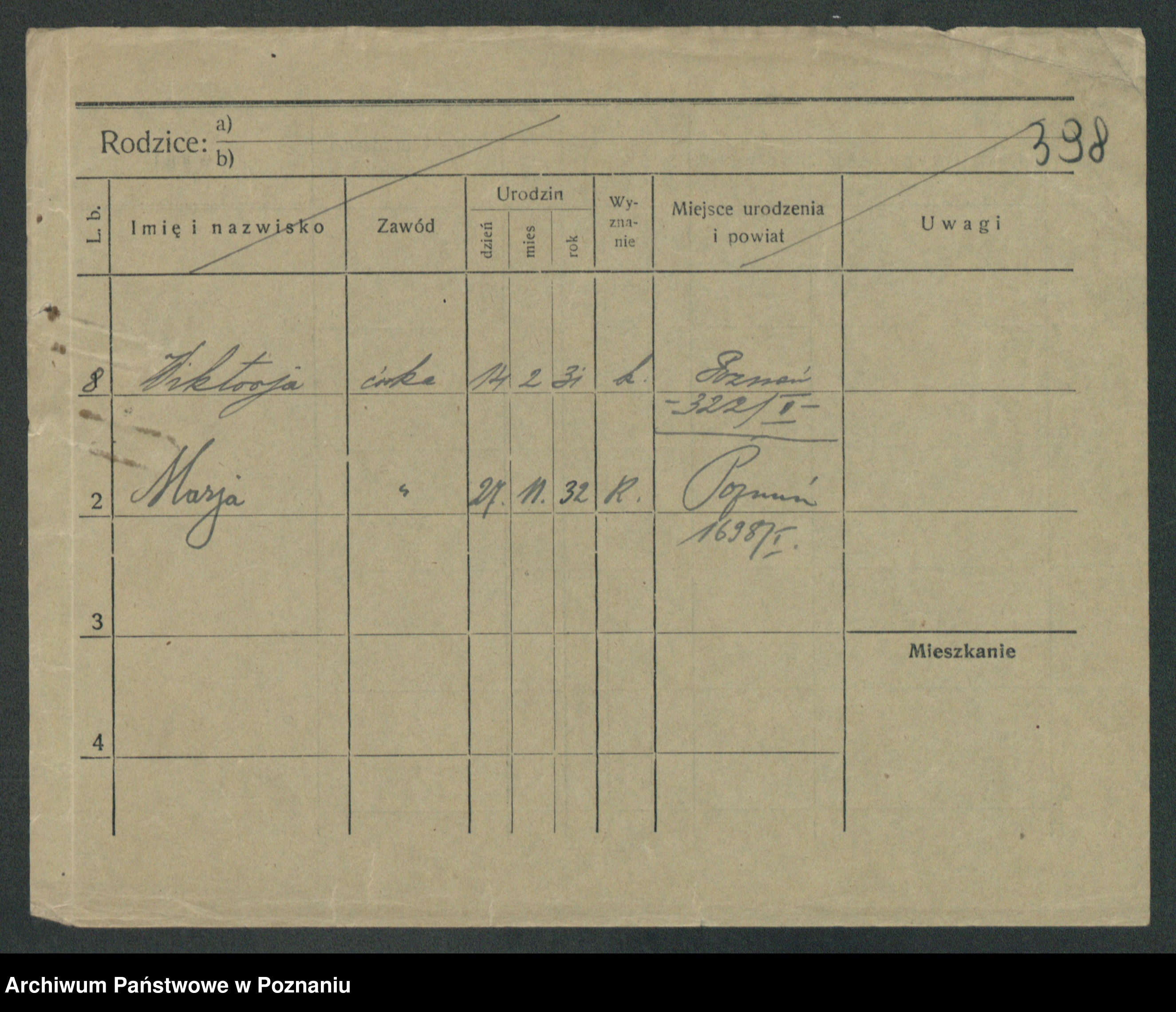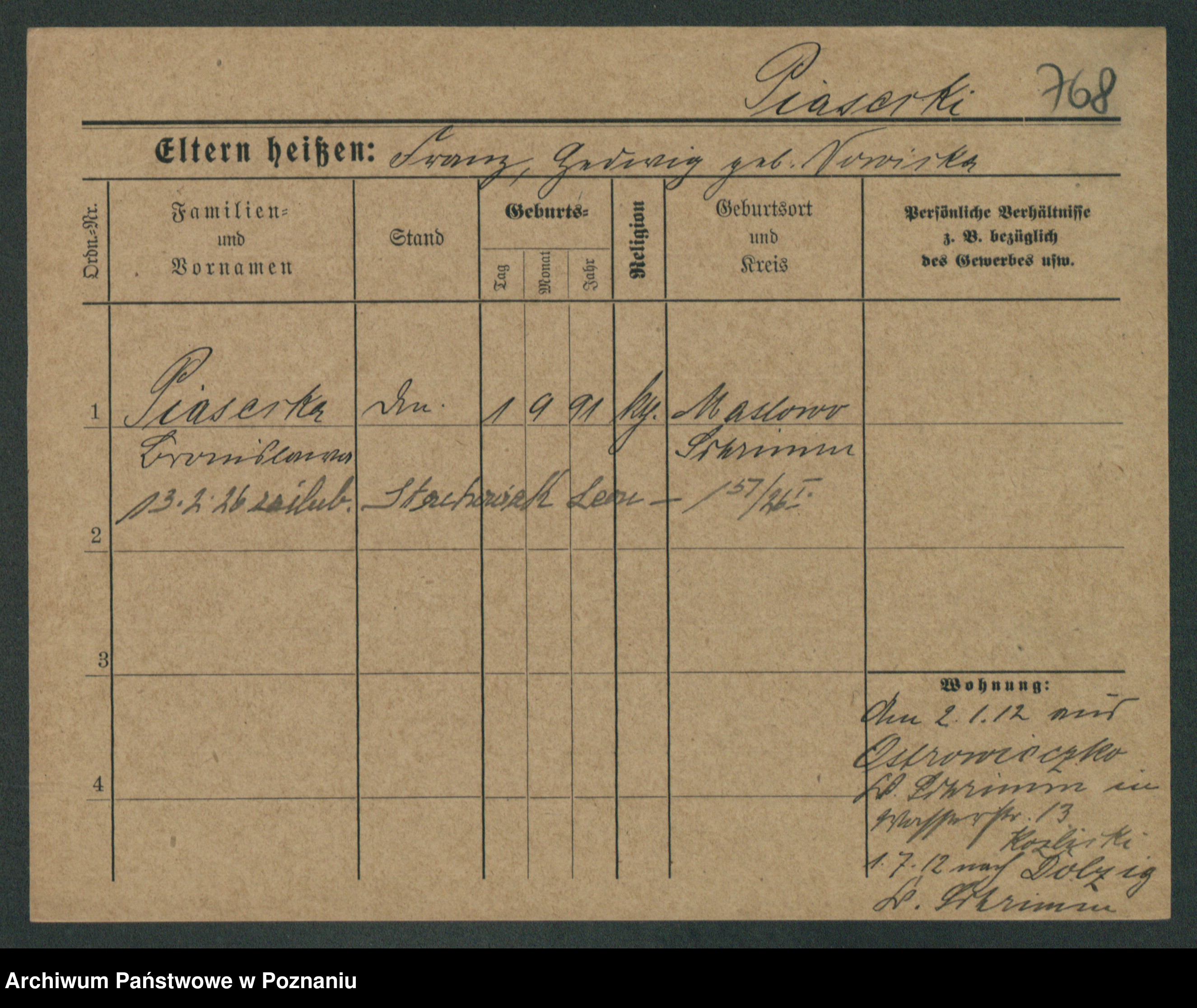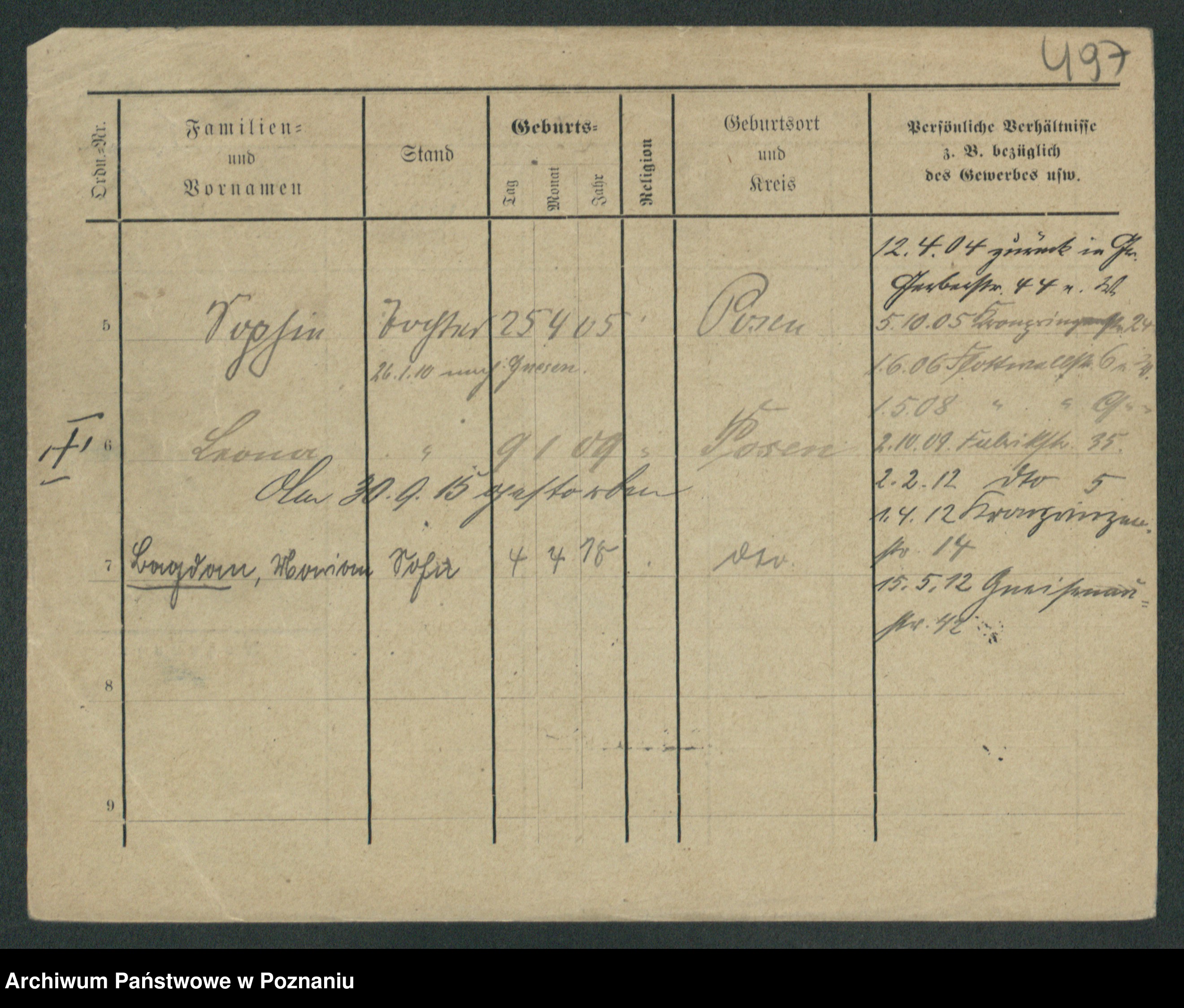 Podgląd karty osobowej dostępny jest po kliknięciu na nazwisko lub ikonkę karty. Można dokonywać powiększenia (ikony na górze) lub przechodzić między kolejnymi skanami (strzałki po bokach).