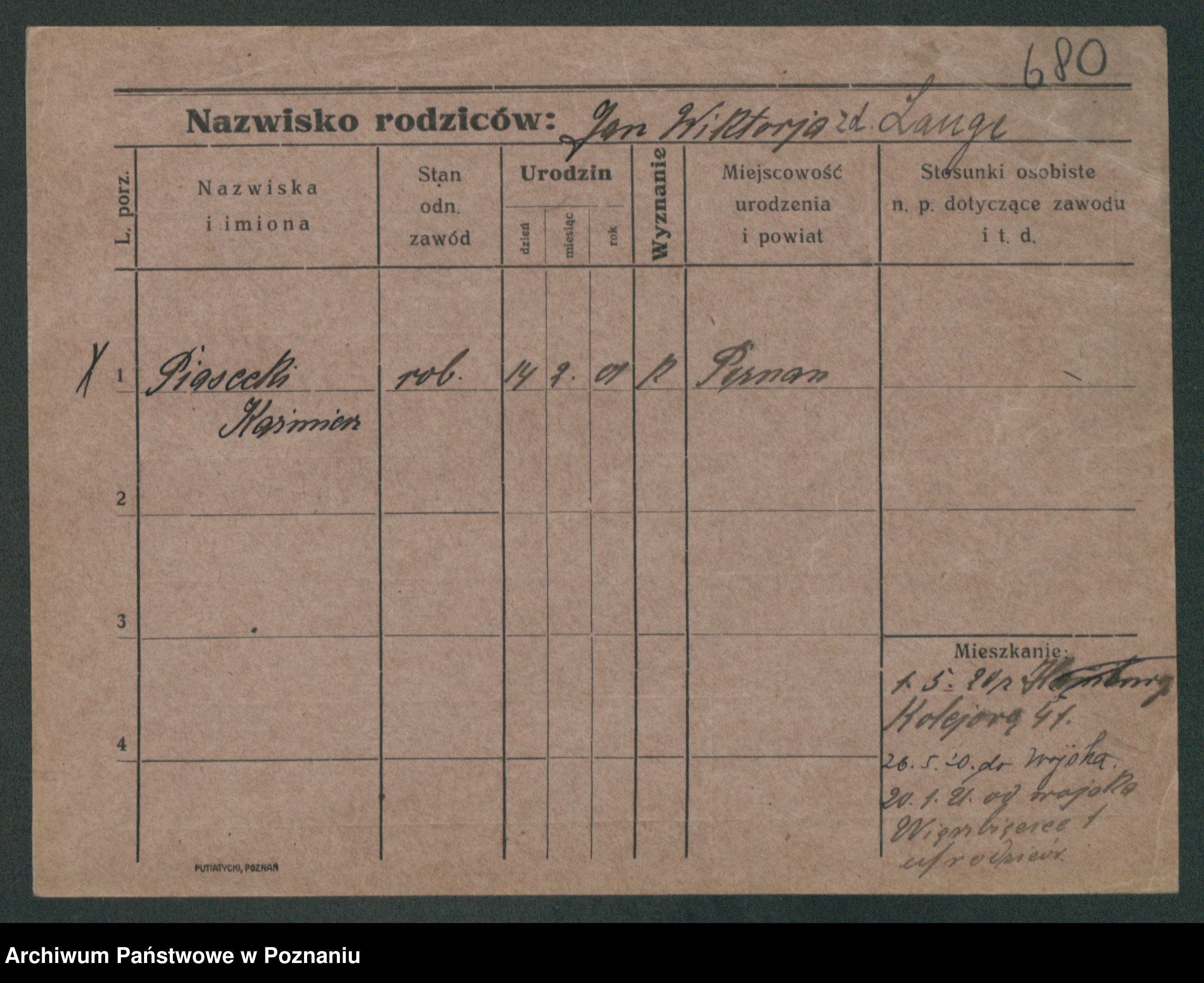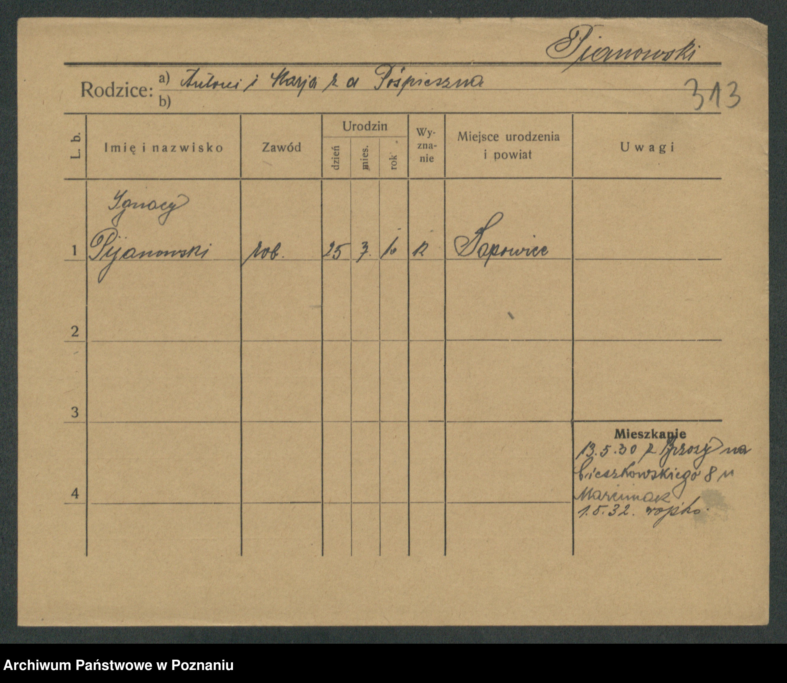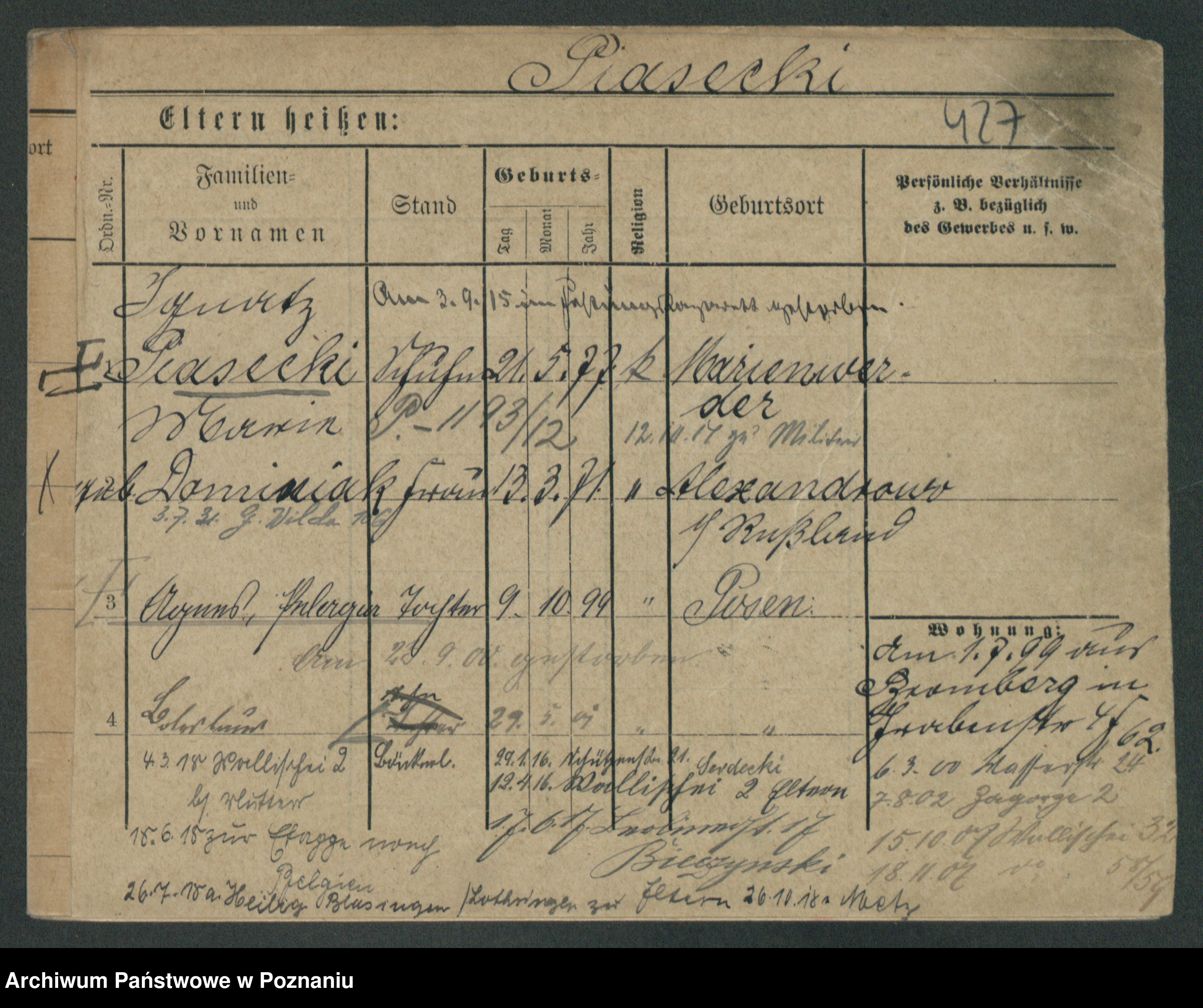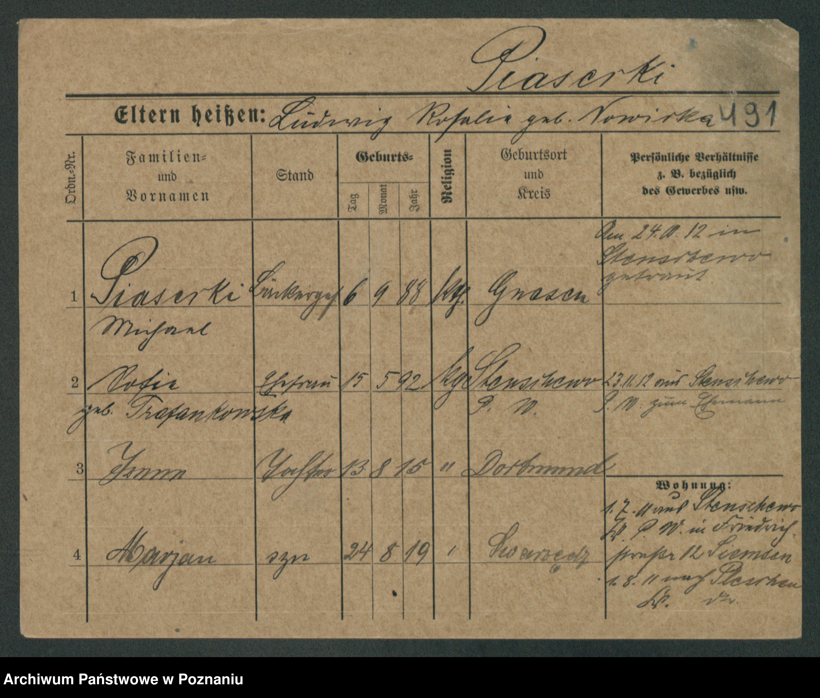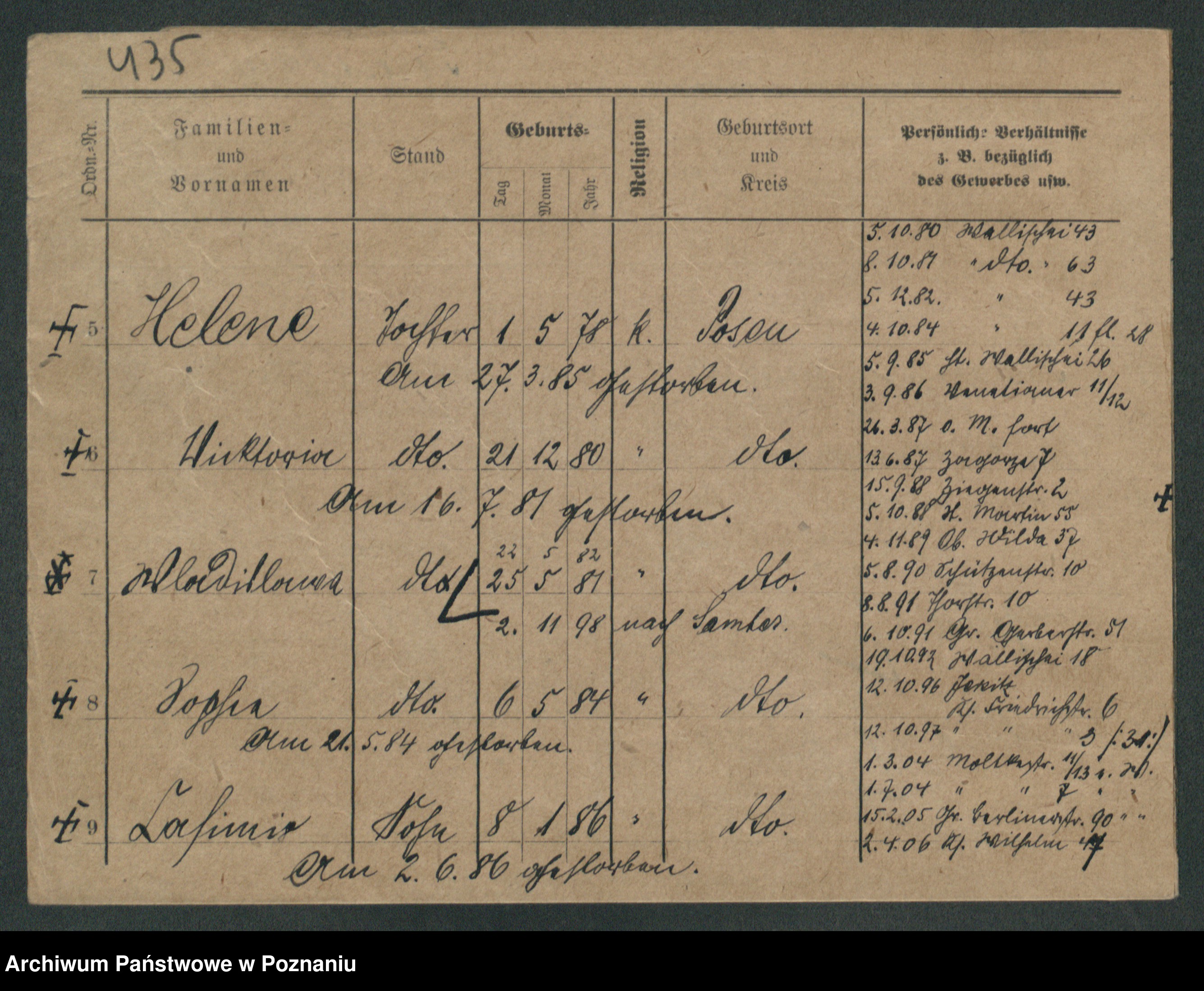 Podgląd karty osobowej dostępny jest po kliknięciu na nazwisko lub ikonkę karty. Można dokonywać powiększenia (ikony na górze) lub przechodzić między kolejnymi skanami (strzałki po bokach).