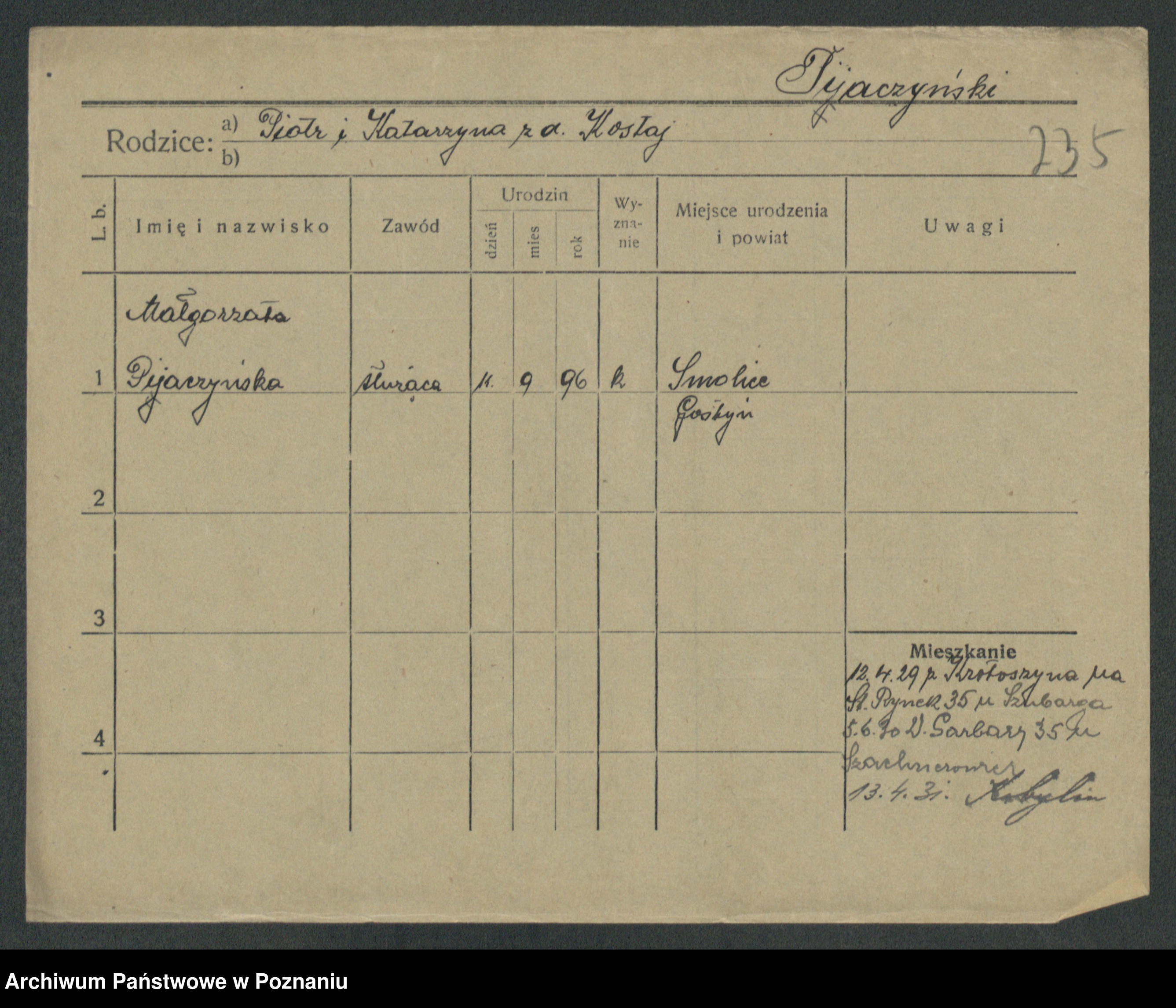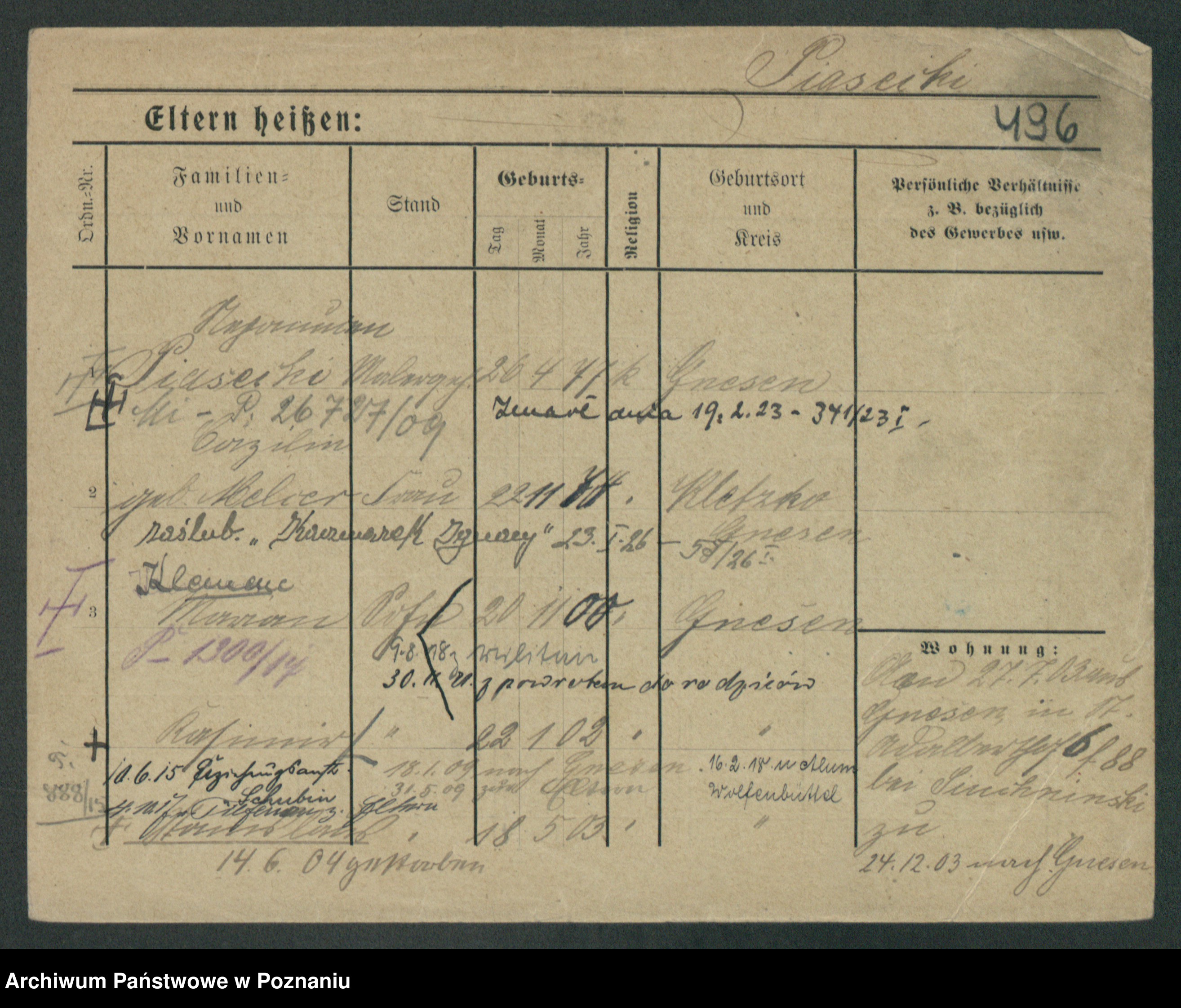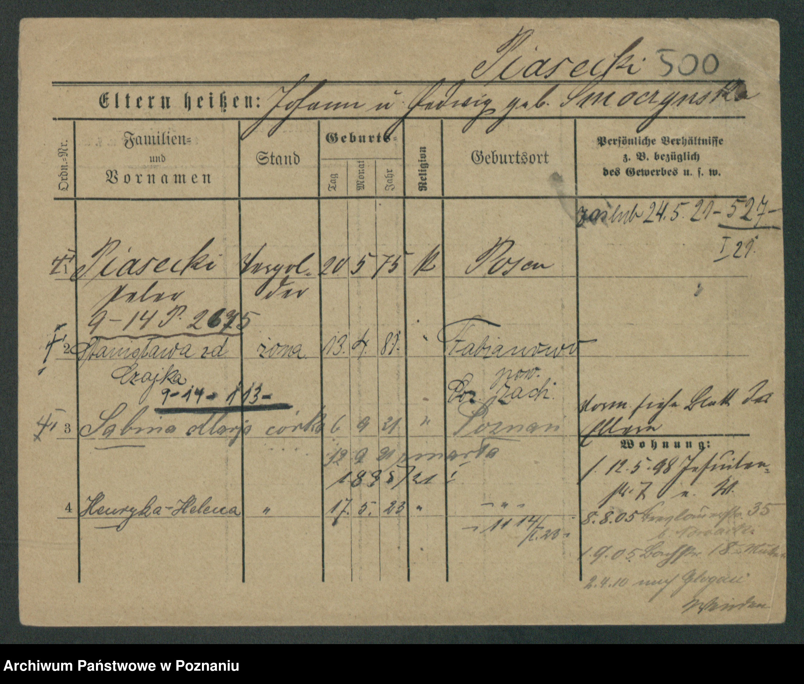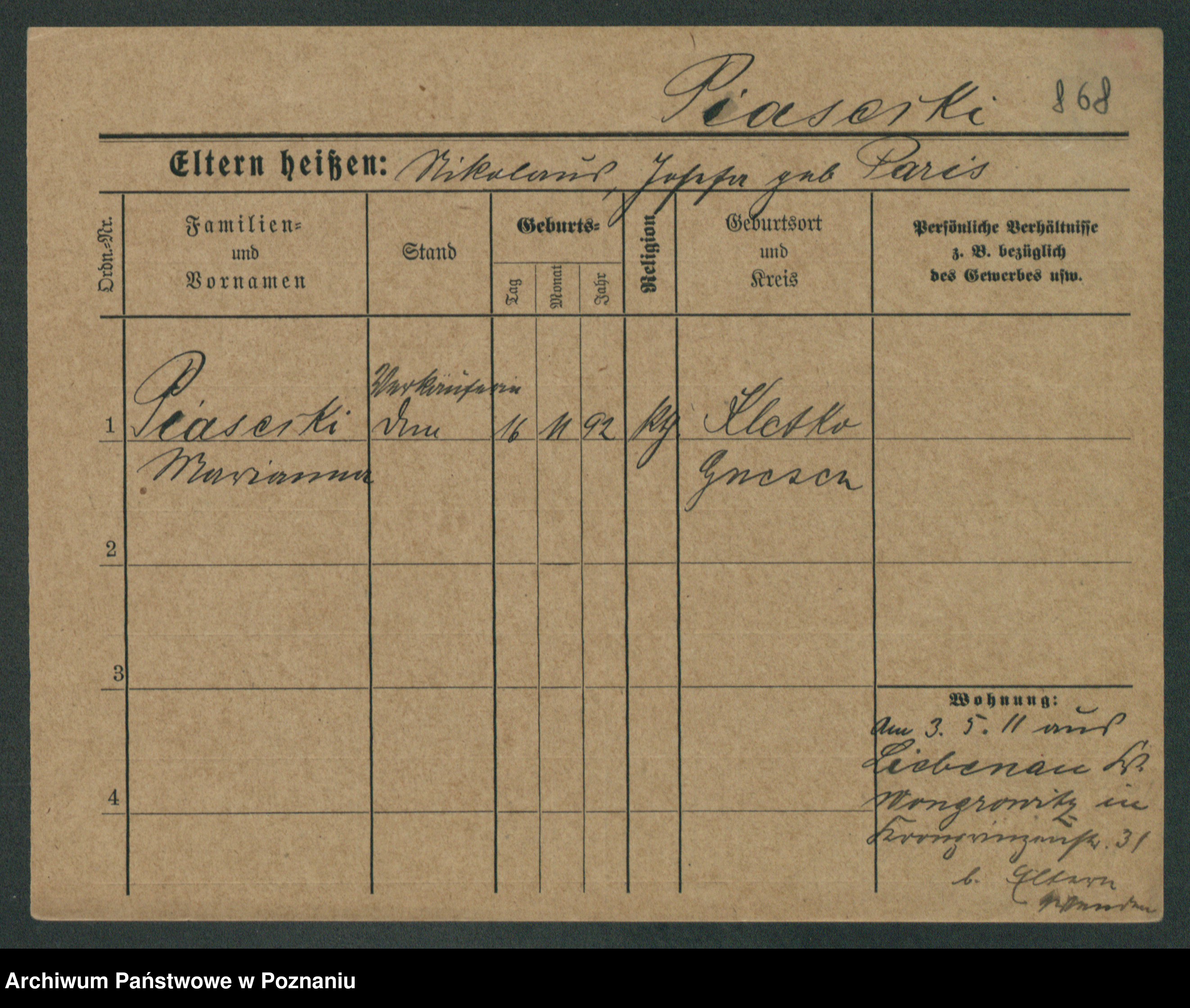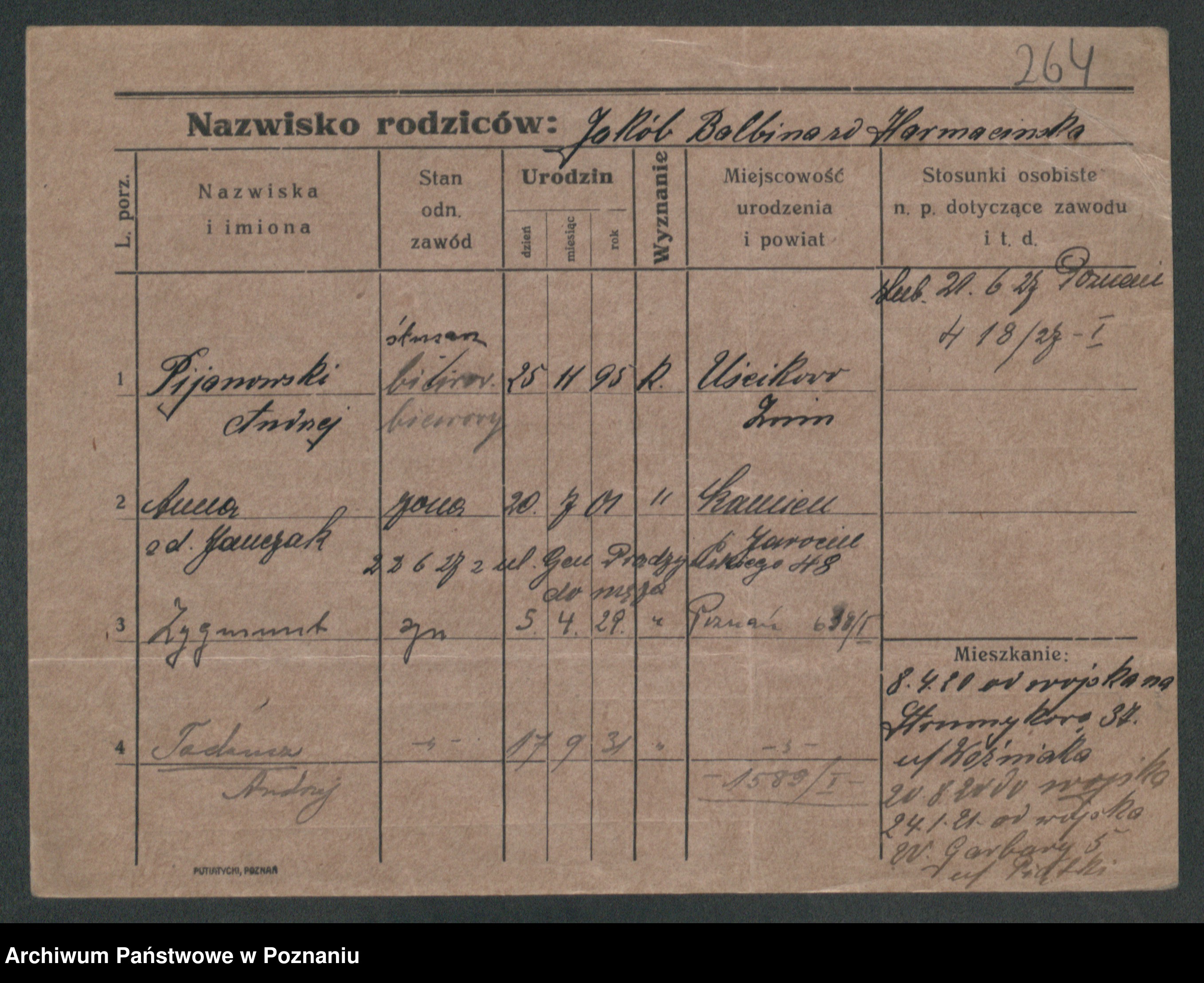 Podgląd karty osobowej dostępny jest po kliknięciu na nazwisko lub ikonkę karty. Można dokonywać powiększenia (ikony na górze) lub przechodzić między kolejnymi skanami (strzałki po bokach).