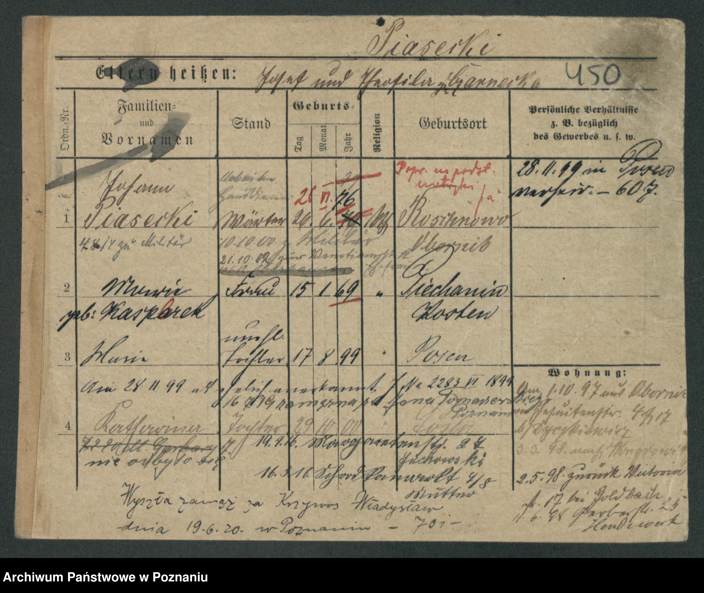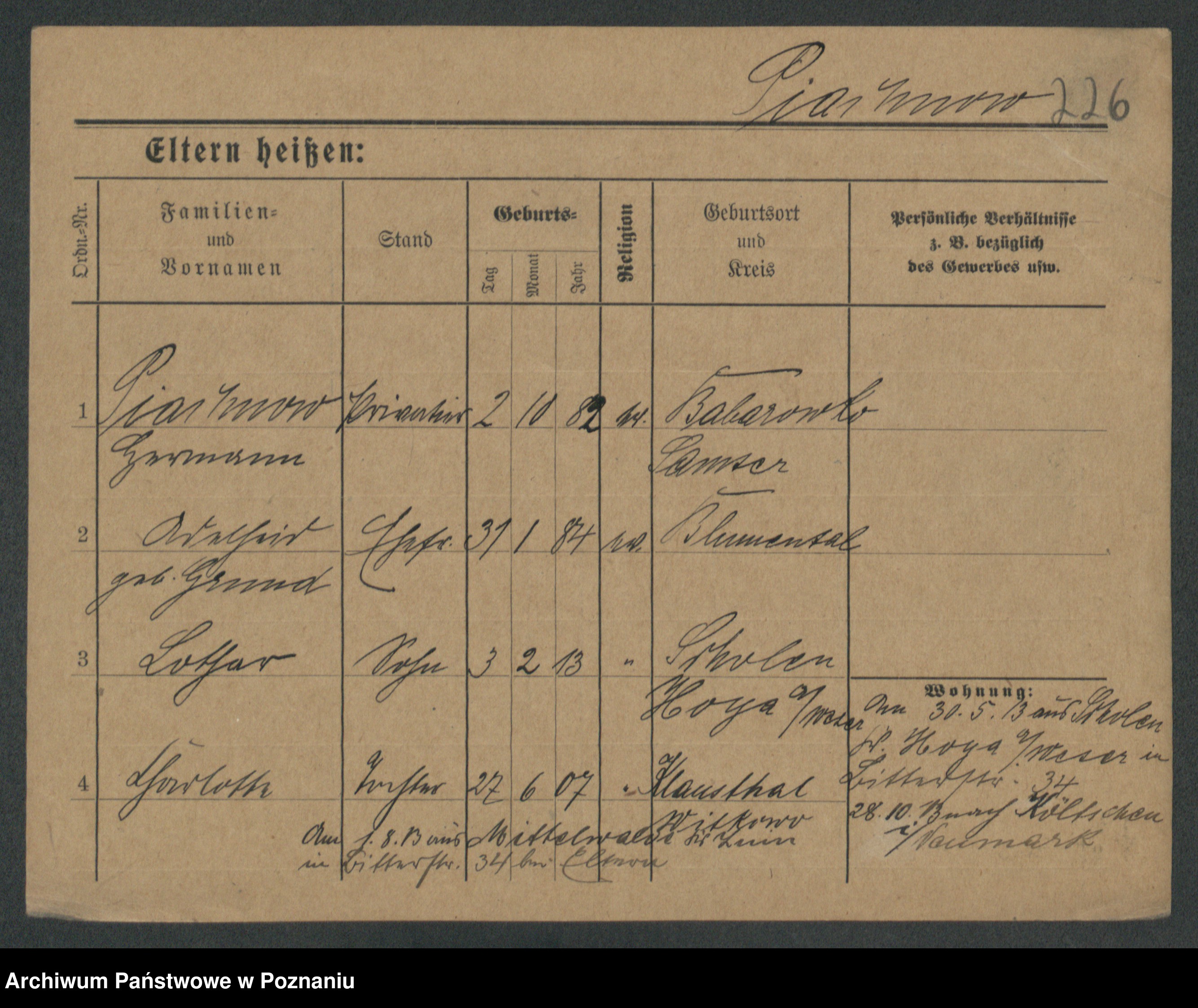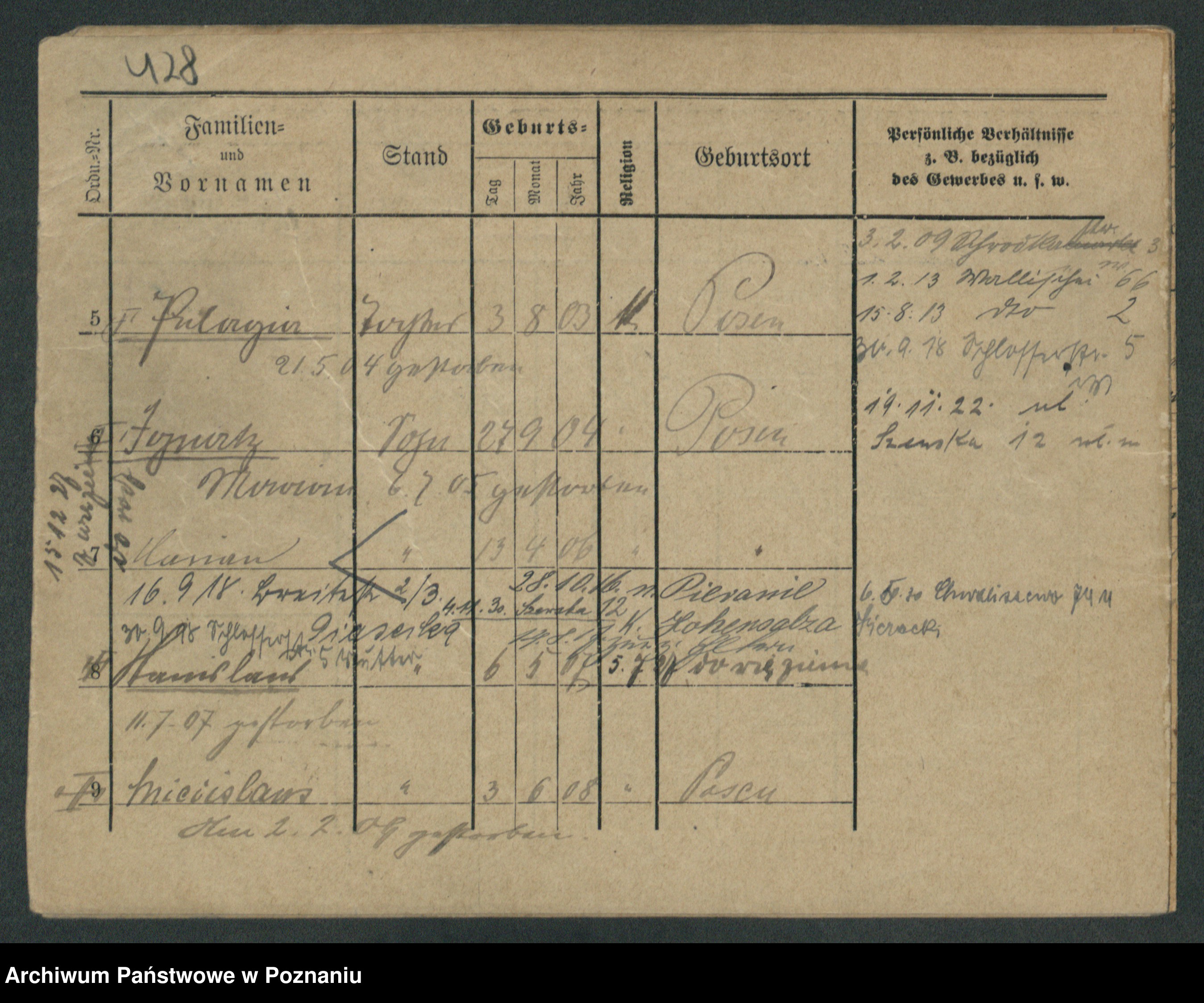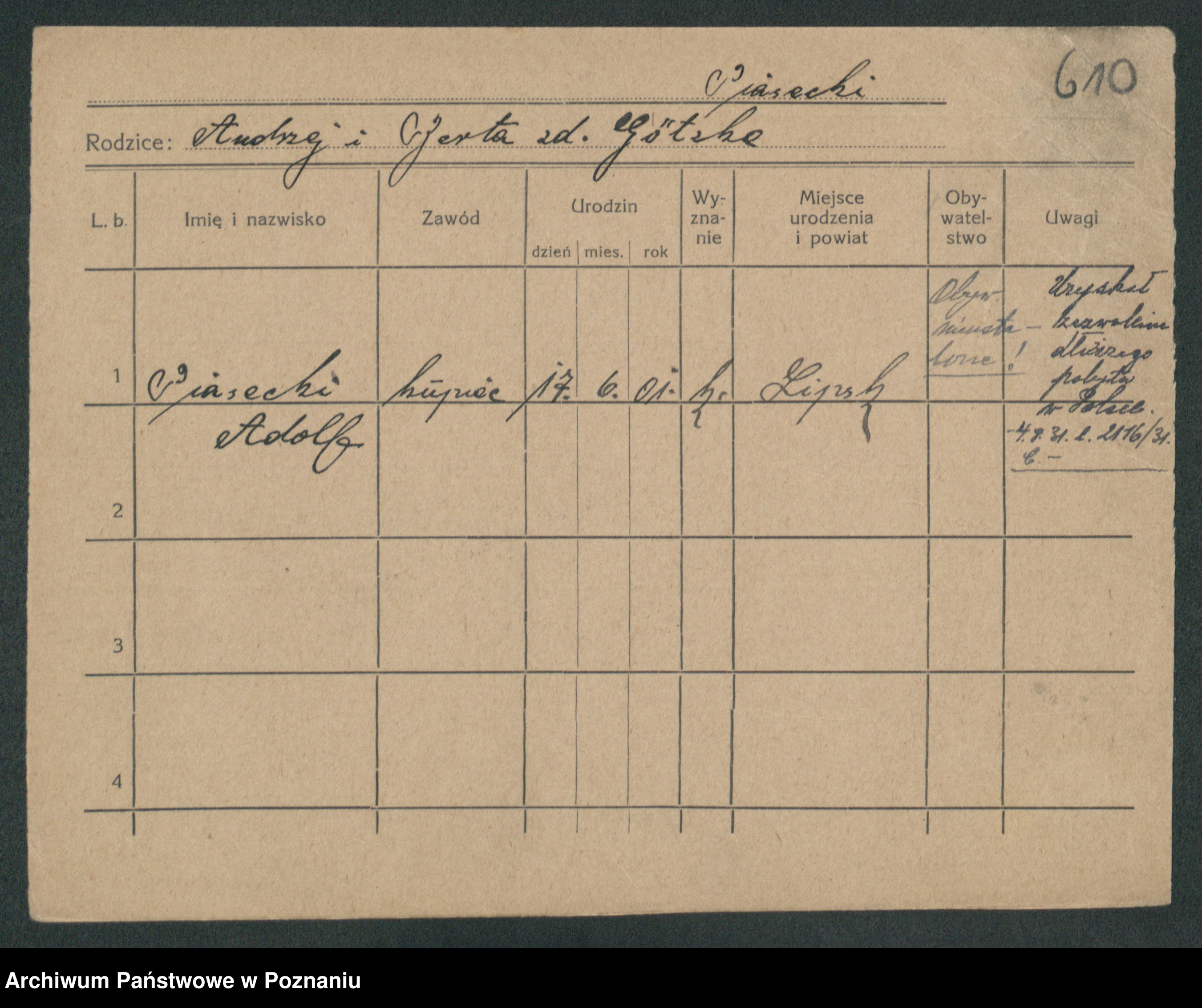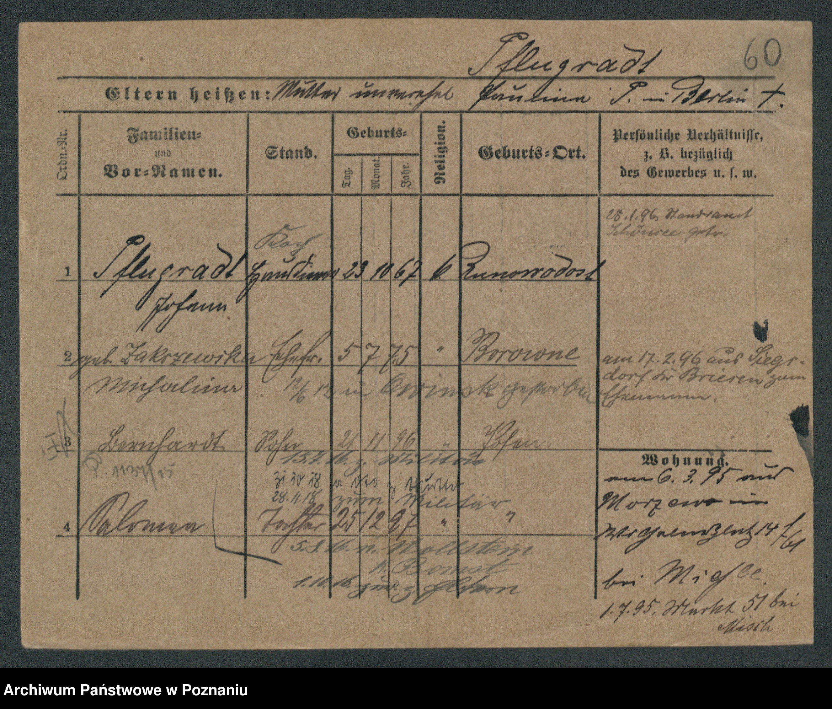 Podgląd karty osobowej dostępny jest po kliknięciu na nazwisko lub ikonkę karty. Można dokonywać powiększenia (ikony na górze) lub przechodzić między kolejnymi skanami (strzałki po bokach).