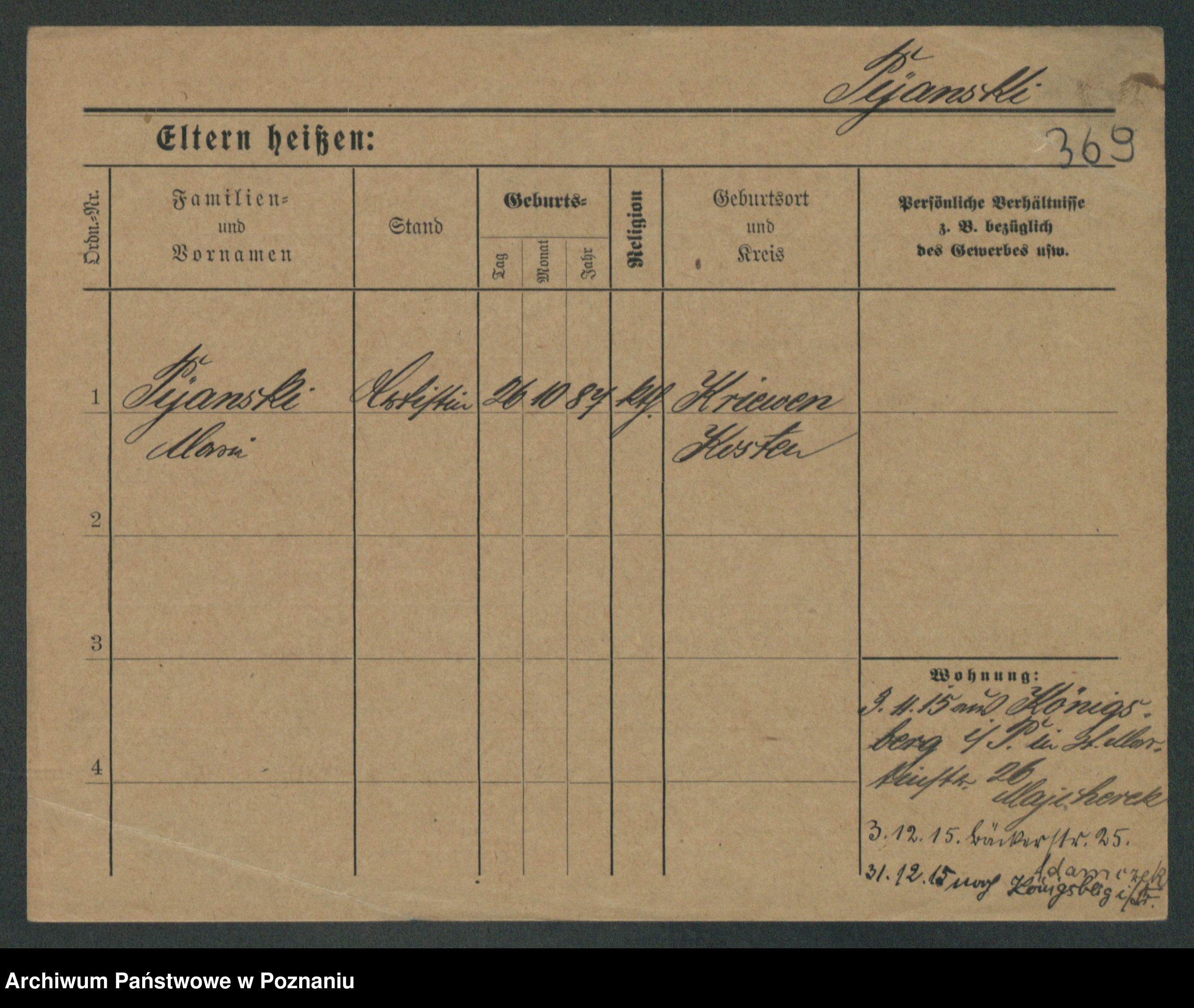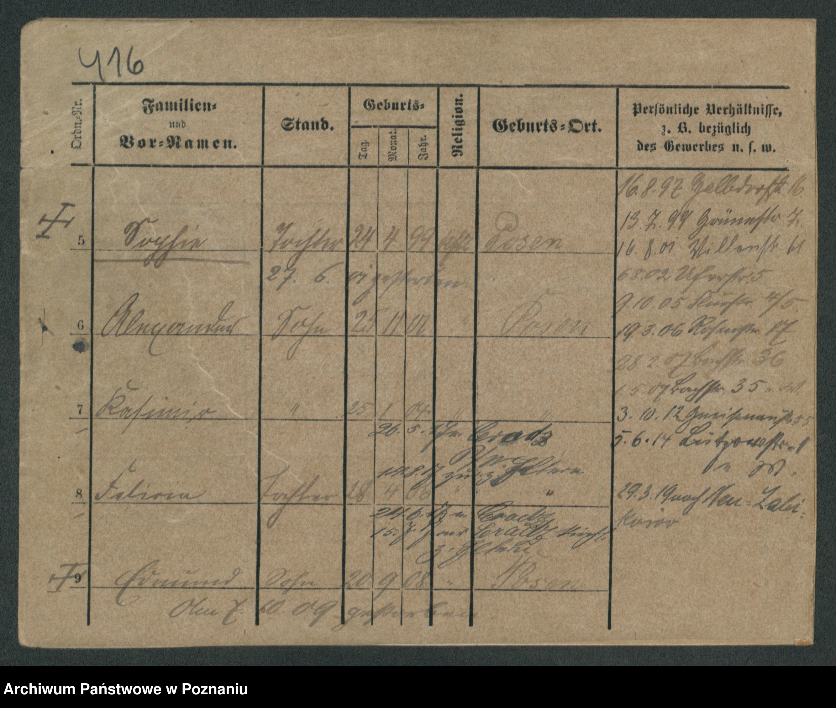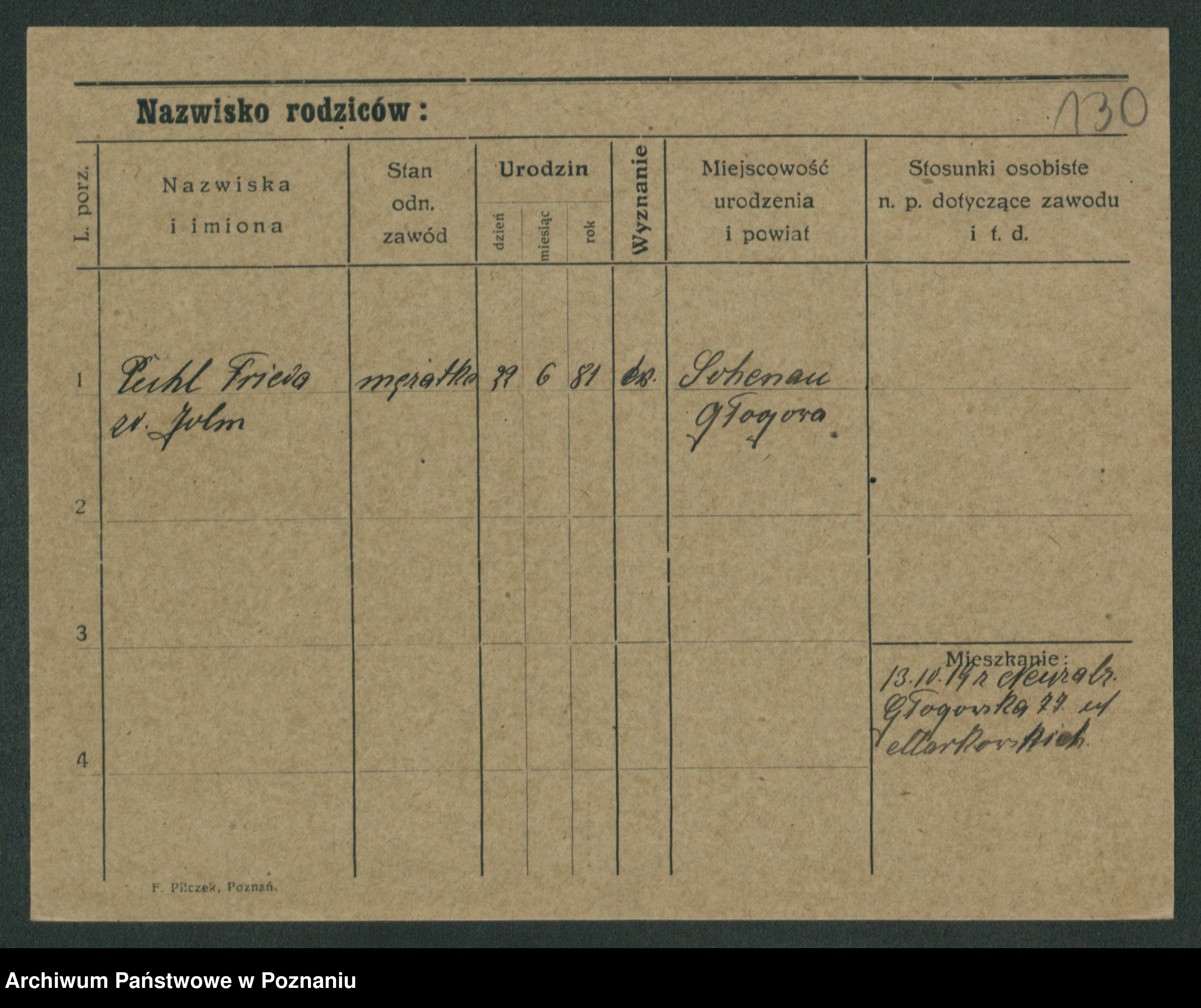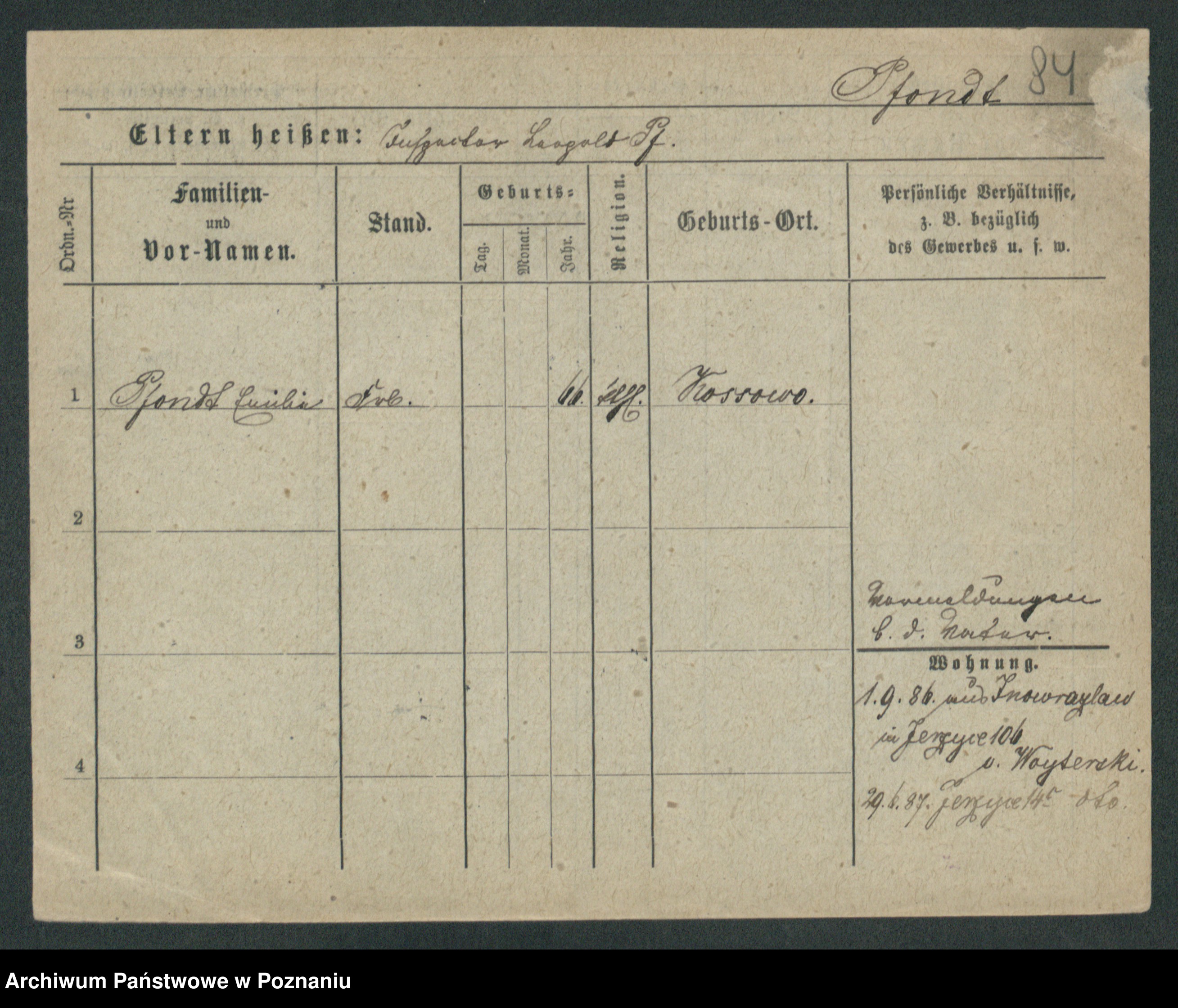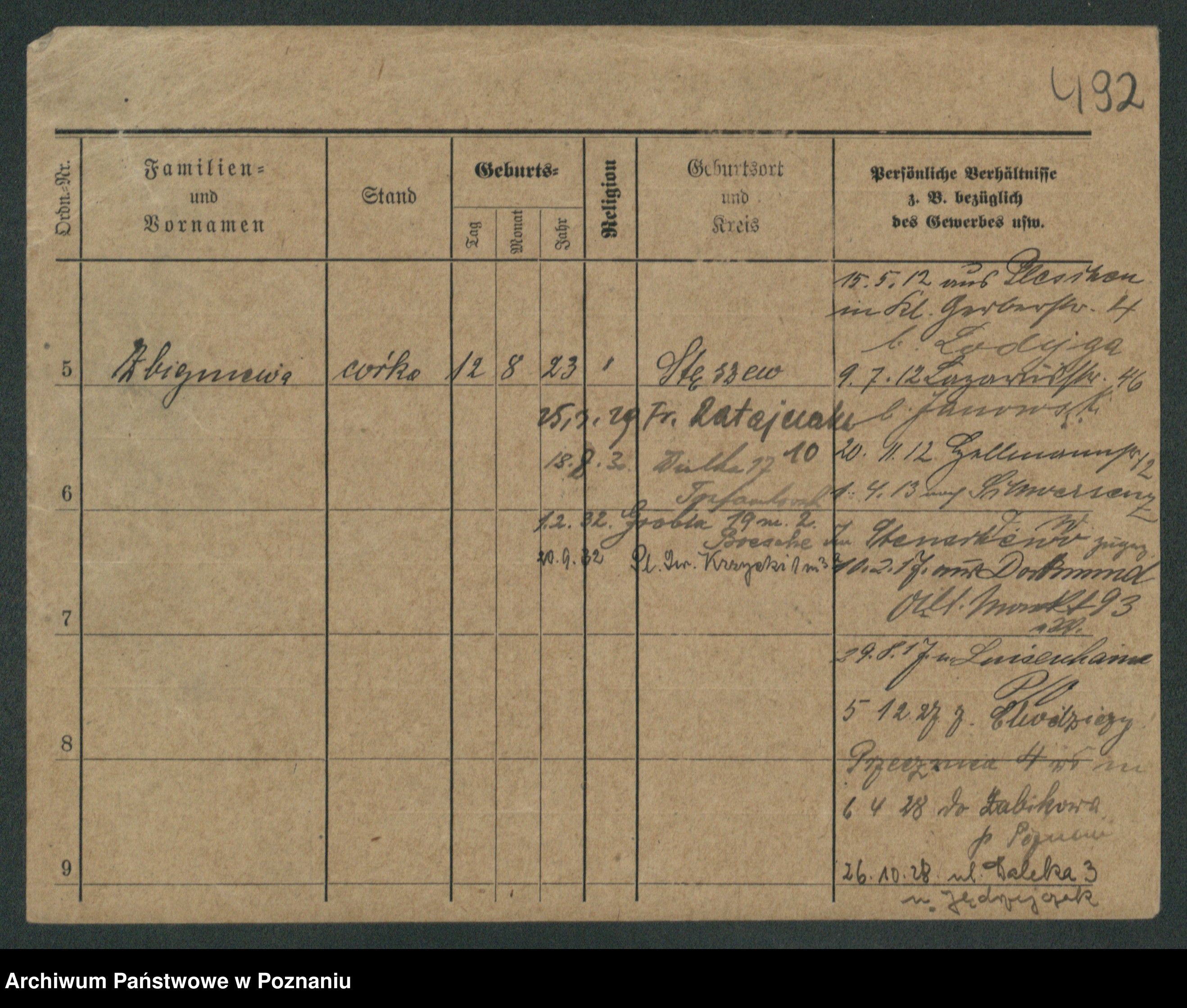 Podgląd karty osobowej dostępny jest po kliknięciu na nazwisko lub ikonkę karty. Można dokonywać powiększenia (ikony na górze) lub przechodzić między kolejnymi skanami (strzałki po bokach).