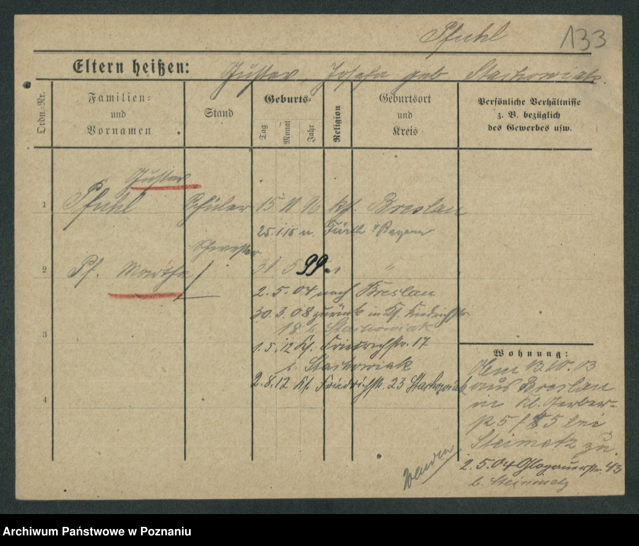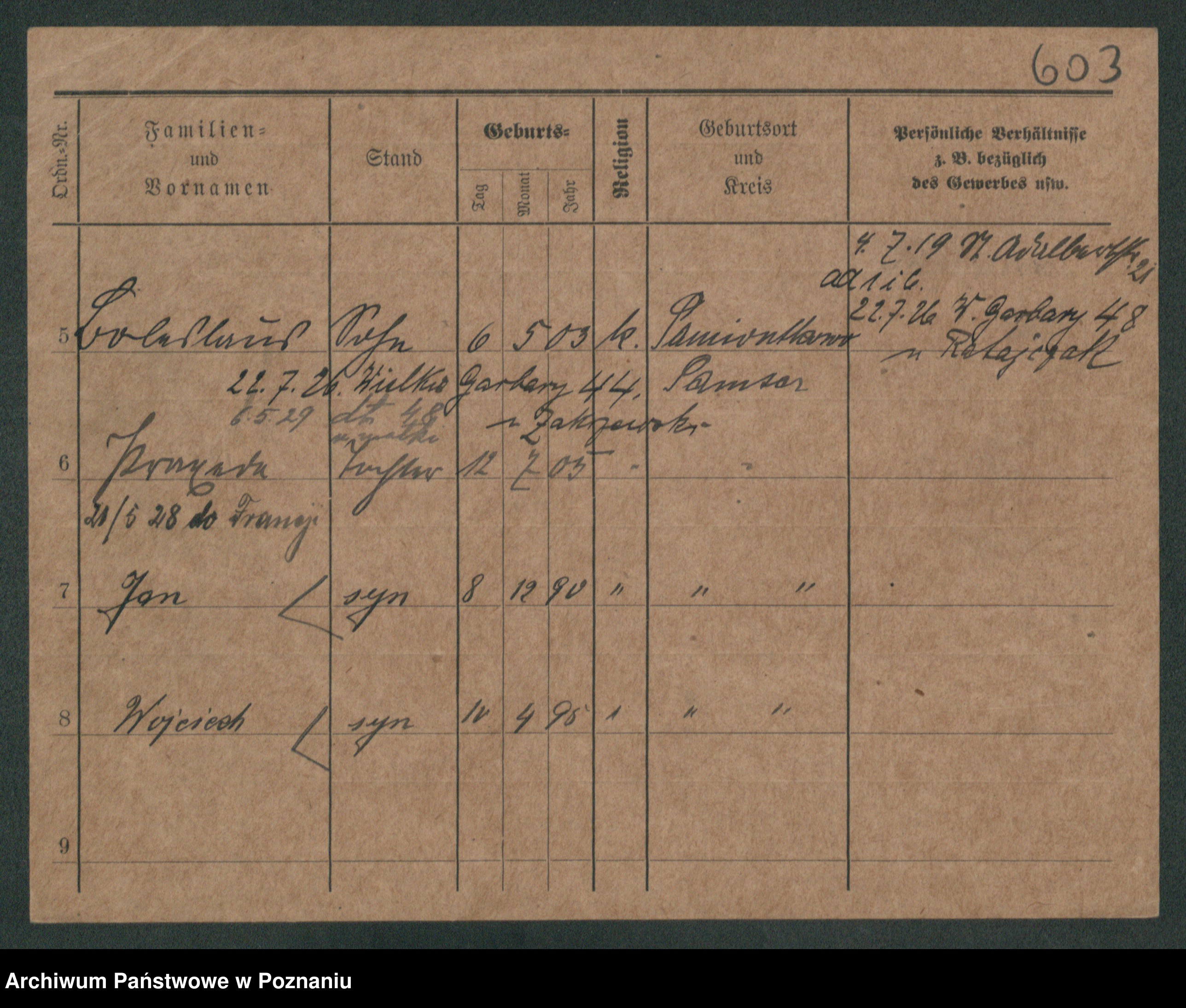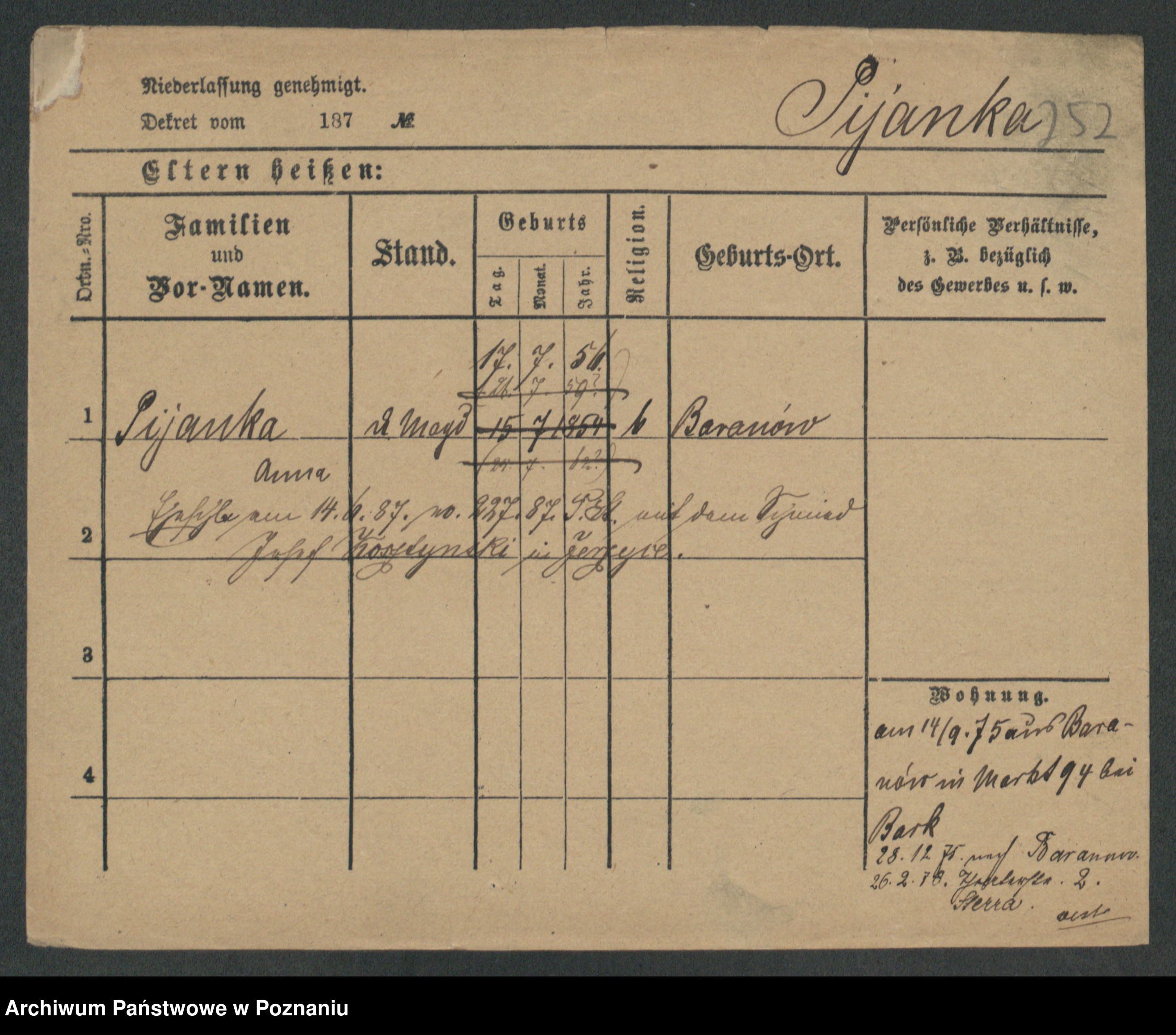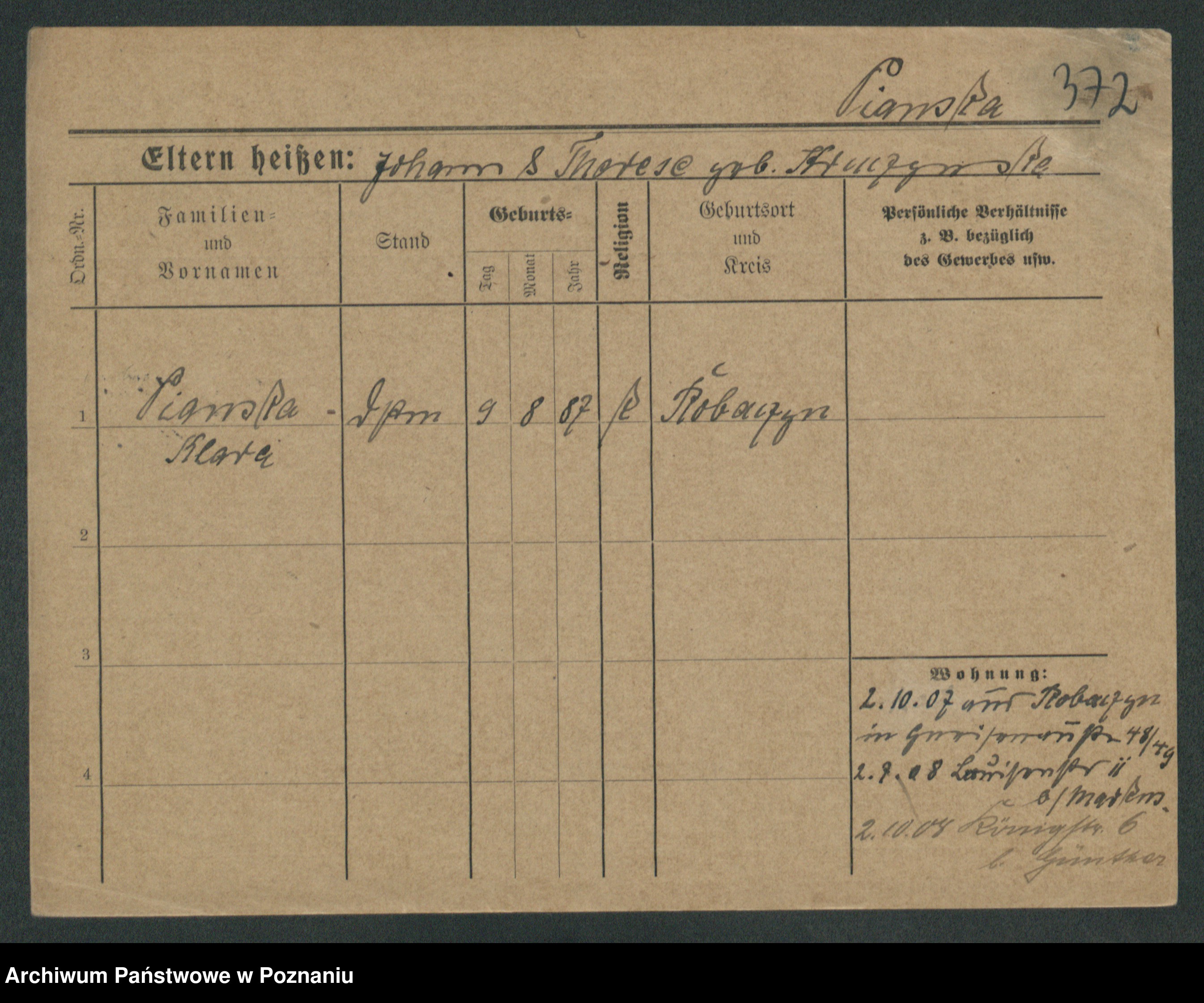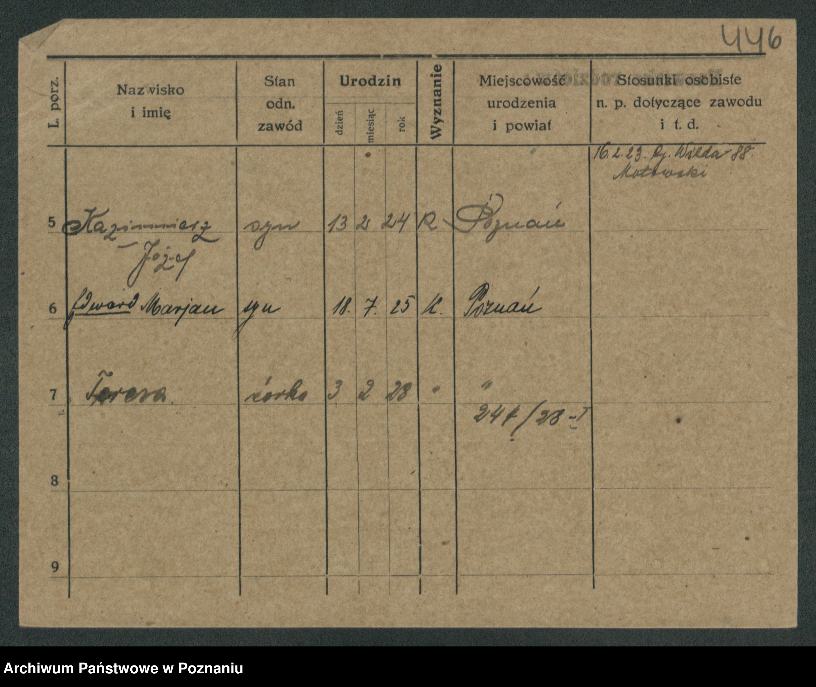 Podgląd karty osobowej dostępny jest po kliknięciu na nazwisko lub ikonkę karty. Można dokonywać powiększenia (ikony na górze) lub przechodzić między kolejnymi skanami (strzałki po bokach).