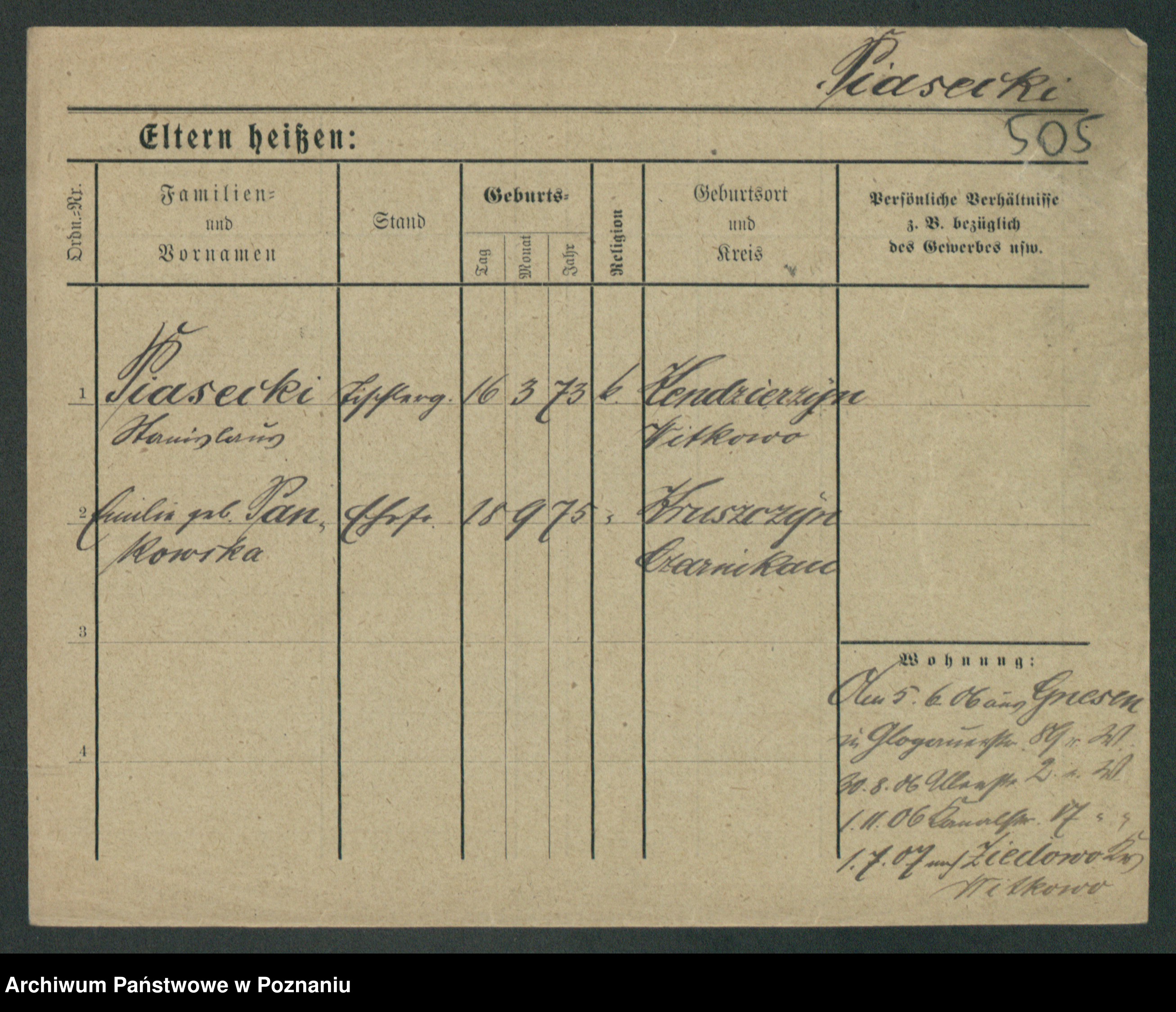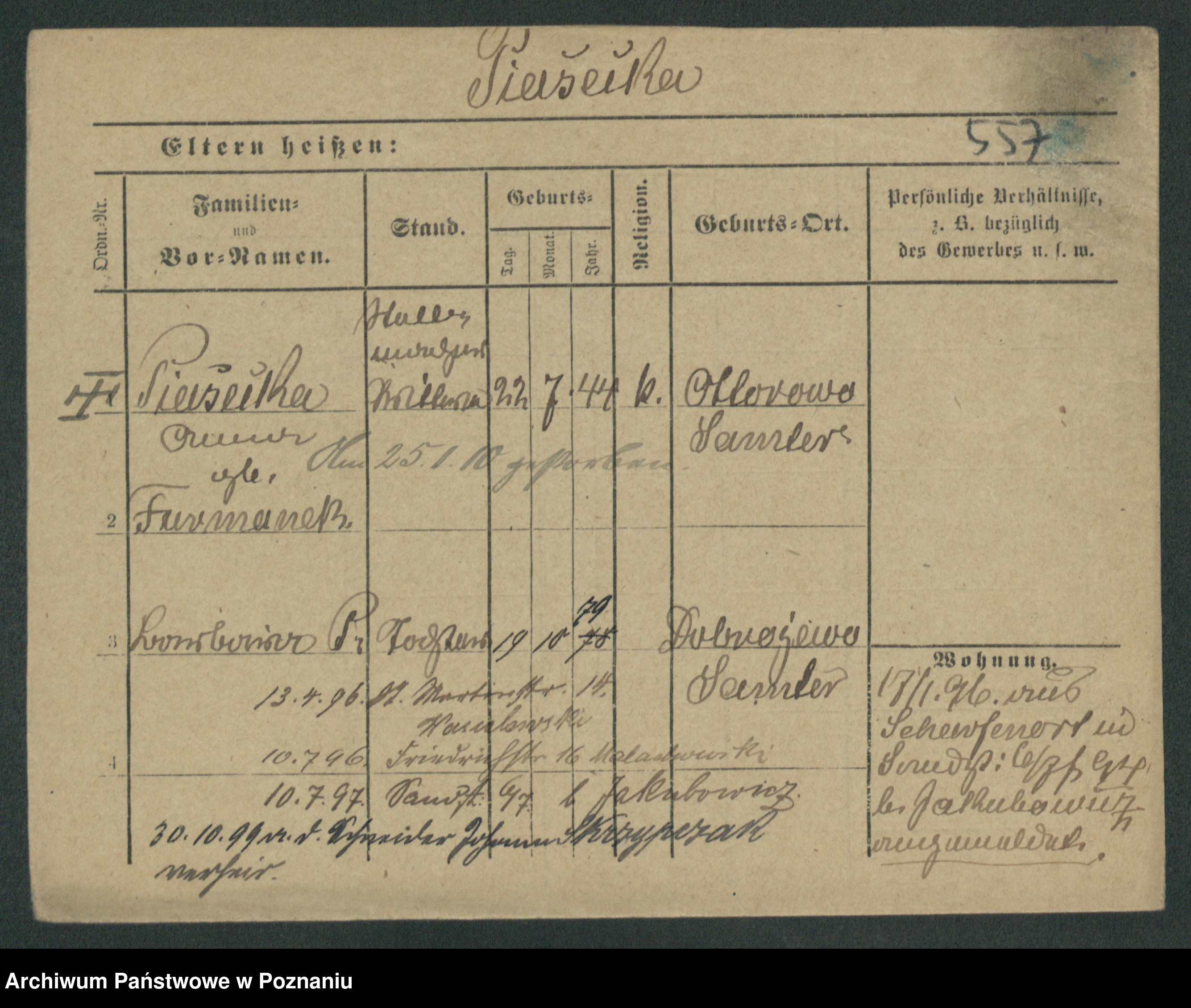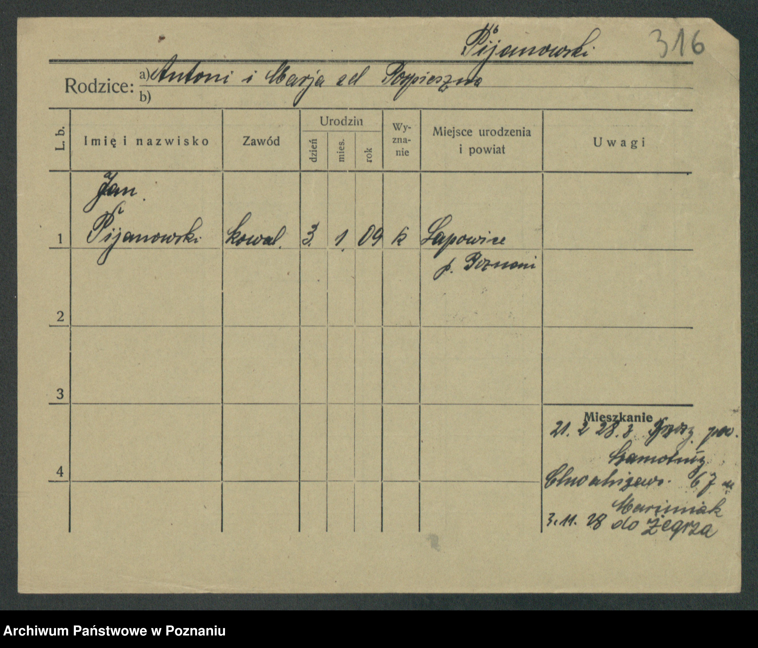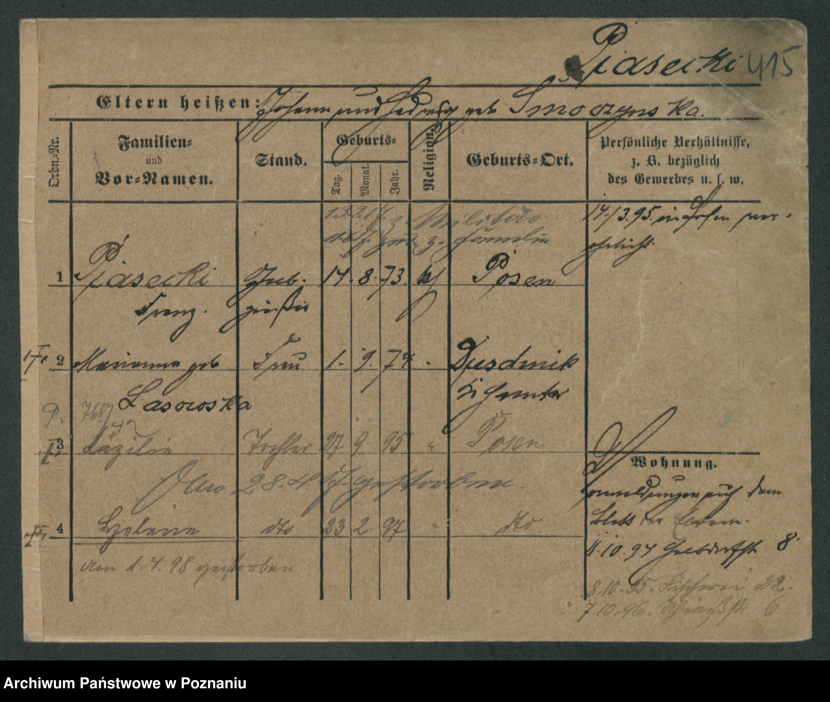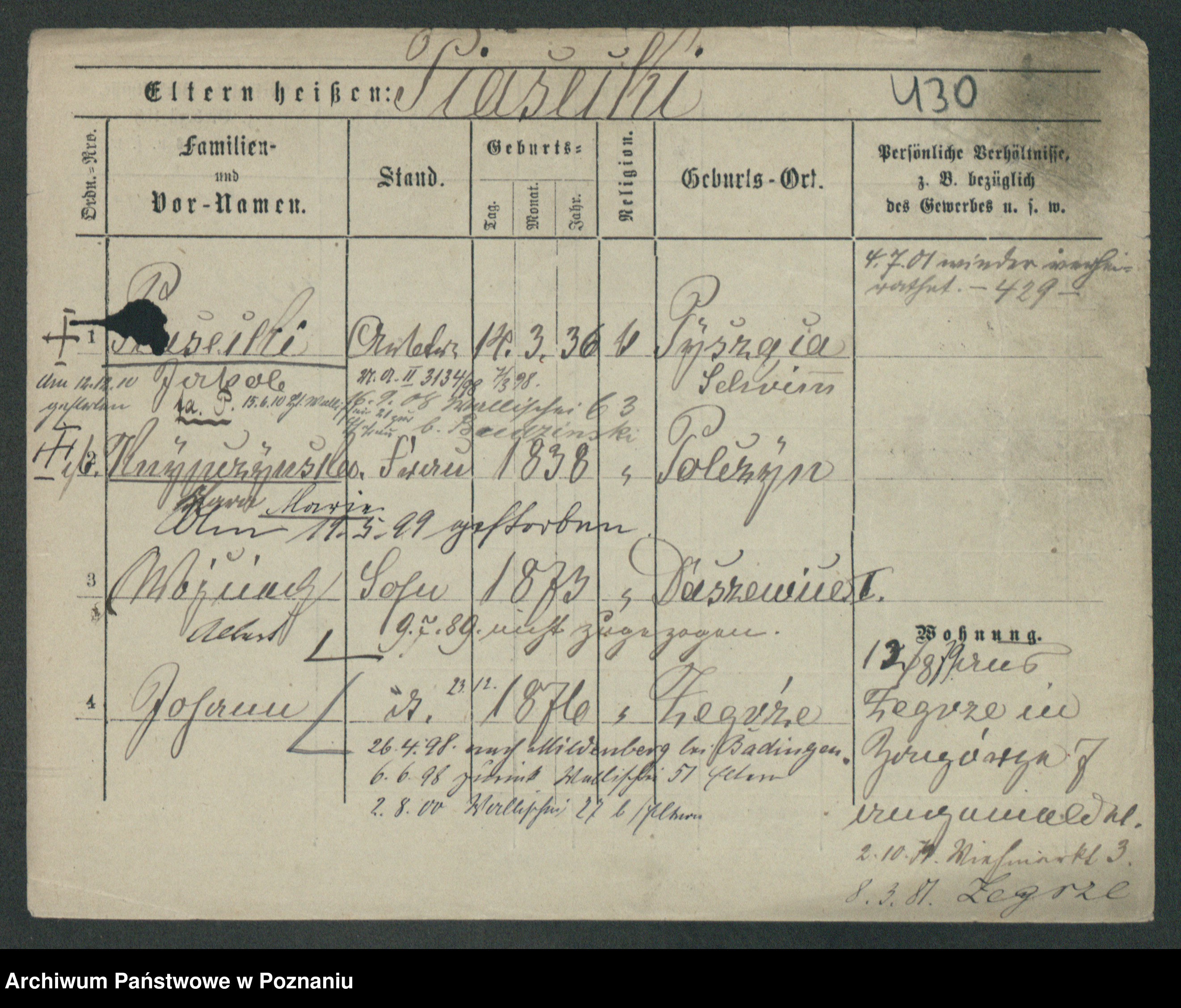 Podgląd karty osobowej dostępny jest po kliknięciu na nazwisko lub ikonkę karty. Można dokonywać powiększenia (ikony na górze) lub przechodzić między kolejnymi skanami (strzałki po bokach).