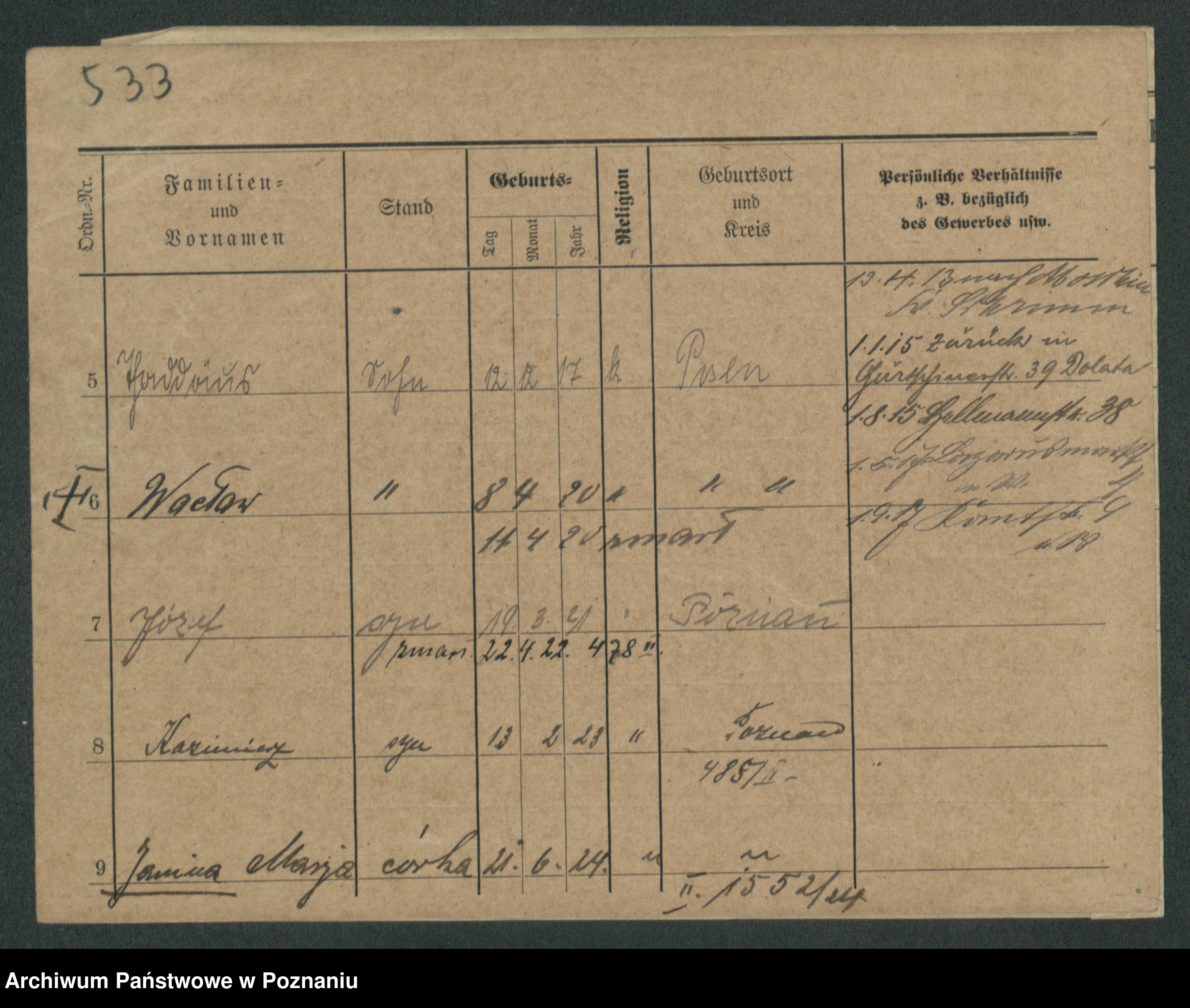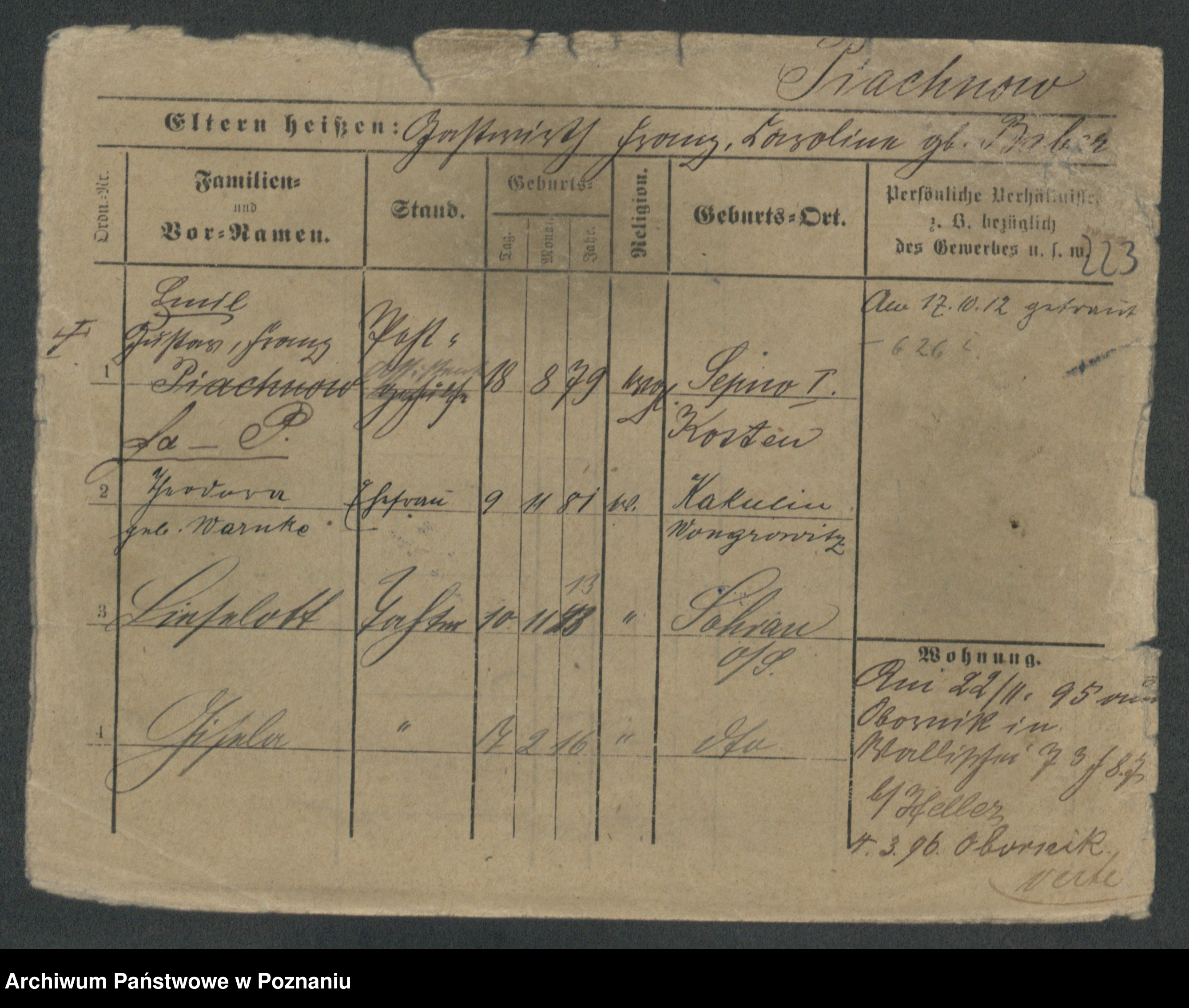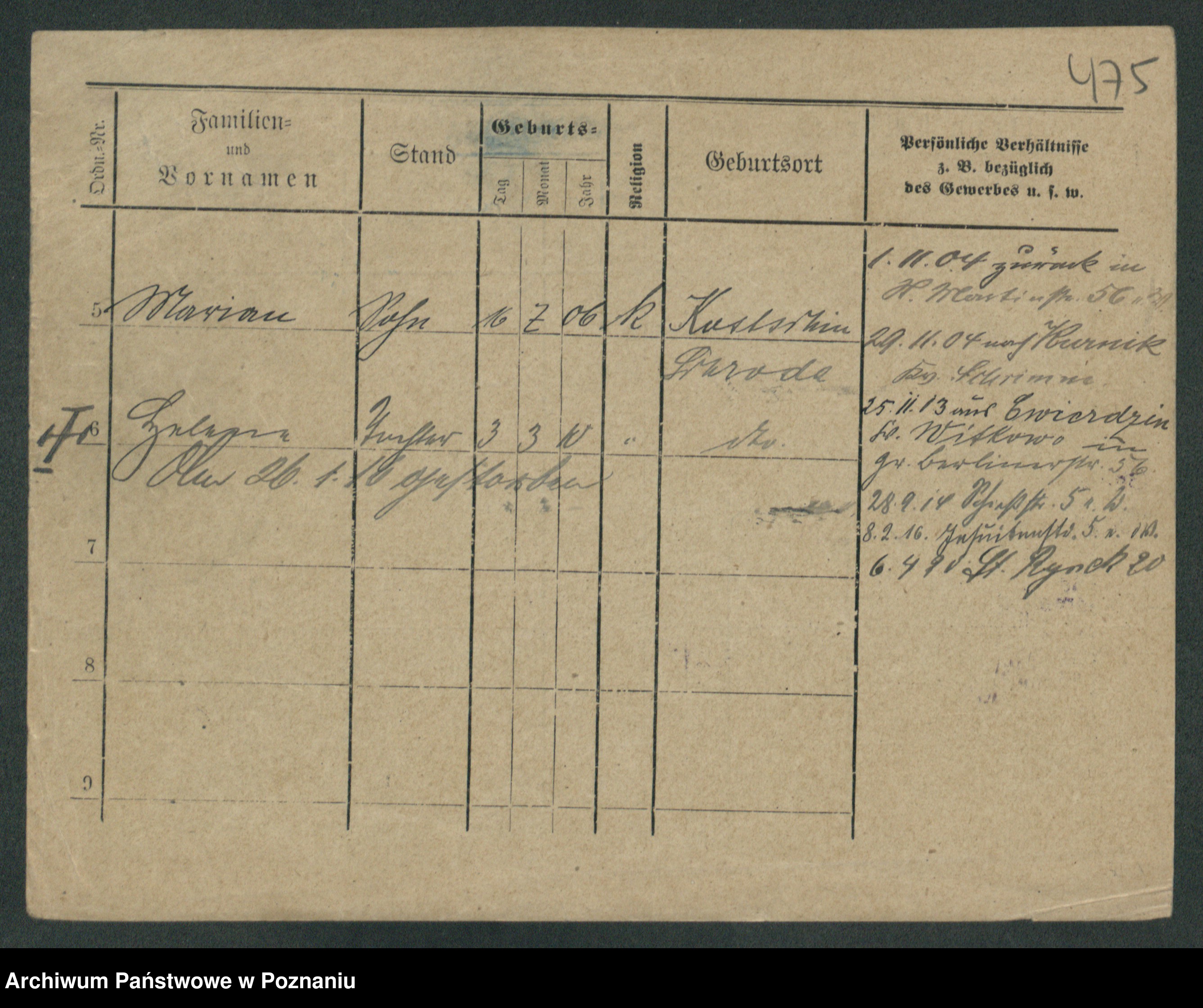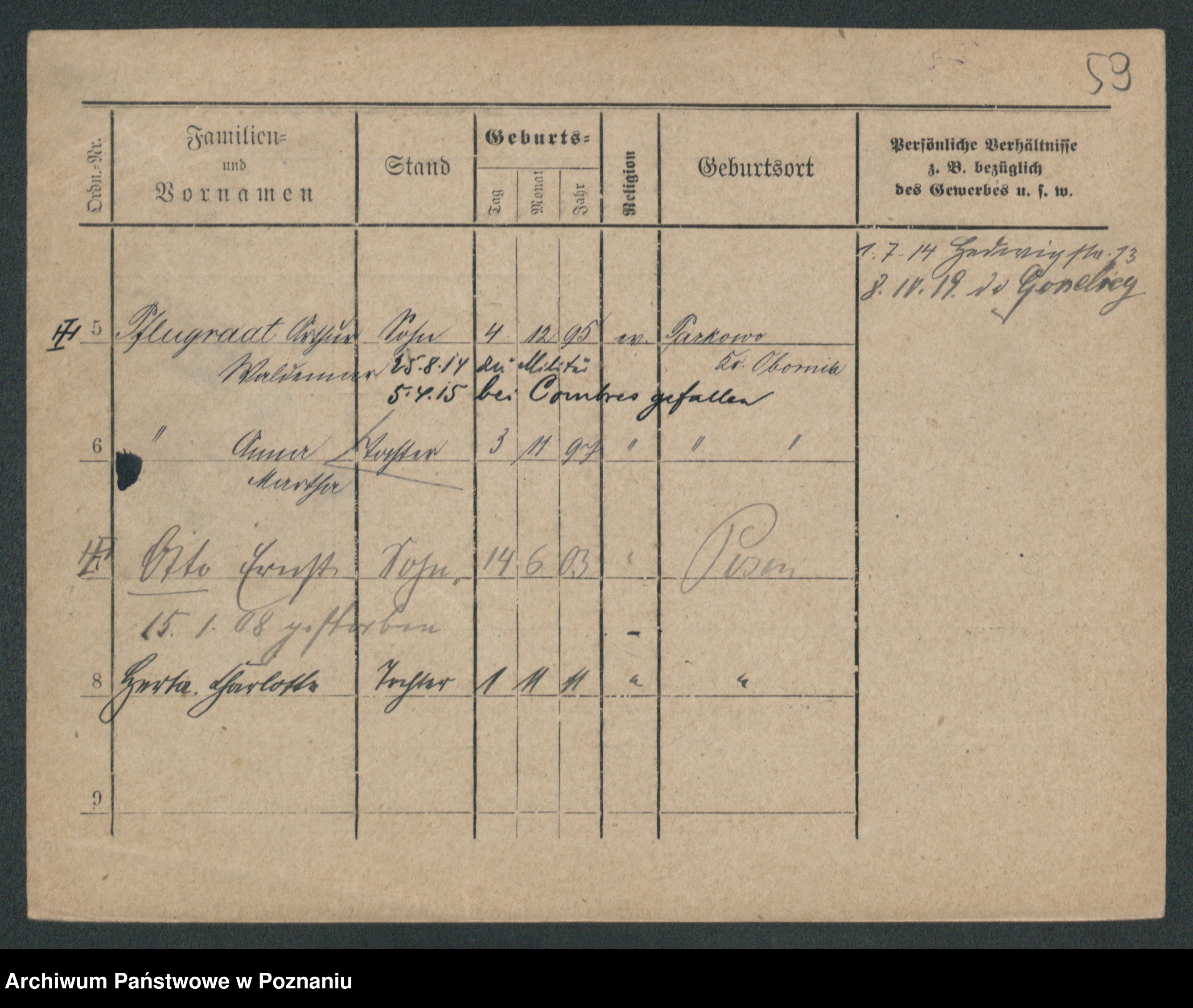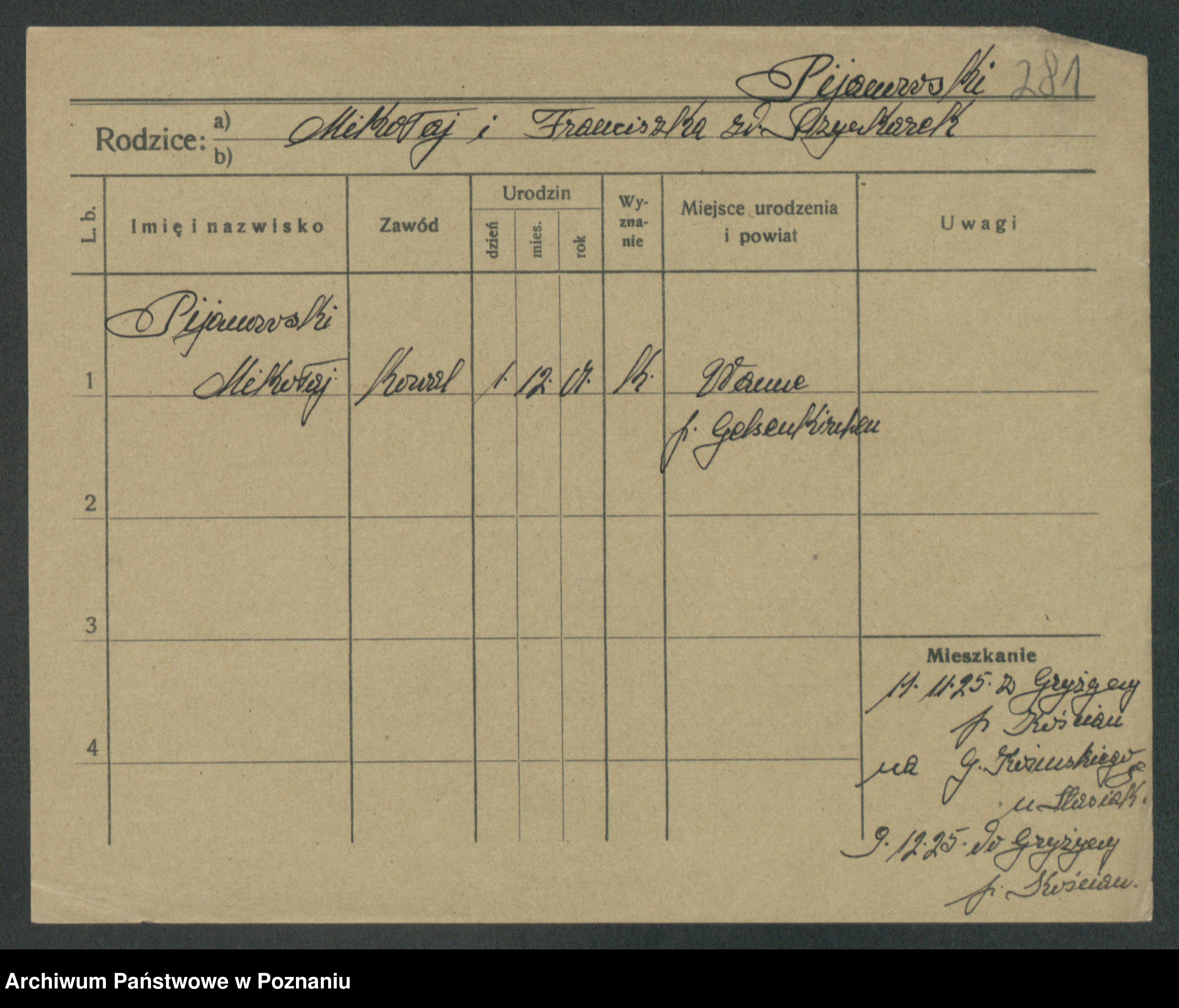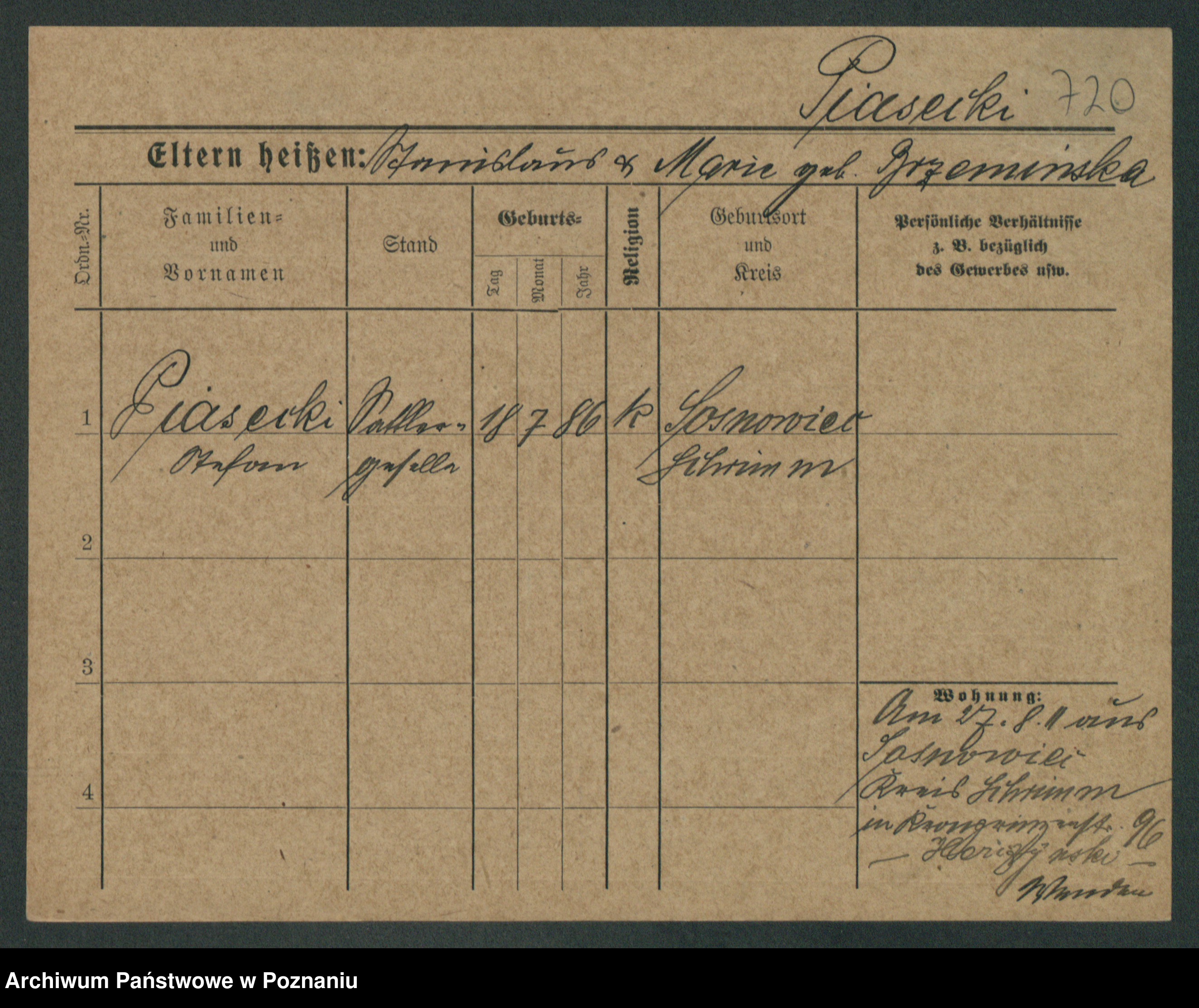 Podgląd karty osobowej dostępny jest po kliknięciu na nazwisko lub ikonkę karty. Można dokonywać powiększenia (ikony na górze) lub przechodzić między kolejnymi skanami (strzałki po bokach).