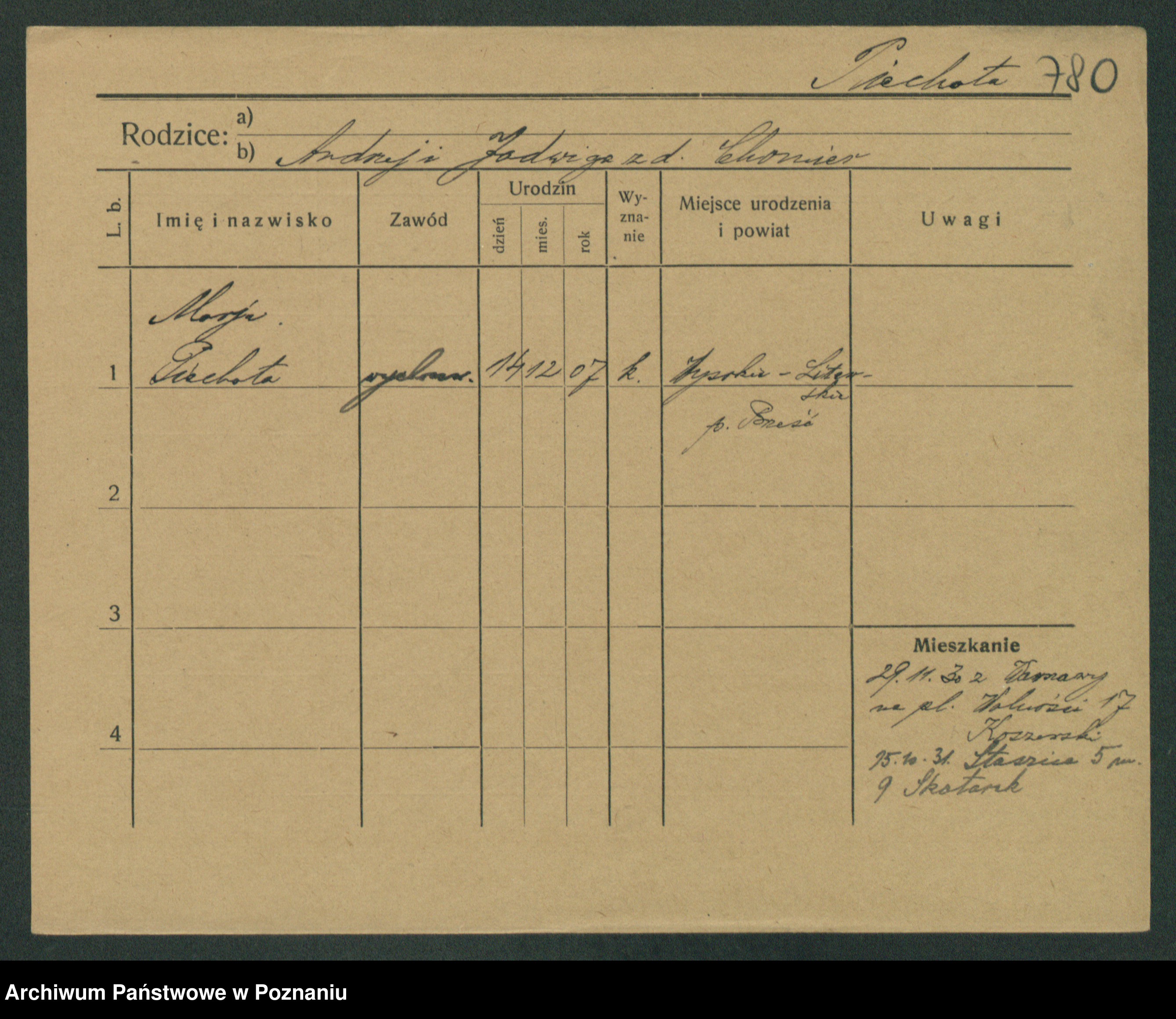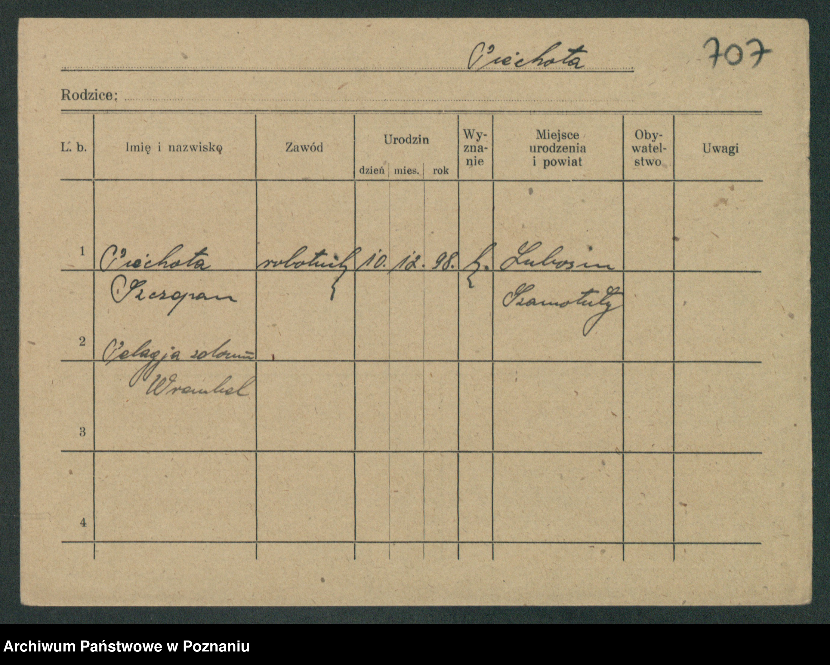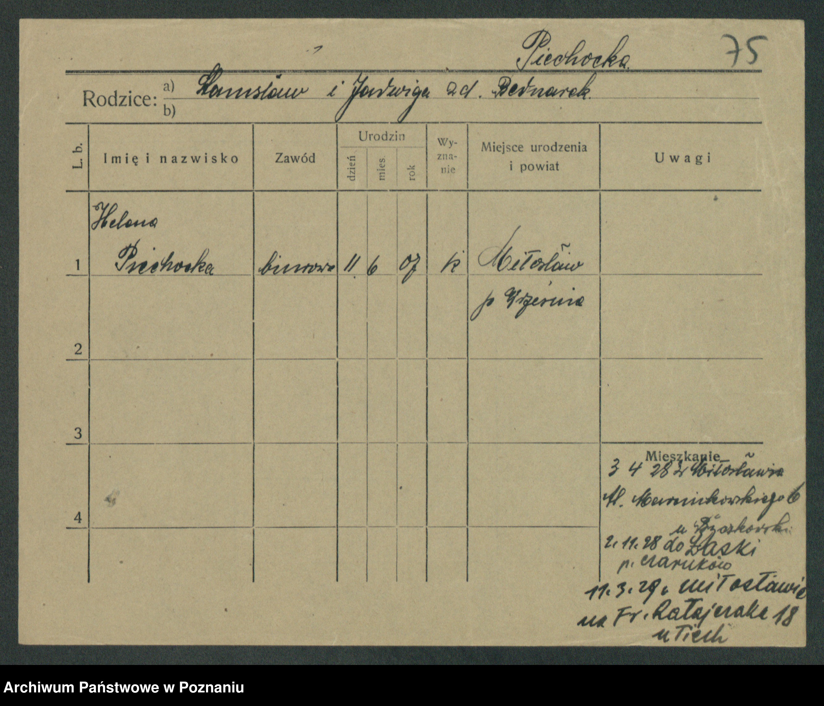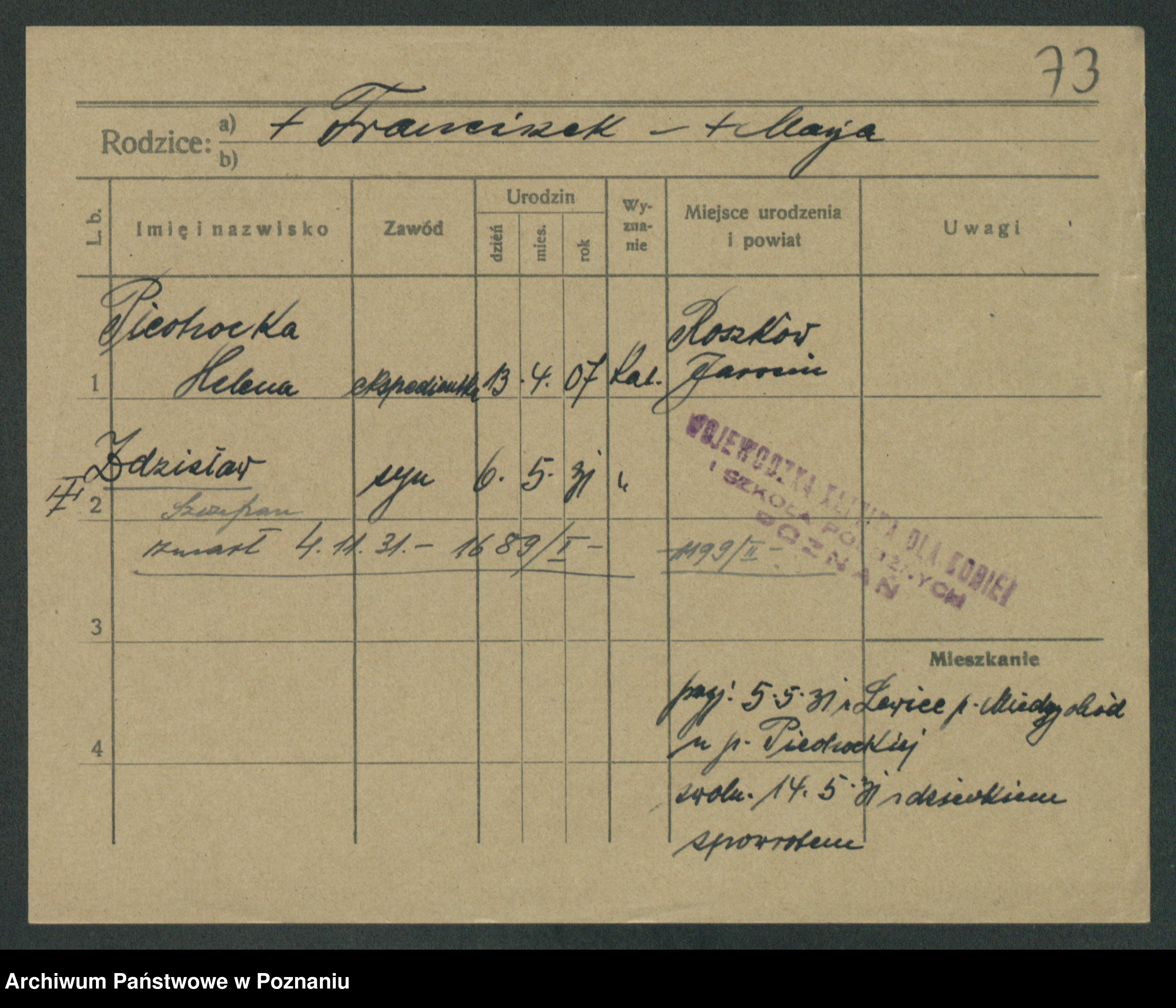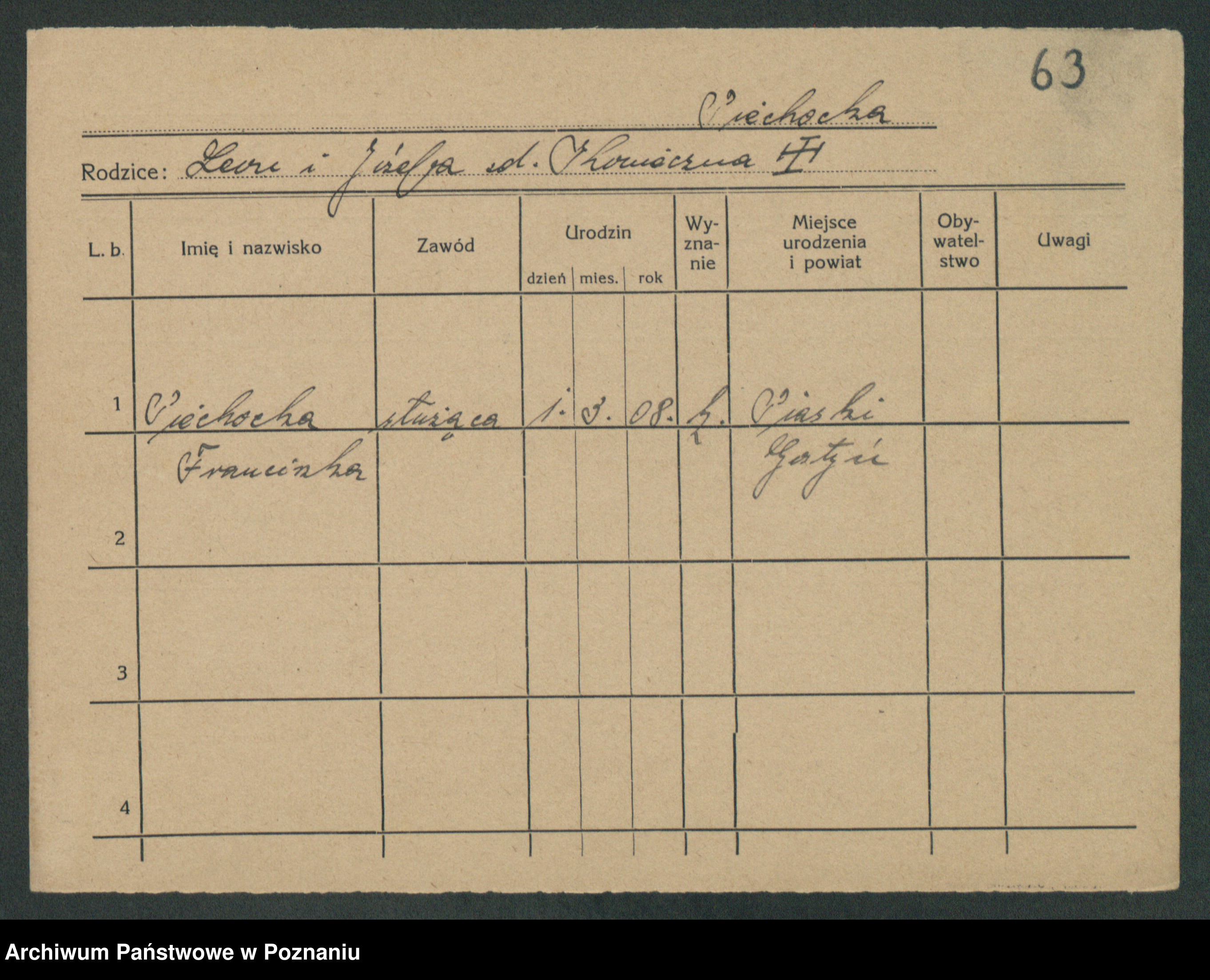Podgląd karty osobowej dostępny jest po kliknięciu na nazwisko lub ikonkę karty. Można dokonywać powiększenia (ikony na górze) lub przechodzić między kolejnymi skanami (strzałki po bokach).