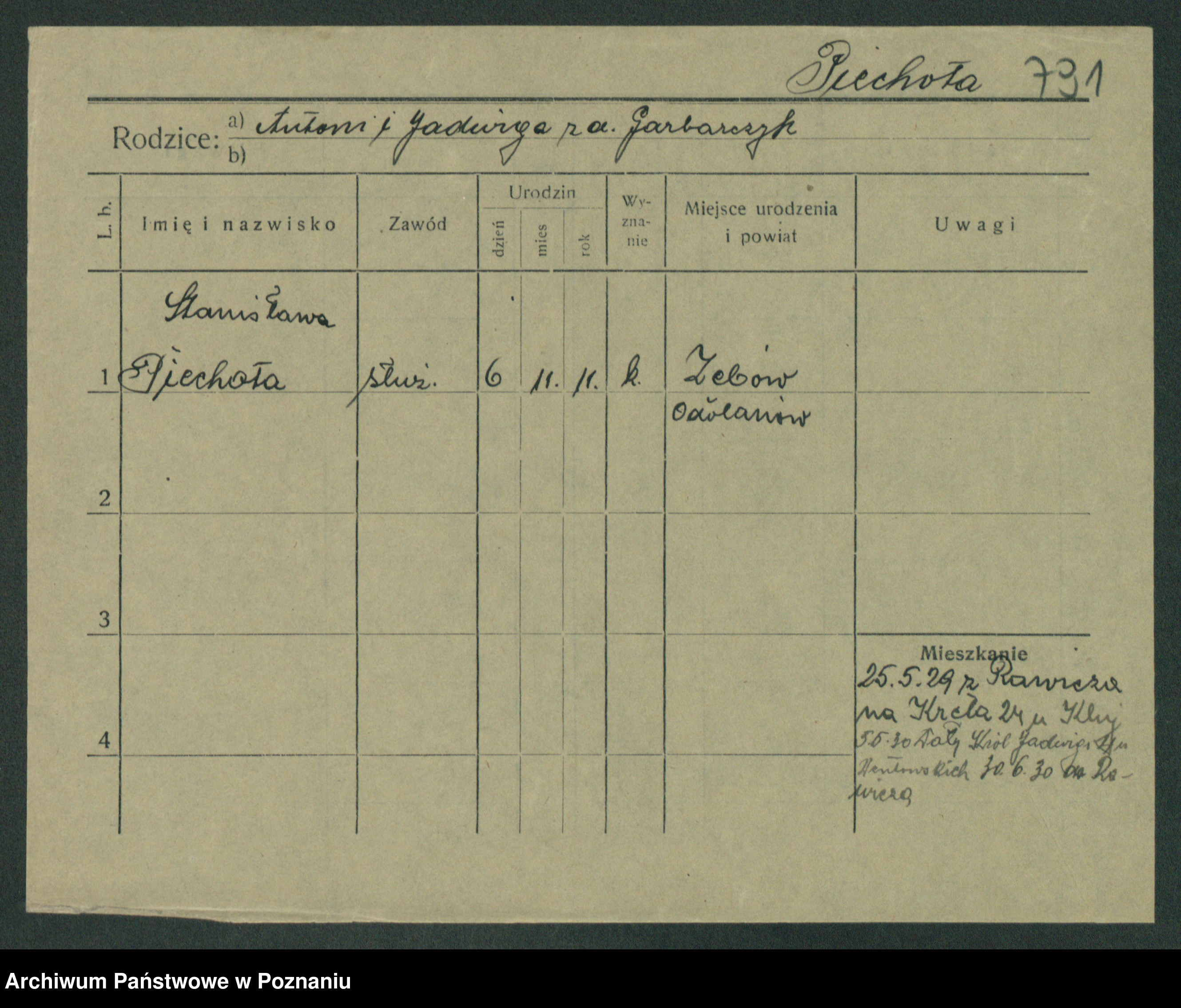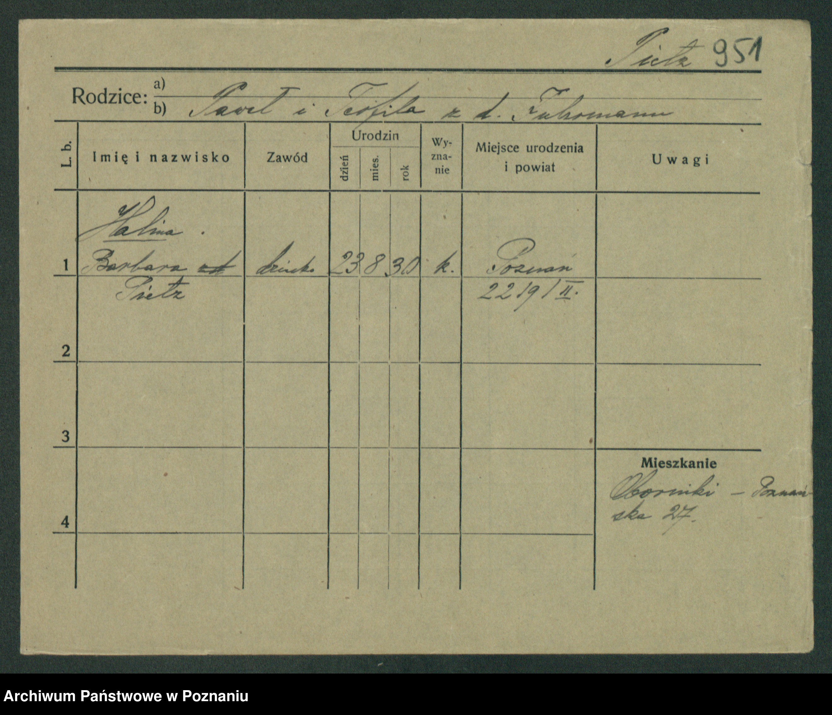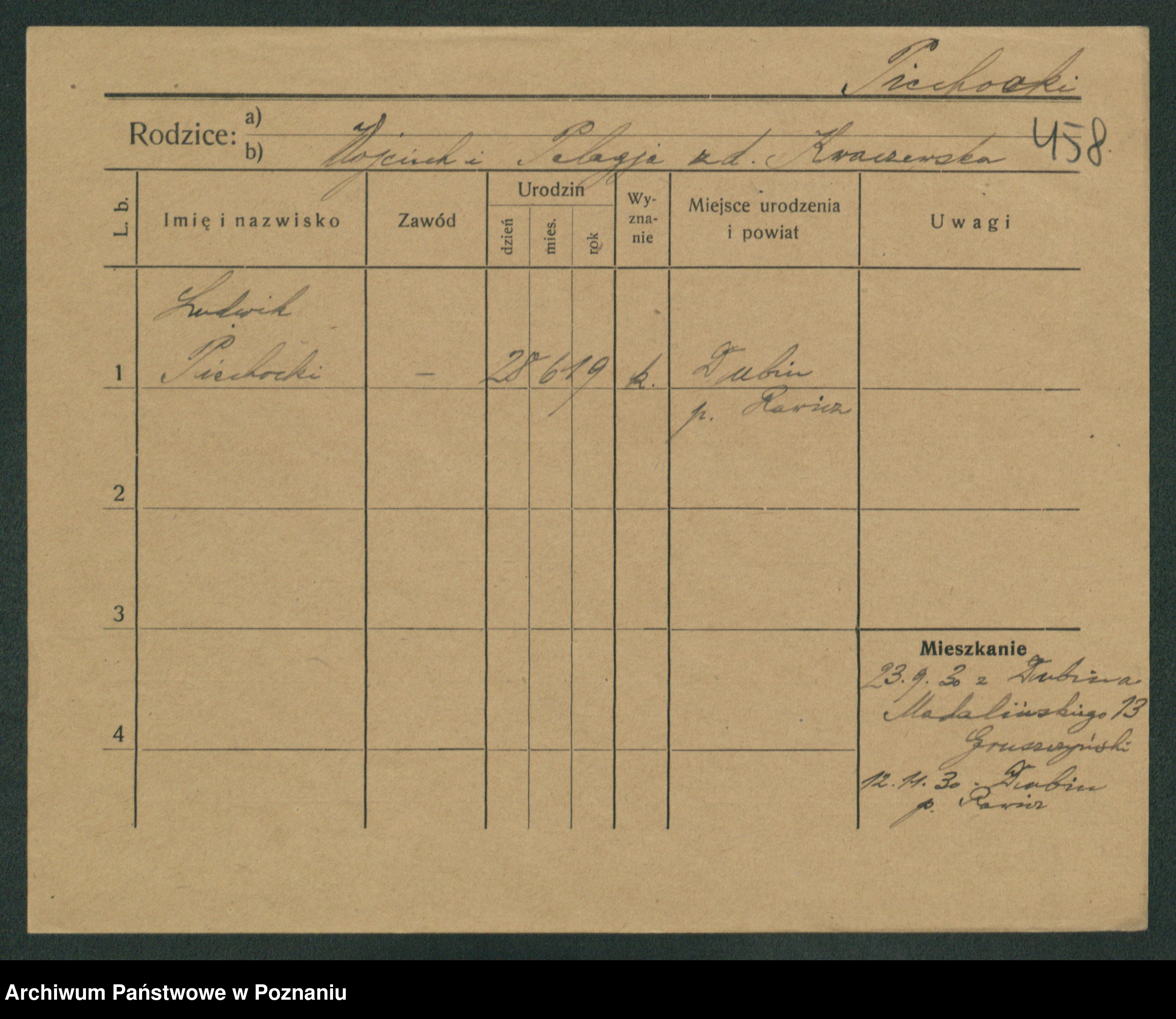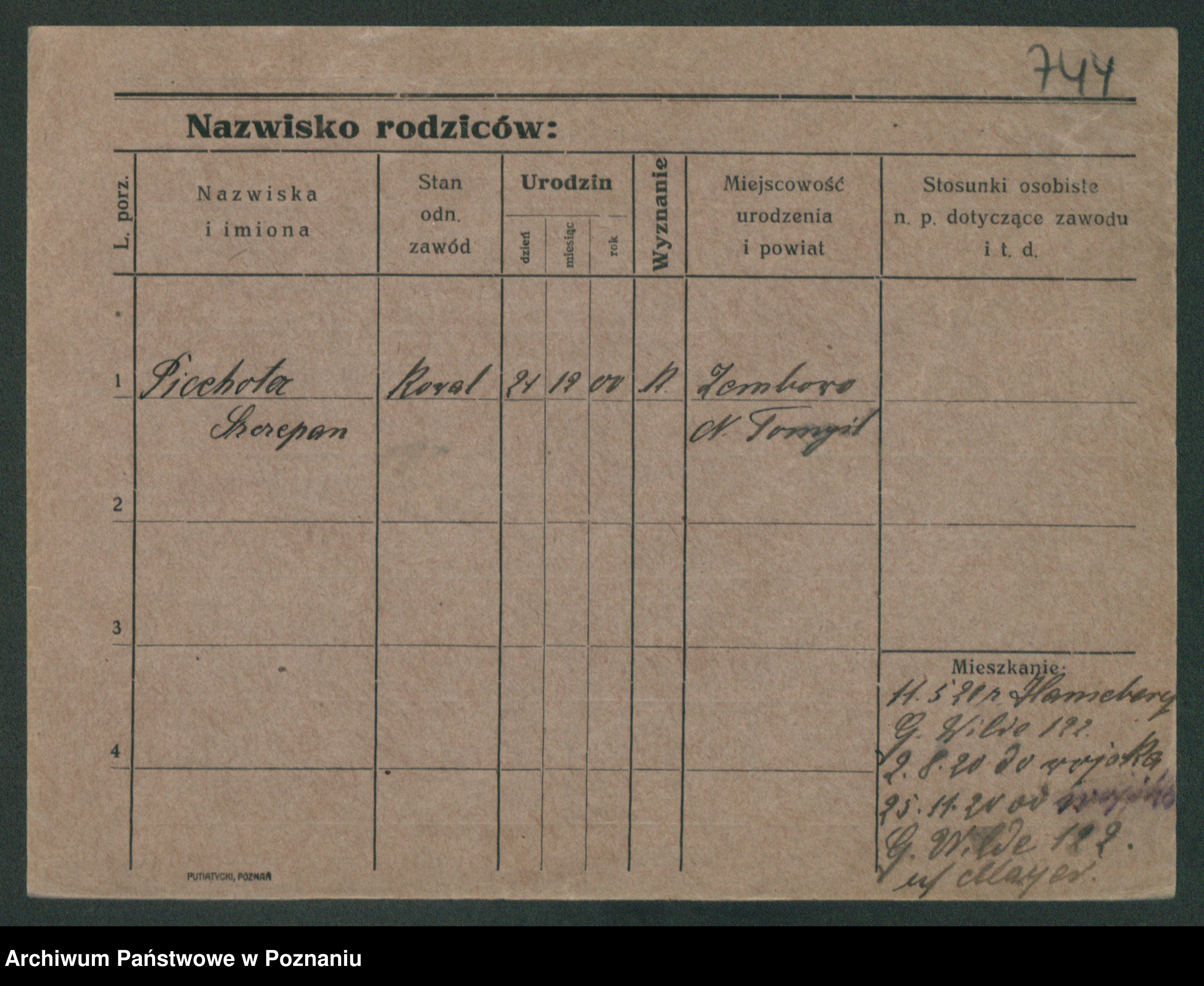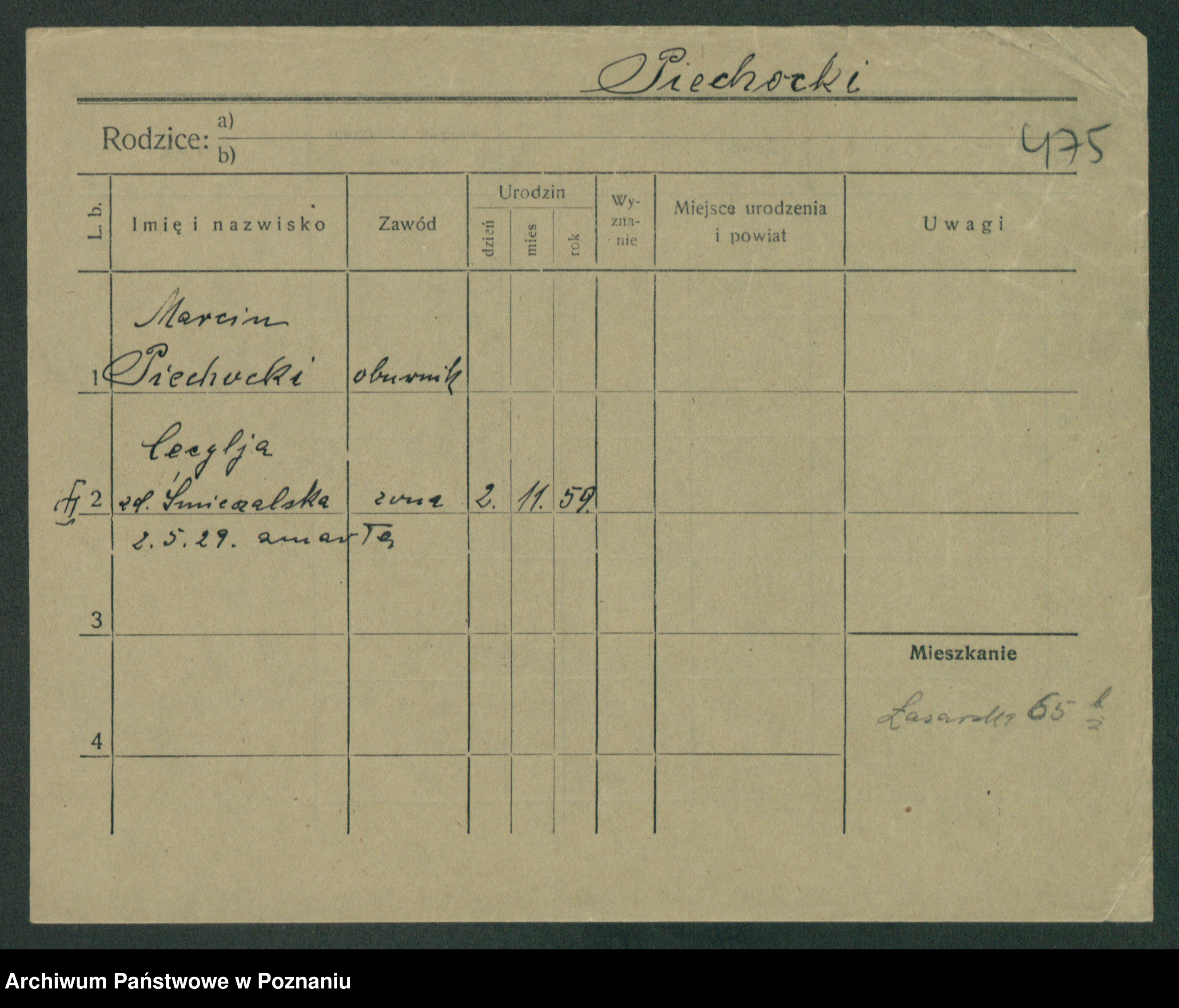 Podgląd karty osobowej dostępny jest po kliknięciu na nazwisko lub ikonkę karty. Można dokonywać powiększenia (ikony na górze) lub przechodzić między kolejnymi skanami (strzałki po bokach).