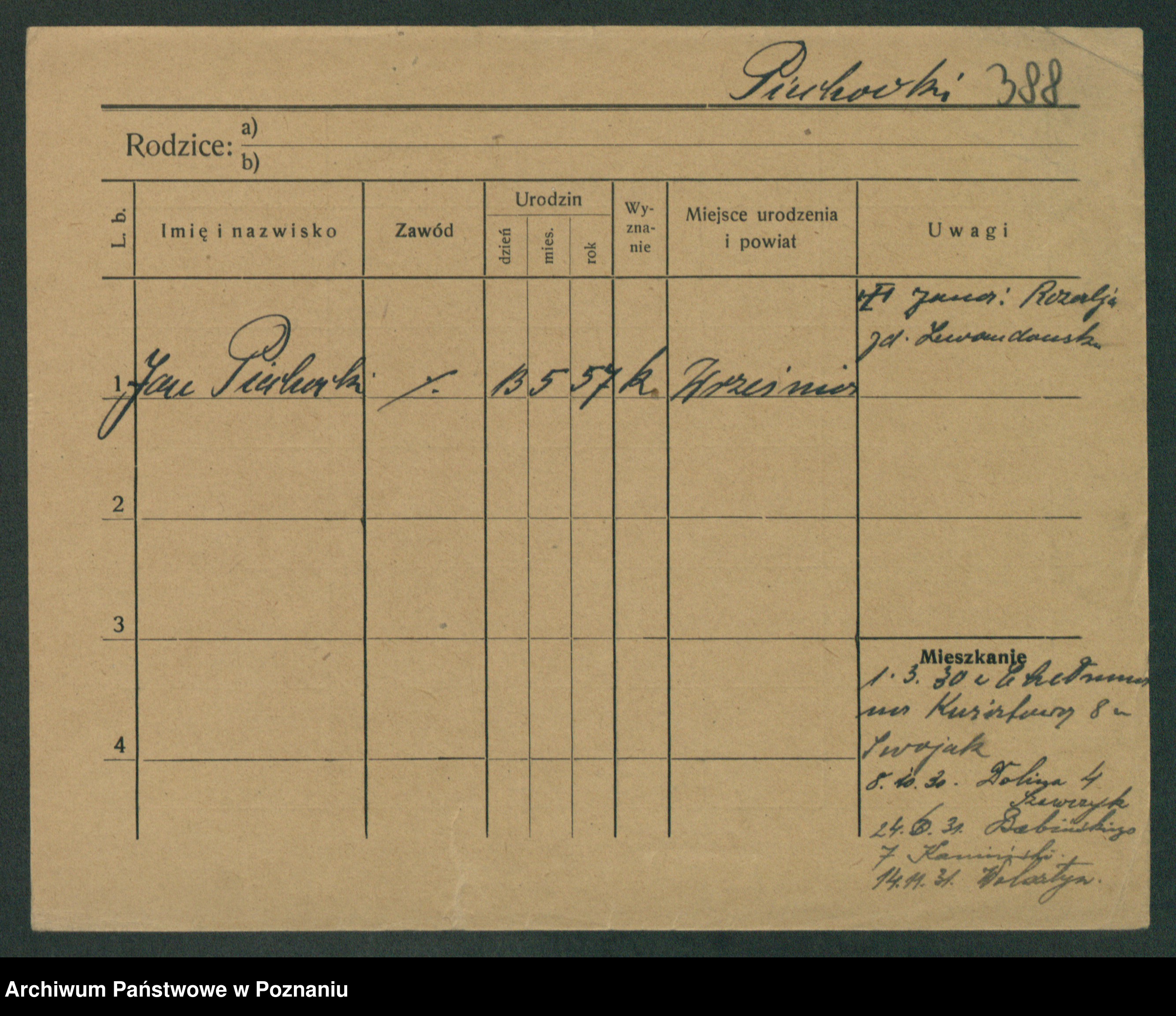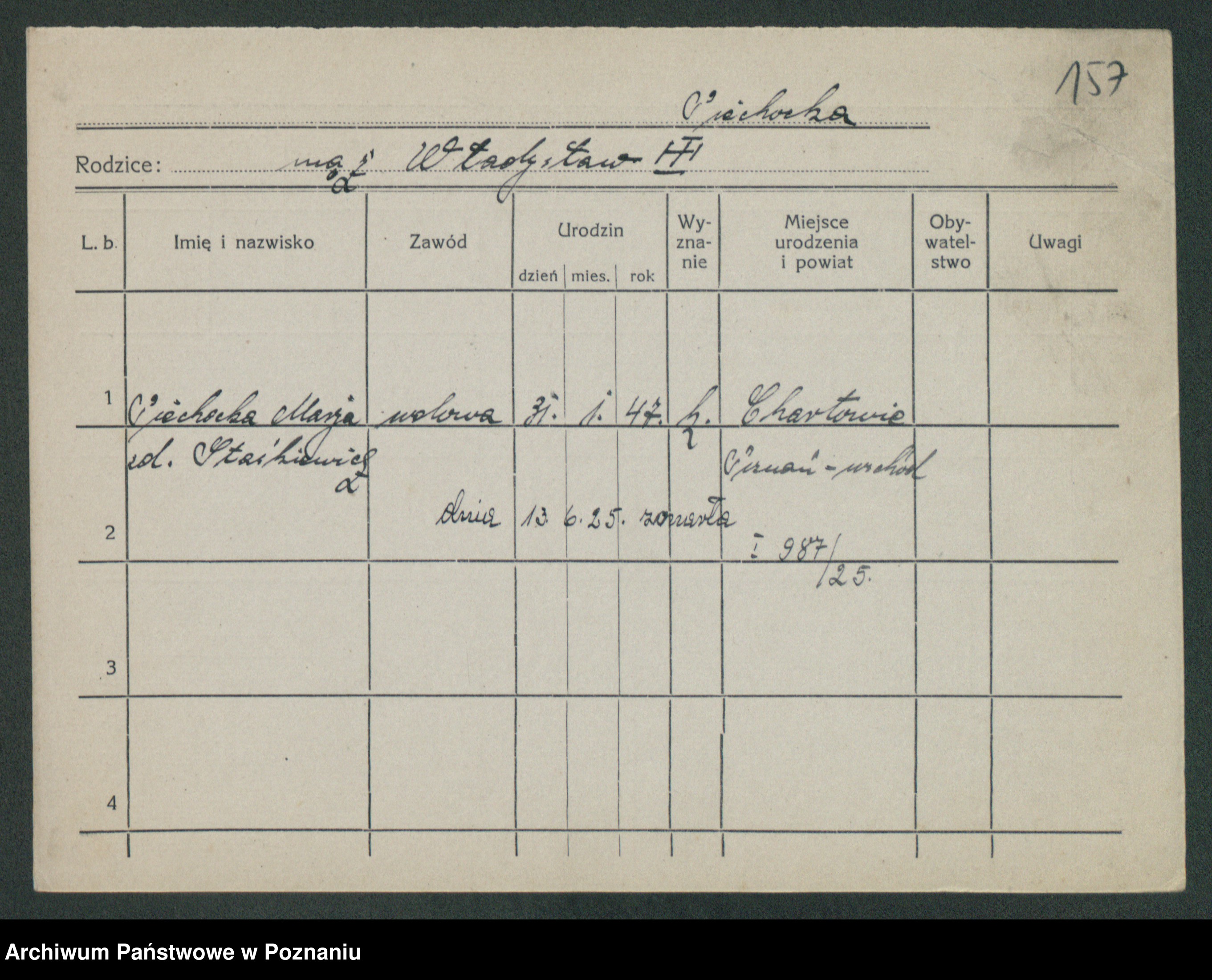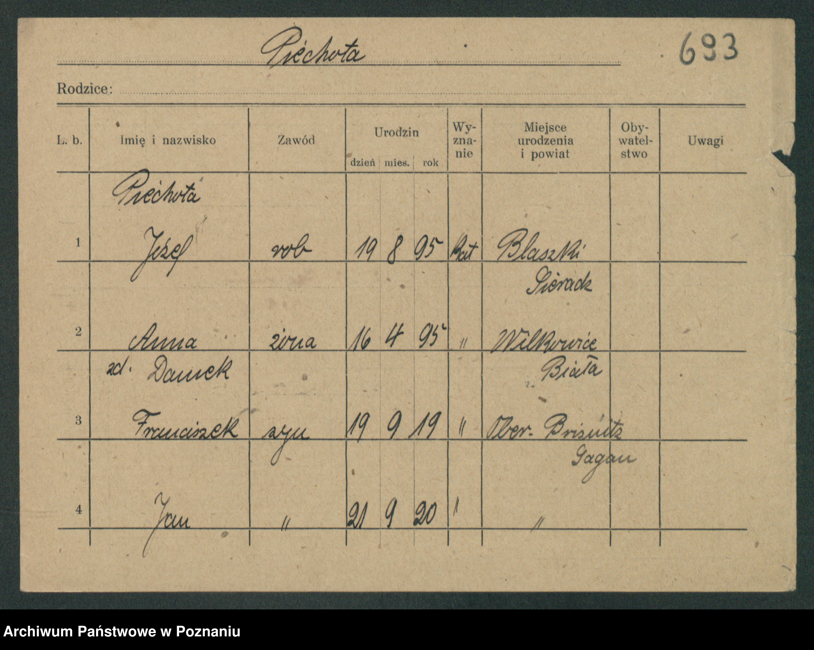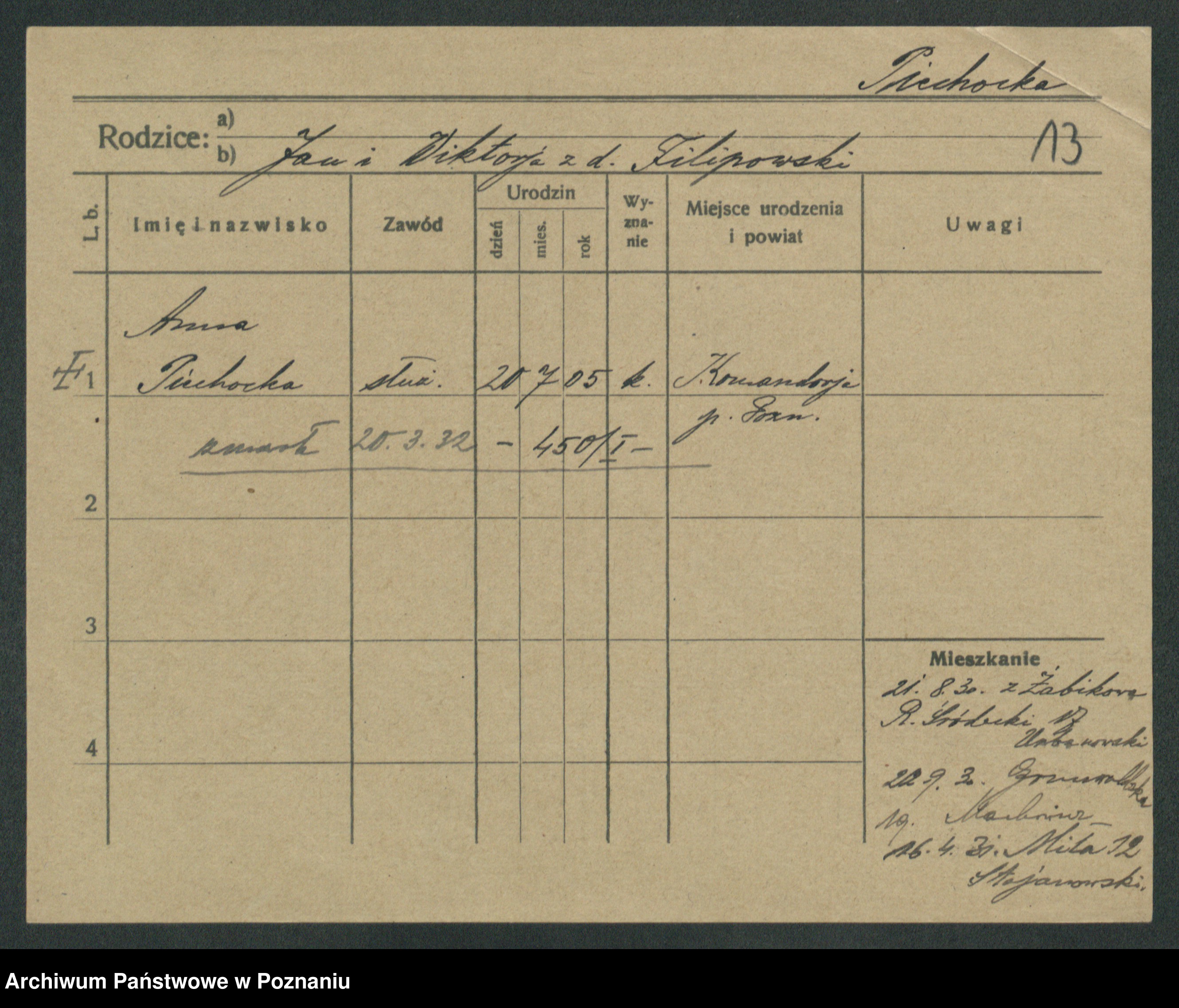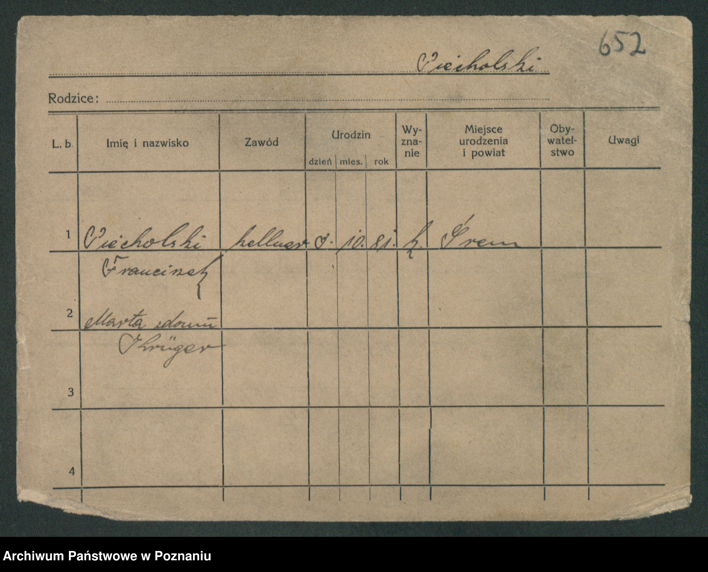 Podgląd karty osobowej dostępny jest po kliknięciu na nazwisko lub ikonkę karty. Można dokonywać powiększenia (ikony na górze) lub przechodzić między kolejnymi skanami (strzałki po bokach).