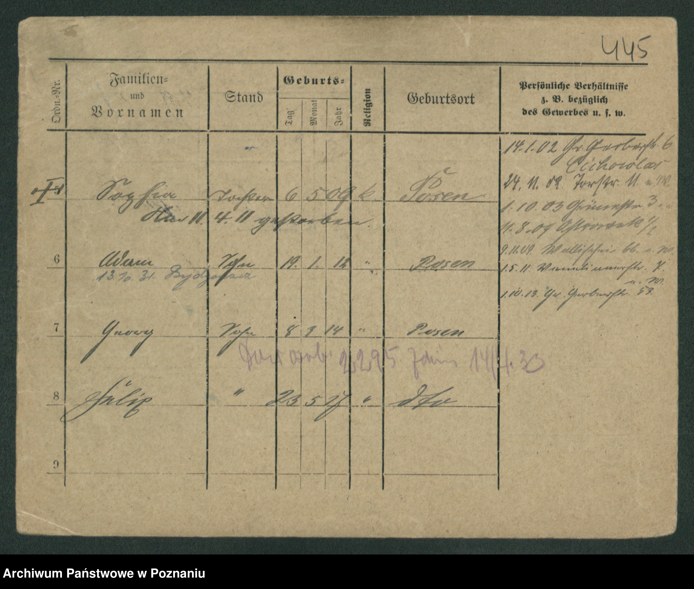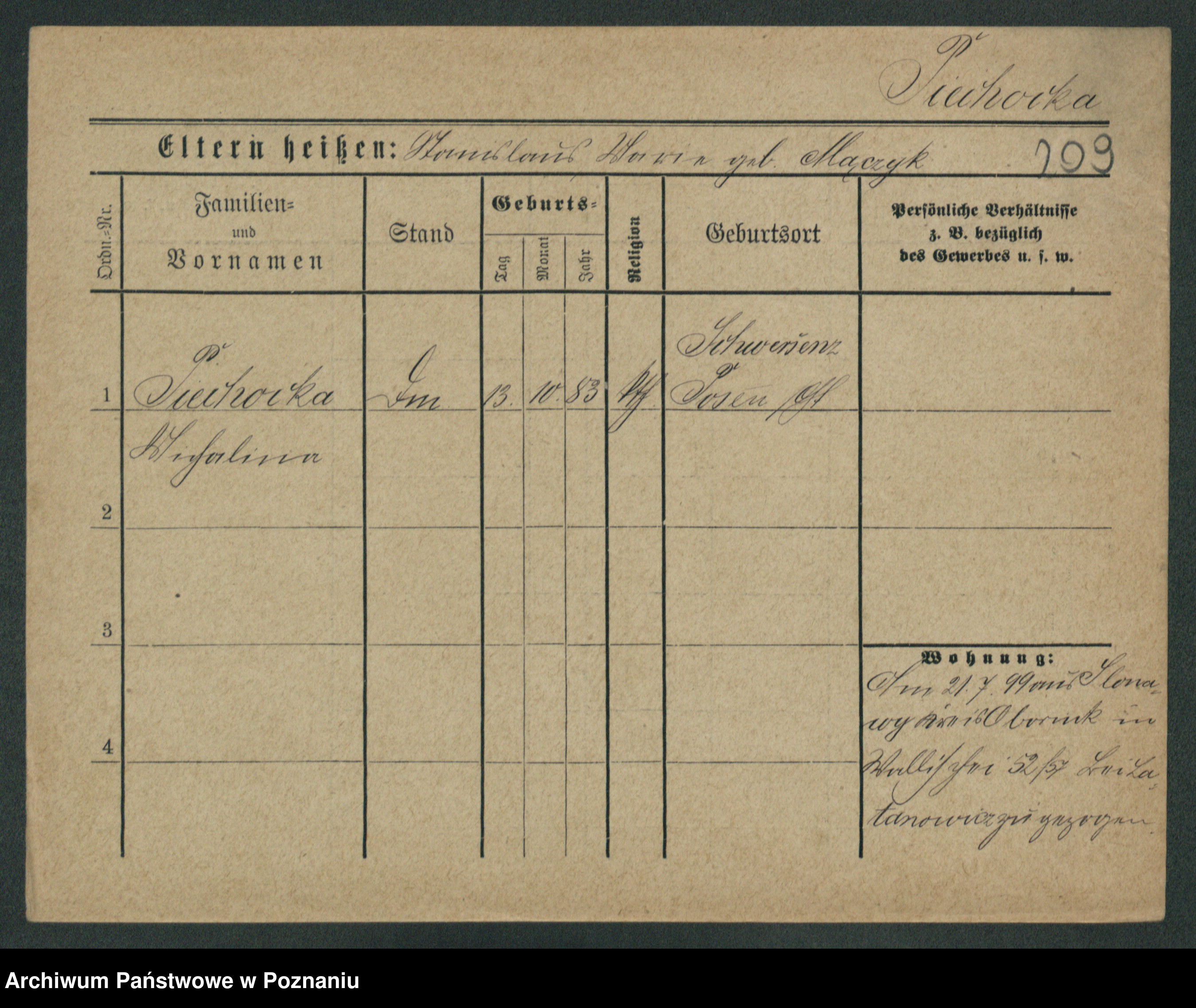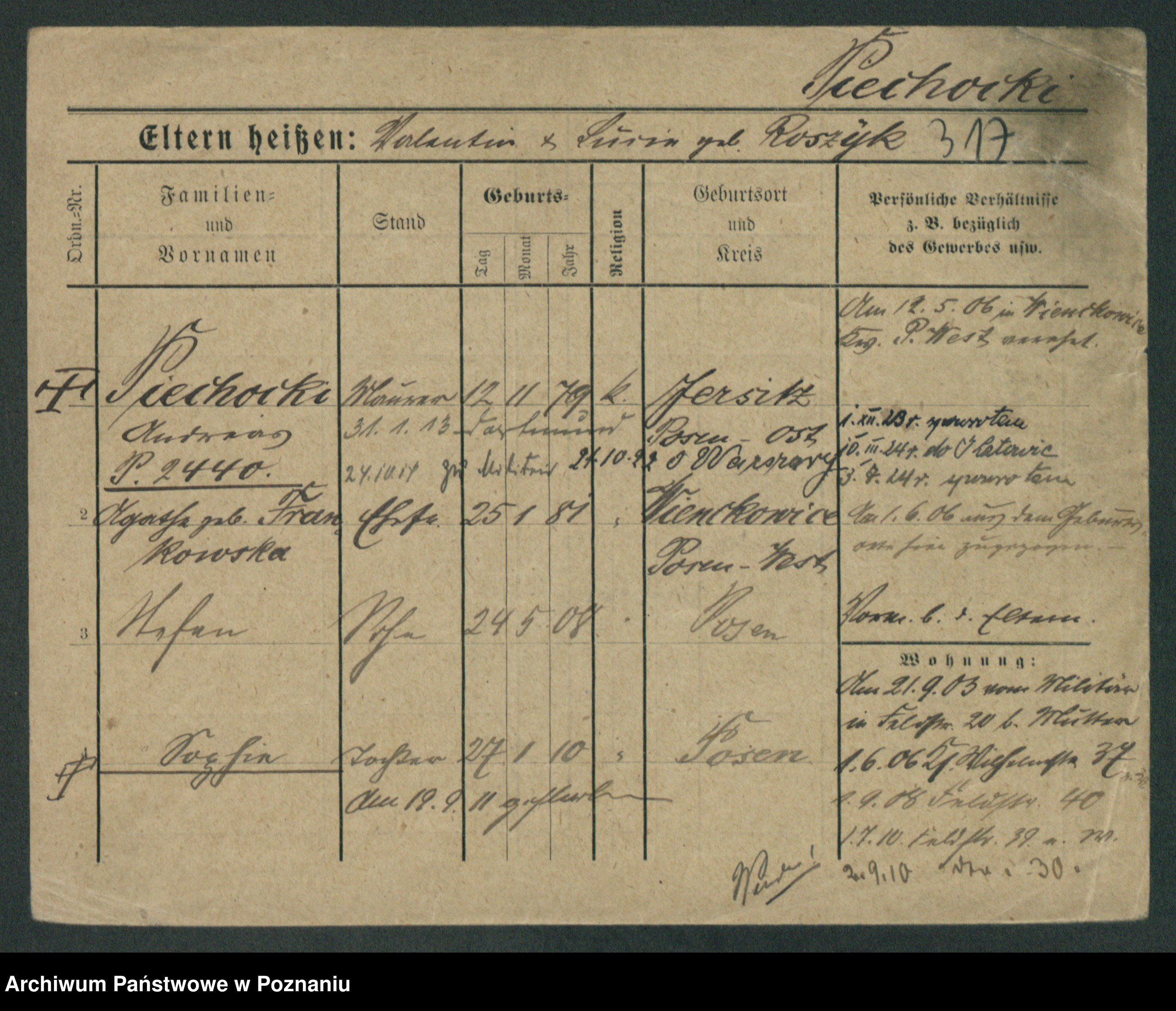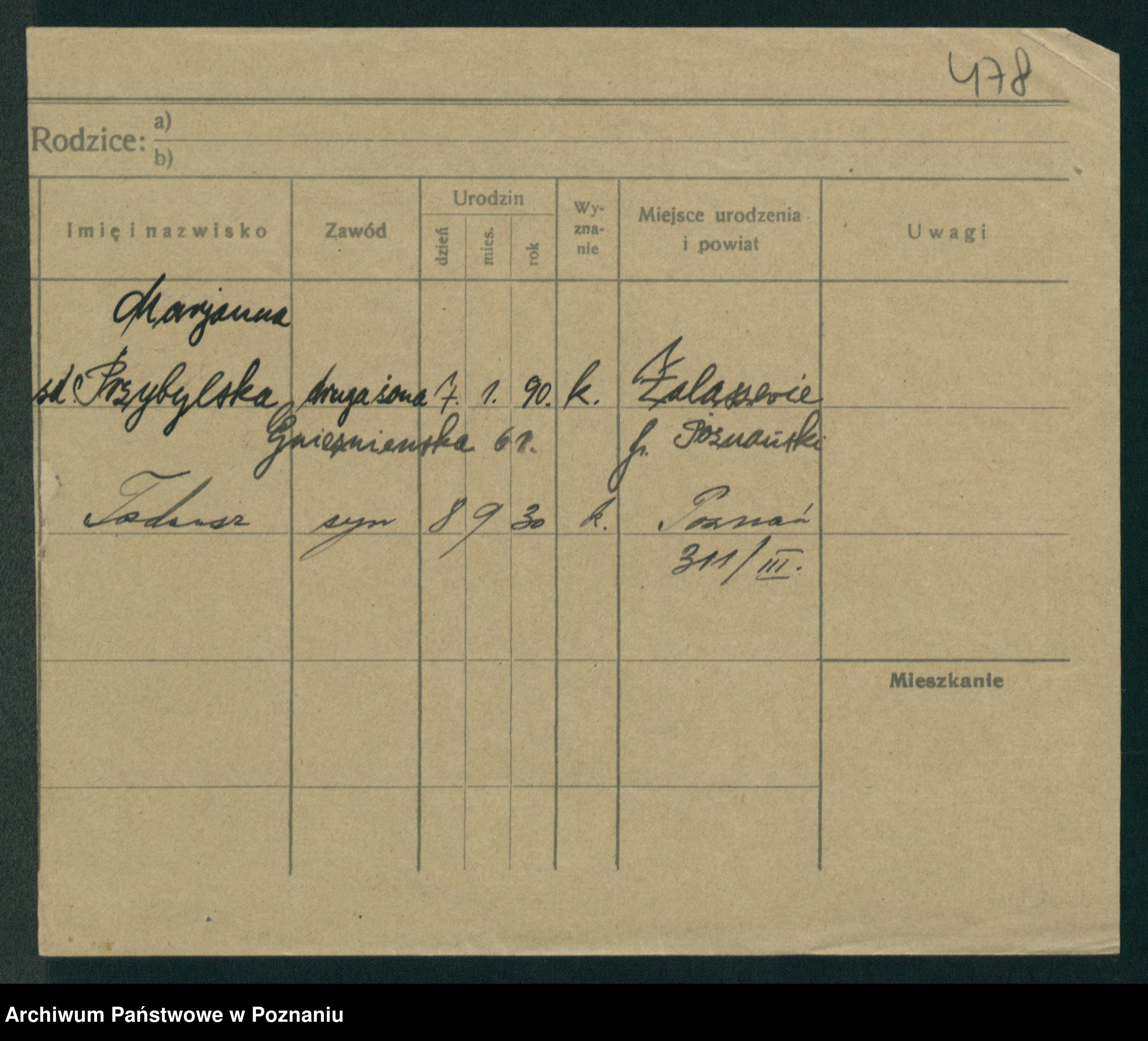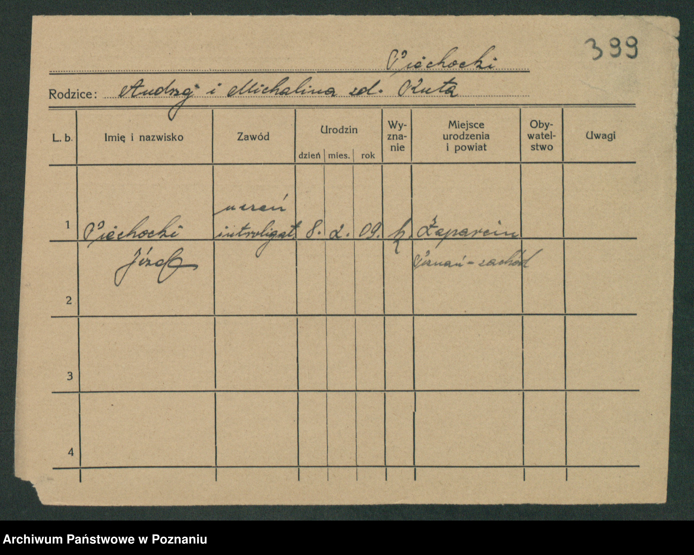 Podgląd karty osobowej dostępny jest po kliknięciu na nazwisko lub ikonkę karty. Można dokonywać powiększenia (ikony na górze) lub przechodzić między kolejnymi skanami (strzałki po bokach).