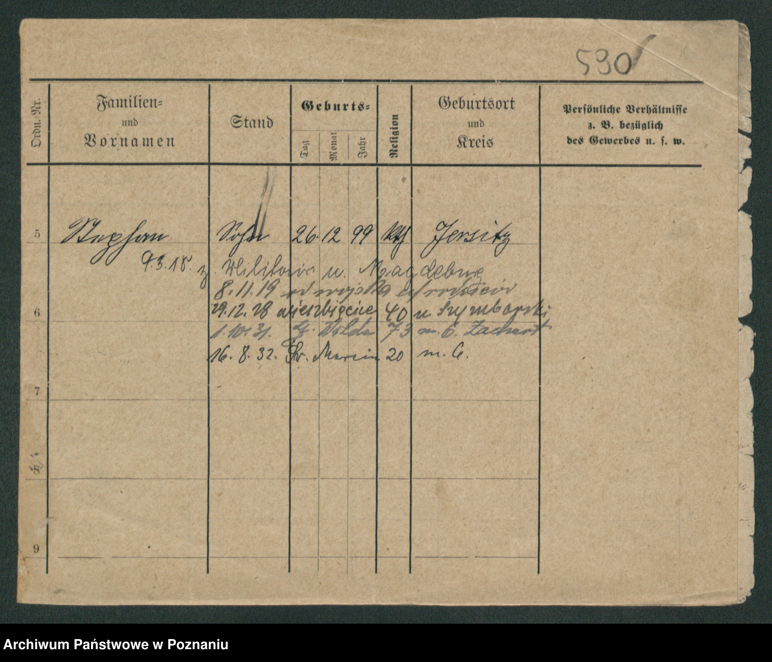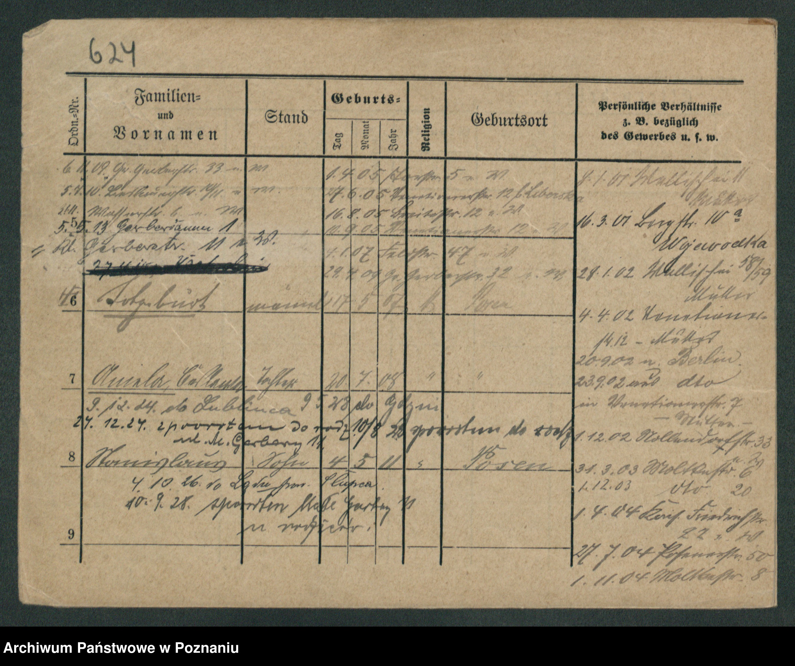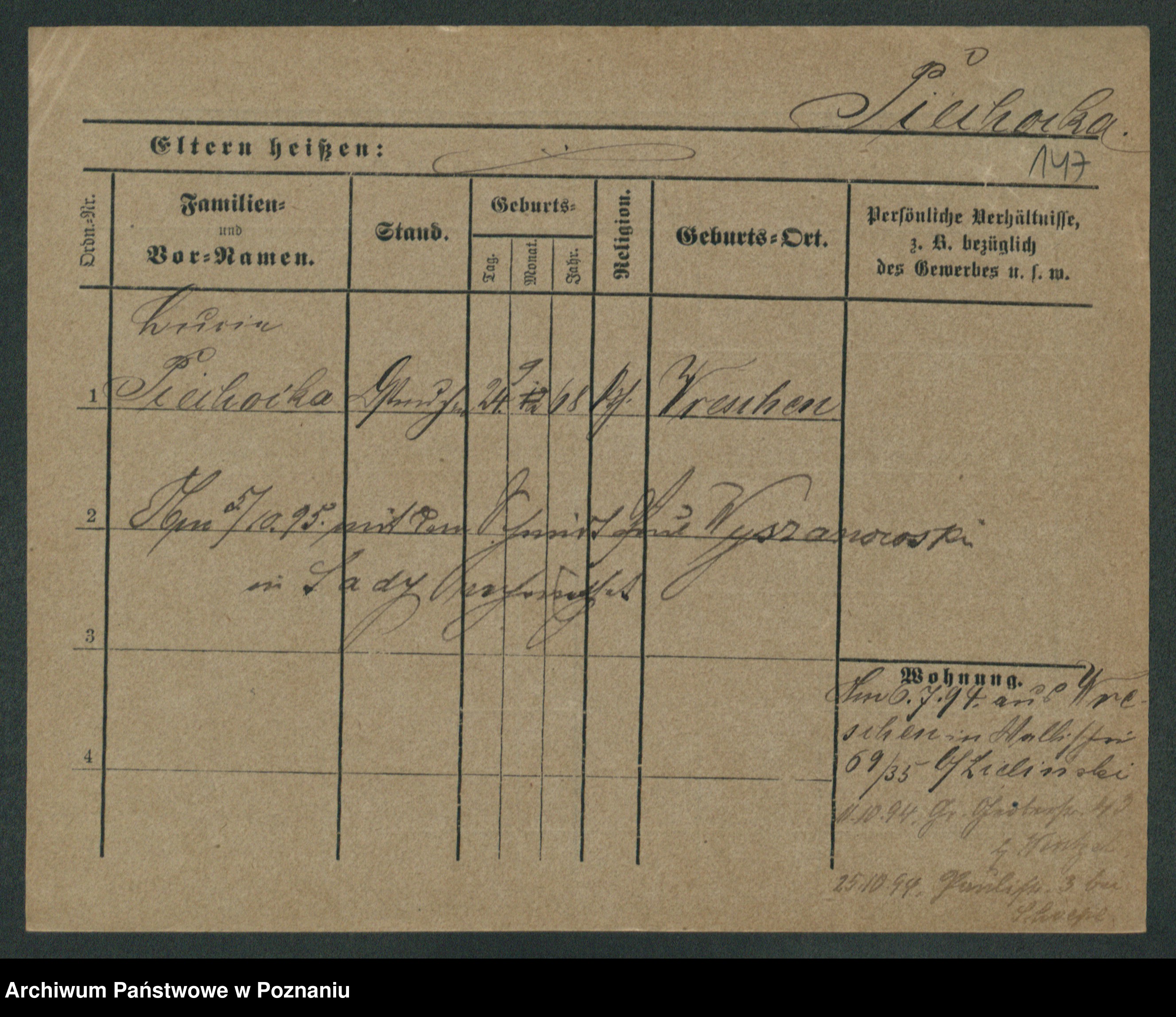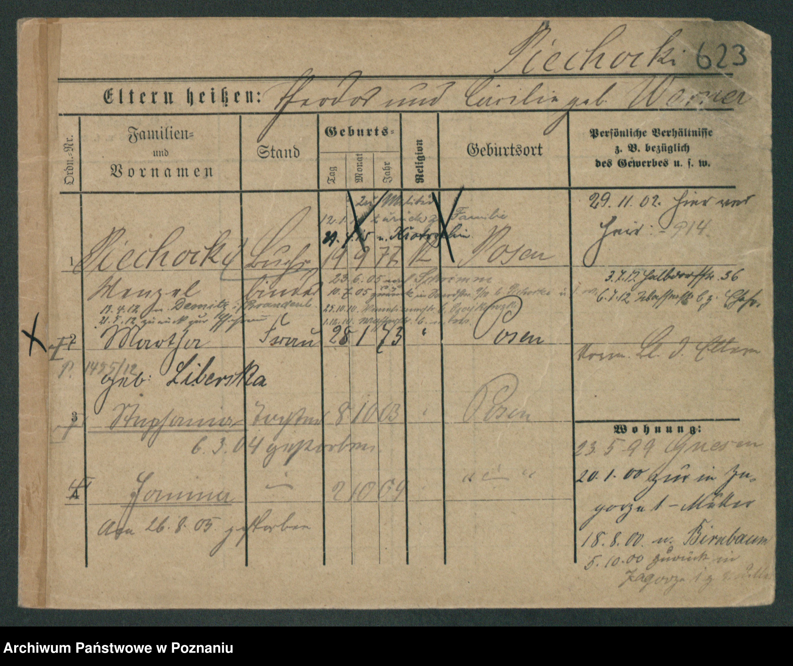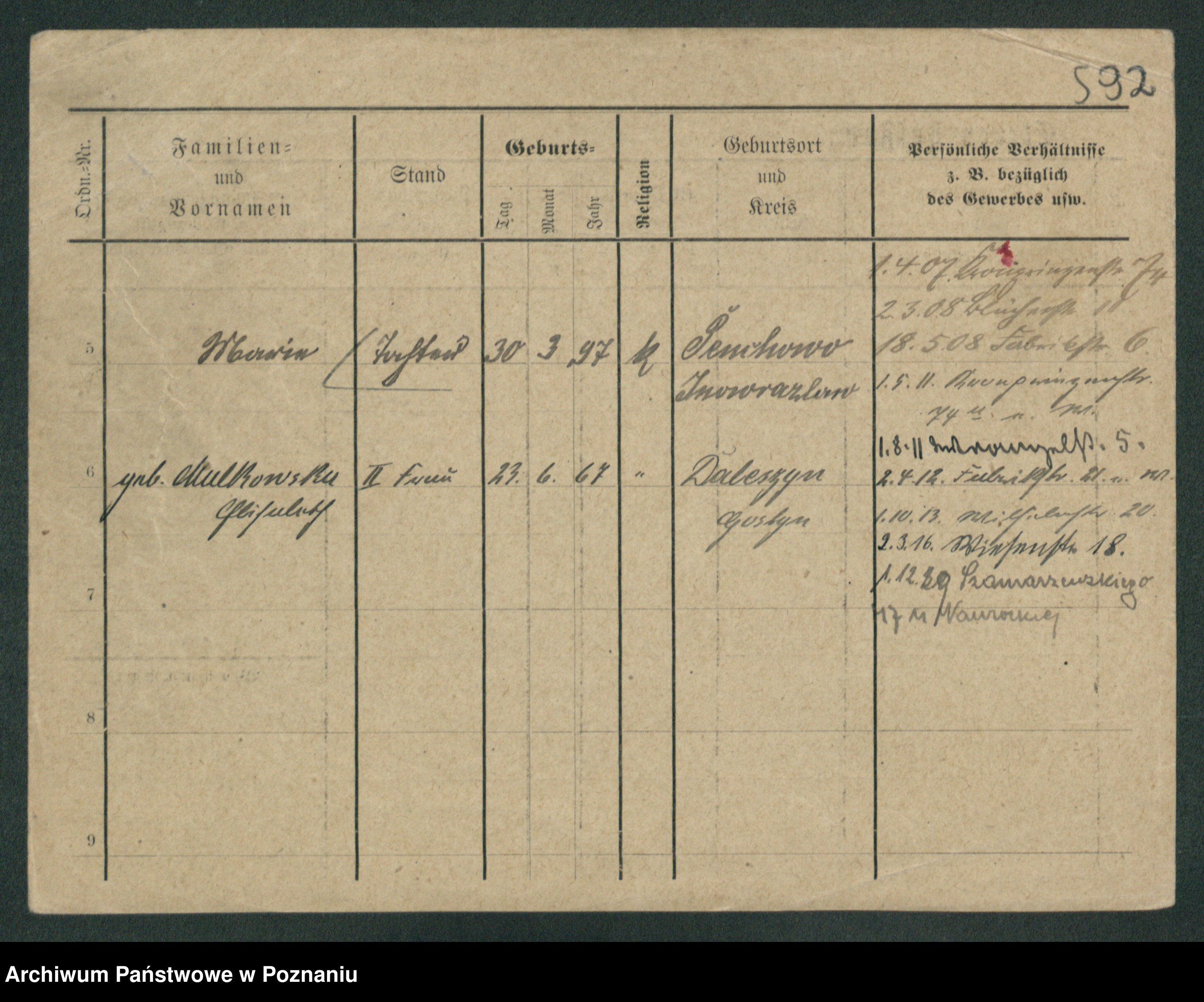 Podgląd karty osobowej dostępny jest po kliknięciu na nazwisko lub ikonkę karty. Można dokonywać powiększenia (ikony na górze) lub przechodzić między kolejnymi skanami (strzałki po bokach).
