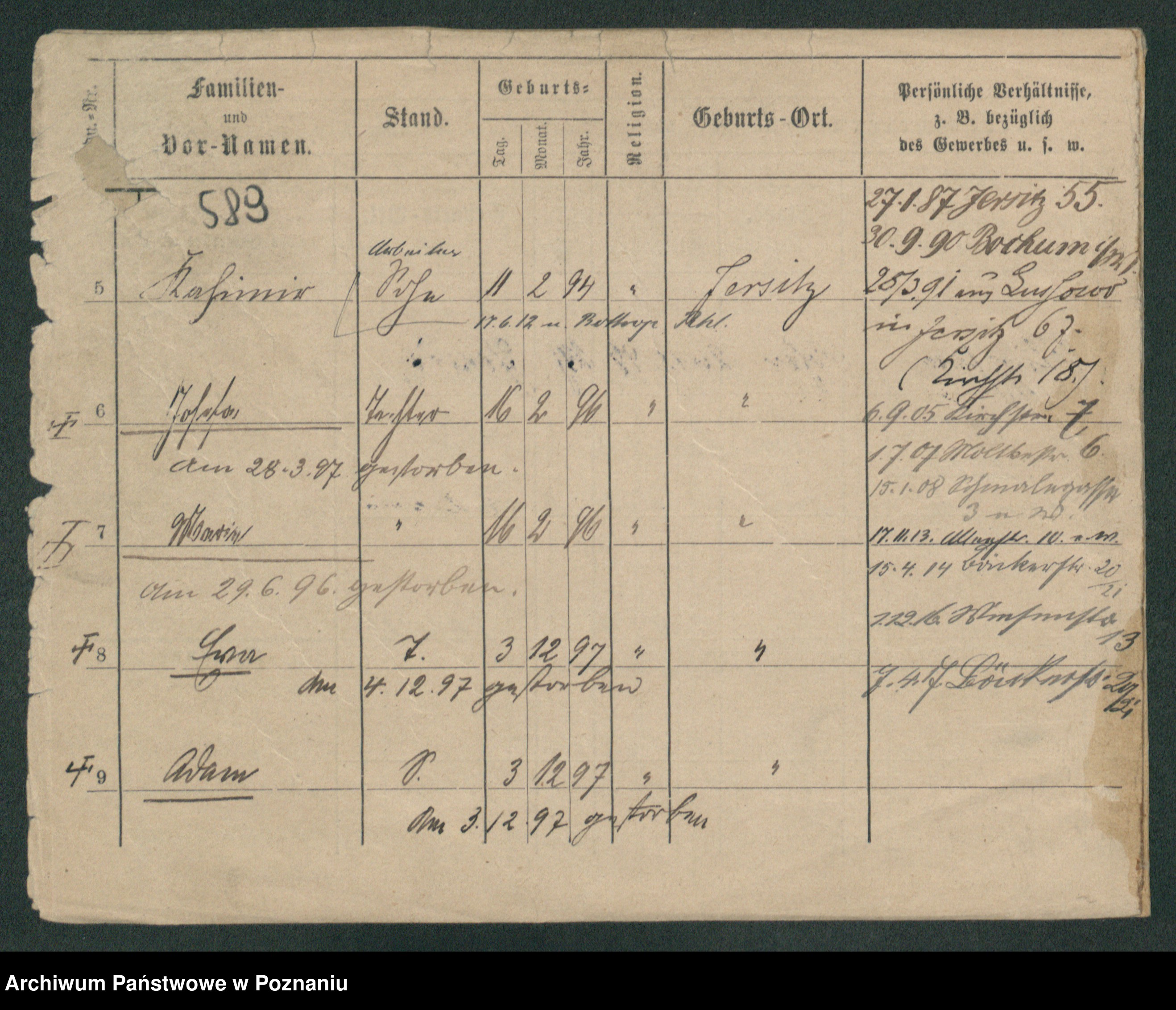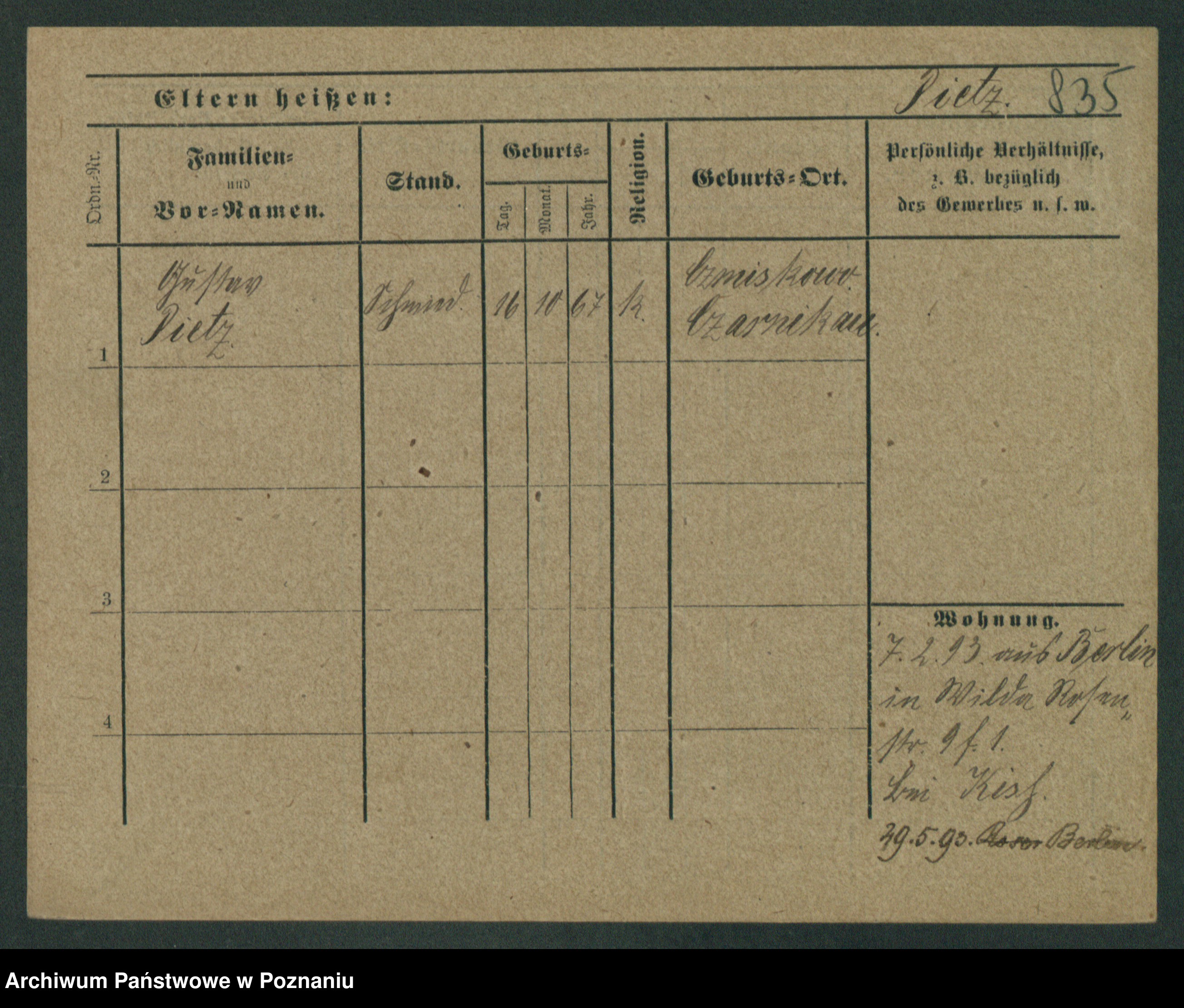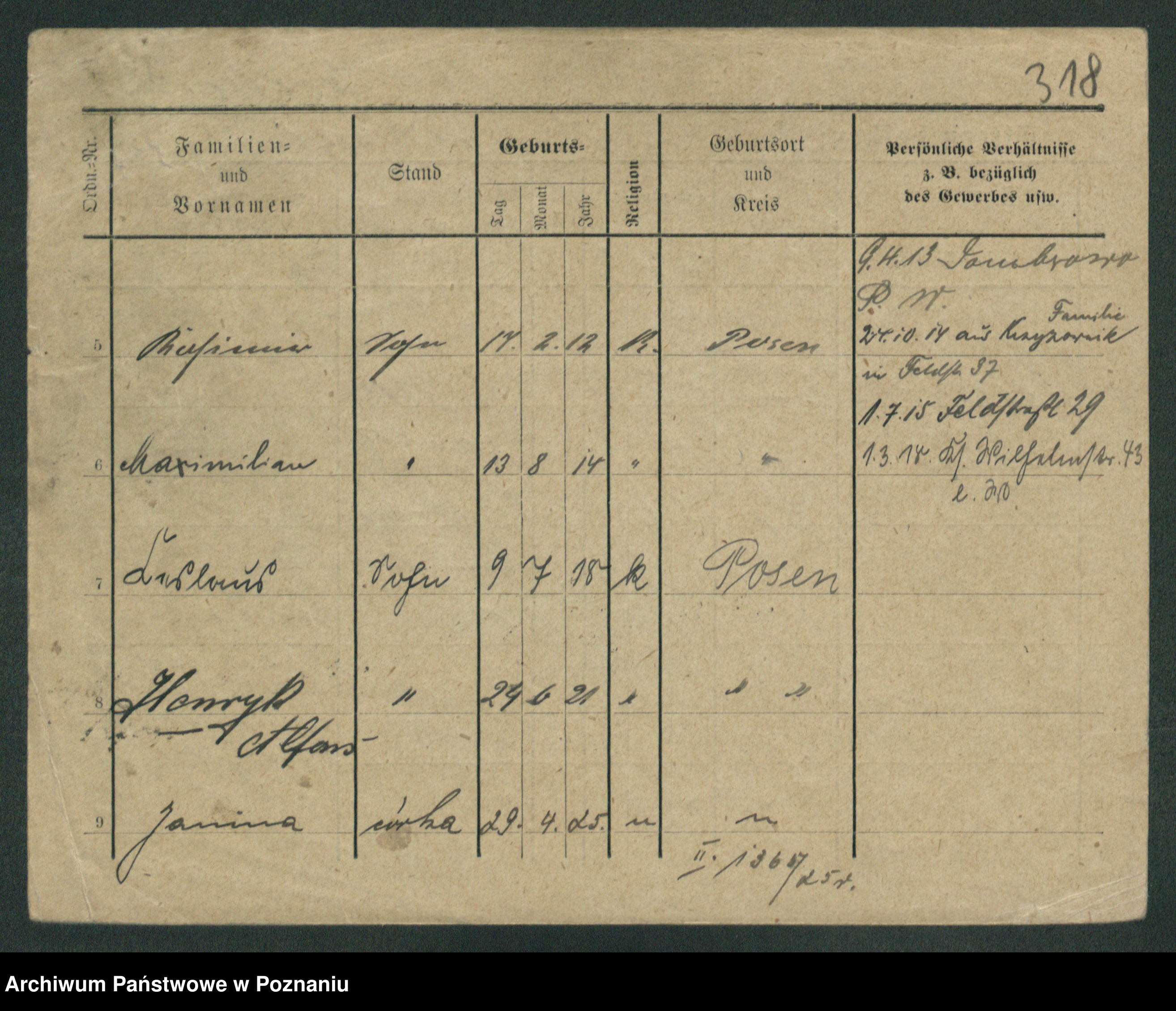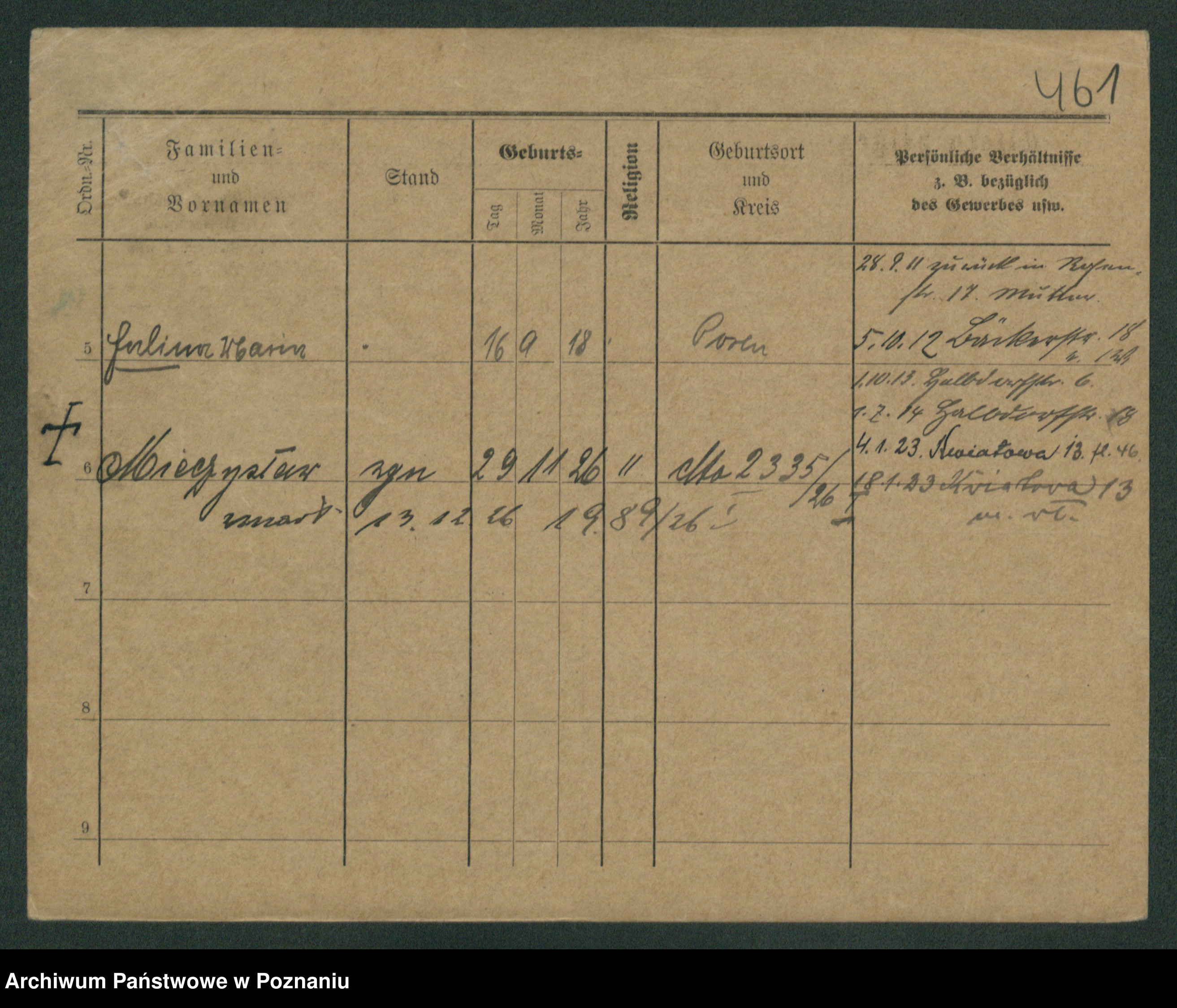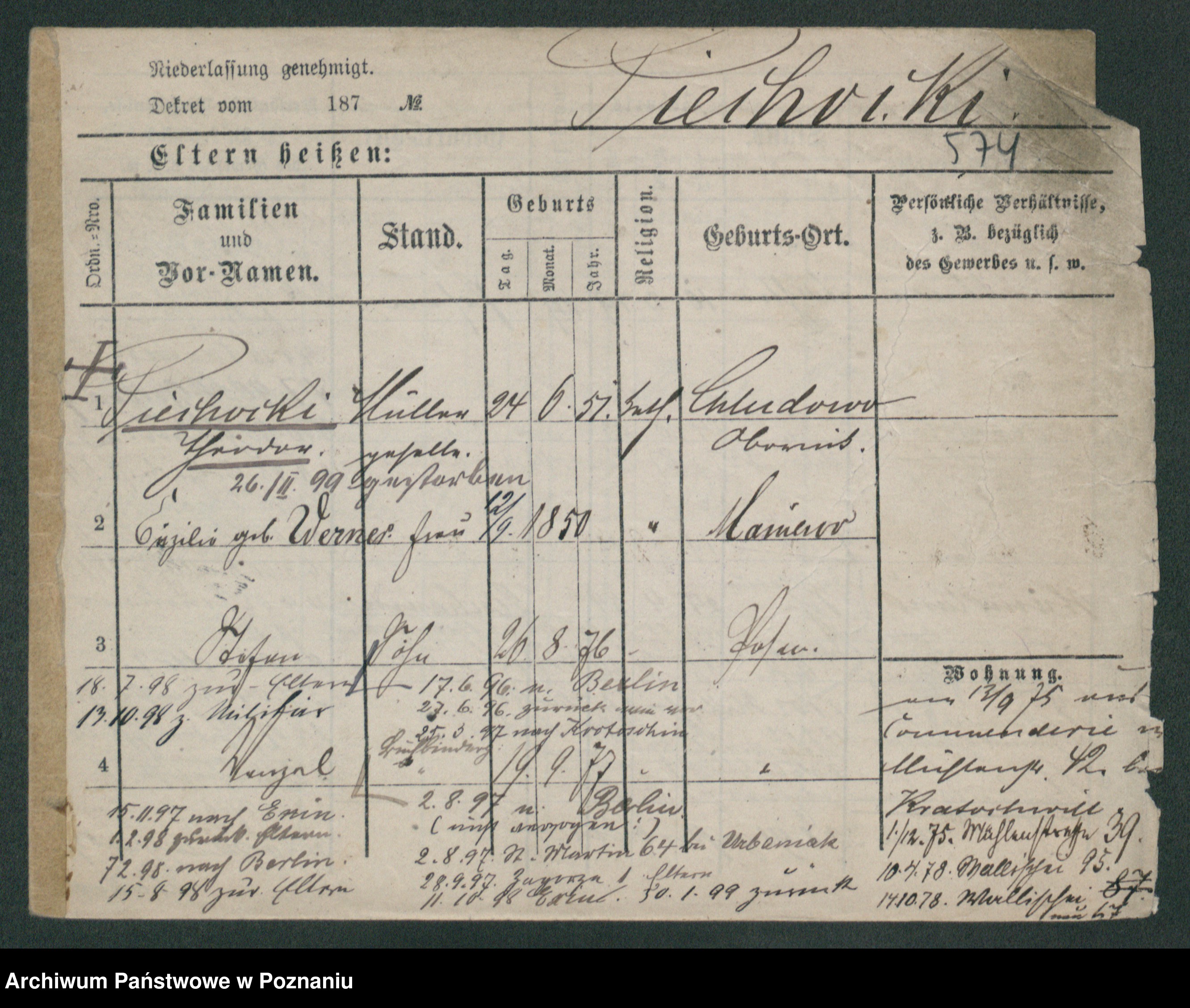 Podgląd karty osobowej dostępny jest po kliknięciu na nazwisko lub ikonkę karty. Można dokonywać powiększenia (ikony na górze) lub przechodzić między kolejnymi skanami (strzałki po bokach).