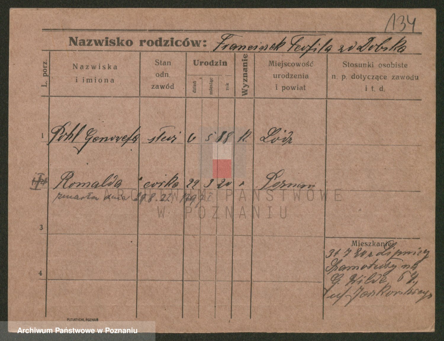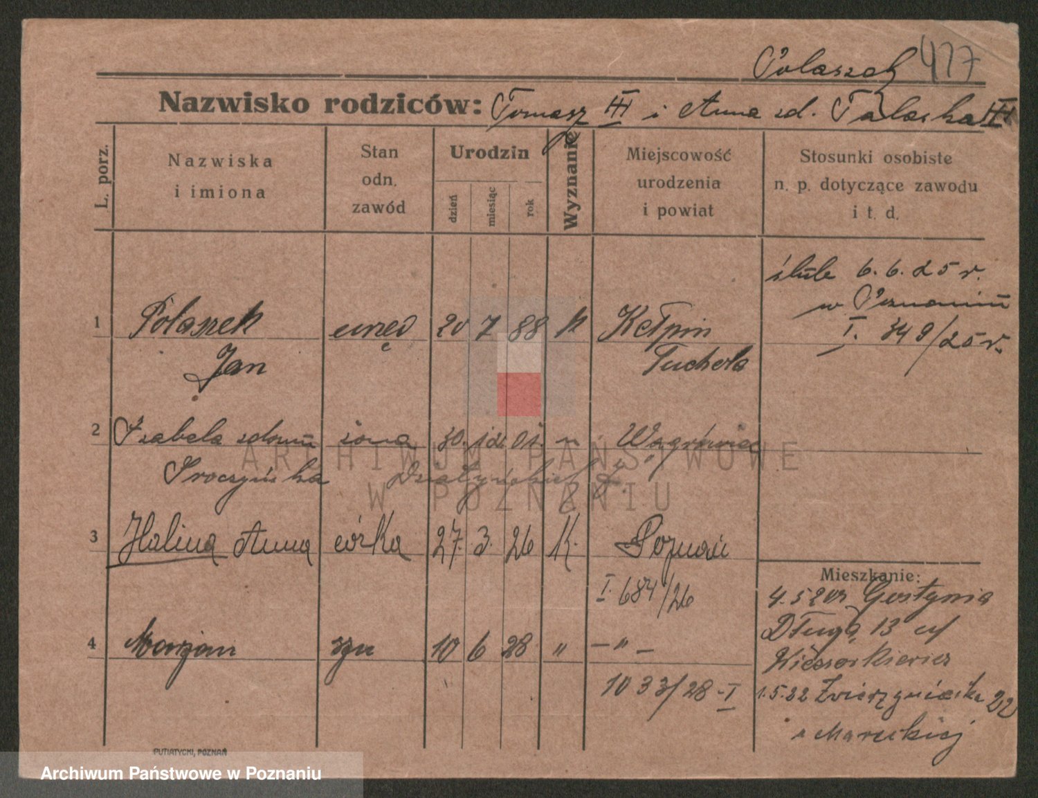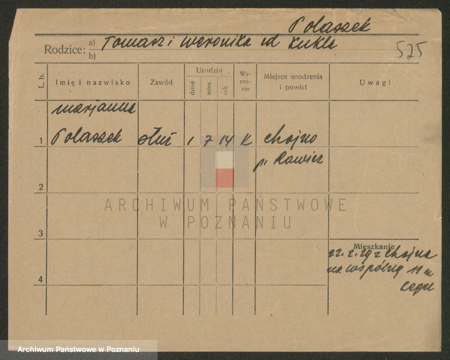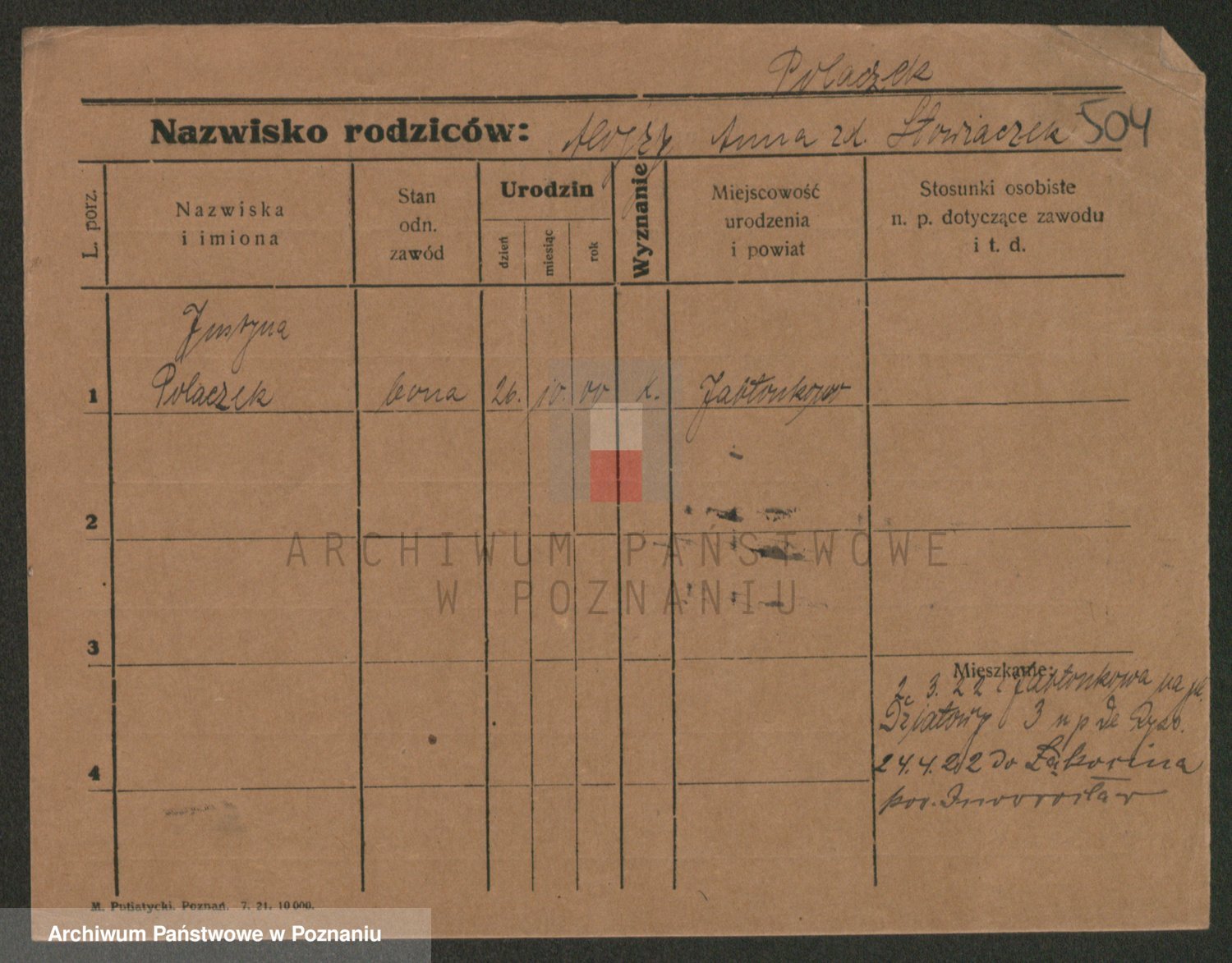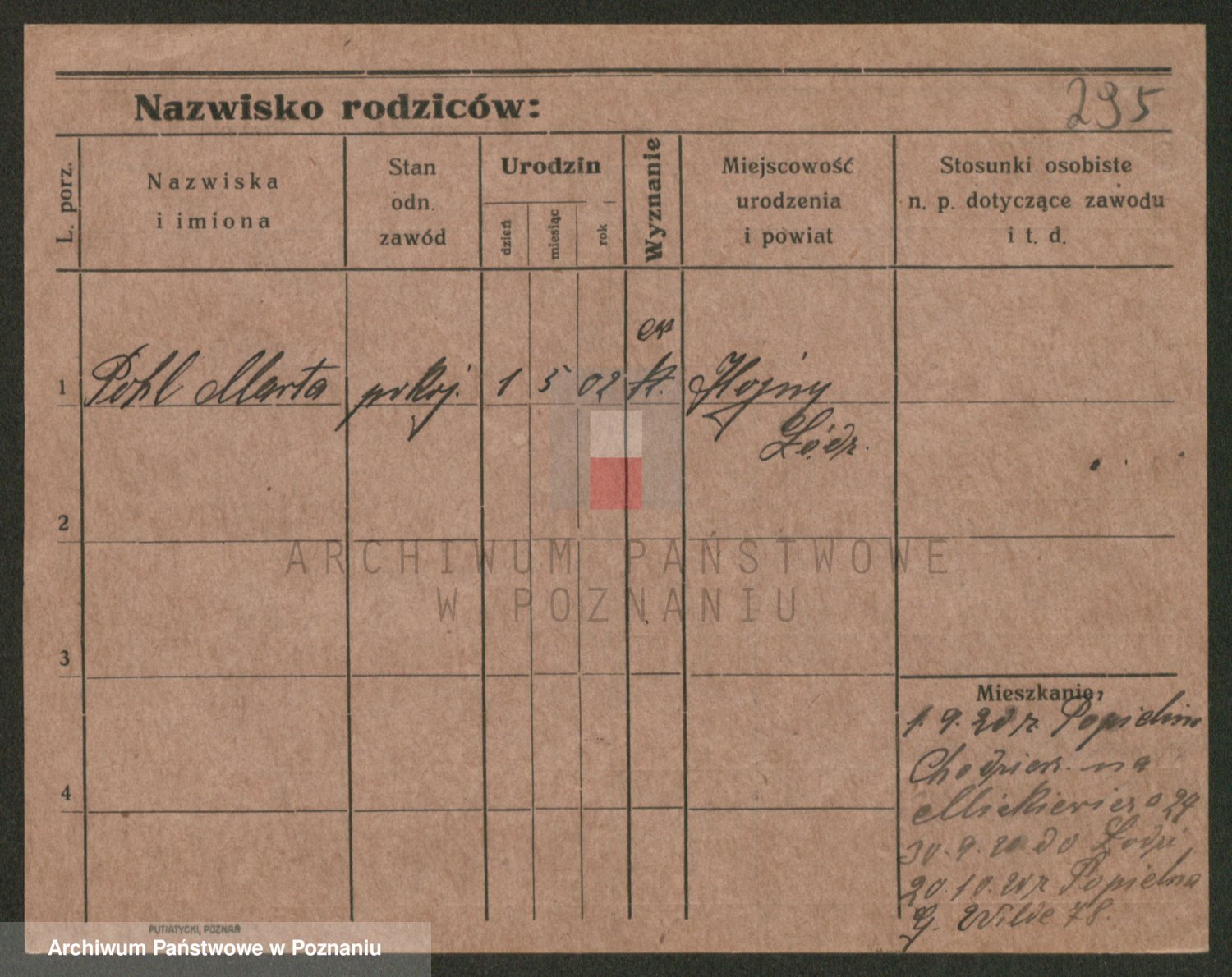 Podgląd karty osobowej dostępny jest po kliknięciu na nazwisko lub ikonkę karty. Można dokonywać powiększenia (ikony na górze) lub przechodzić między kolejnymi skanami (strzałki po bokach).