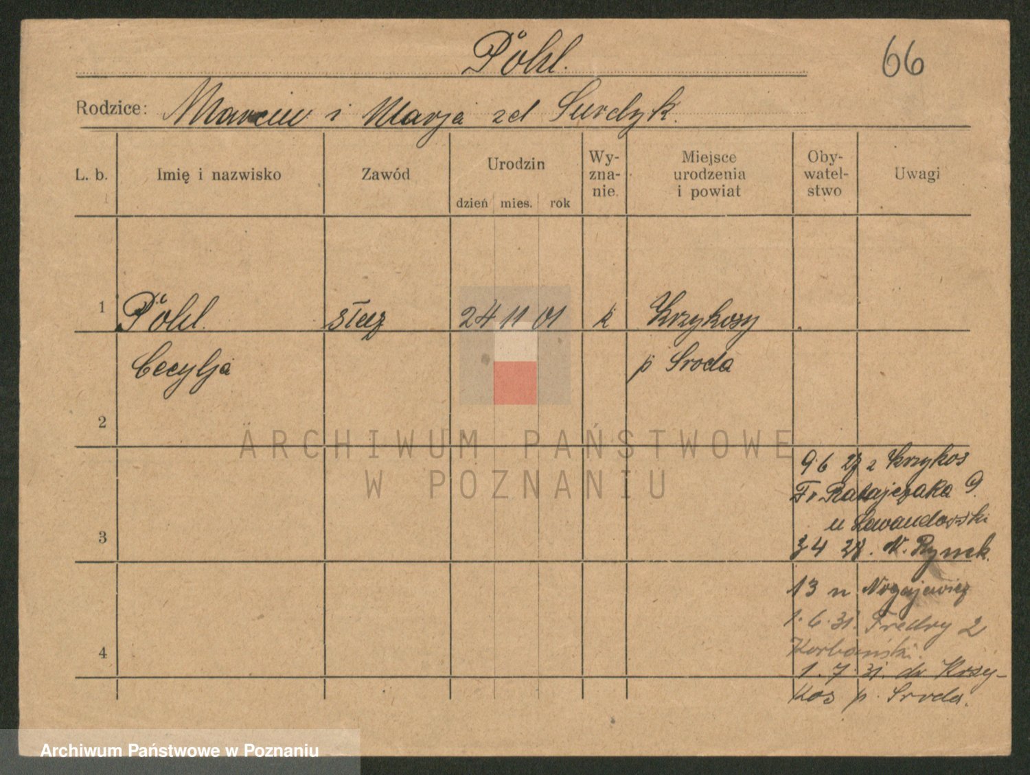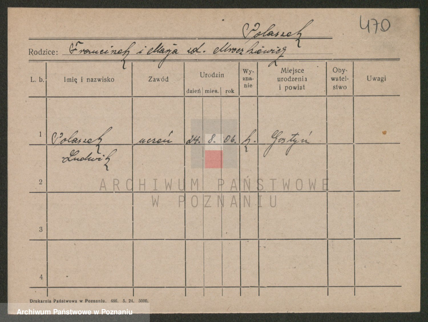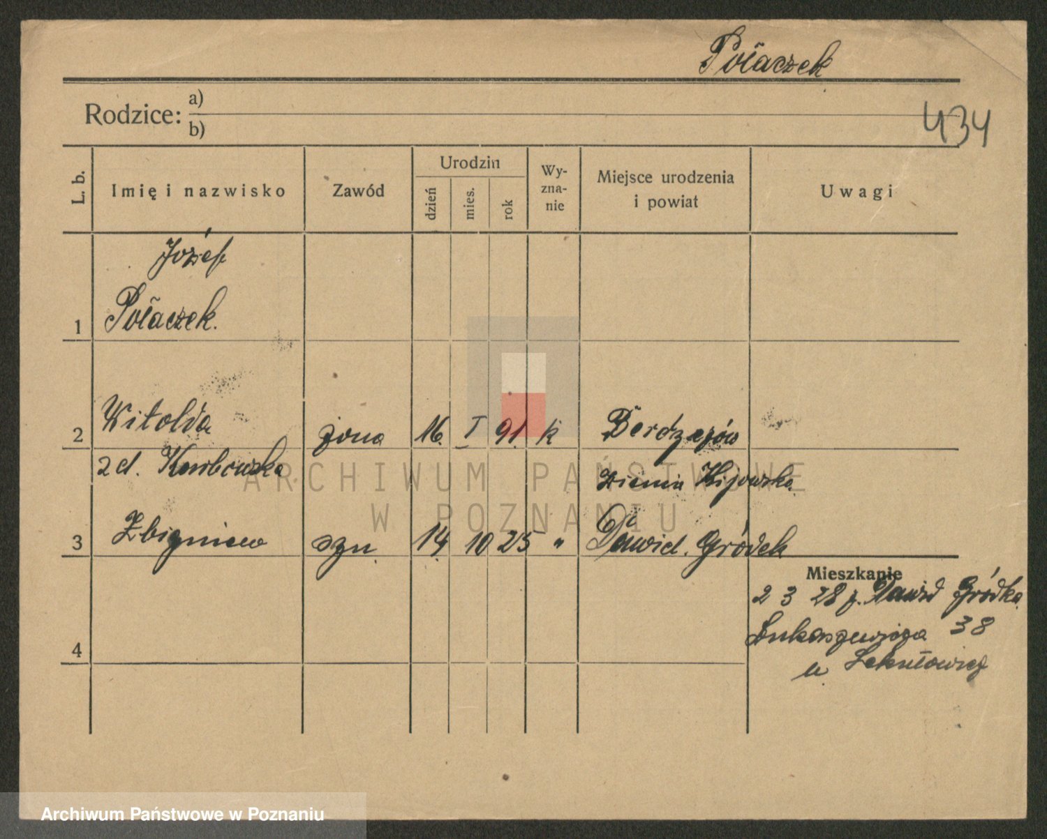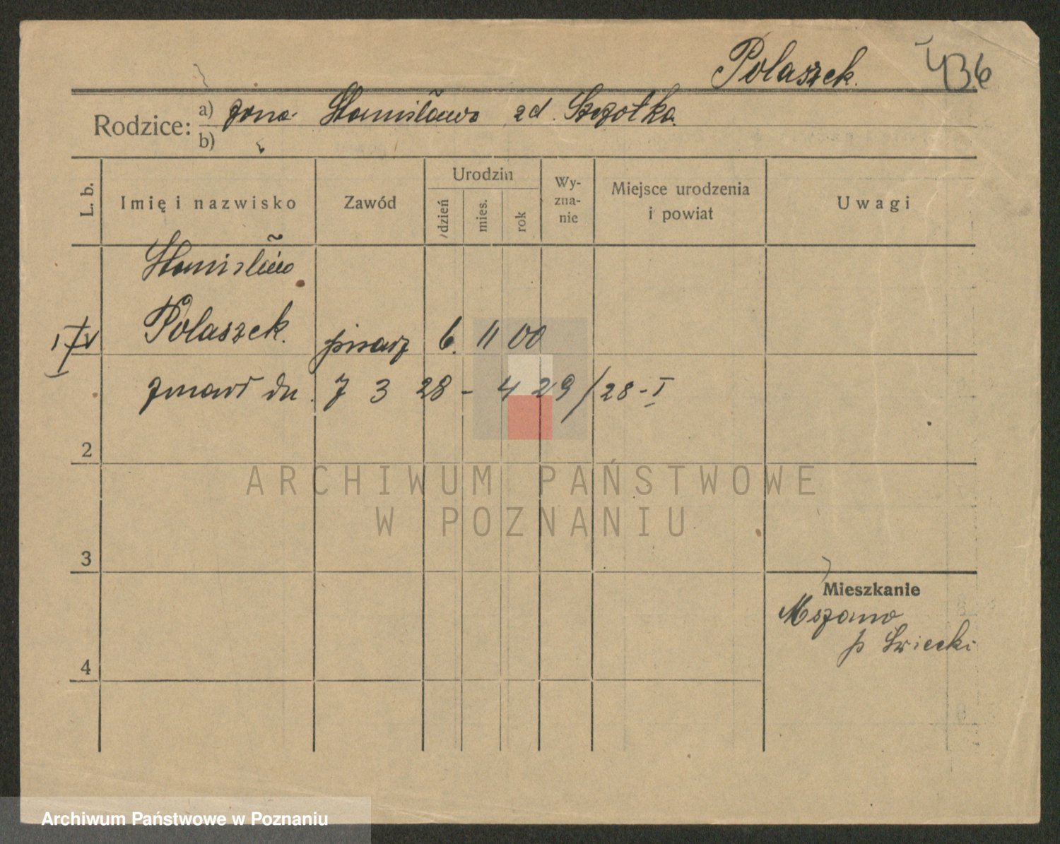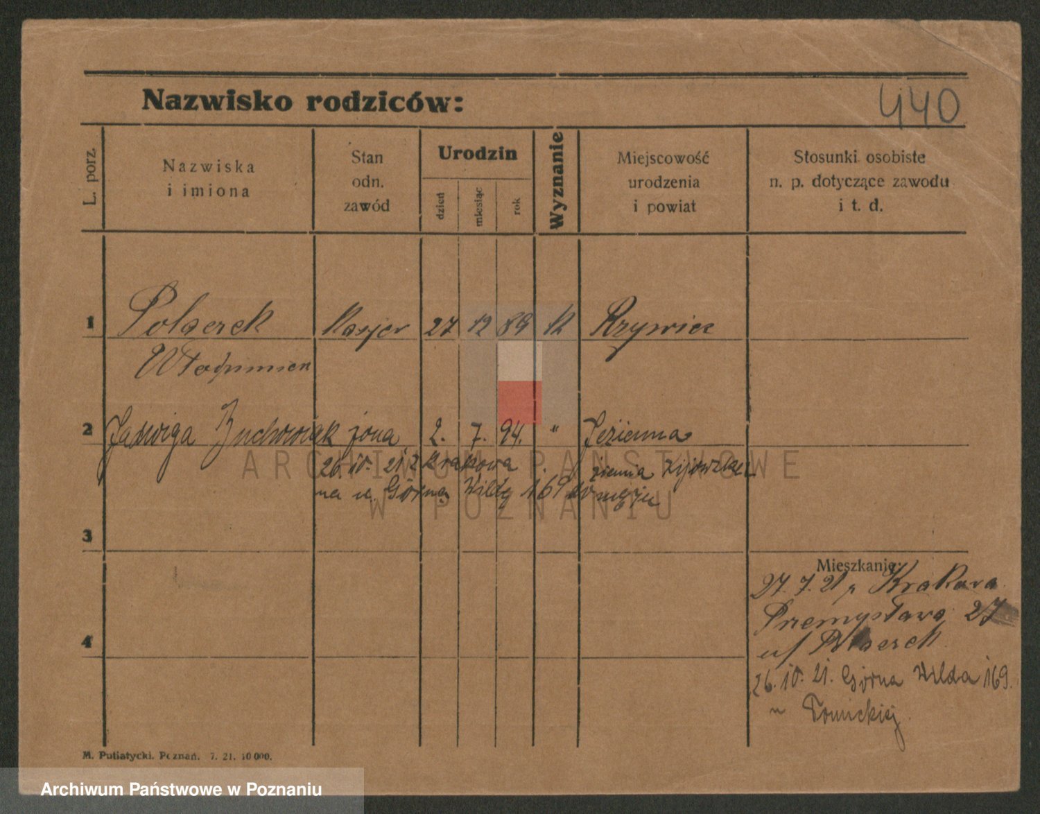 Podgląd karty osobowej dostępny jest po kliknięciu na nazwisko lub ikonkę karty. Można dokonywać powiększenia (ikony na górze) lub przechodzić między kolejnymi skanami (strzałki po bokach).