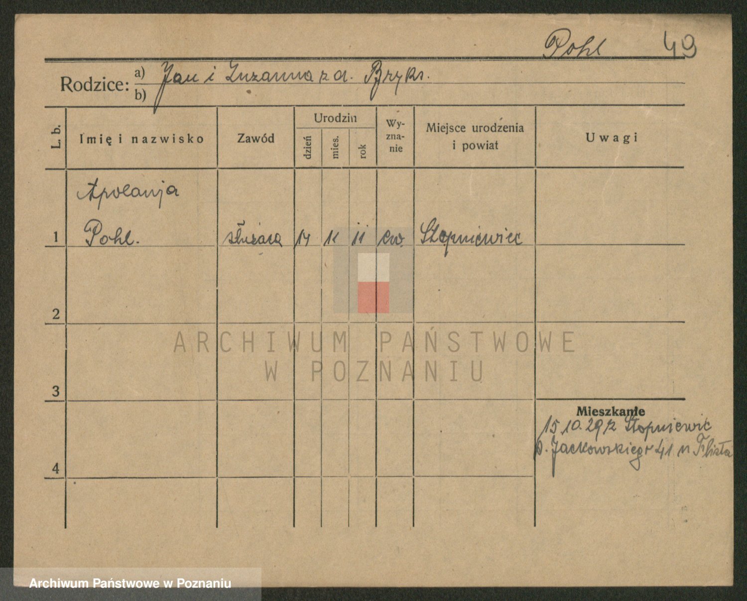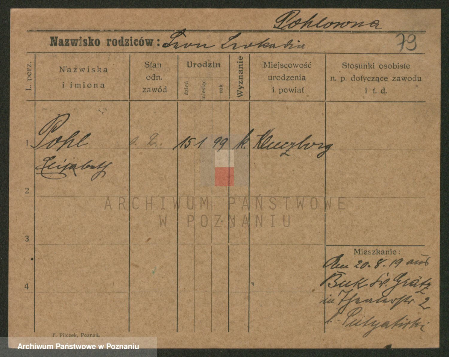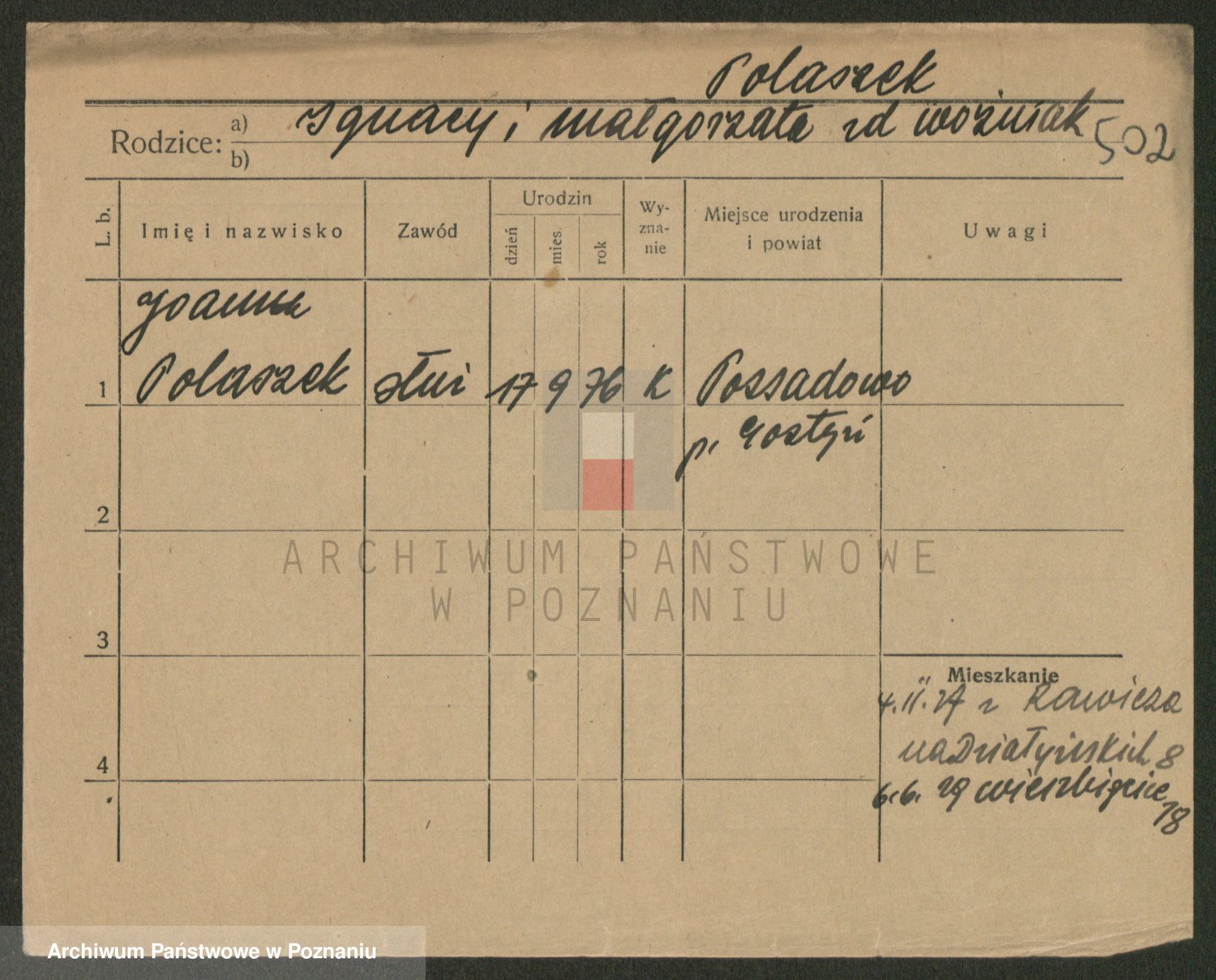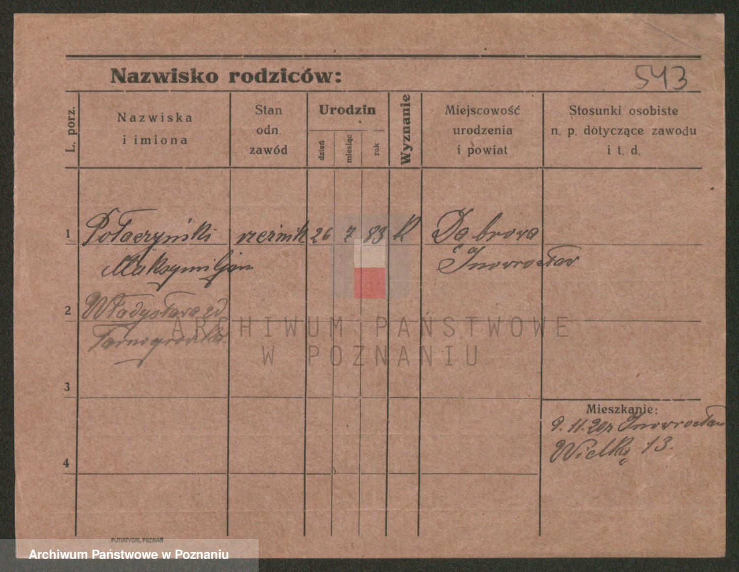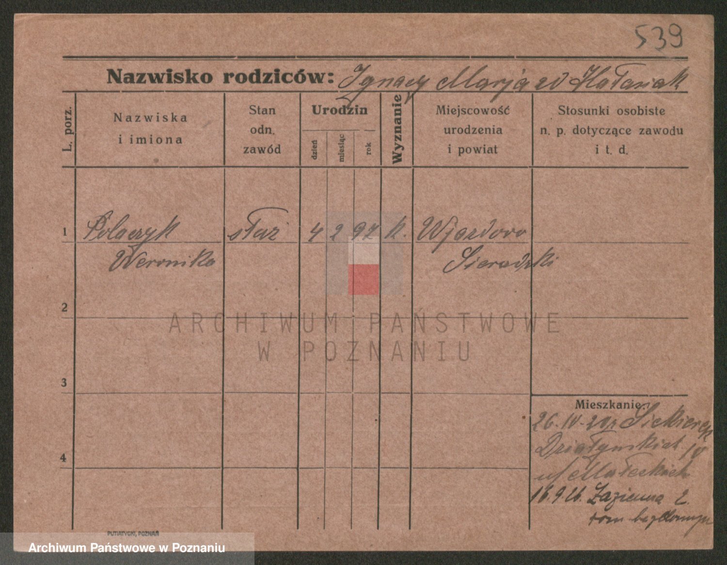 Podgląd karty osobowej dostępny jest po kliknięciu na nazwisko lub ikonkę karty. Można dokonywać powiększenia (ikony na górze) lub przechodzić między kolejnymi skanami (strzałki po bokach).