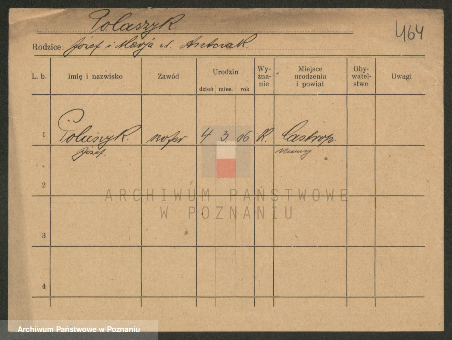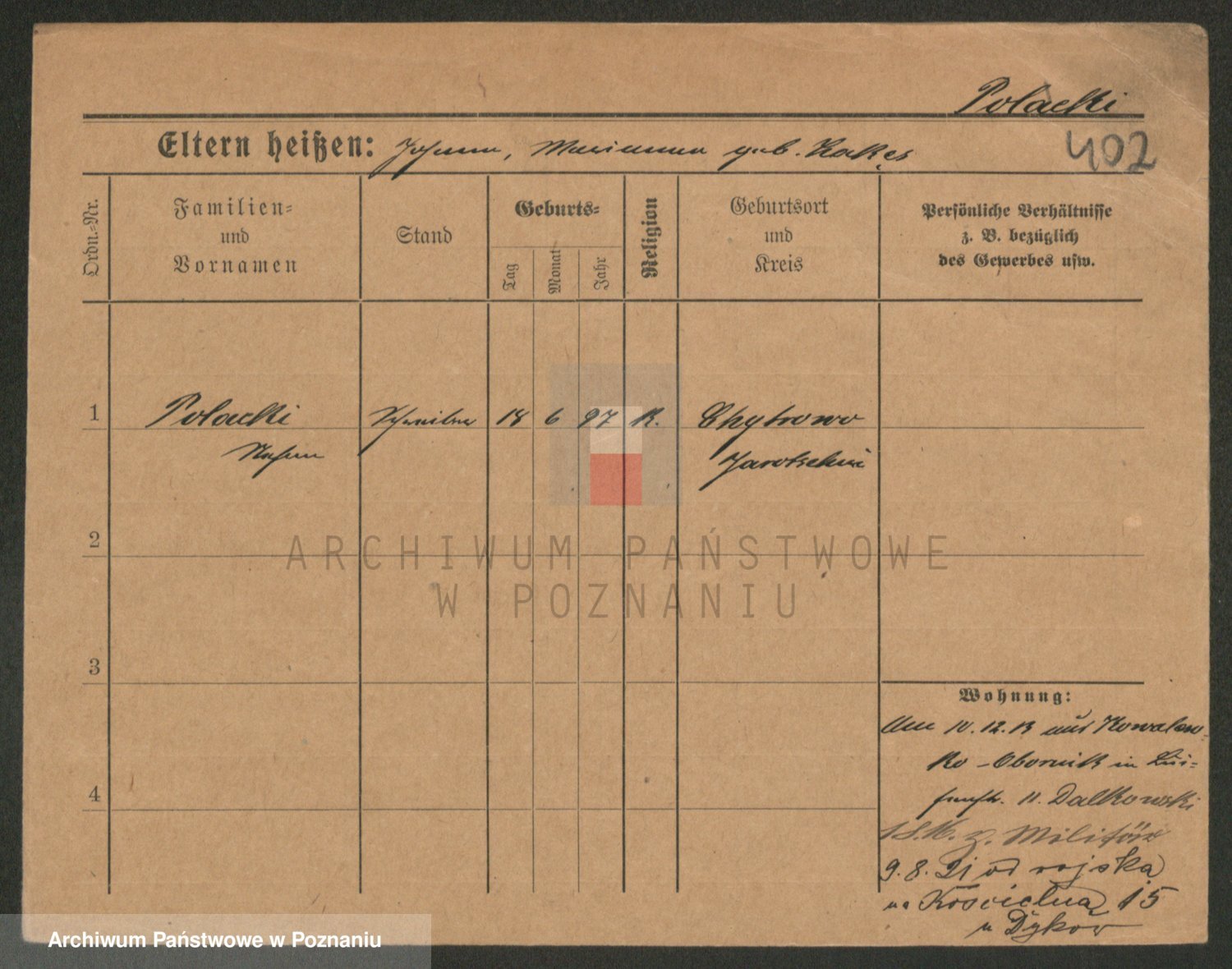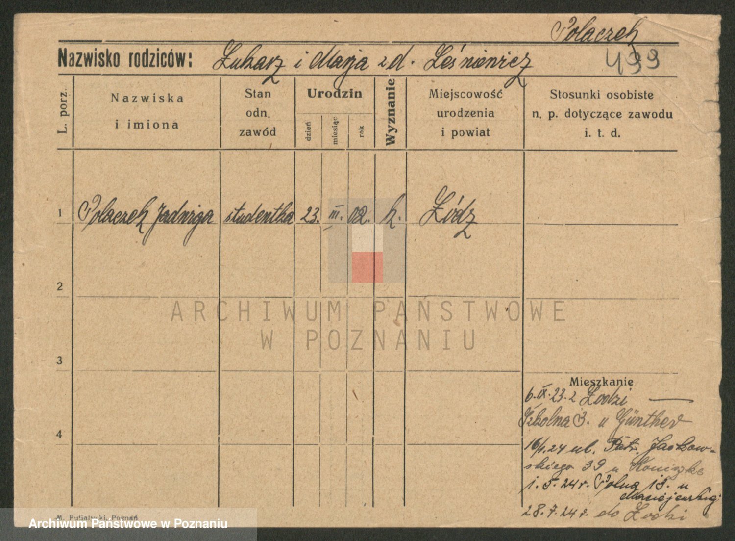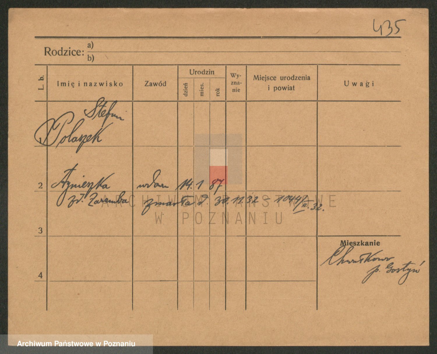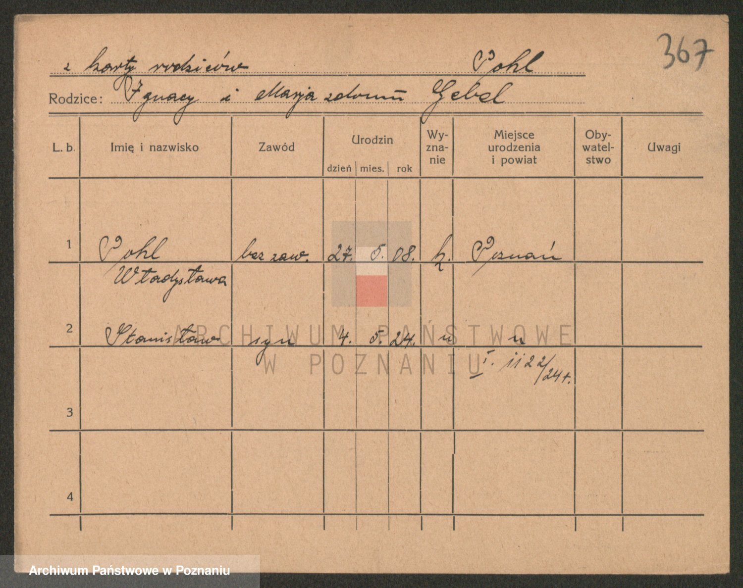 Podgląd karty osobowej dostępny jest po kliknięciu na nazwisko lub ikonkę karty. Można dokonywać powiększenia (ikony na górze) lub przechodzić między kolejnymi skanami (strzałki po bokach).