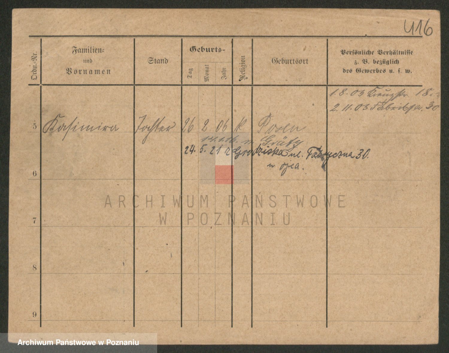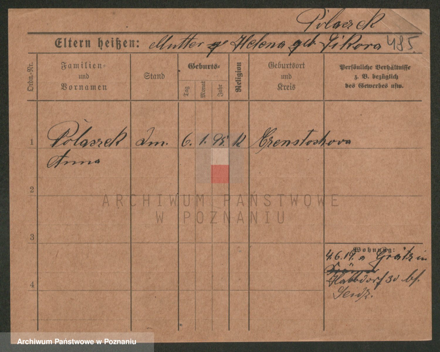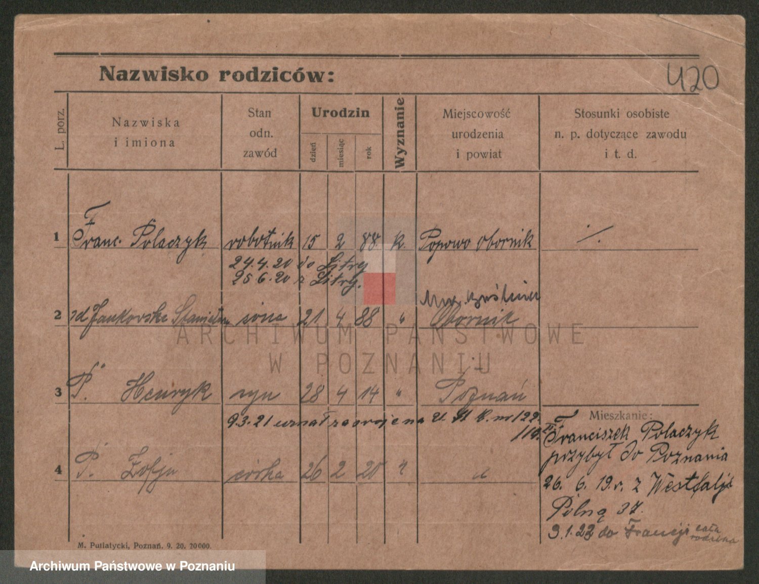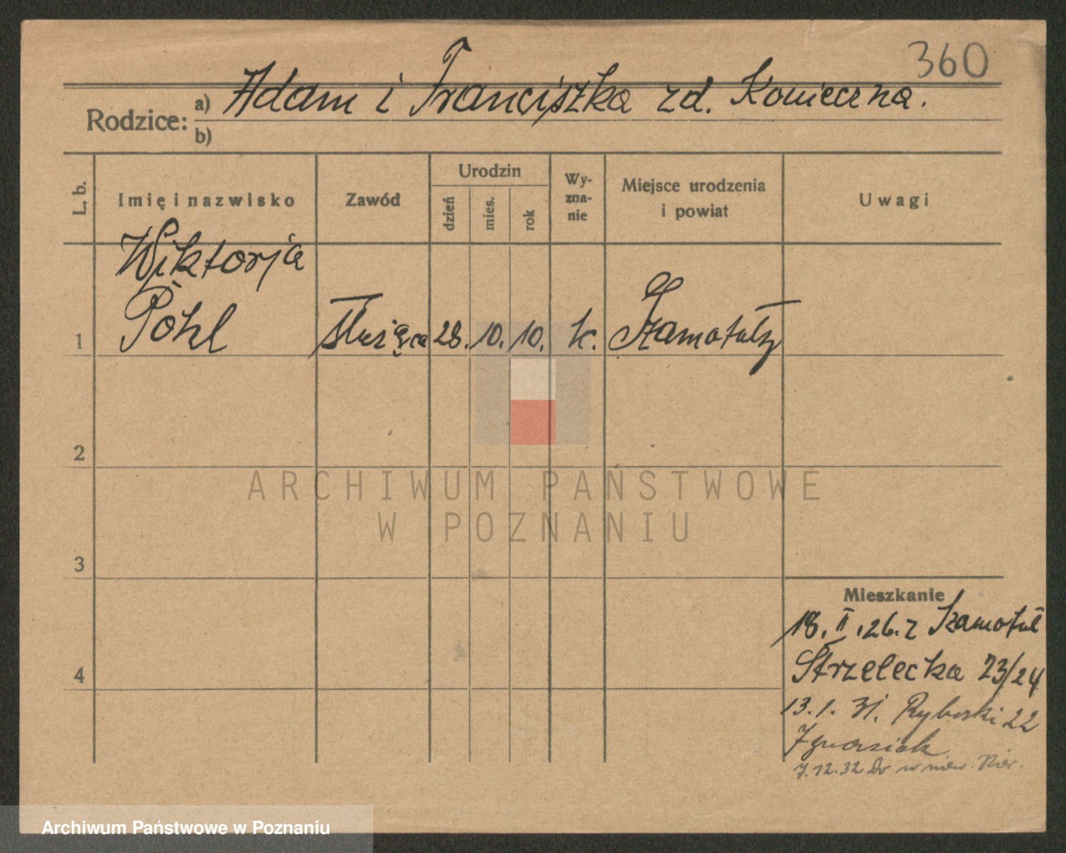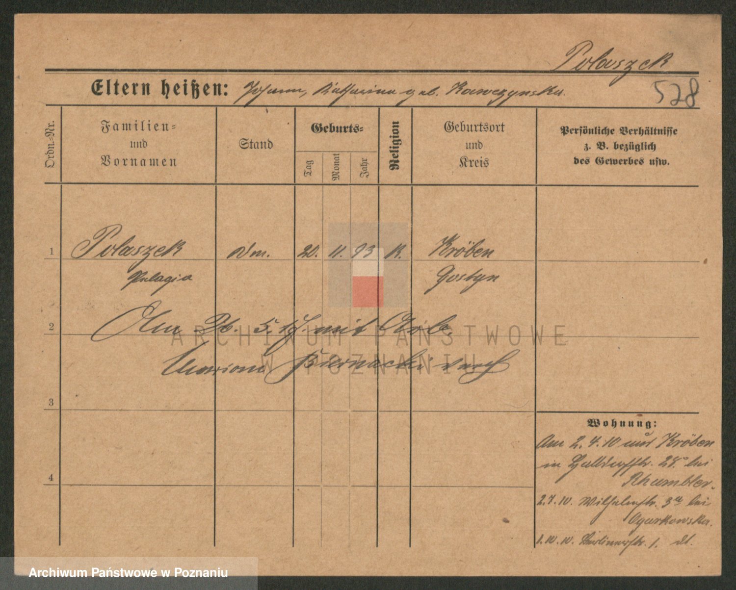 Podgląd karty osobowej dostępny jest po kliknięciu na nazwisko lub ikonkę karty. Można dokonywać powiększenia (ikony na górze) lub przechodzić między kolejnymi skanami (strzałki po bokach).