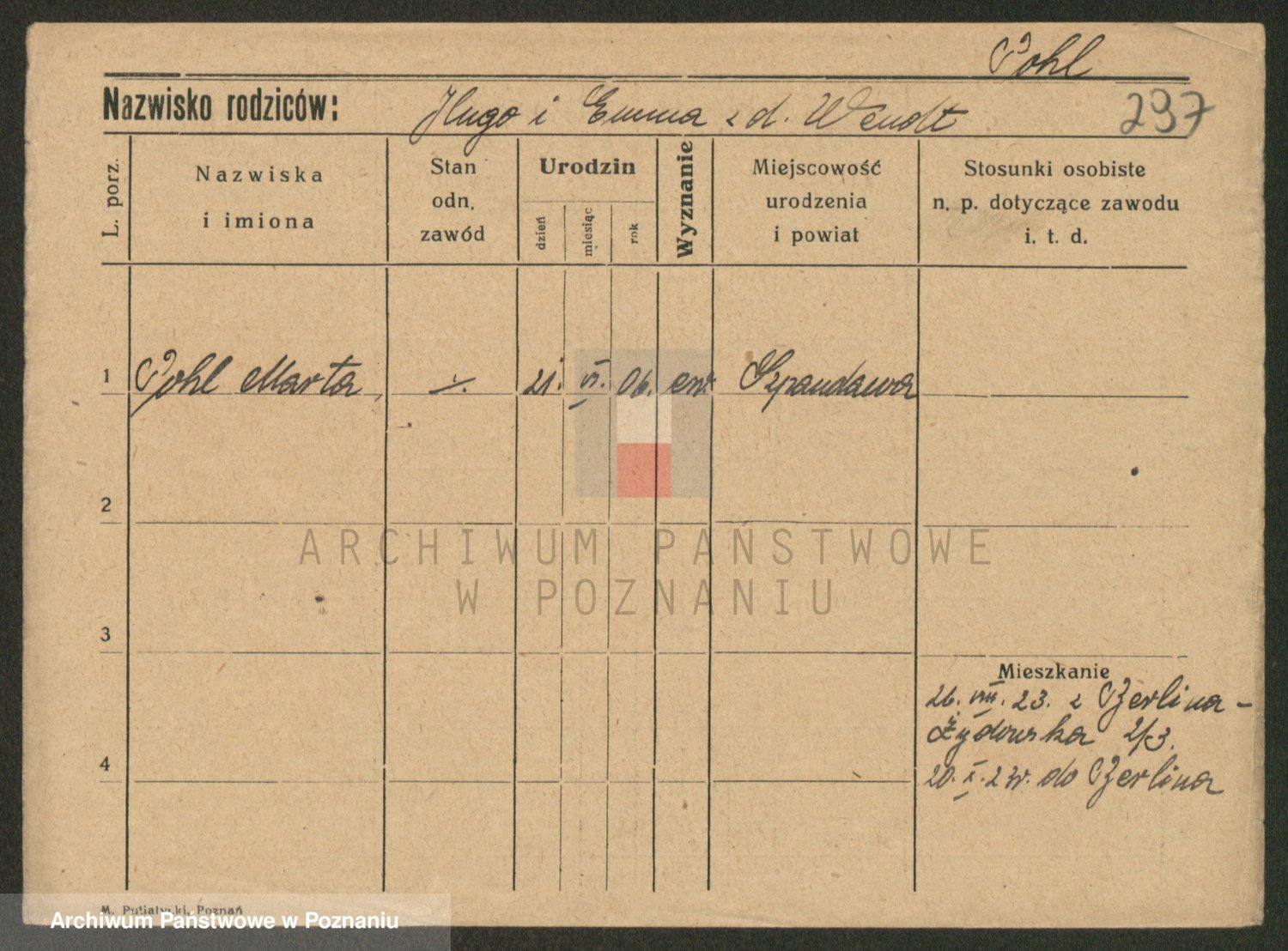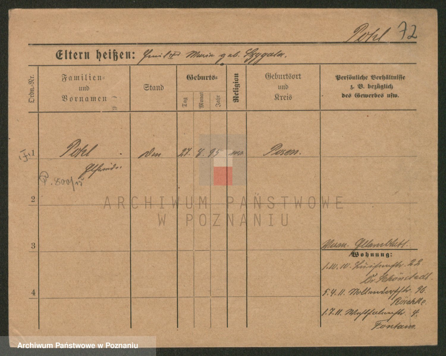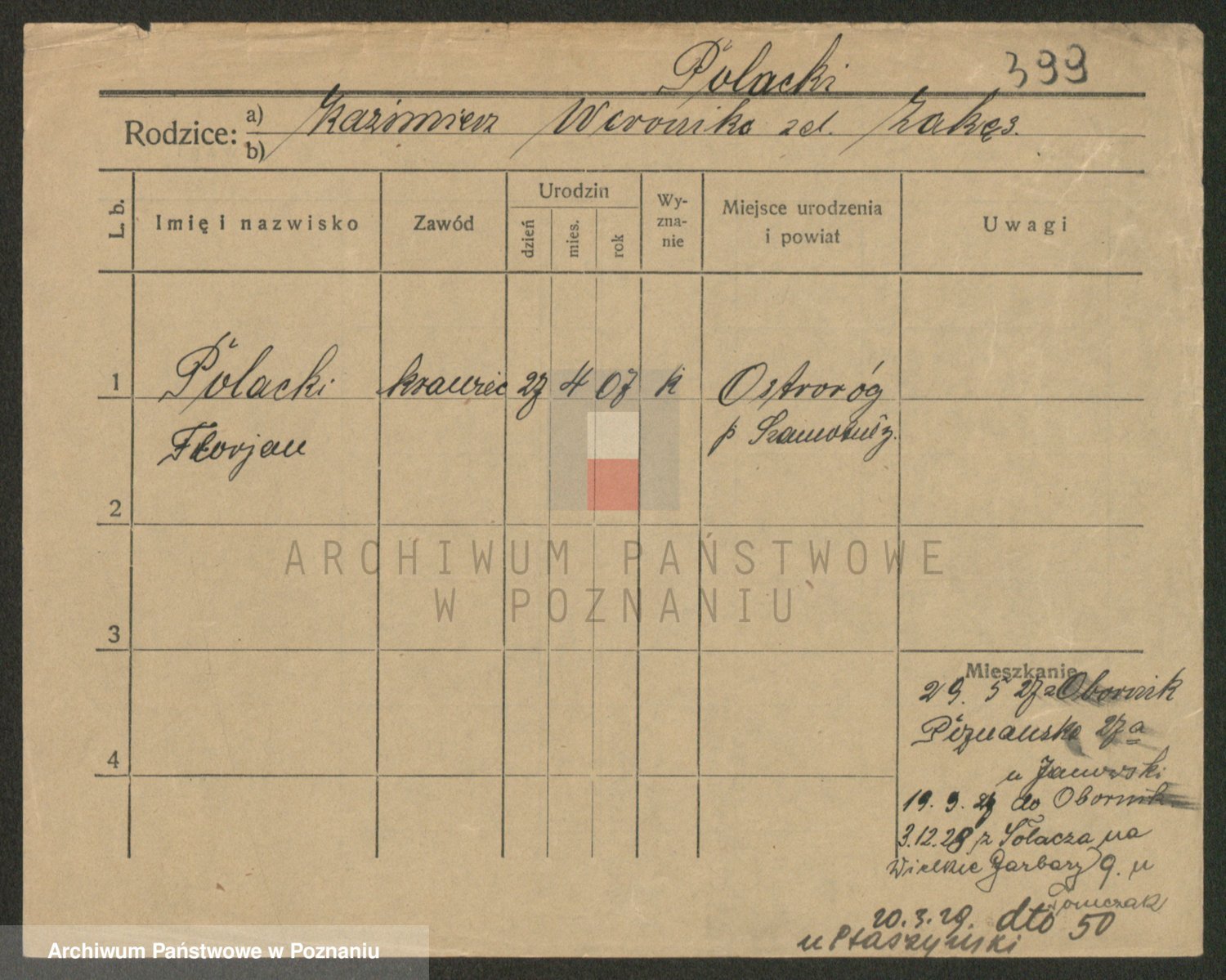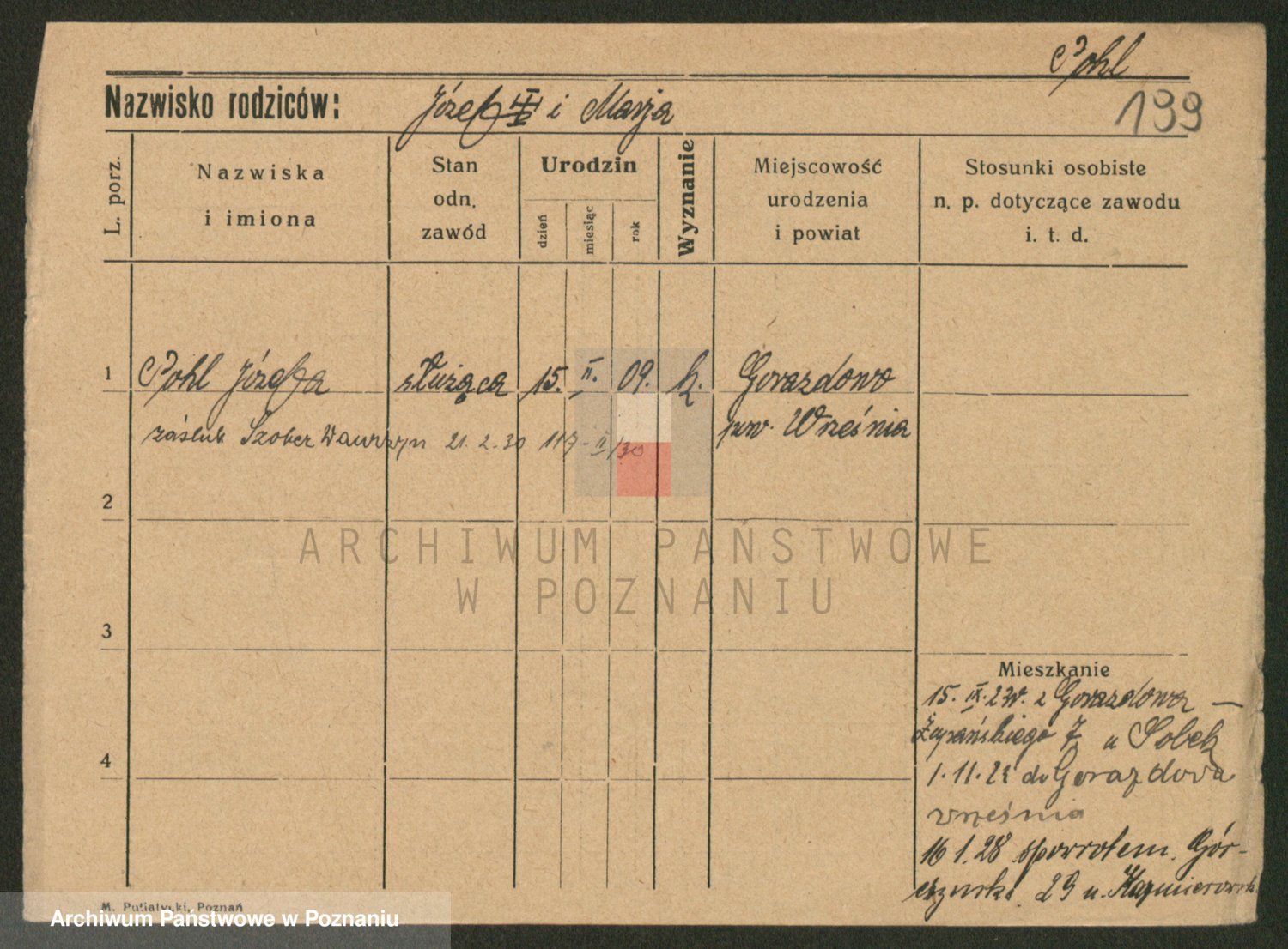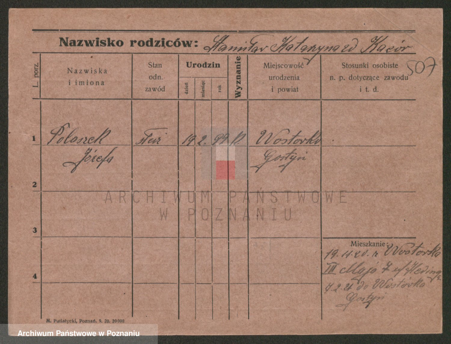 Podgląd karty osobowej dostępny jest po kliknięciu na nazwisko lub ikonkę karty. Można dokonywać powiększenia (ikony na górze) lub przechodzić między kolejnymi skanami (strzałki po bokach).