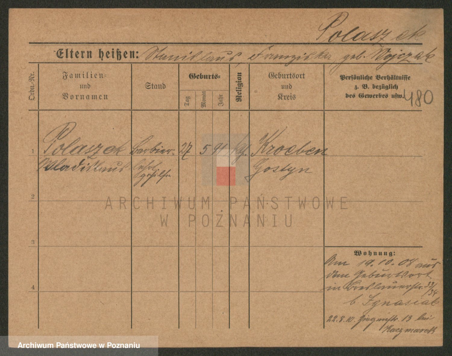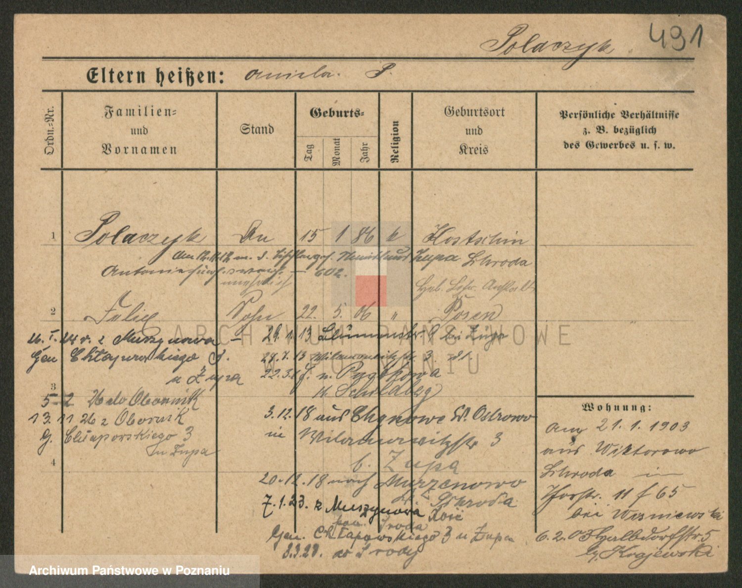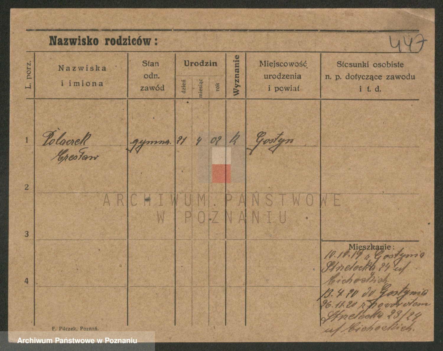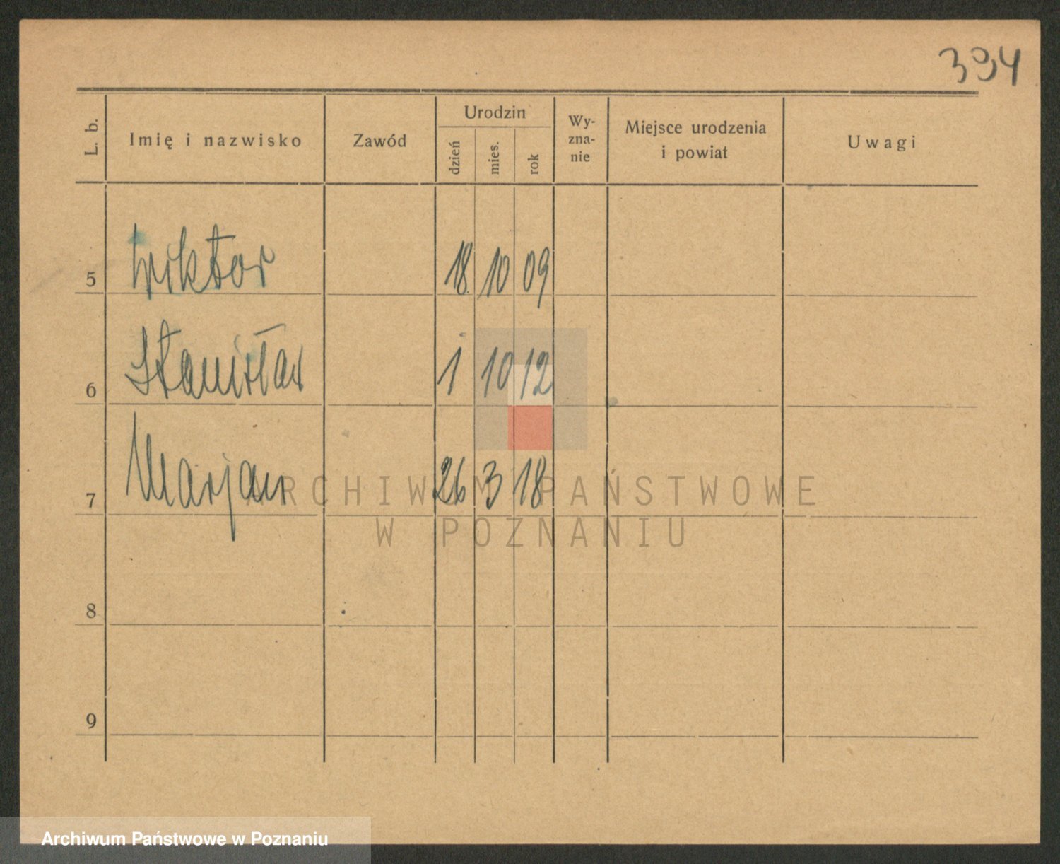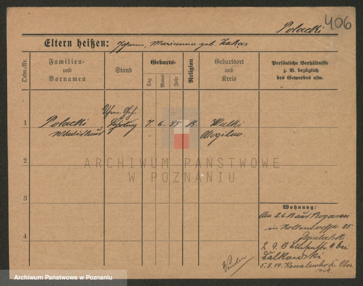 Podgląd karty osobowej dostępny jest po kliknięciu na nazwisko lub ikonkę karty. Można dokonywać powiększenia (ikony na górze) lub przechodzić między kolejnymi skanami (strzałki po bokach).