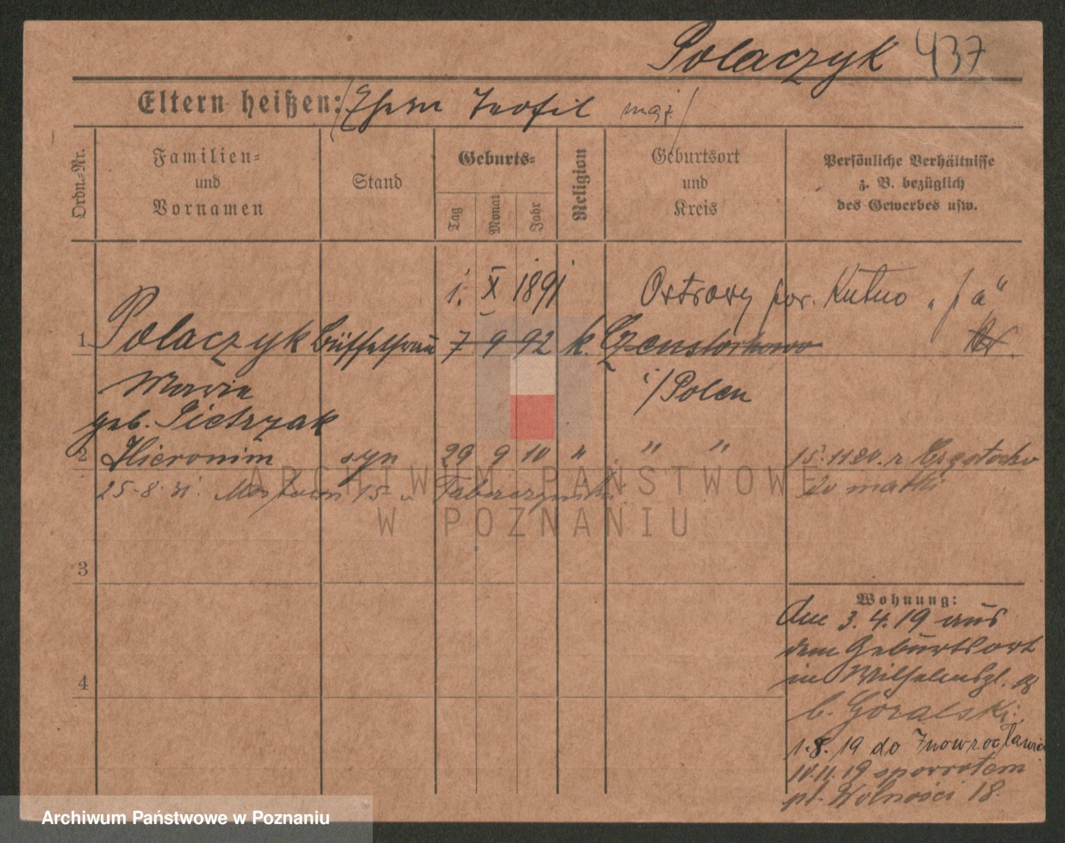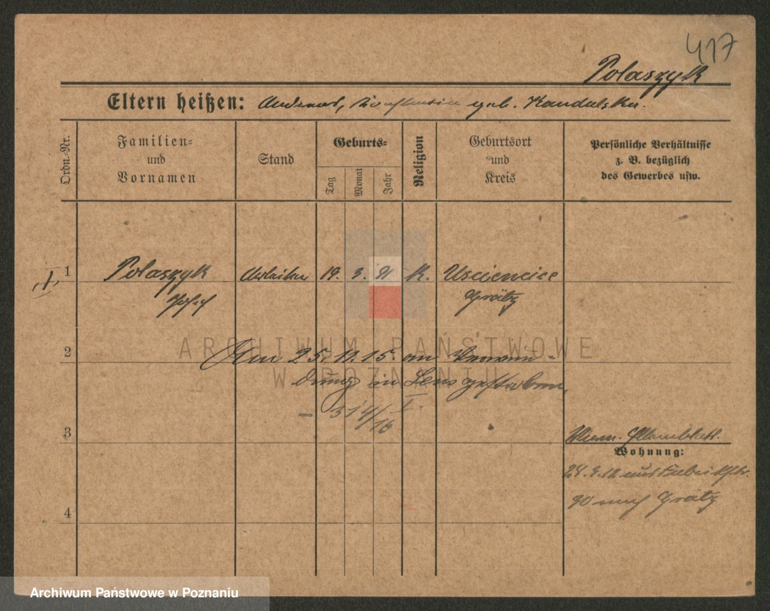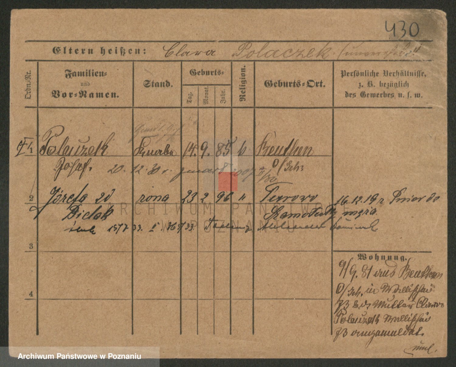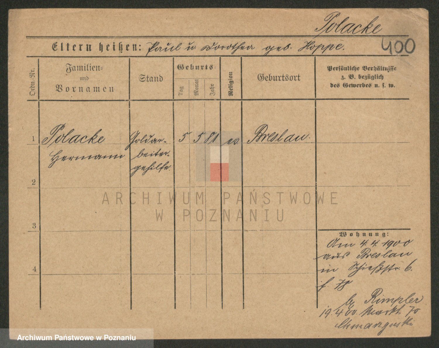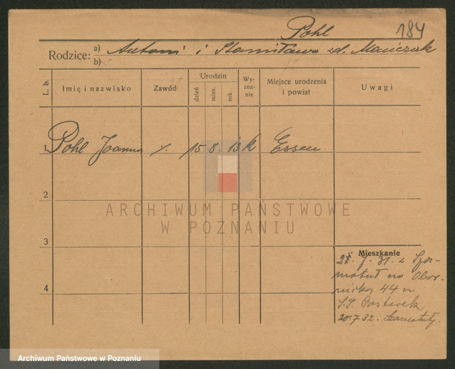 Podgląd karty osobowej dostępny jest po kliknięciu na nazwisko lub ikonkę karty. Można dokonywać powiększenia (ikony na górze) lub przechodzić między kolejnymi skanami (strzałki po bokach).